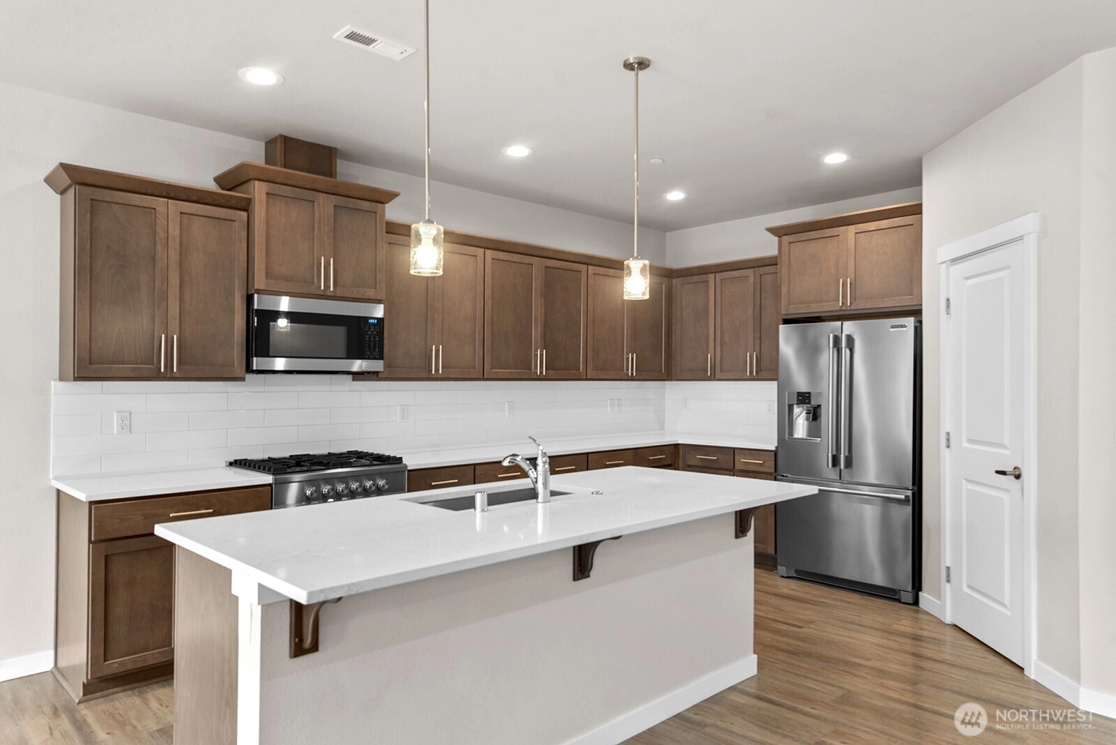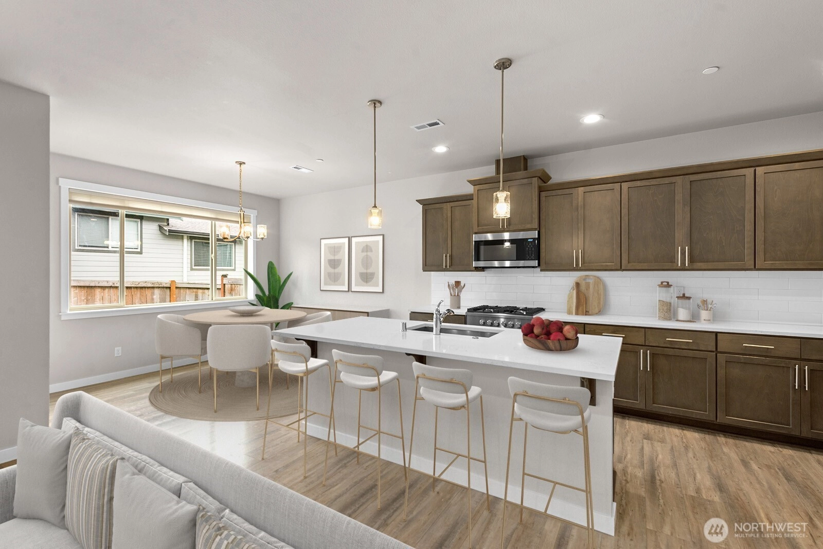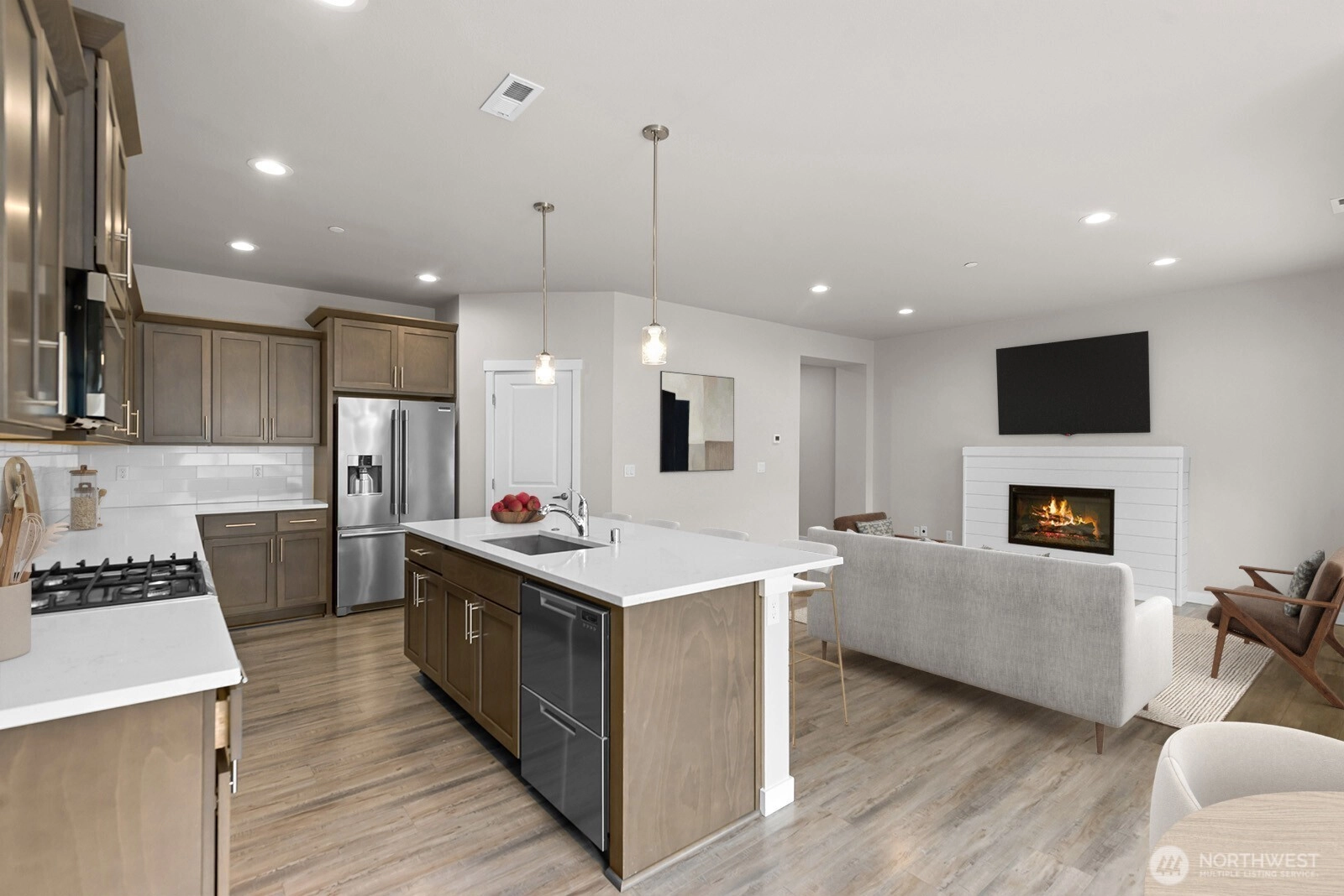 Welcome to The Woodlands at Edgewood! Enjoy a contemporary design, perfect for today's lifestyle. Find an open-concept chef's kitchen featuring a spacious island w/quartz counters, plenty of cabinets for storage + large pantry, & SS appliances including a high-end Fisher & Paykel gas stove. The covered patio & fenced low-maintenance turf yard are a perfect place to enjoy summer. Up, find a flexible space (office, den, playroom?), laundry, & 3 large bedrooms, including a spa-like primary suite with a walk-in closet. 2-car, side-by-side garage. Quality systems including a high-efficiency Trane furnace & tankless water heater highlight the construction quality. Conveniently located near amenities, grocery stores, freeways, & community park.