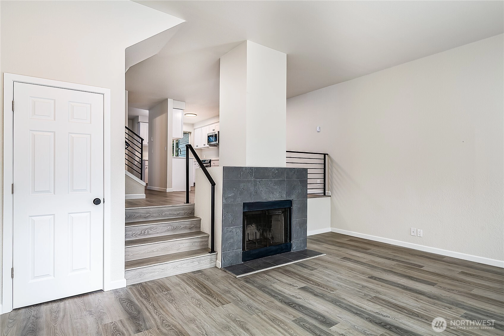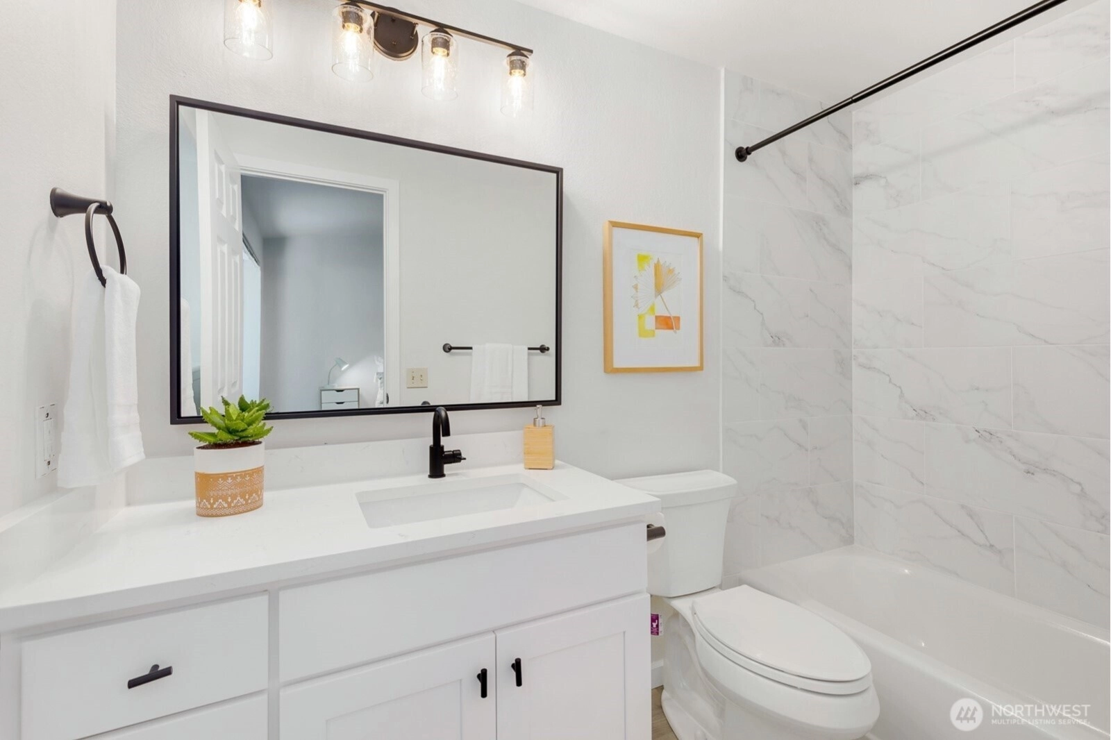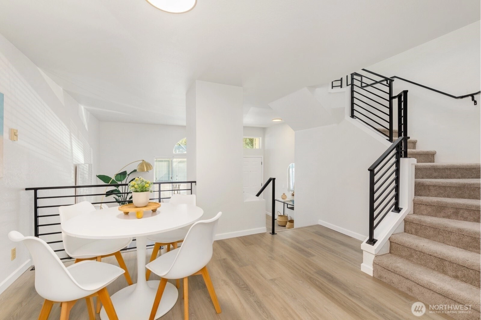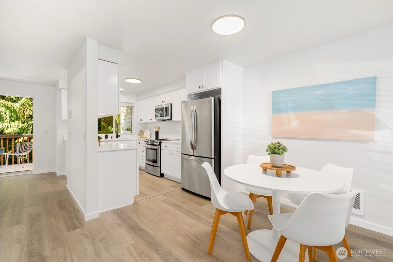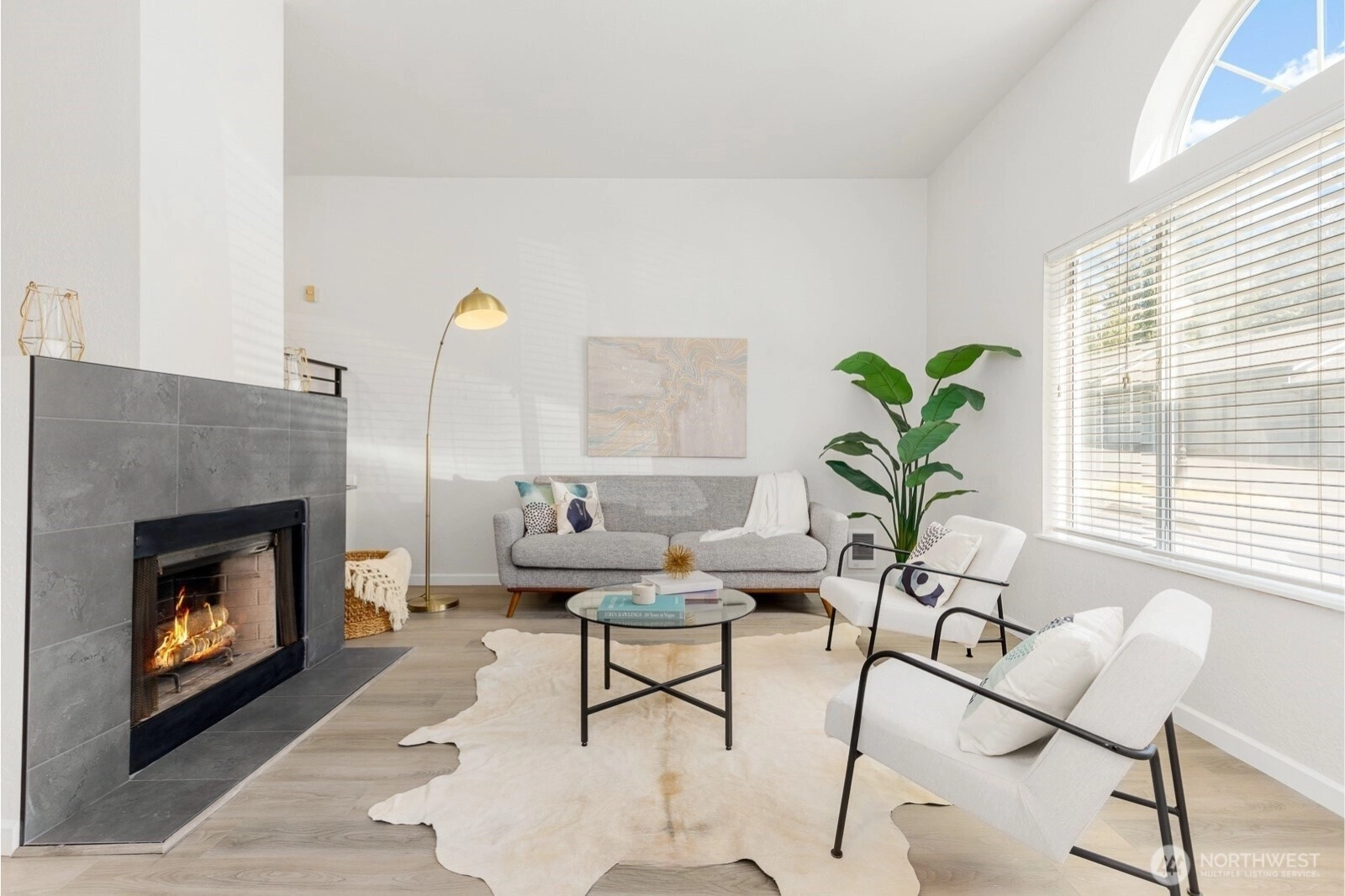 Fully remodeled Mukilteo townhome in a quiet community minutes to beach, trails, coffee and more! Thoughtful updates: matte-black accents, quartz counters, designer lighting, LVP and custom metal railings. Soaring 10-ft entry opens to a bright living room w/ wood-burning fireplace. Dining flows to a dream kitchen with SS appl, statement tile and an office/den alcove plus a 1/2 bath. Upstairs: 2 spacious ensuite bedrooms with generous closets (2.5 baths total). Full-size laundry, newer water heater, detached garage + off-street parking + storage. Private deck backs to a serene greenbelt on a quiet dead-end street. Near Mukilteo Beach, parks, train station, bus lines & fast freeway access. Modern design and everyday ease in a prime location!