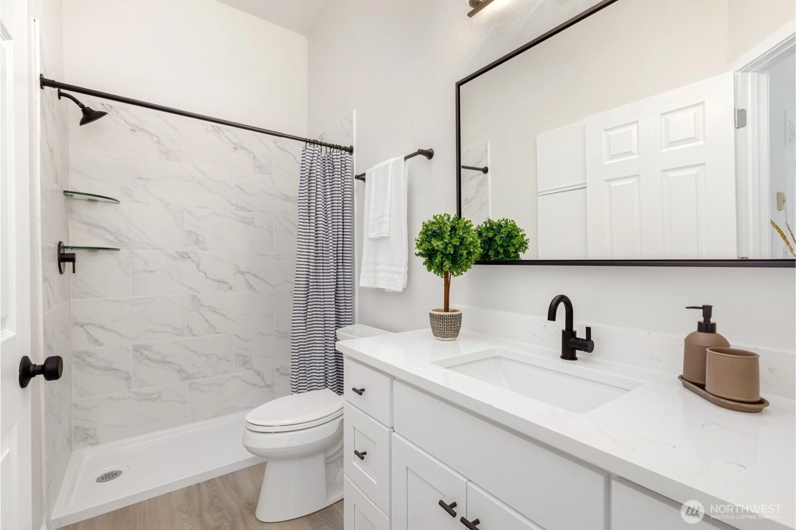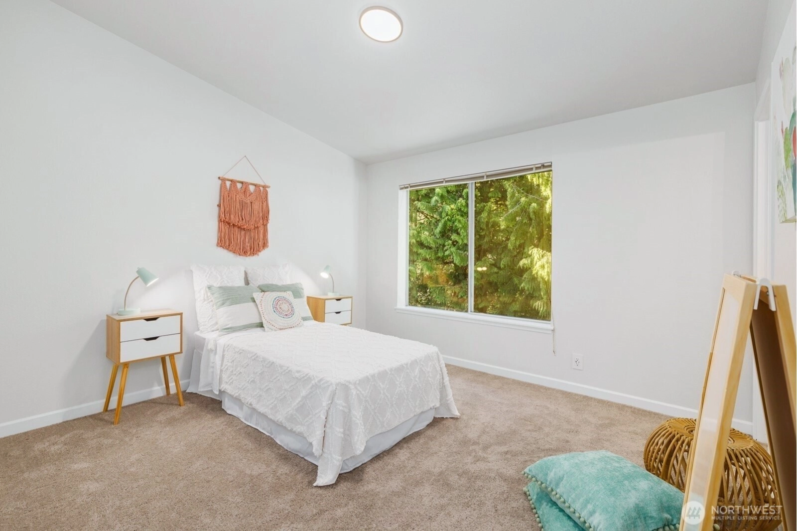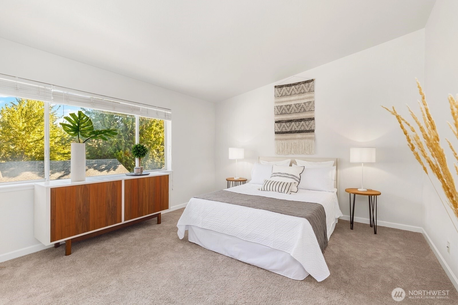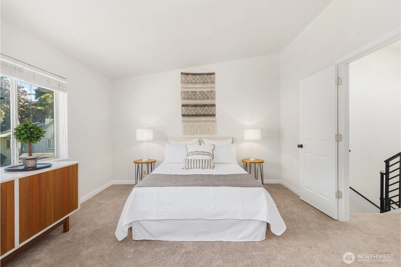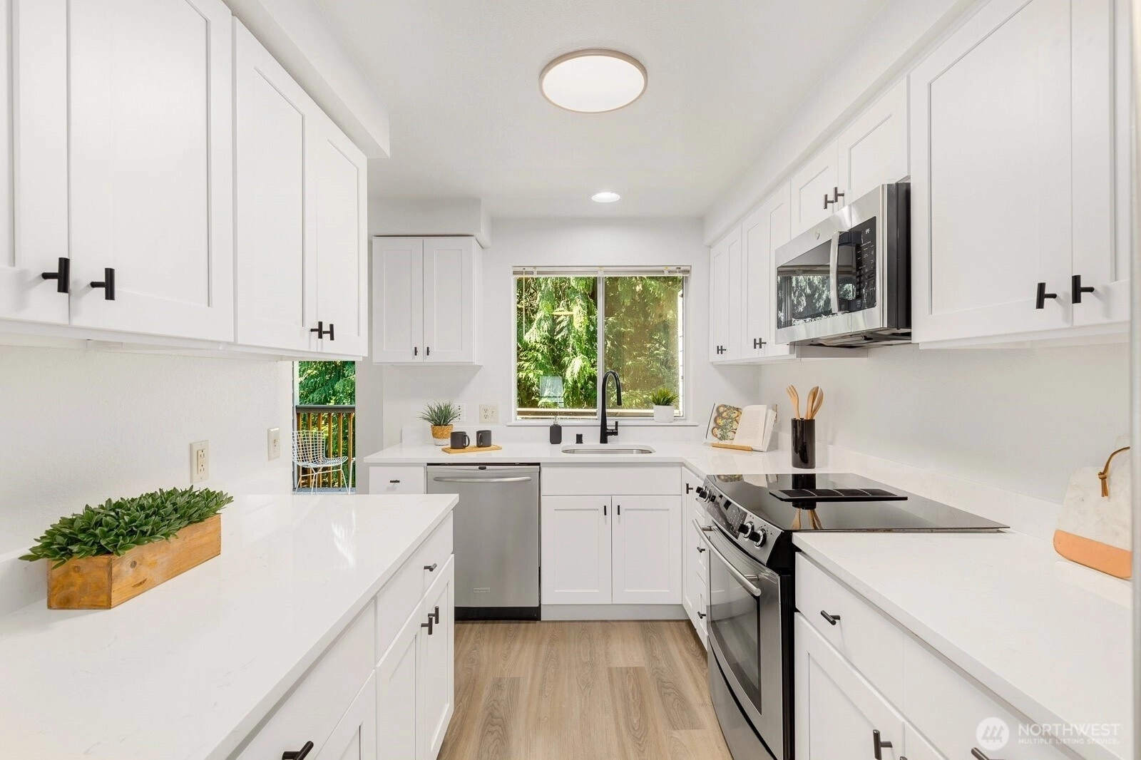 Fully remodeled Mukilteo townhome in a quiet community minutes to beach, trails, coffee and more! Thoughtful updates: matte-black accents, quartz counters, designer lighting, LVP and custom metal railings. Soaring 10-ft entry opens to a bright living room w/ wood-burning fireplace. Dining flows to a dream kitchen with SS appl, statement tile and an office/den alcove plus a 1/2 bath. Upstairs: 2 spacious ensuite bedrooms with generous closets (2.5 baths total). Full-size laundry, newer water heater, detached garage + off-street parking + storage. Private deck backs to a serene greenbelt on a quiet dead-end street. Near Mukilteo Beach, parks, train station, bus lines & fast freeway access. Modern design and everyday ease in a prime location!
