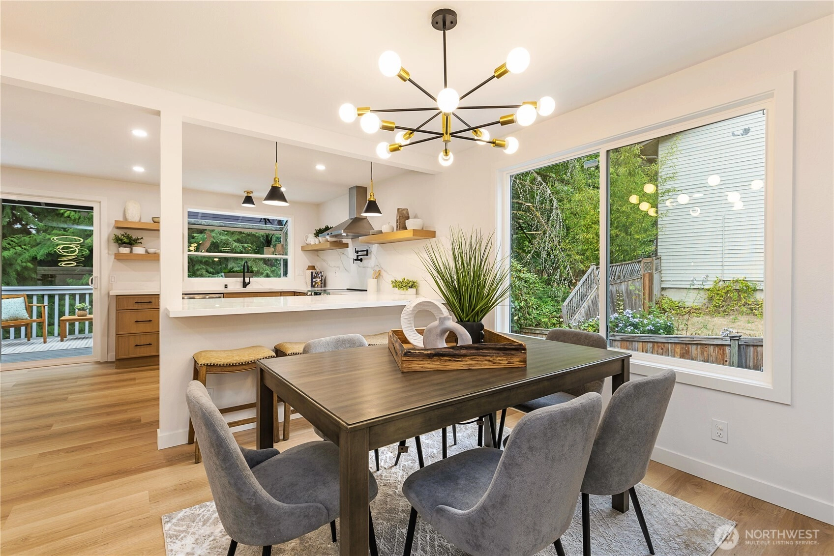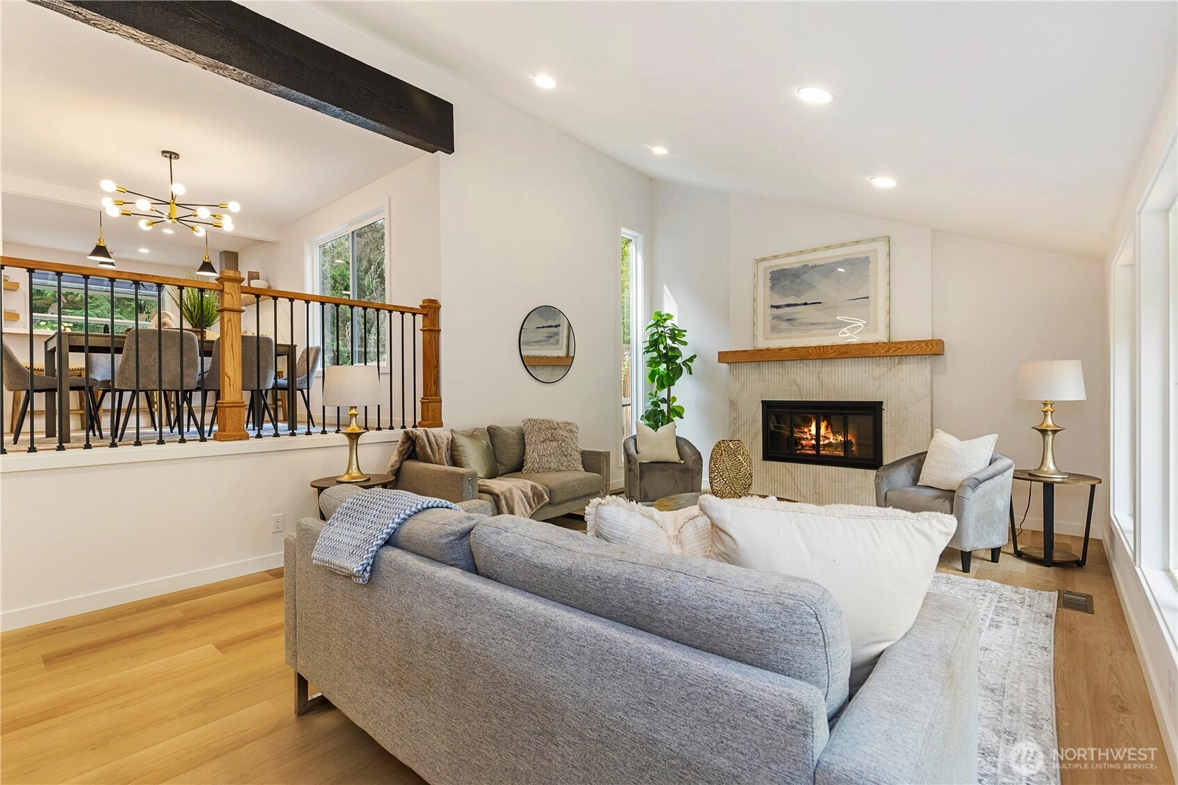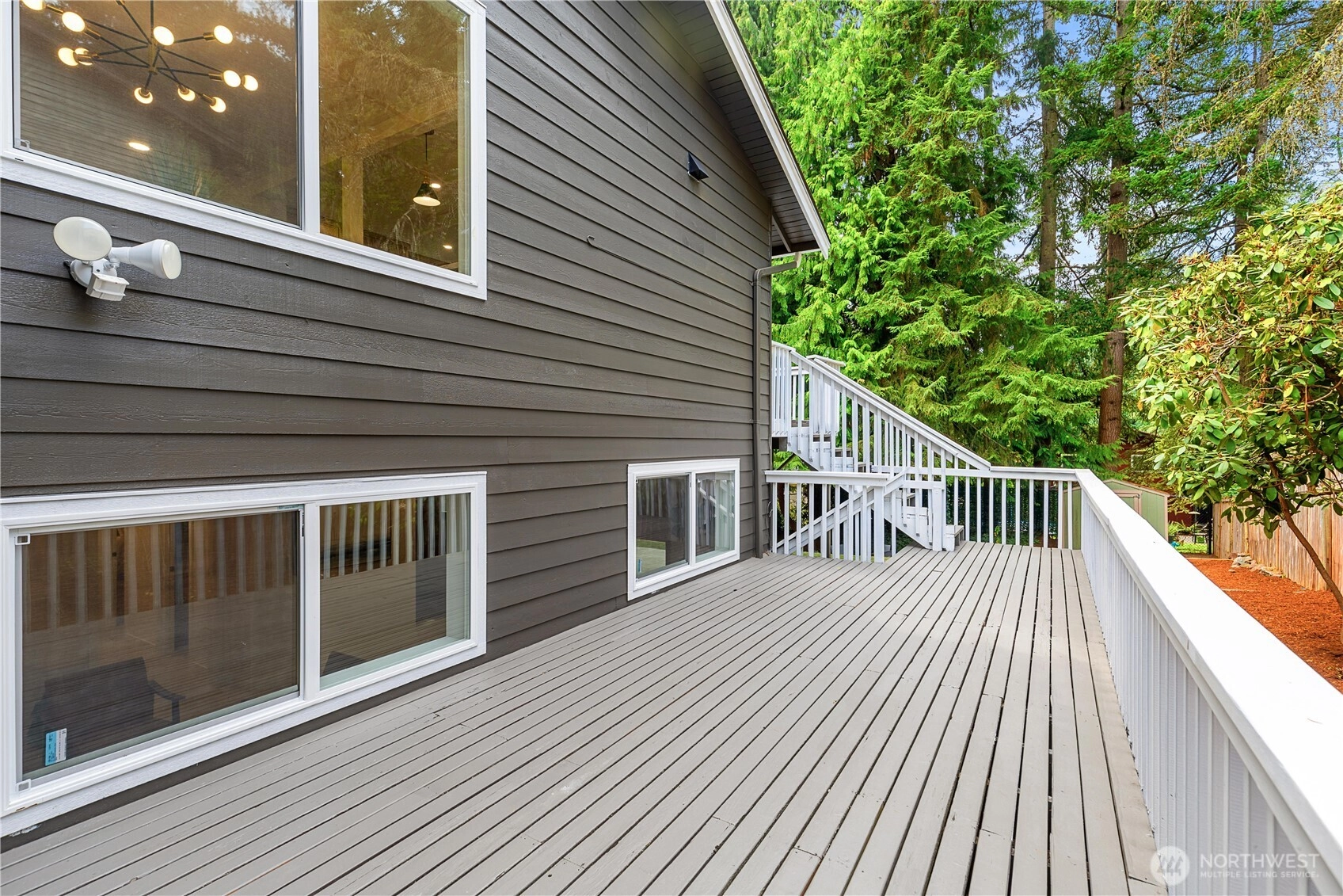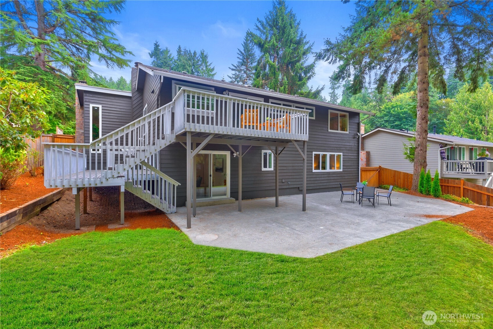 Remodeled tri-level in Lake Forest Park, tucked in a friendly neighborhood near Horizon View & within the Shoreline School District. Deeded beach access via the Lake Forest Park Civic Club. Vaulted ceilings on the main level with open living room, custom kitchen with newest slim shaker cabinets & stone countertop & backsplash, pot filler, stainless appliances, & formal dining area. Main floor primary suite with double vanity and ¾ bath, plus 2 more bedrooms & full hall bath. Lower level offers family room with patio access, 4th bedroom, ¾ bath, and laundry. Private backyard with multiple decks & oversized patio, perfect for entertaining all year around & for everyone to enjoy. 2-car garage, central A/C, quiet established neighborhood