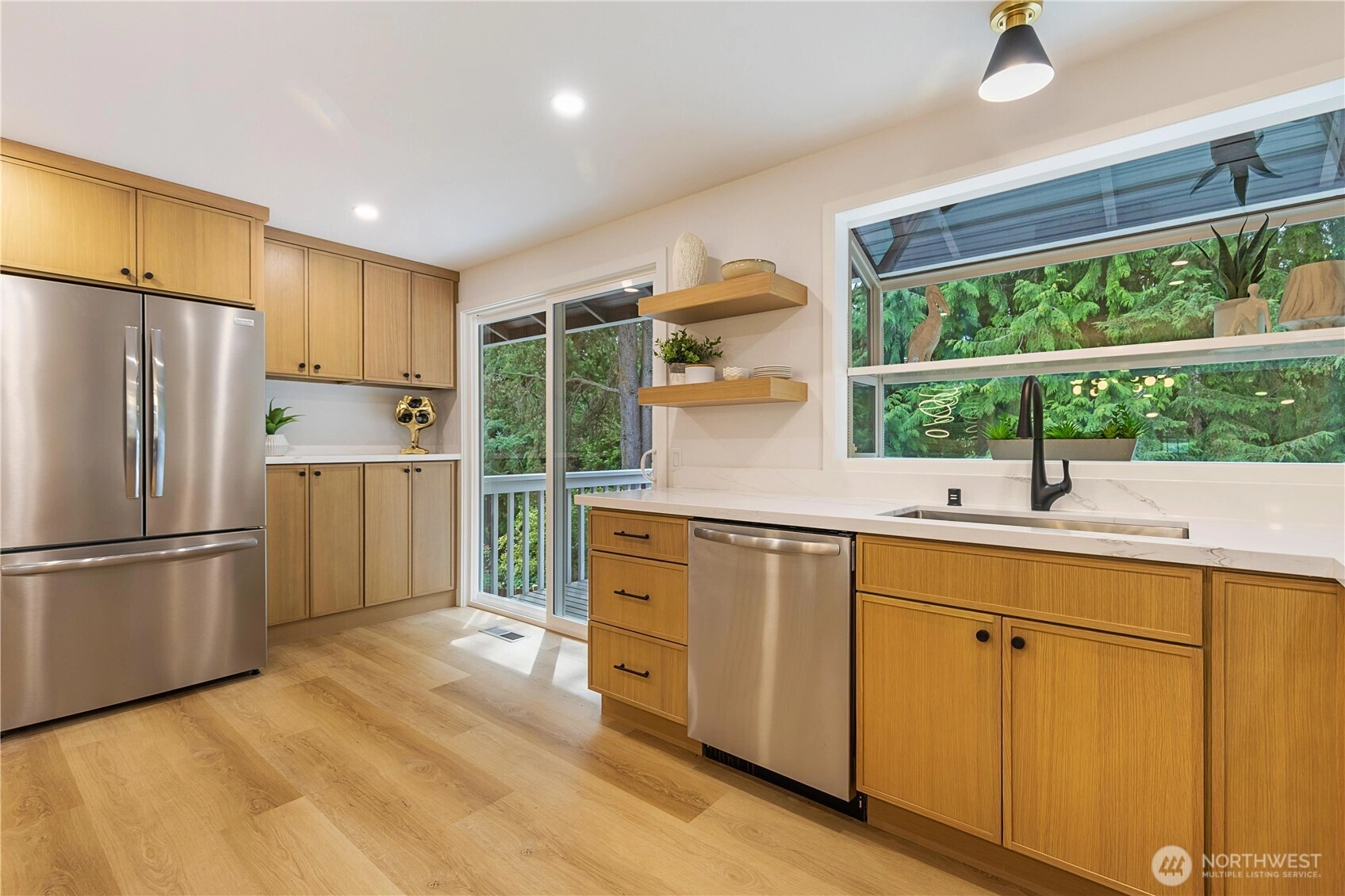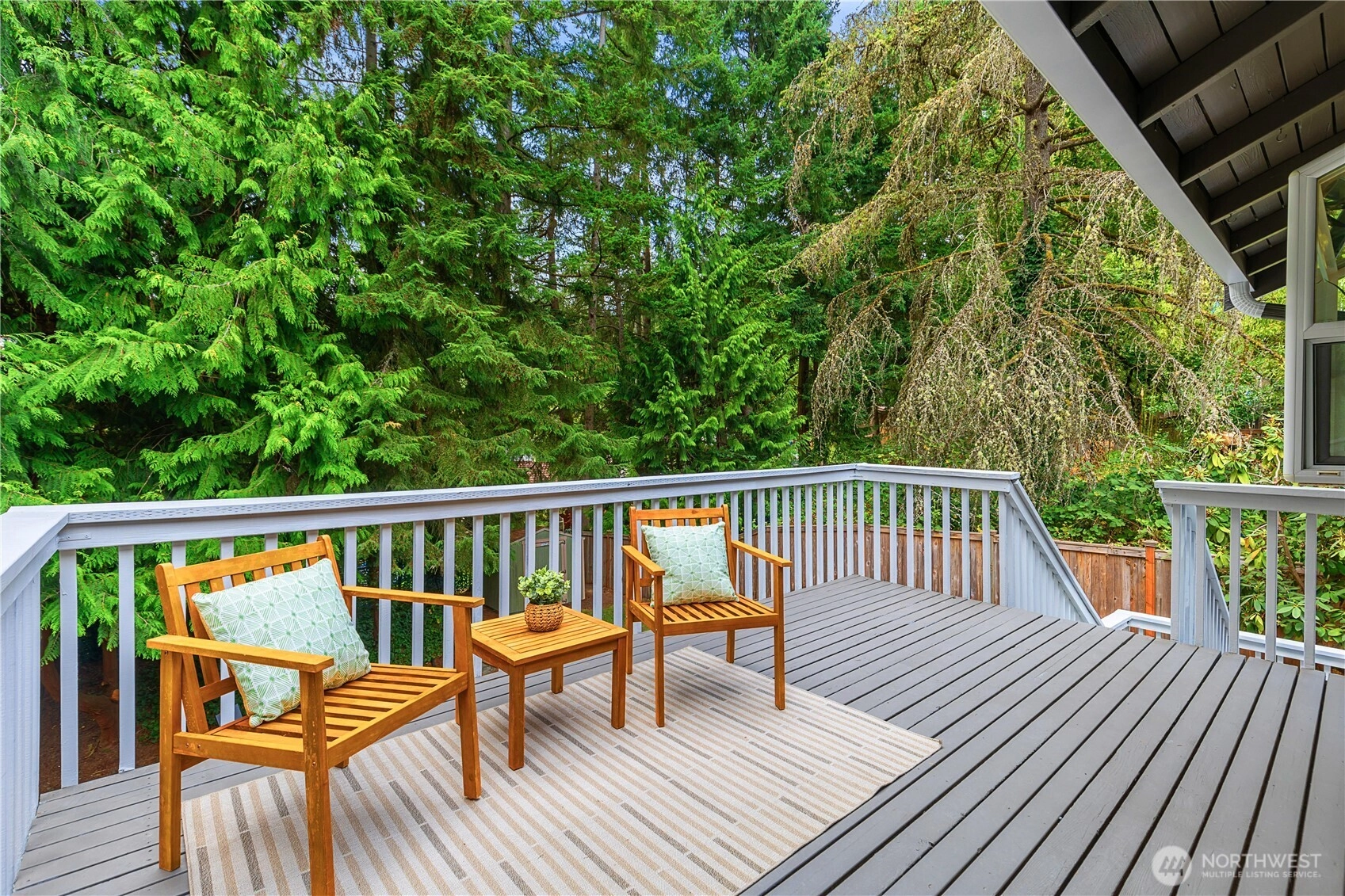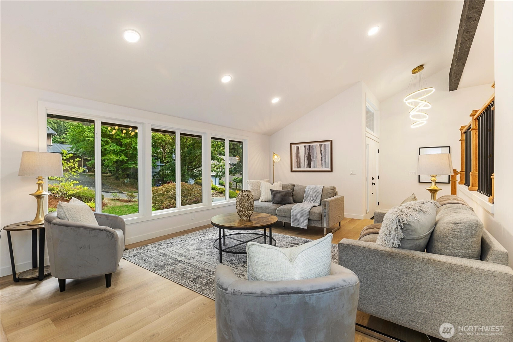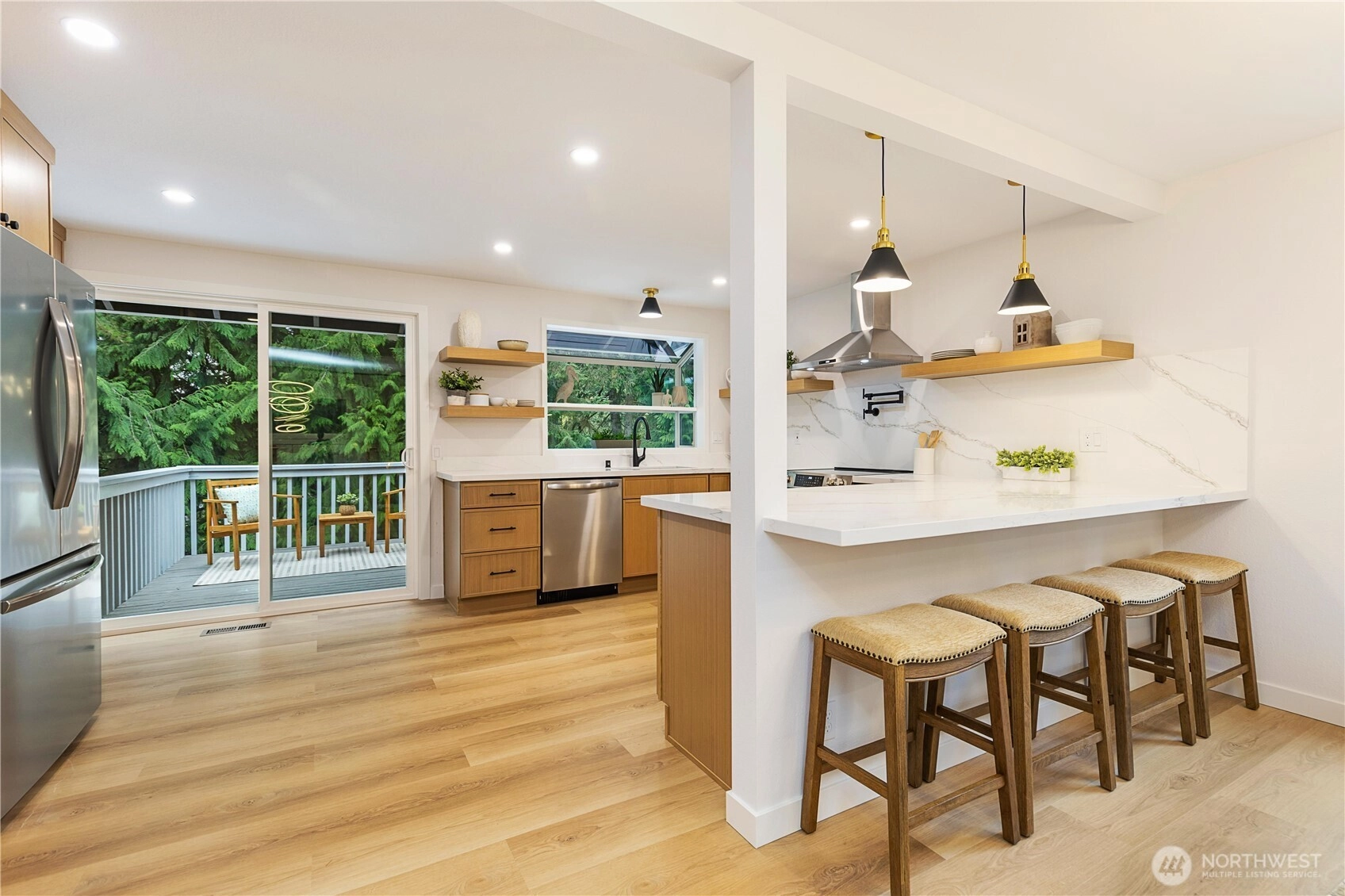 Remodeled tri-level in Lake Forest Park, tucked in a friendly neighborhood near Horizon View & within the Shoreline School District. Deeded beach access via the Lake Forest Park Civic Club. Vaulted ceilings on the main level with open living room, custom kitchen with newest slim shaker cabinets & stone countertop & backsplash, pot filler, stainless appliances, & formal dining area. Main floor primary suite with double vanity and ¾ bath, plus 2 more bedrooms & full hall bath. Lower level offers family room with patio access, 4th bedroom, ¾ bath, and laundry. Private backyard with multiple decks & oversized patio, perfect for entertaining all year around & for everyone to enjoy. 2-car garage, central A/C, quiet established neighborhood