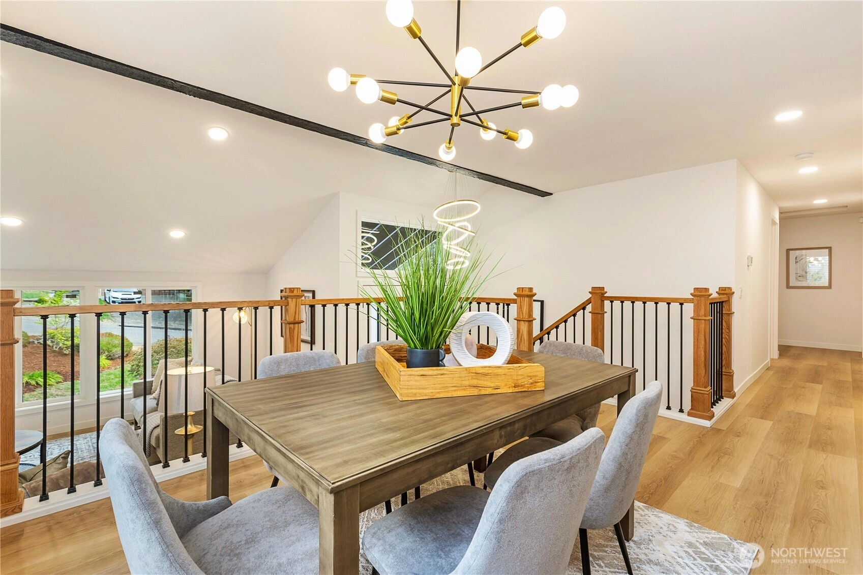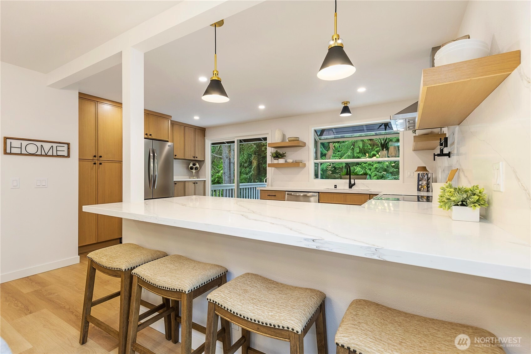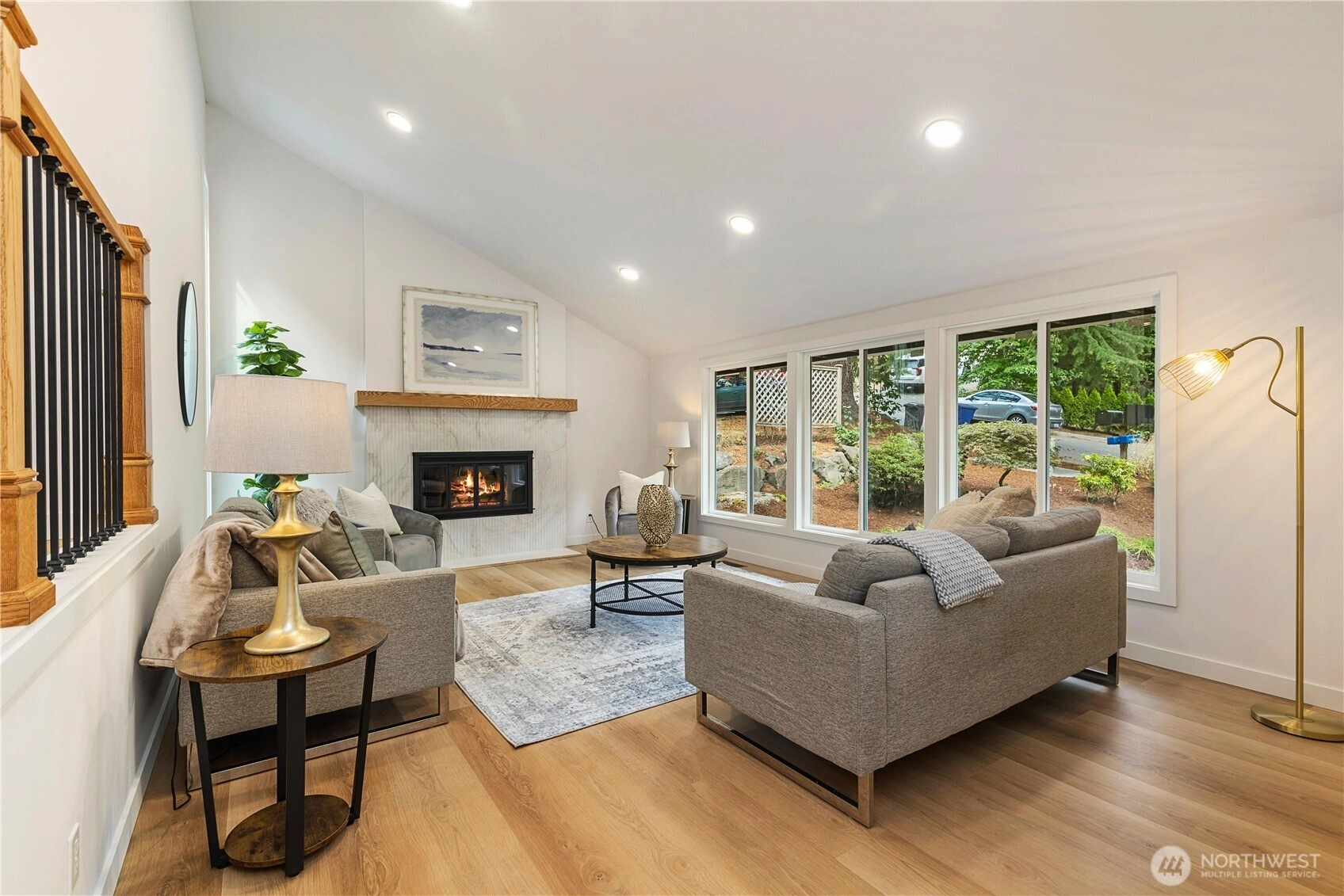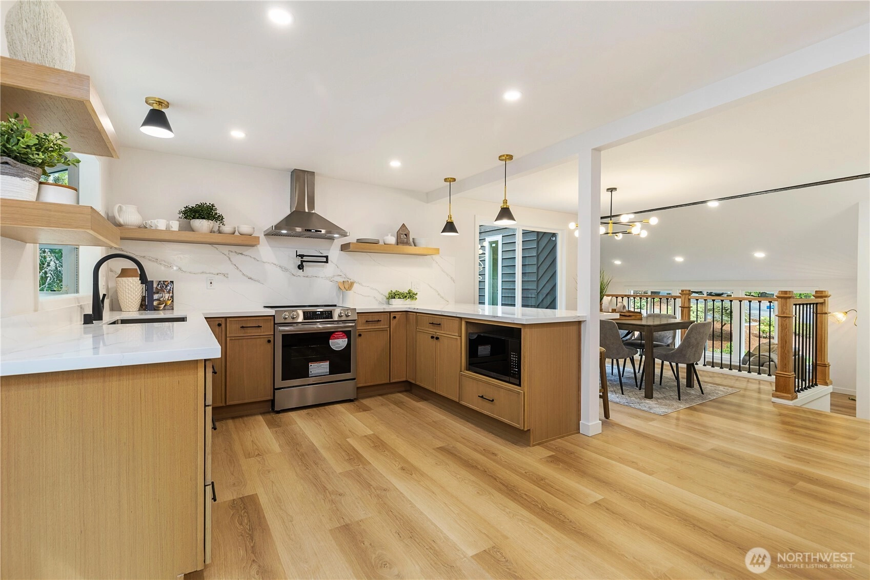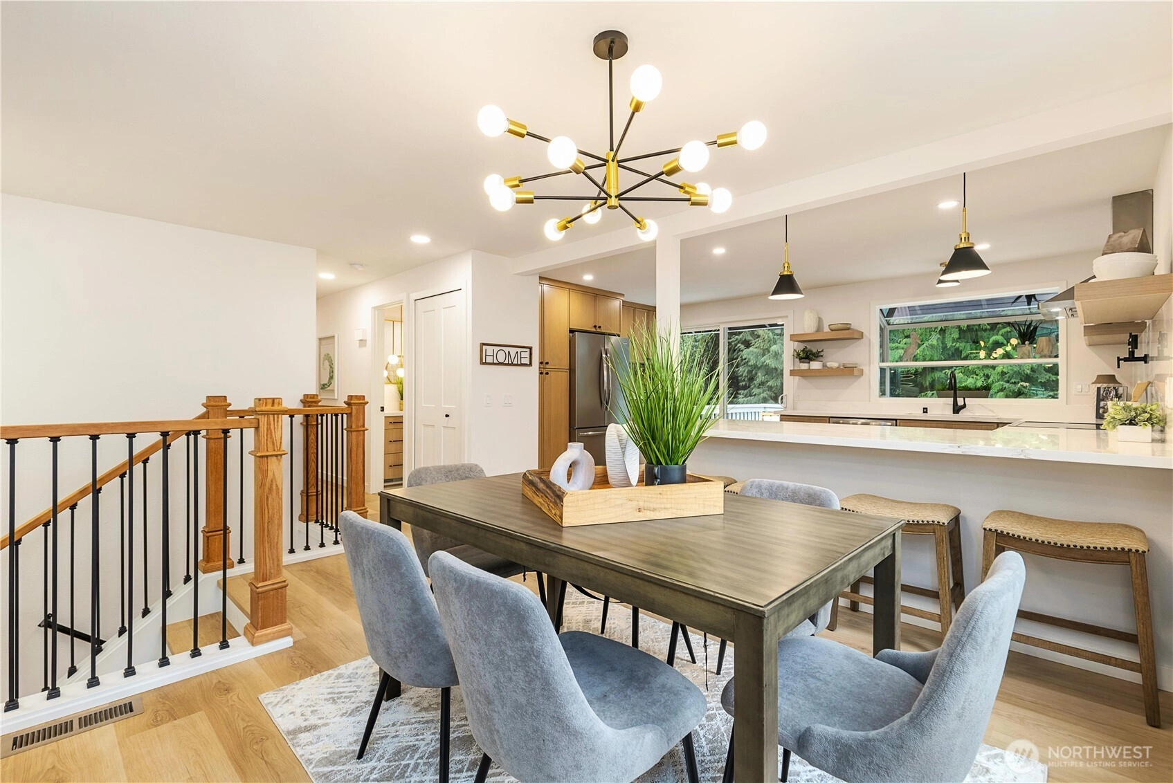 Remodeled tri-level in Lake Forest Park, tucked in a friendly neighborhood near Horizon View & within the Shoreline School District. Deeded beach access via the Lake Forest Park Civic Club. Vaulted ceilings on the main level with open living room, custom kitchen with newest slim shaker cabinets & stone countertop & backsplash, pot filler, stainless appliances, & formal dining area. Main floor primary suite with double vanity and ¾ bath, plus 2 more bedrooms & full hall bath. Lower level offers family room with patio access, 4th bedroom, ¾ bath, and laundry. Private backyard with multiple decks & oversized patio, perfect for entertaining all year around & for everyone to enjoy. 2-car garage, central A/C, quiet established neighborhood