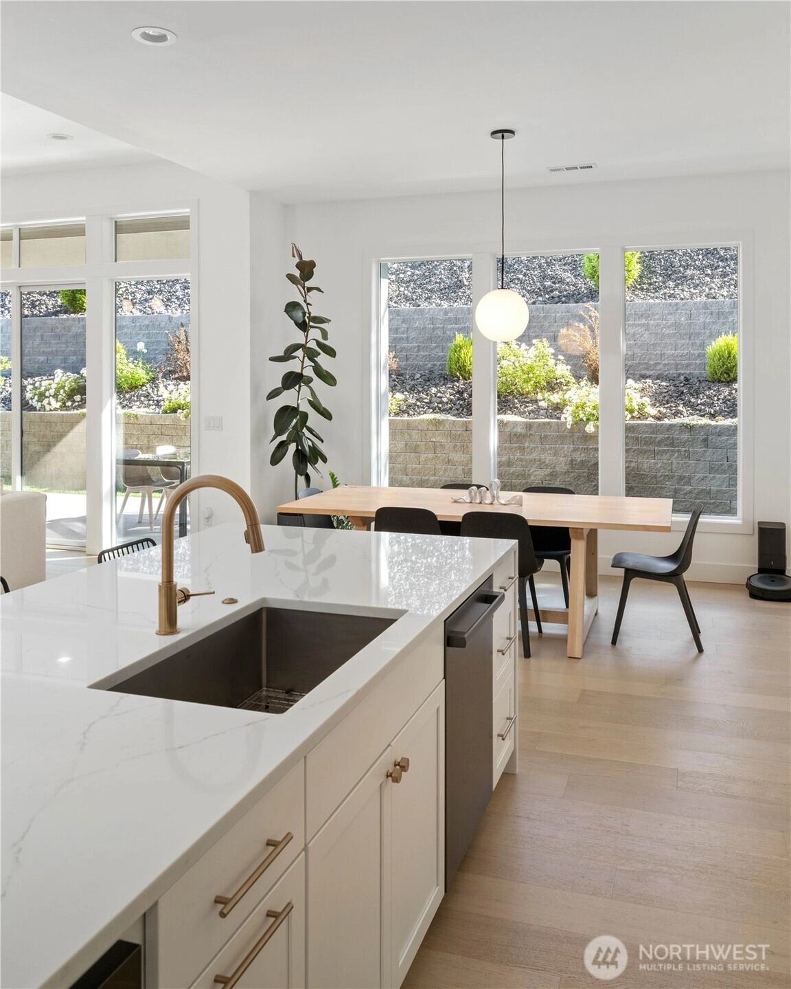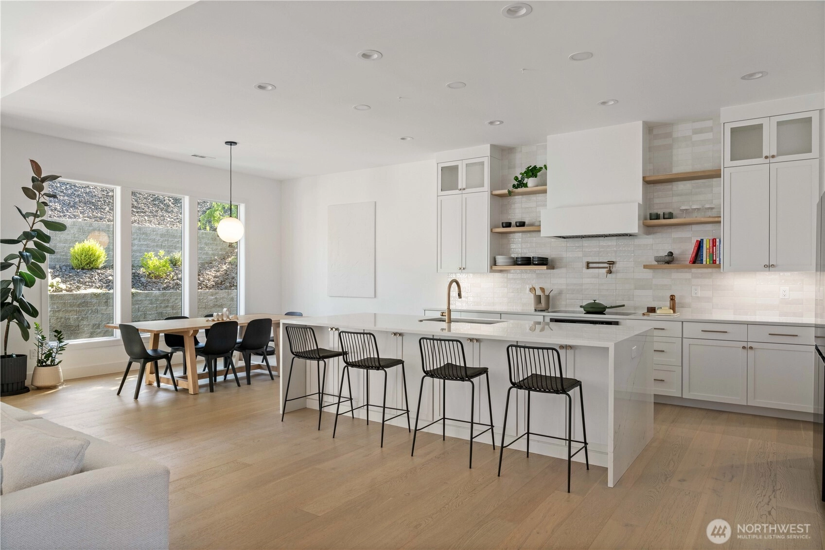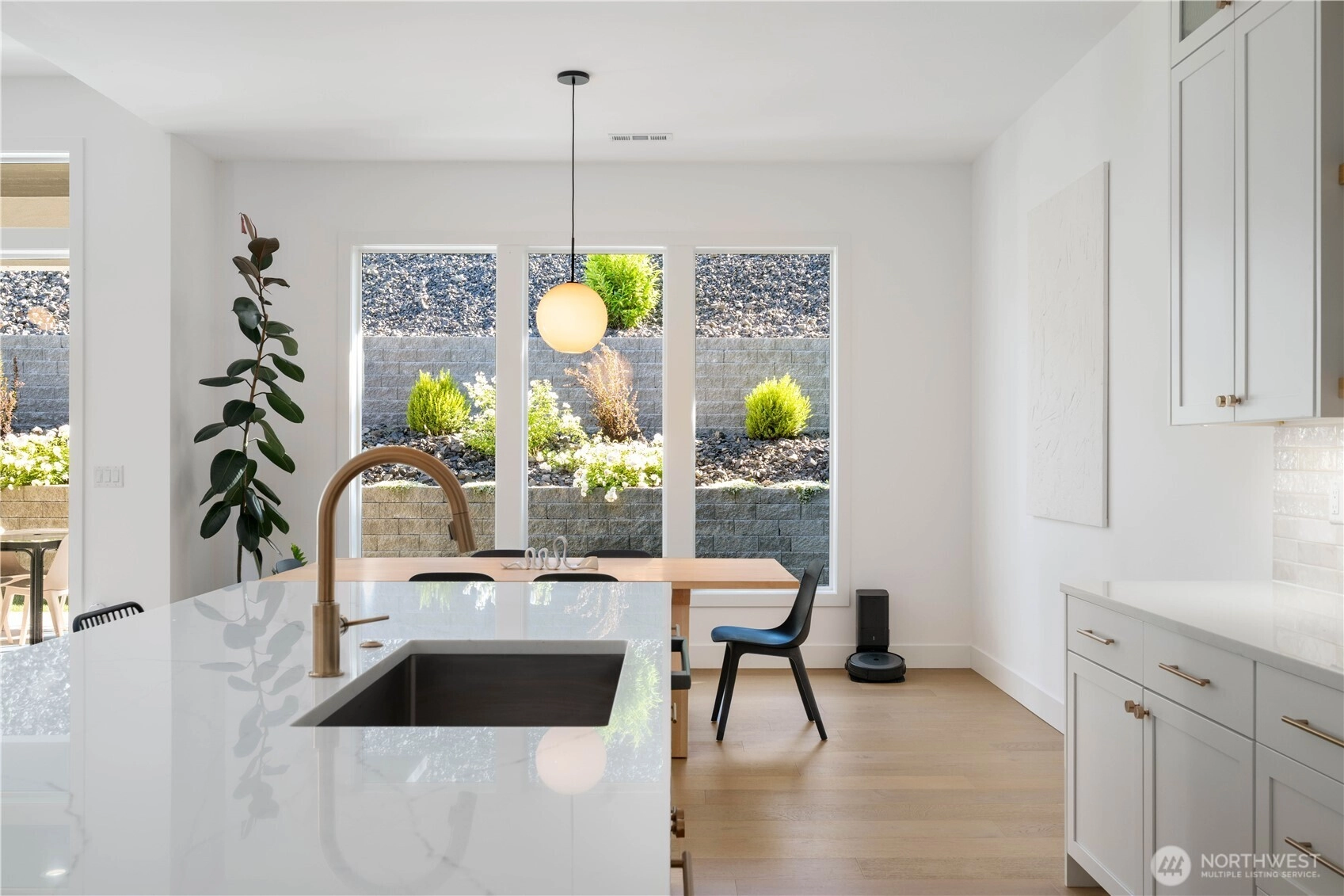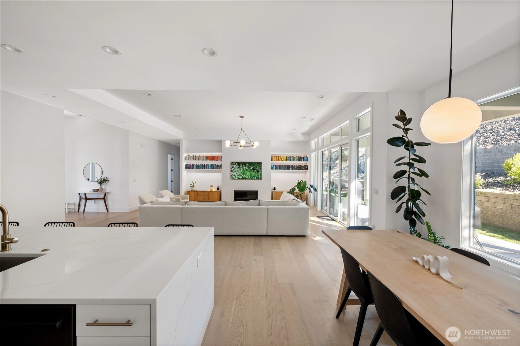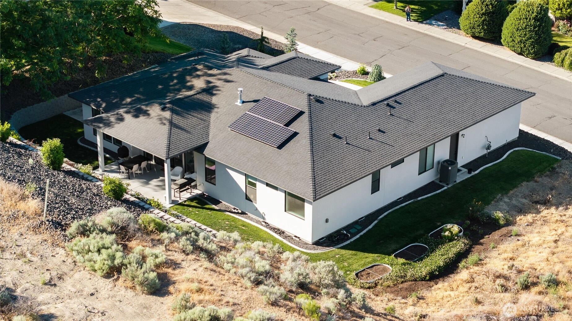 New Price! Open floor plan with 10' ceilings and 8' doors. Large great room offers hardwood floors, built-in fireplace cabinetry and flows to a covered patio wired for an outdoor kitchen. The chef's kitchen includes a large island, quartz counters, gold hardware, pot filler over the 36" range, glass-fronted cabinets, and a lighted pantry with a drawer microwave. The mud/laundry room features ample storage, deep sink, drying rack, and quartz surfaces. The primary suite includes a spa bath with dual vanities, freestanding tub, rain shower, makeup nook, and oversized walk-in closet. Outside: panoramic Tri-Cities views, stucco exterior, festive-ready soffits, solar panels and an EV-ready 25x26' garage with keypad and extra parking pad.