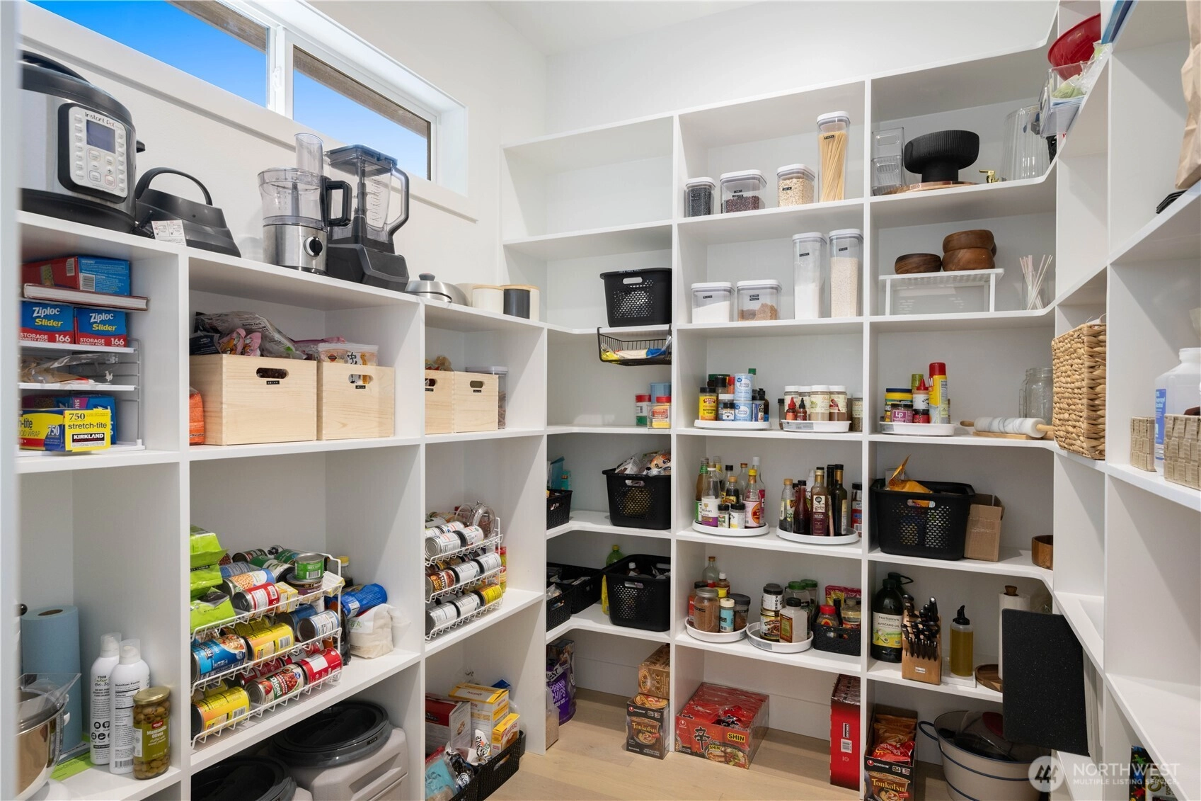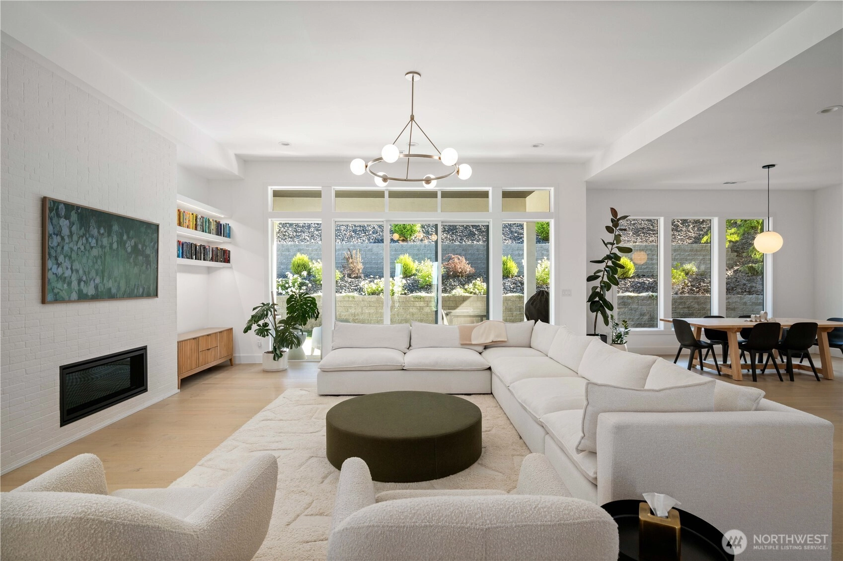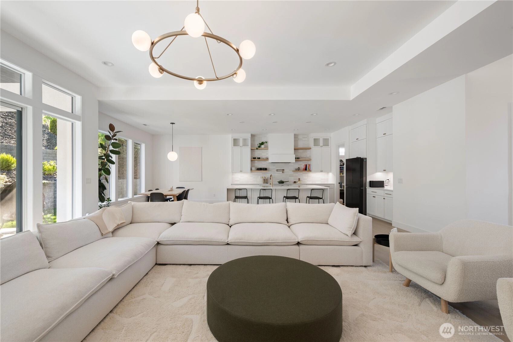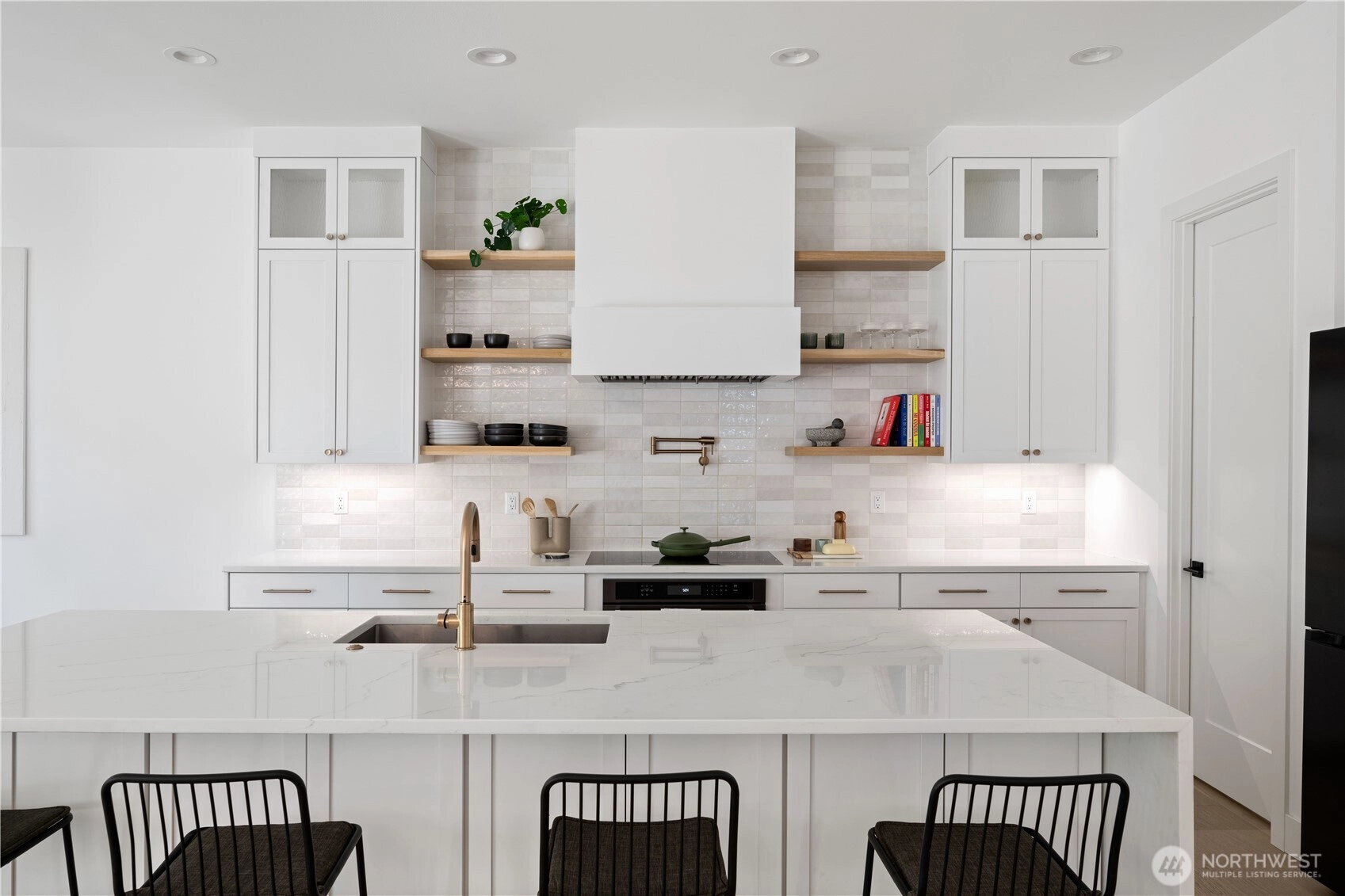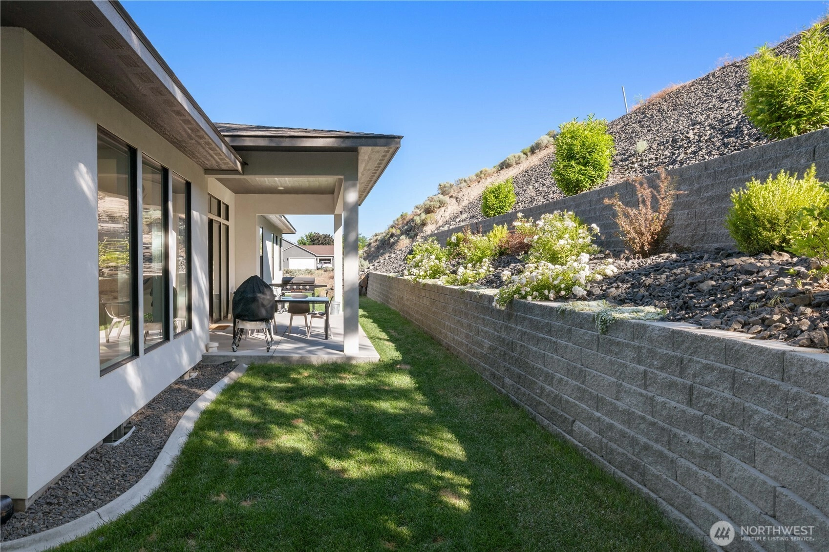 New Price! Open floor plan with 10' ceilings and 8' doors. Large great room offers hardwood floors, built-in fireplace cabinetry and flows to a covered patio wired for an outdoor kitchen. The chef's kitchen includes a large island, quartz counters, gold hardware, pot filler over the 36" range, glass-fronted cabinets, and a lighted pantry with a drawer microwave. The mud/laundry room features ample storage, deep sink, drying rack, and quartz surfaces. The primary suite includes a spa bath with dual vanities, freestanding tub, rain shower, makeup nook, and oversized walk-in closet. Outside: panoramic Tri-Cities views, stucco exterior, festive-ready soffits, solar panels and an EV-ready 25x26' garage with keypad and extra parking pad.