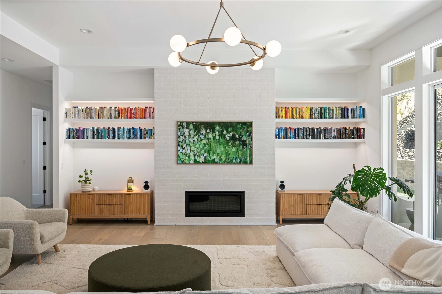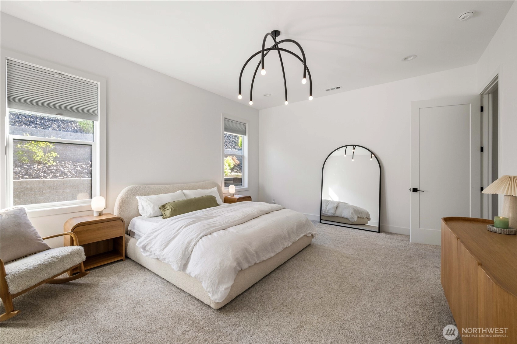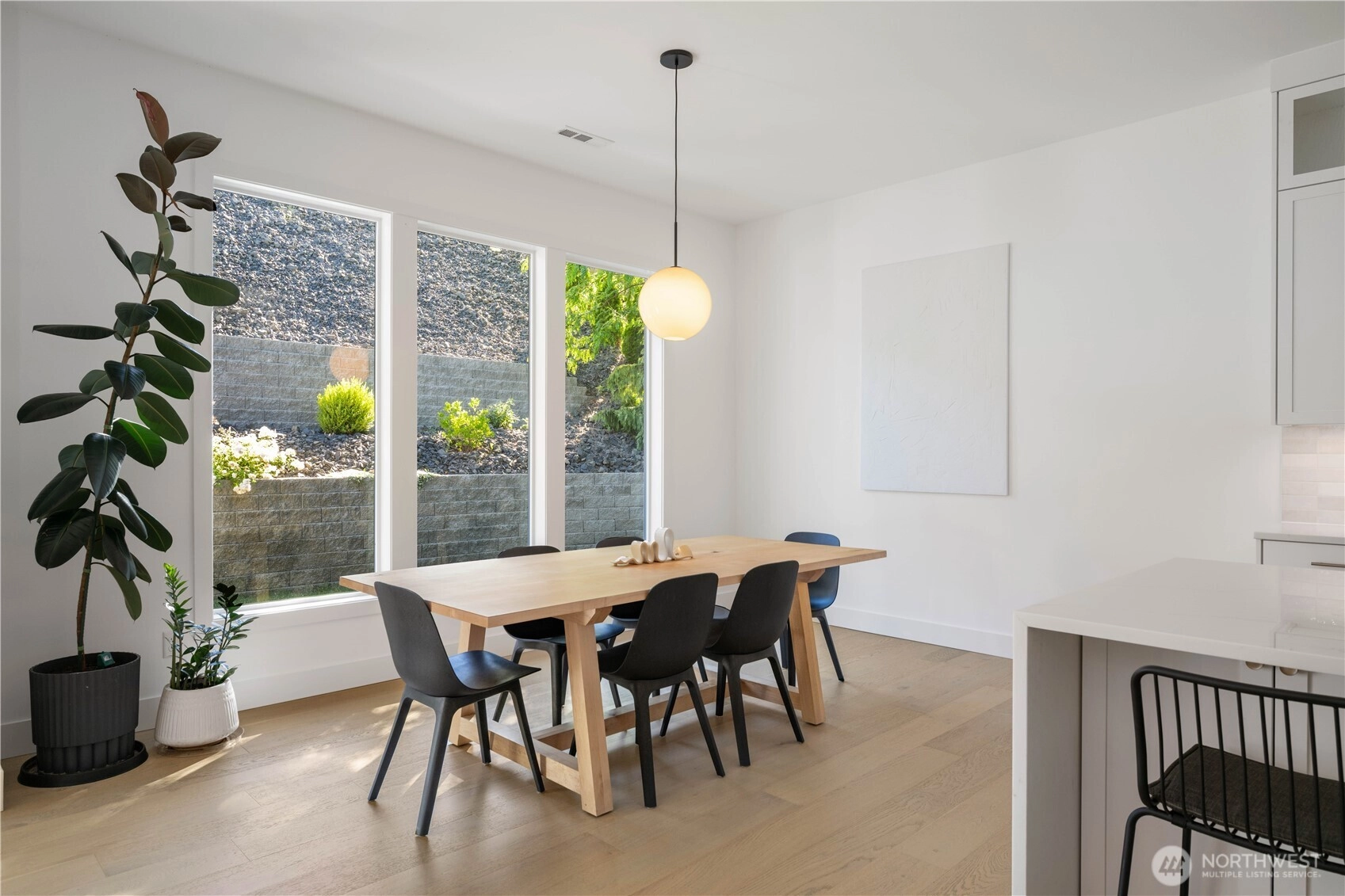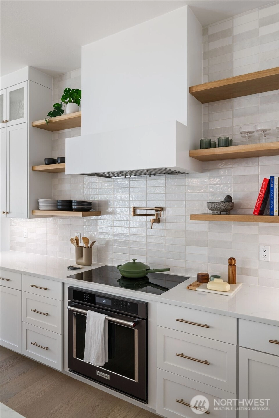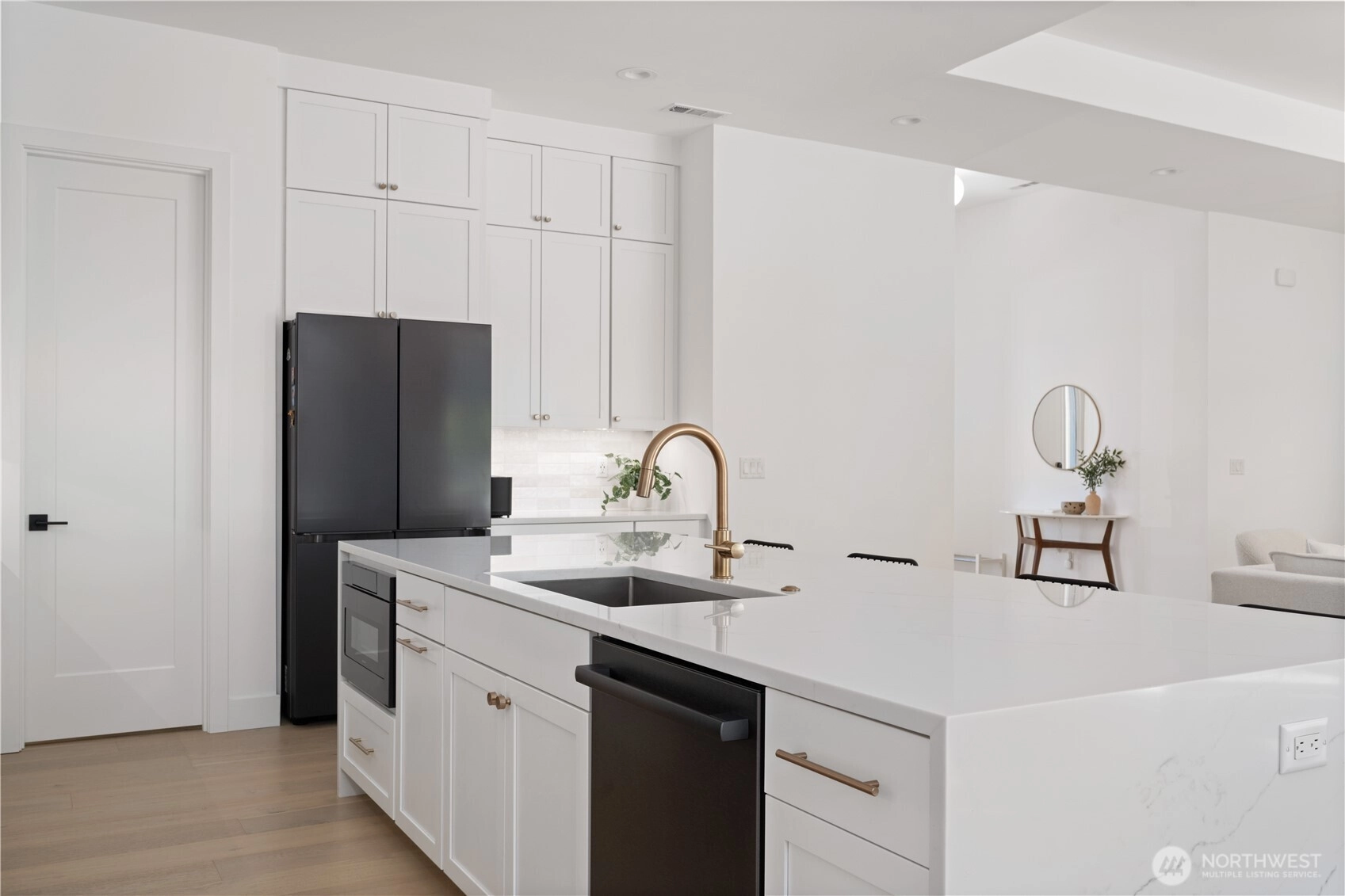 New Price! Open floor plan with 10' ceilings and 8' doors. Large great room offers hardwood floors, built-in fireplace cabinetry and flows to a covered patio wired for an outdoor kitchen. The chef's kitchen includes a large island, quartz counters, gold hardware, pot filler over the 36" range, glass-fronted cabinets, and a lighted pantry with a drawer microwave. The mud/laundry room features ample storage, deep sink, drying rack, and quartz surfaces. The primary suite includes a spa bath with dual vanities, freestanding tub, rain shower, makeup nook, and oversized walk-in closet. Outside: panoramic Tri-Cities views, stucco exterior, festive-ready soffits, solar panels and an EV-ready 25x26' garage with keypad and extra parking pad.