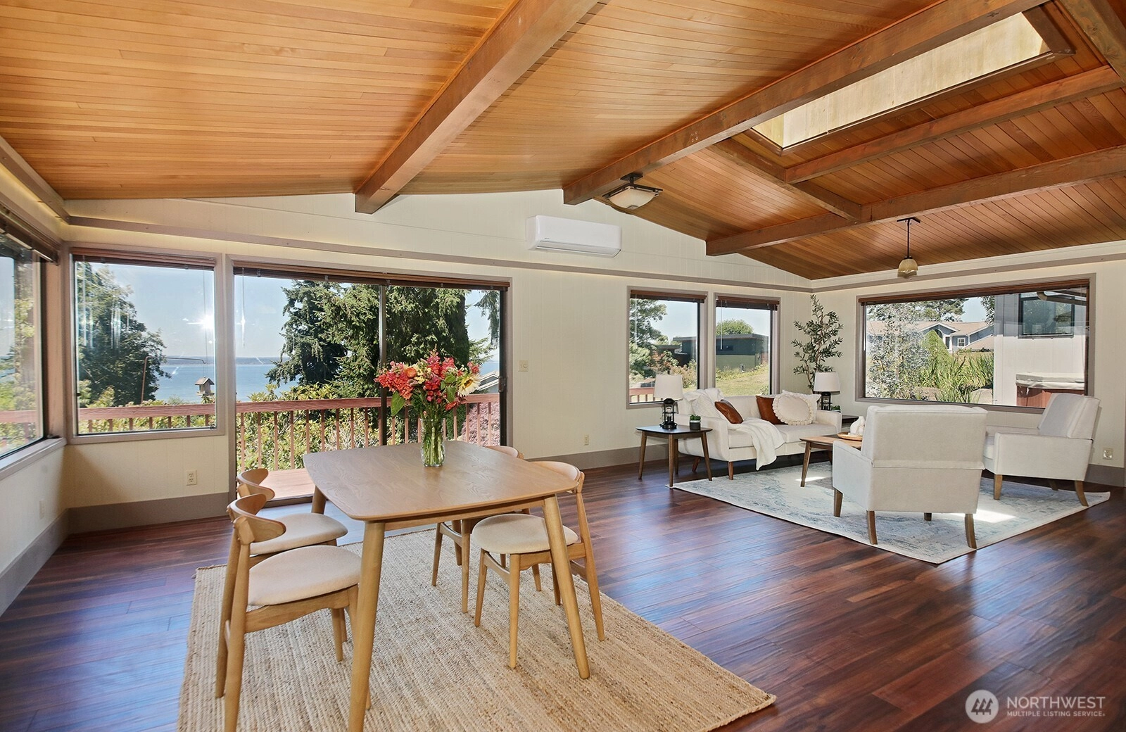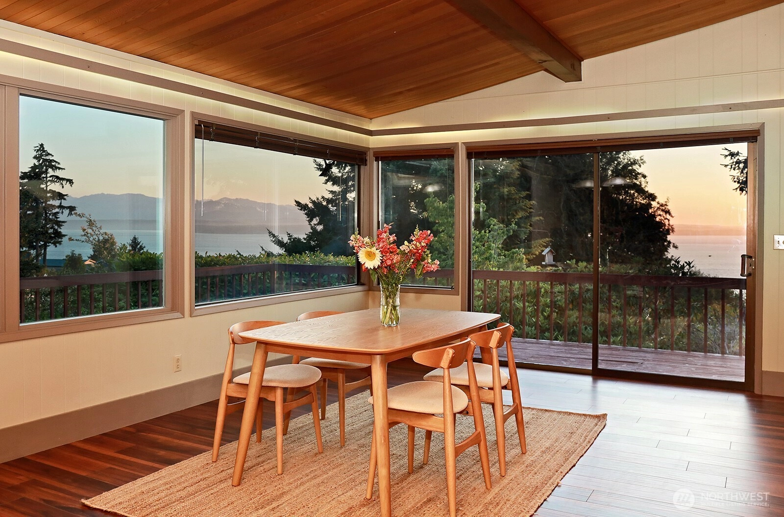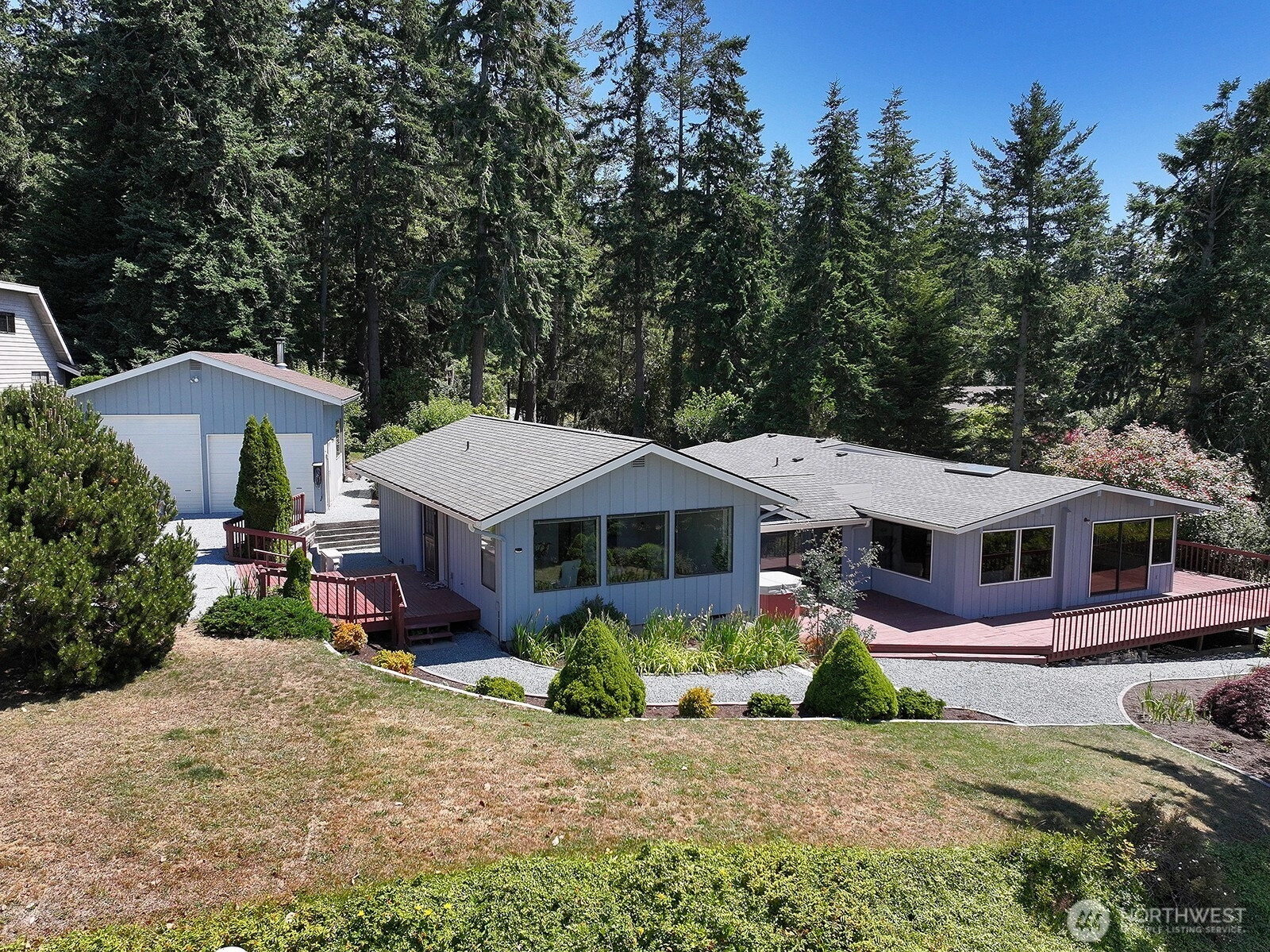 Perfectly perched with sweeping Western views of the Sound and Majestic Olympics, this one-level, mid-century home has been remodeled to maximize your view. Enjoy the rare combination of privacy and spaciousness that typically comes with acreage properties. Possibilities live Big with over 3/4 of an acre of mature landscaping an expansive entertaining deck, a spacious backyard, two driveways, a garage and a shop! Your kitchen & Primary bath have been updated with marble countertops & custom tile work, new flooring throughout most of the home and ductless mini-splits, too! The Primary Suite can easily live as a separate guest space with great potential for rental income. Enjoy beach & boat access at nearby Bush Point. Welcome to Whidbey!