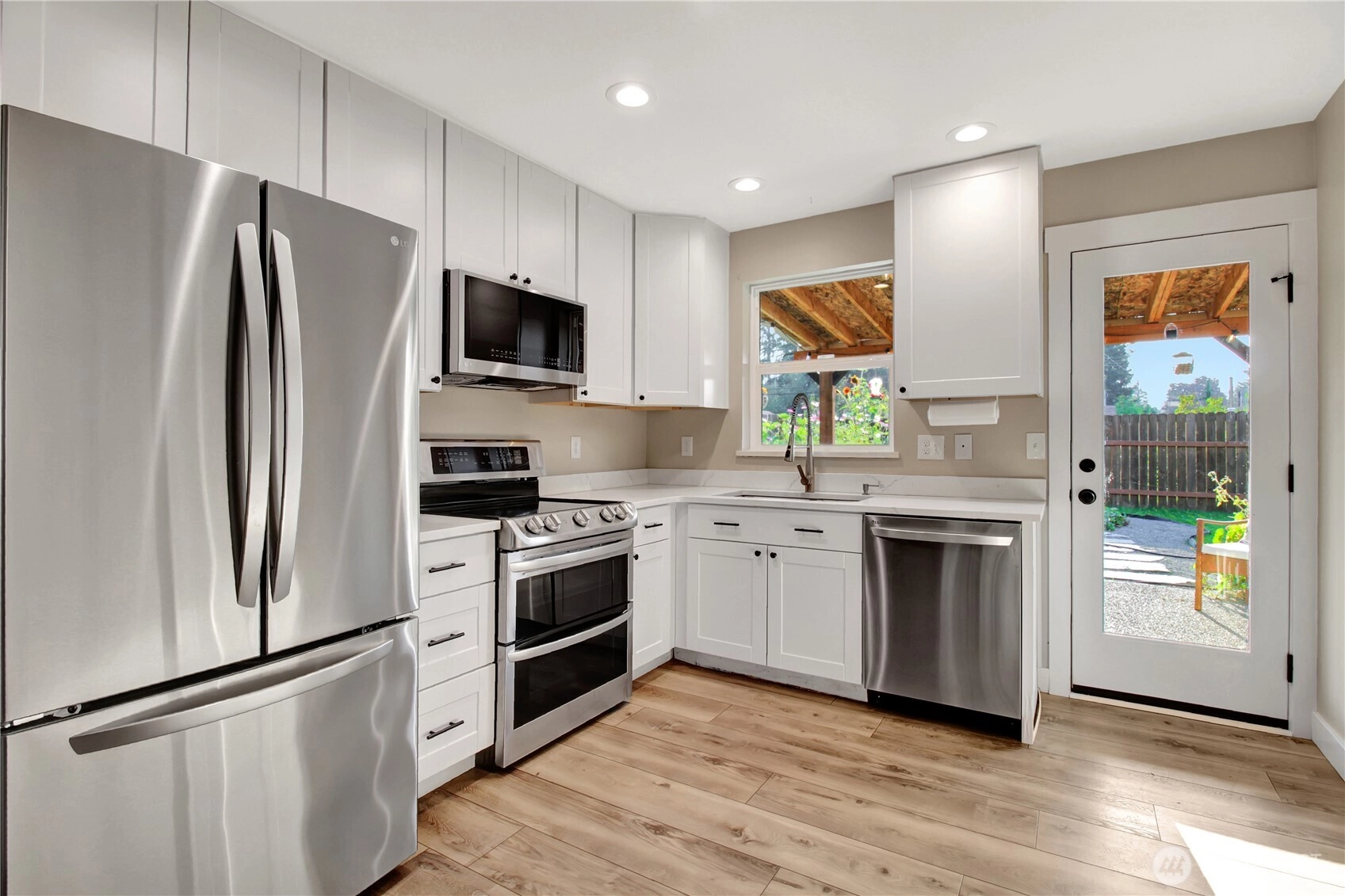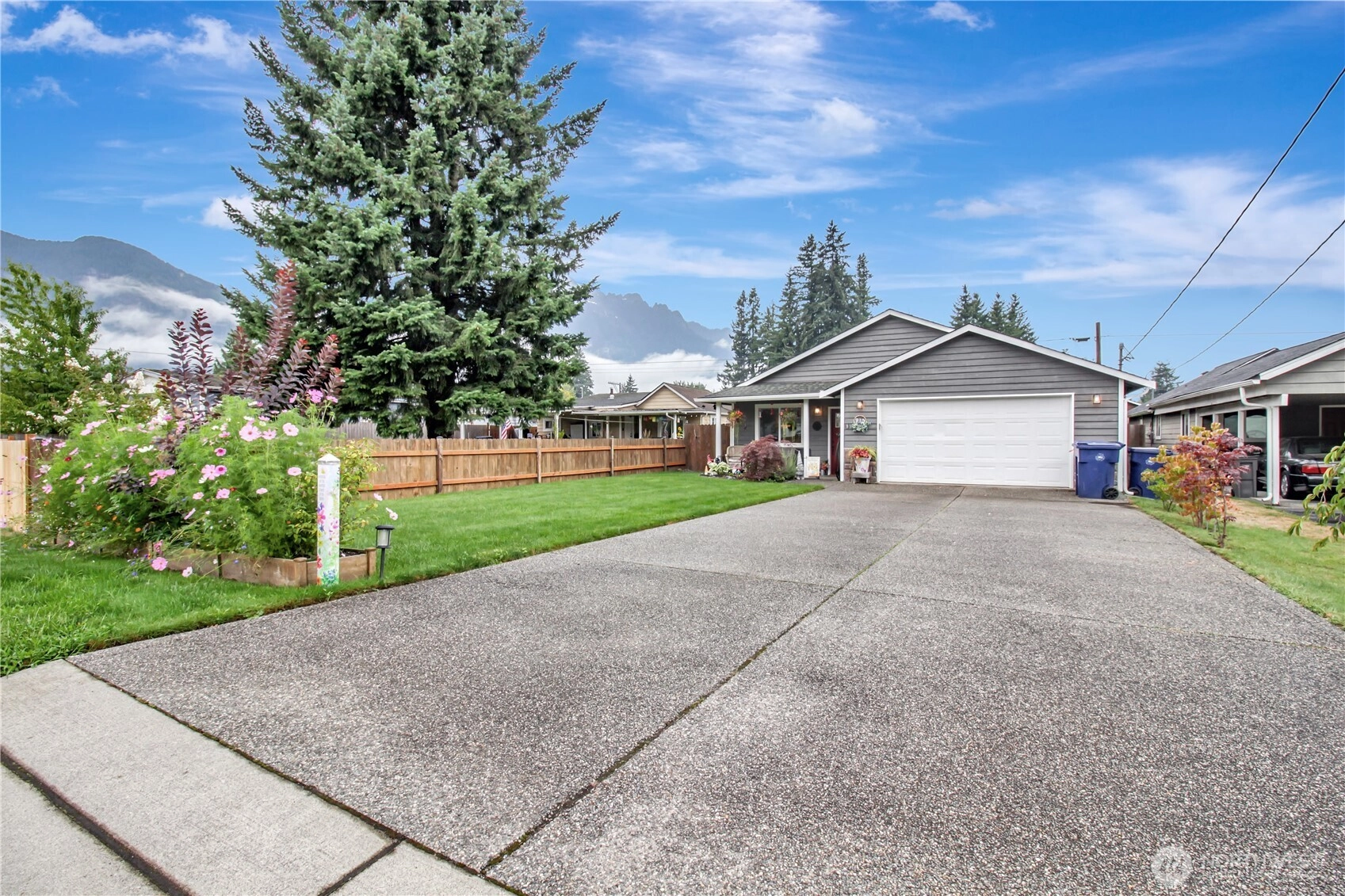 Charming 2-bedroom house featuring brand-new flooring throughout, modern appliances only 2 years old, and a beautifully remodeled bathroom. The home is nestled in a lush, landscaped, fenced yard perfect for outdoor gatherings and morning coffees. Enjoy breathtaking views of Whitehorse Mountain from your kitchen window and back patio. This classic craftsman style rambler home may be small, but it is mighty. The large 2 car garage with spacious bedroom closets gives this home plenty of storage options. With an open floor plan the kitchen, dining and living area flow together naturally with room for guests. The Old school park is right across the street! Tennis courts, playground, skate park and covered gazebo all are within sight.
