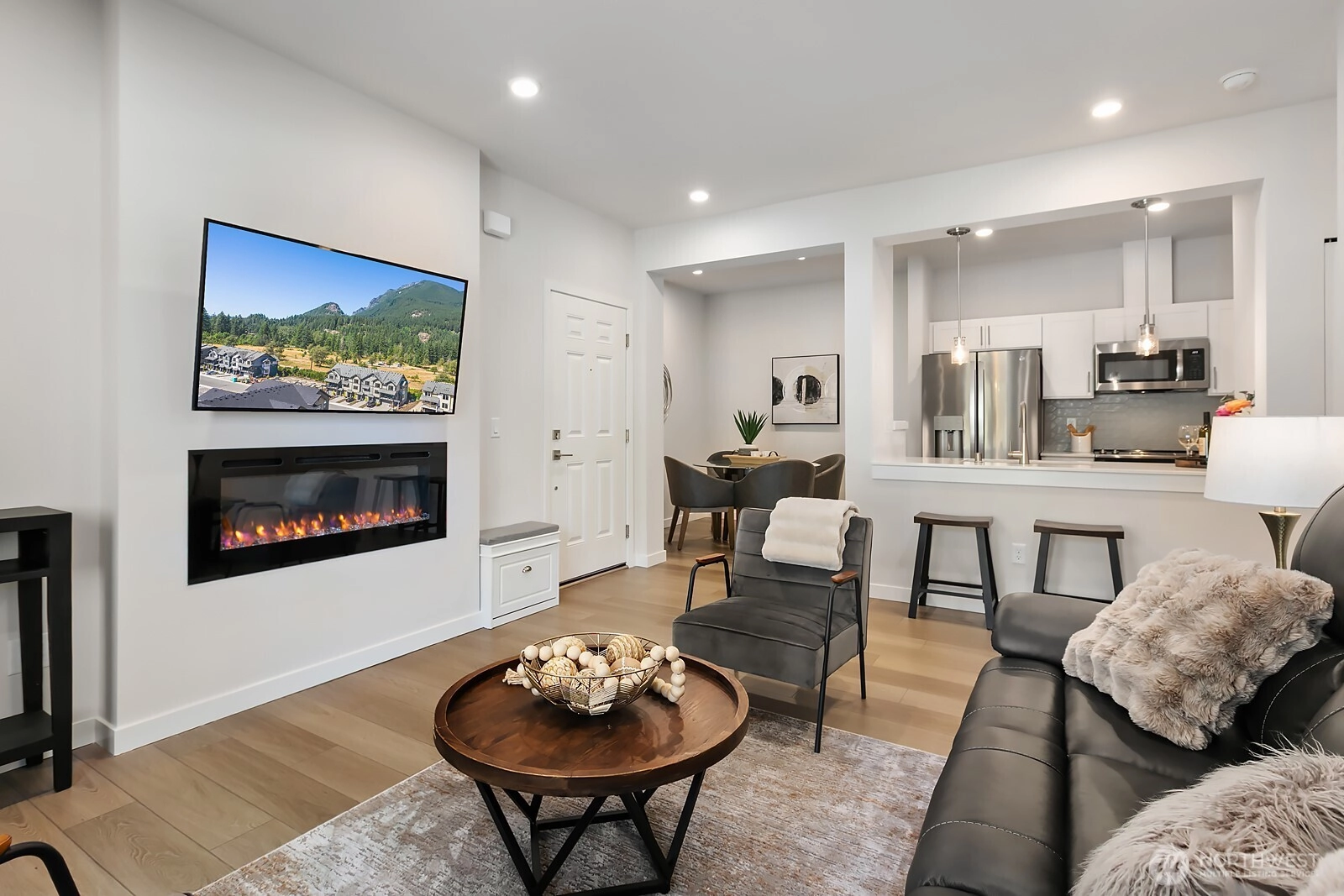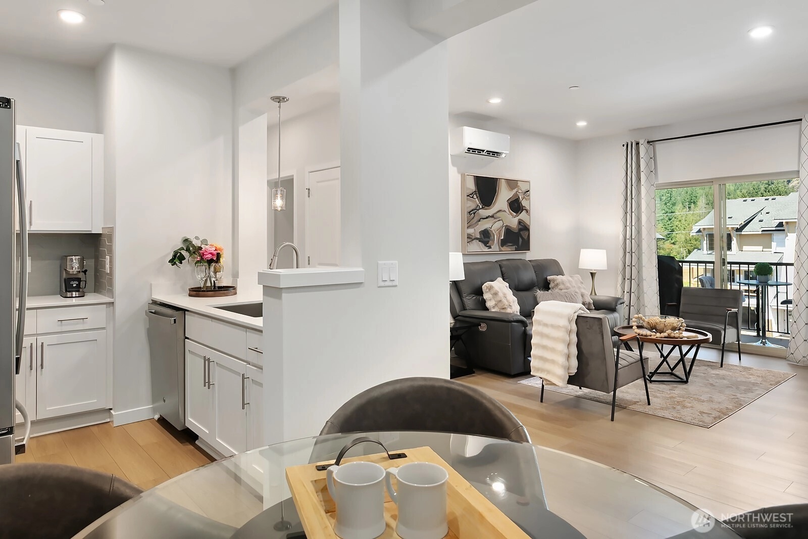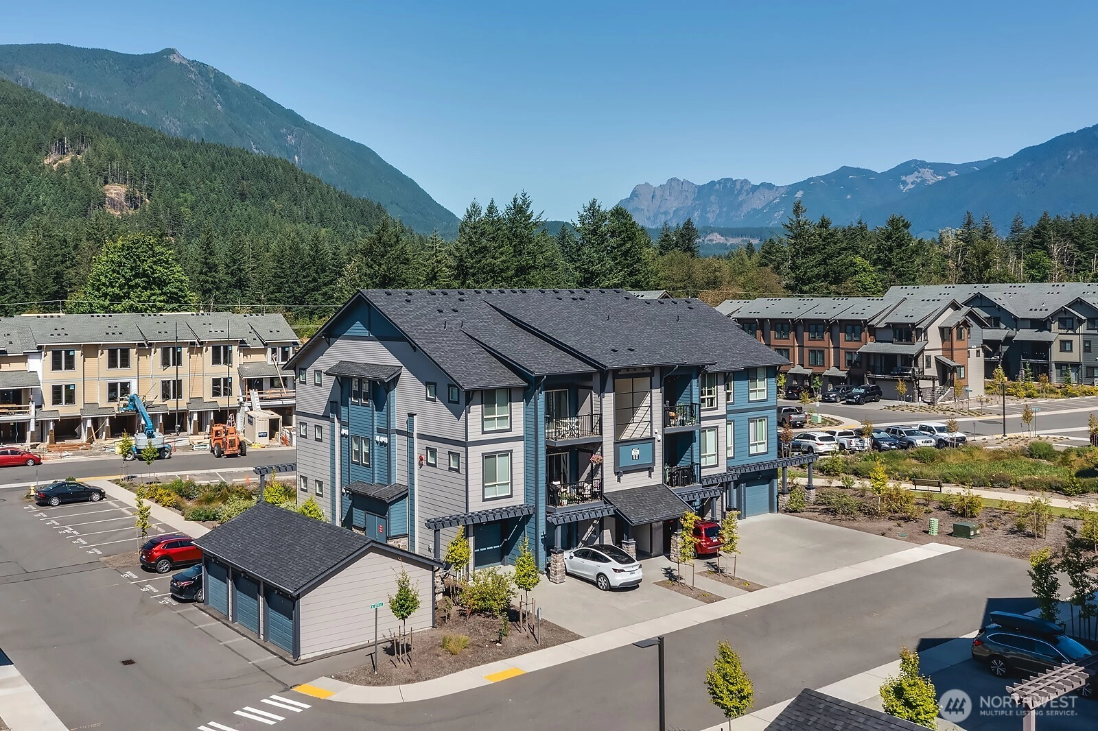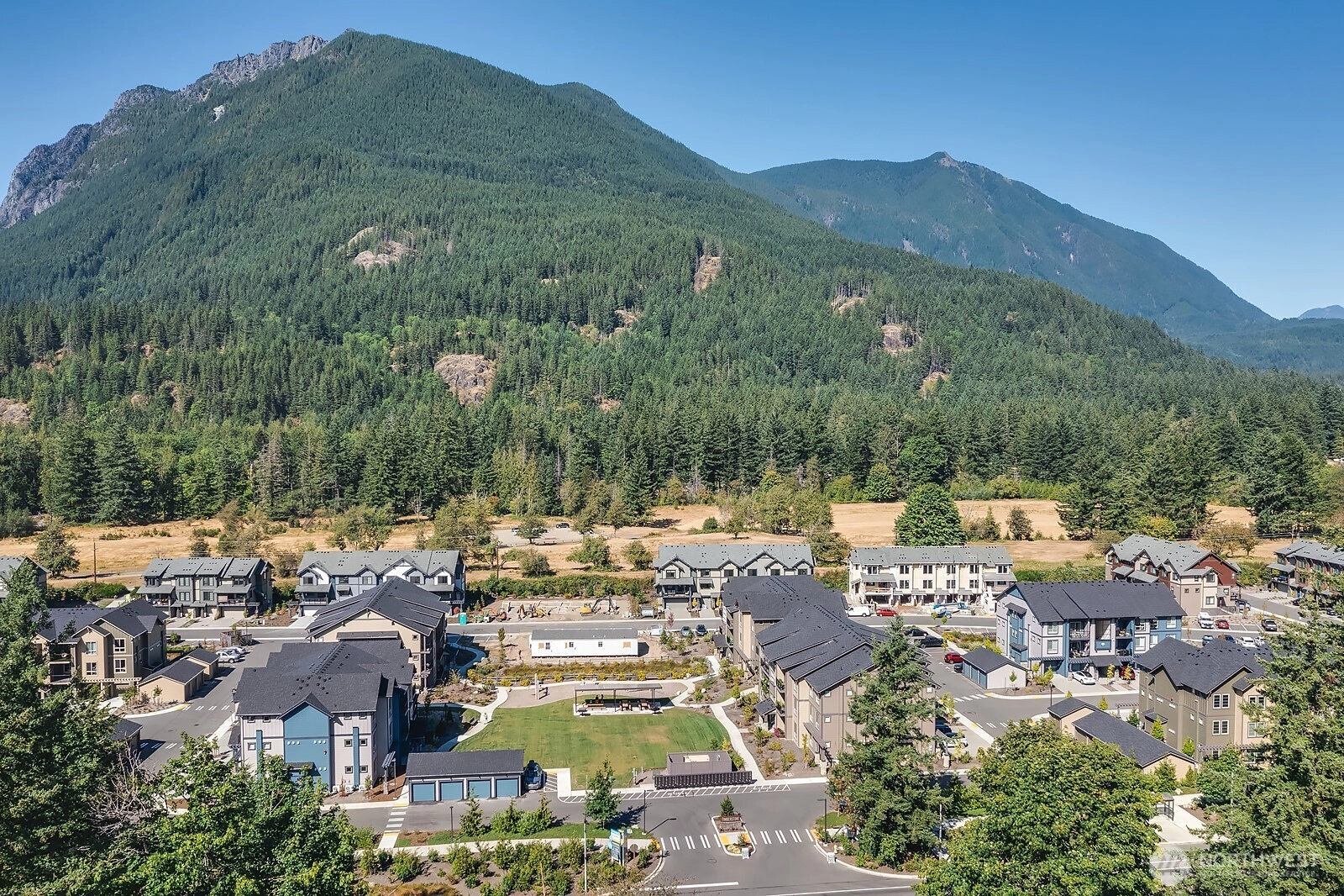 Better than new! This stunning top-floor, corner-unit condo offers sweeping views and modern style in one of the area's most desirable locations. Built in 2024, the home features an open layout, solid-surface counters, stainless steel appliances, and designer finishes throughout. Enjoy peace and privacy with no neighbors above, plus natural light from multiple exposures including a rare mountain-facing deck. The attached single-car garage adds convenience, while direct access to the community park—with pickleball, volleyball, and a covered picnic shelter—elevates your lifestyle. Don't miss the access to the Snoqualmie Valley Trail, river at Tanner Landing, and ample overflow parking options. Low maintenance, high style, and move-in ready!