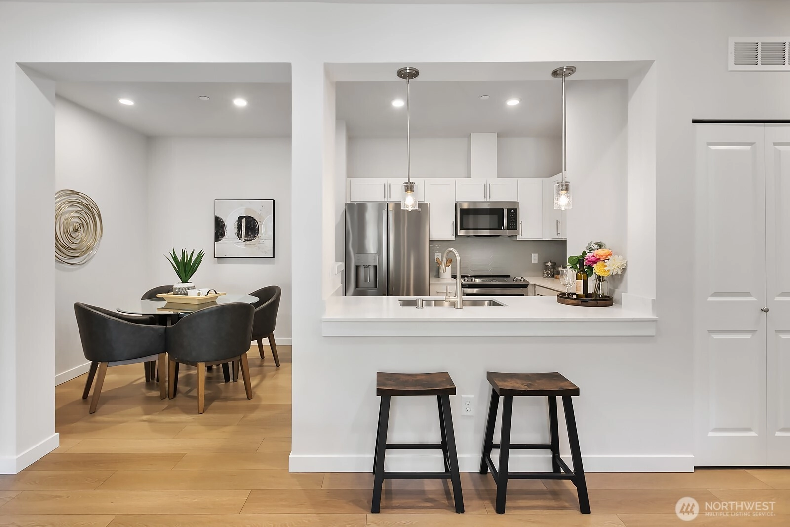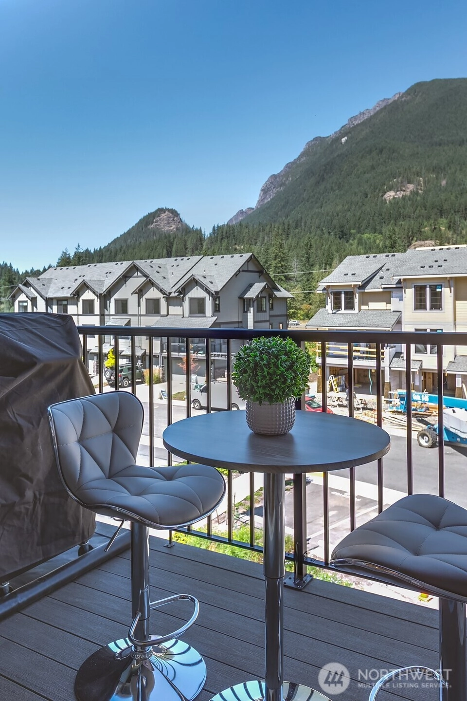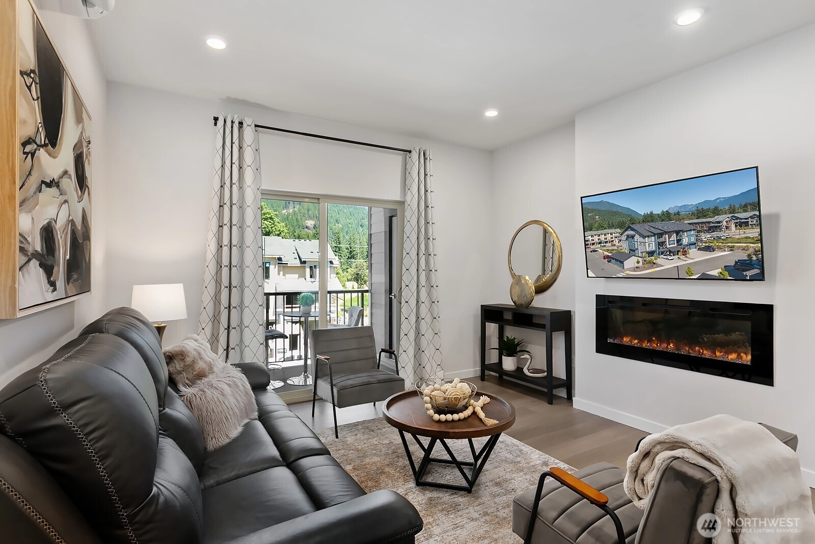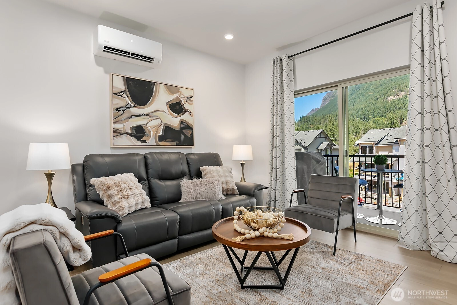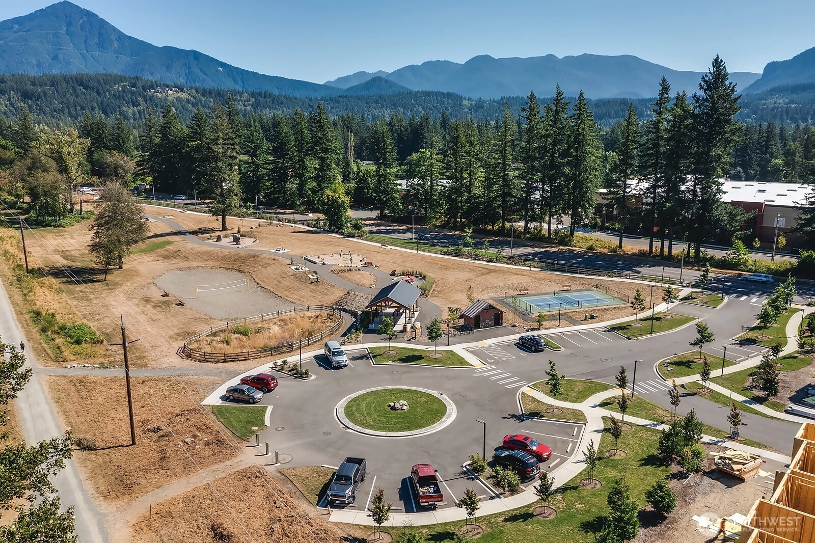Better than new! This stunning top-floor, corner-unit condo offers sweeping views and modern style in one of the area's most desirable locations. Built in 2024, the home features an open layout, solid-surface counters, stainless steel appliances, and designer finishes throughout. Enjoy peace and privacy with no neighbors above, plus natural light from multiple exposures including a rare mountain-facing deck. The attached single-car garage adds convenience, while direct access to the community park—with pickleball, volleyball, and a covered picnic shelter—elevates your lifestyle. Don't miss the access to the Snoqualmie Valley Trail, river at Tanner Landing, and ample overflow parking options. Low maintenance, high style, and move-in ready!