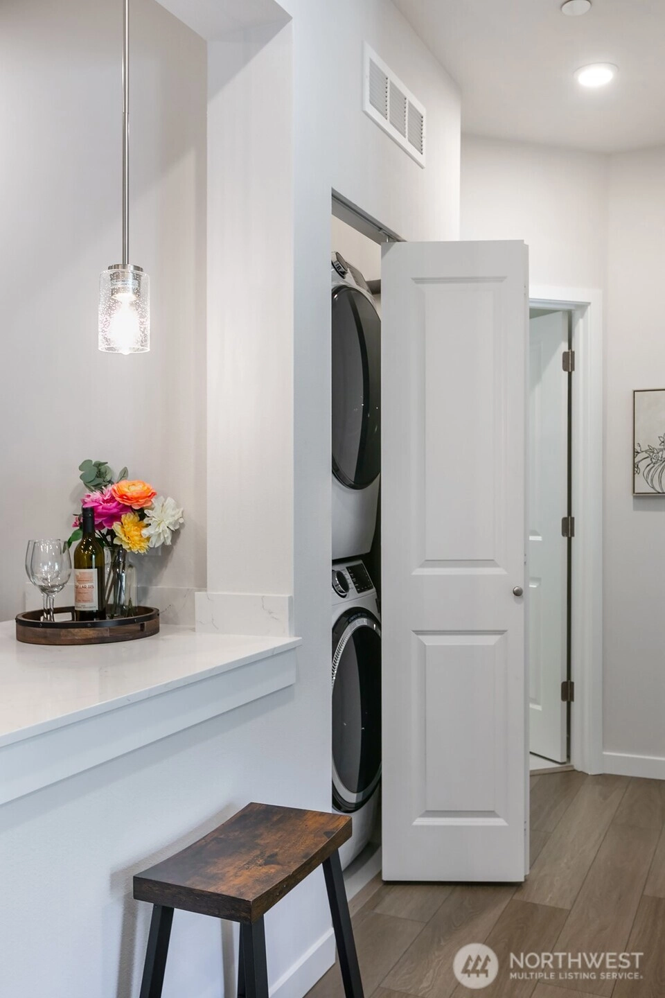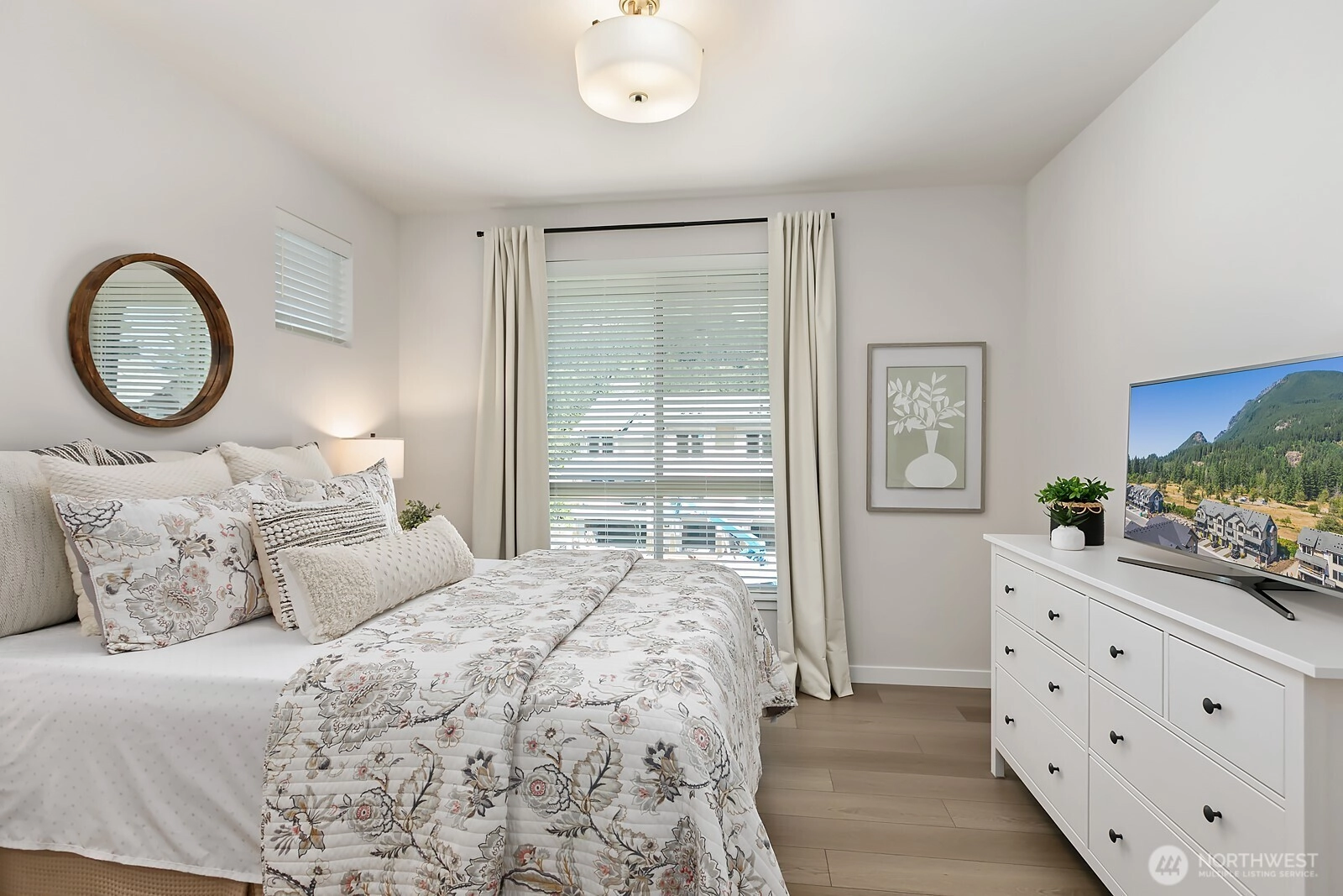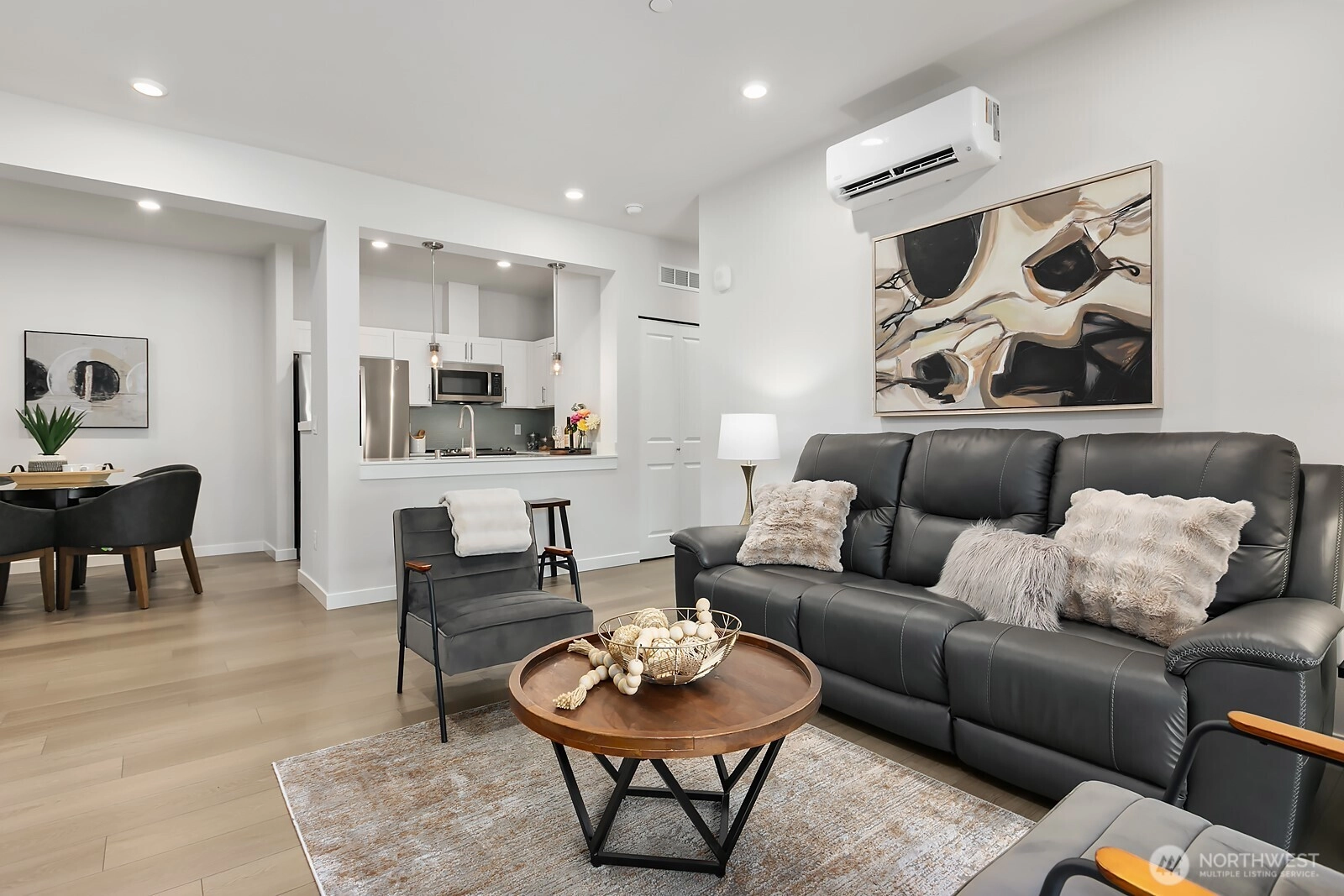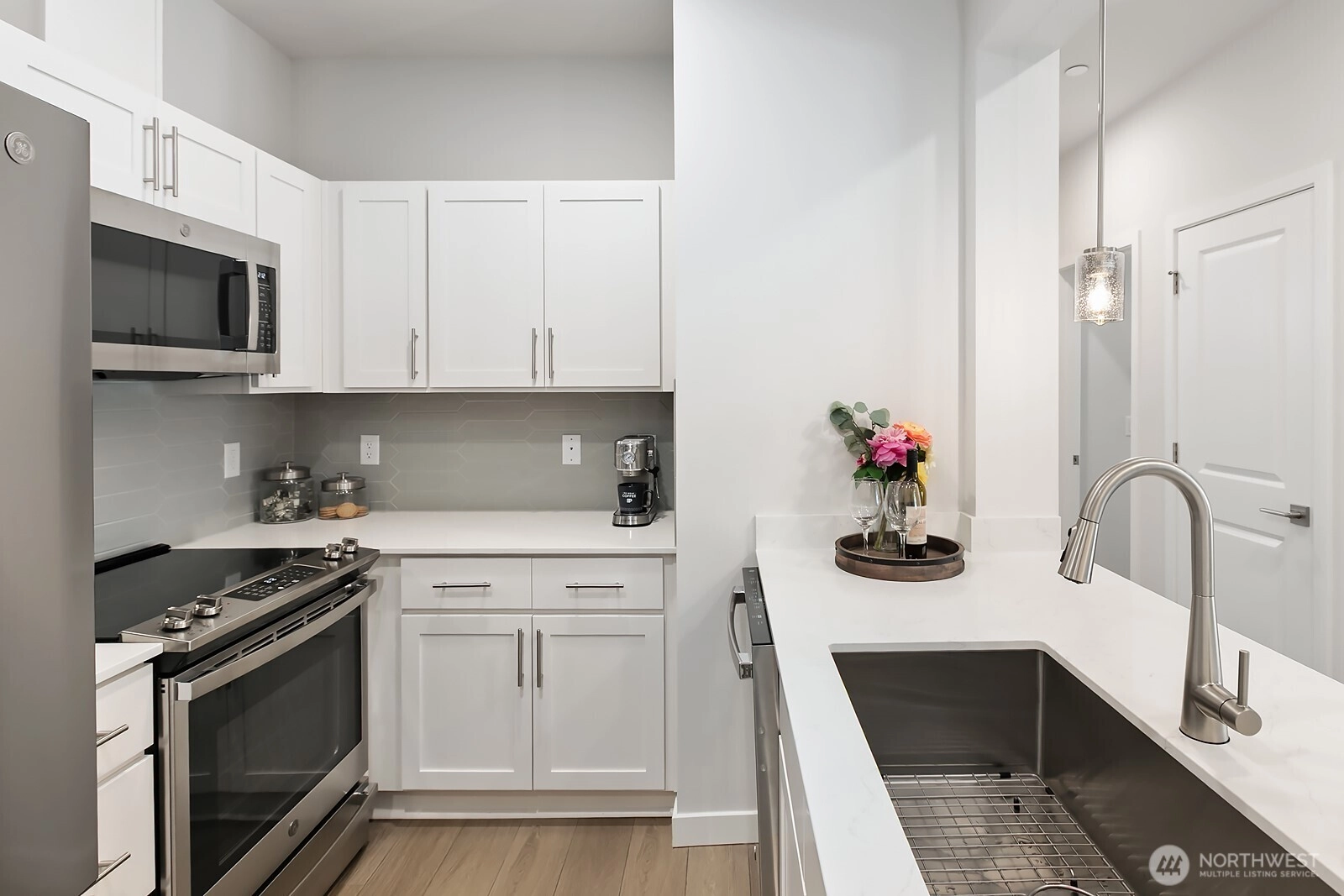 Better than new! This stunning top-floor, corner-unit condo offers sweeping views and modern style in one of the area's most desirable locations. Built in 2024, the home features an open layout, solid-surface counters, stainless steel appliances, and designer finishes throughout. Enjoy peace and privacy with no neighbors above, plus natural light from multiple exposures including a rare mountain-facing deck. The attached single-car garage adds convenience, while direct access to the community park—with pickleball, volleyball, and a covered picnic shelter—elevates your lifestyle. Don't miss the access to the Snoqualmie Valley Trail, river at Tanner Landing, and ample overflow parking options. Low maintenance, high style, and move-in ready!