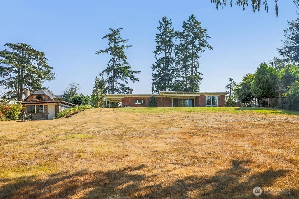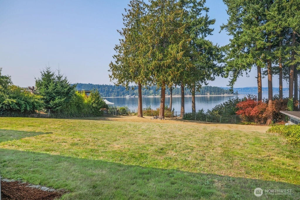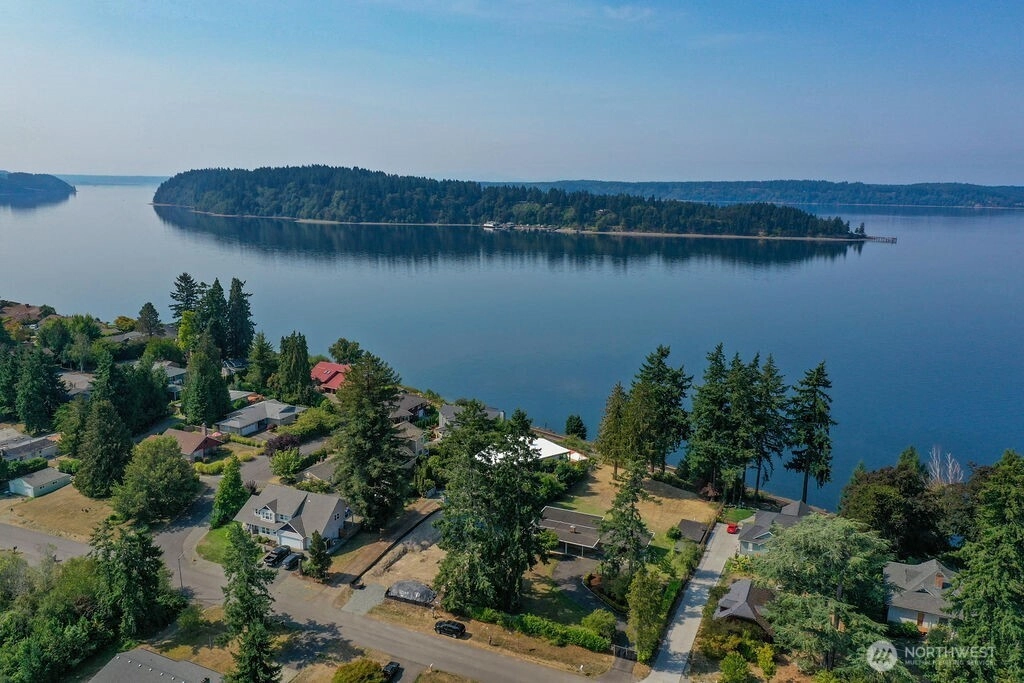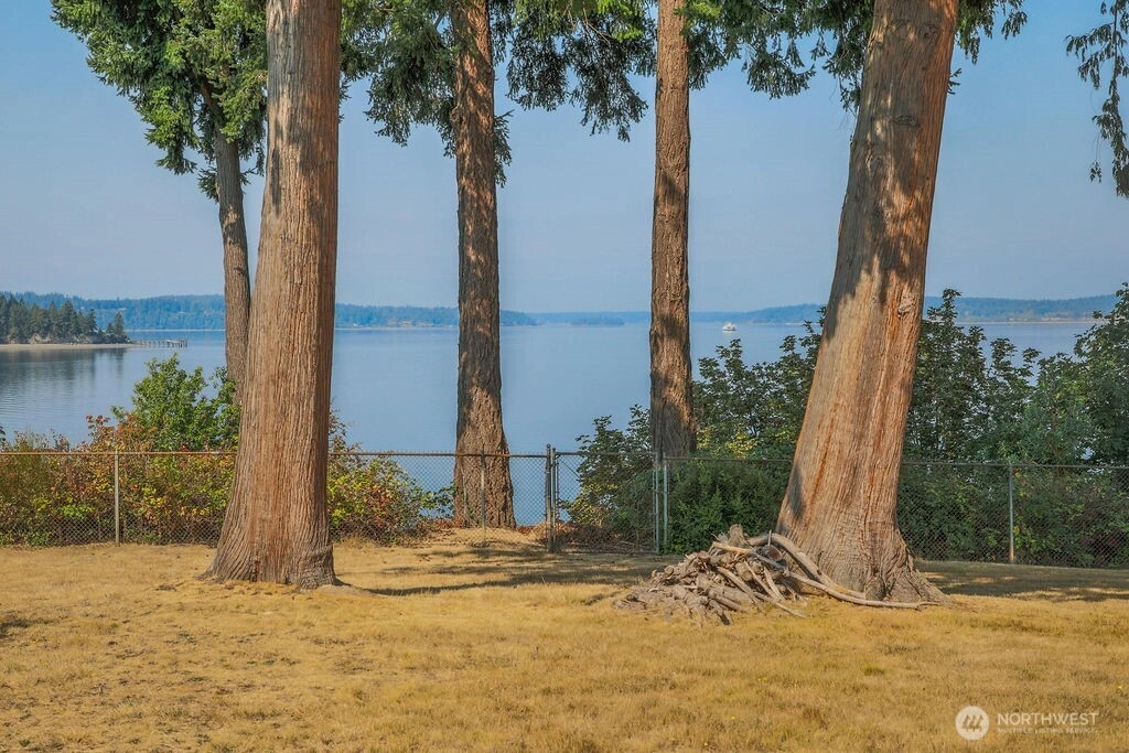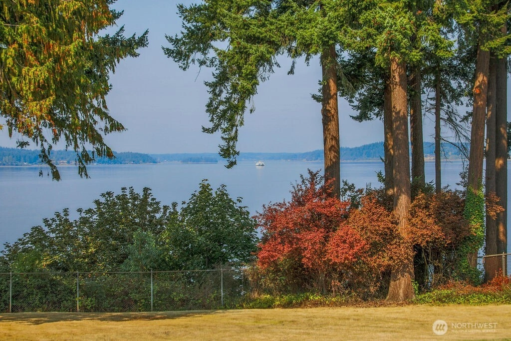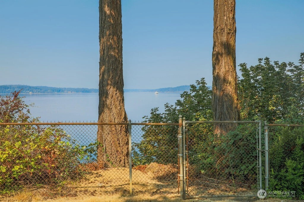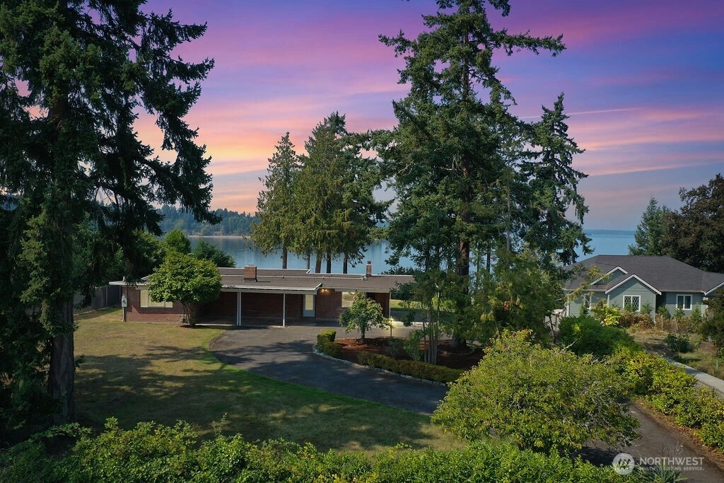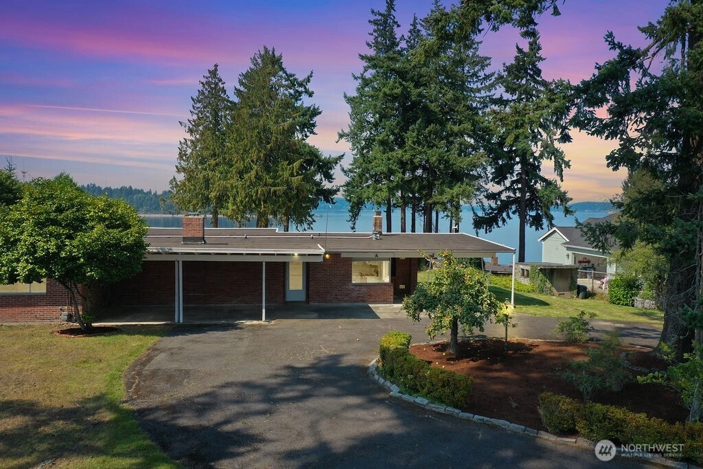 Breathtaking west-facing water & mountain views surround this charming rambler, on a fully fenced, nearly one acre lot. Gated entry with circular drive, 2 bedrooms, 1.5 baths, and 1,372 sq. ft. of comfortable living space. Features include a cozy wood-burning fireplace, built-in bookcase with hidden compartment, and a quaint kitchen with dining nook. The spacious living room opens to a patio through a large sliding glass door showcasing stunning views. Detached powered building, two carports, and heat pump with A/C complete this inviting property.