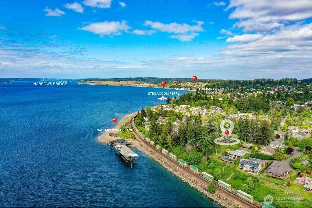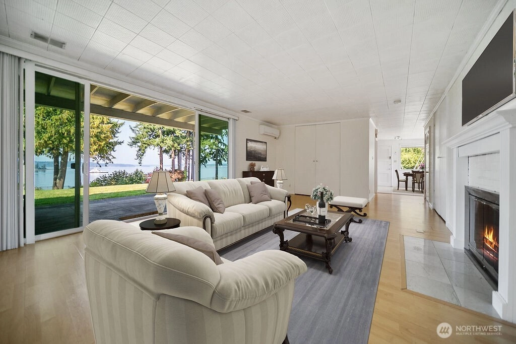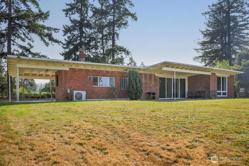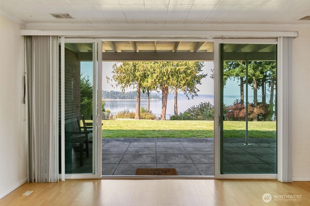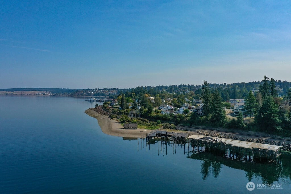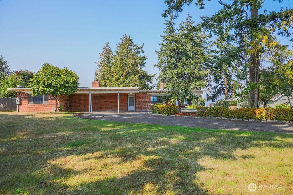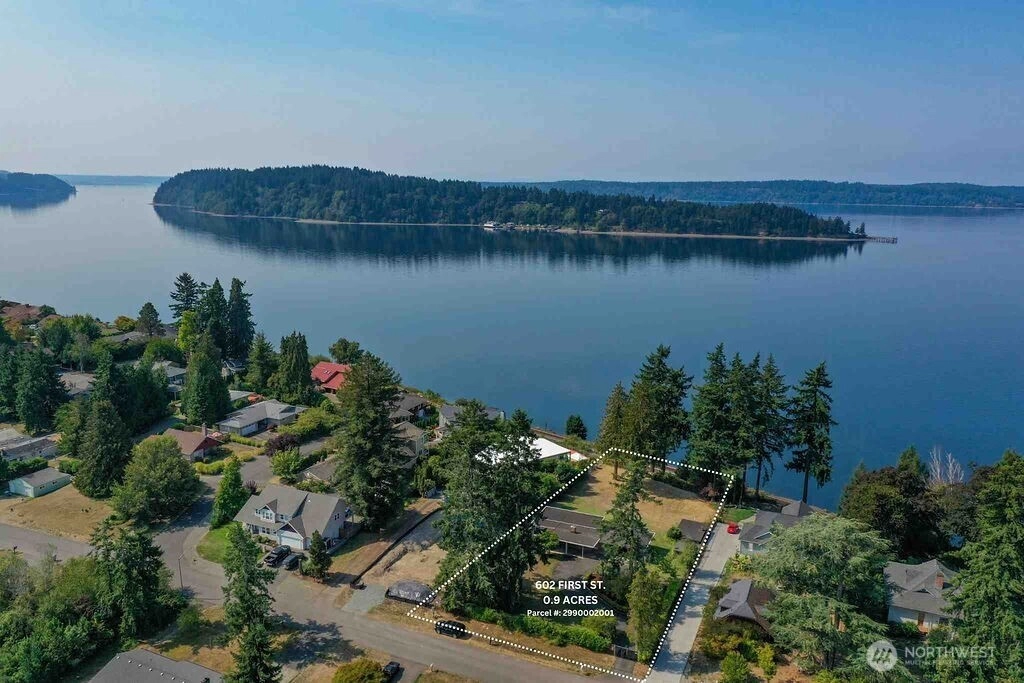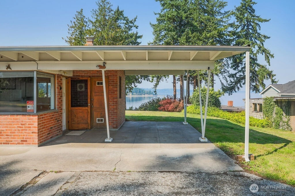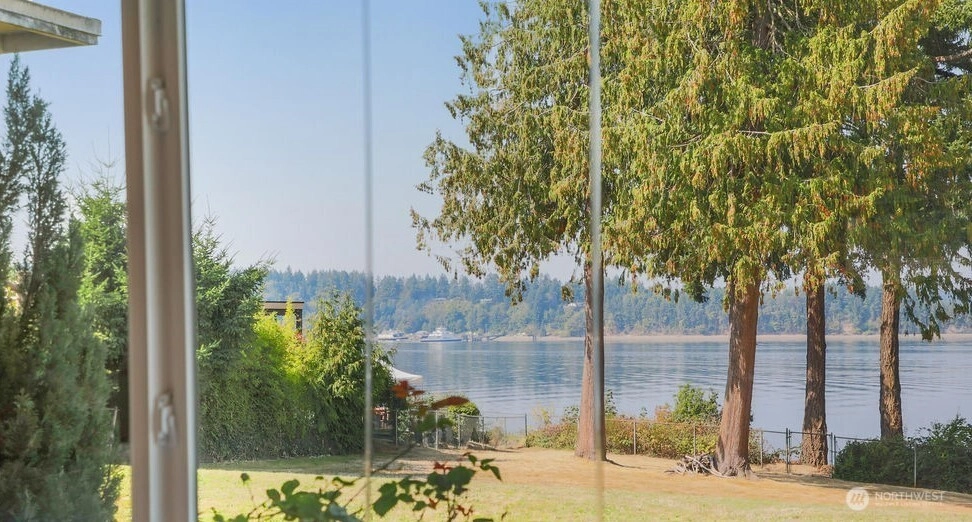 Breathtaking west-facing water & mountain views surround this charming rambler, on a fully fenced, nearly one acre lot. Gated entry with circular drive, 2 bedrooms, 1.5 baths, and 1,372 sq. ft. of comfortable living space. Features include a cozy wood-burning fireplace, built-in bookcase with hidden compartment, and a quaint kitchen with dining nook. The spacious living room opens to a patio through a large sliding glass door showcasing stunning views. Detached powered building, two carports, and heat pump with A/C complete this inviting property.