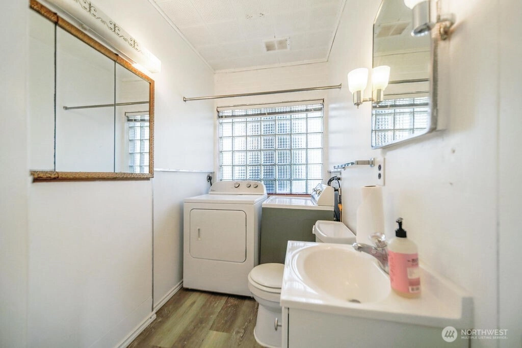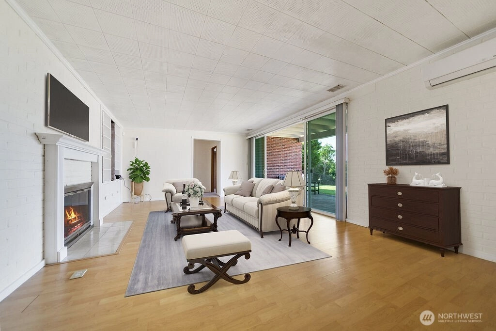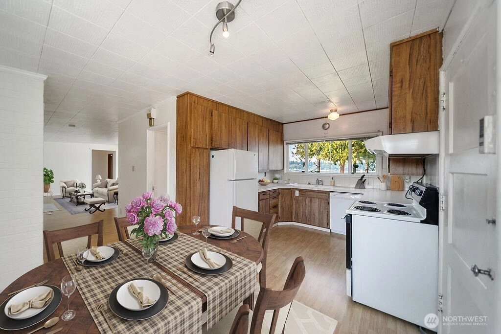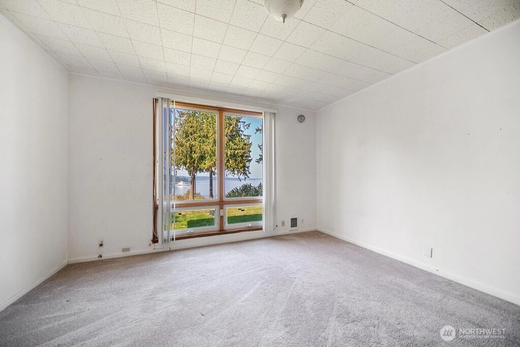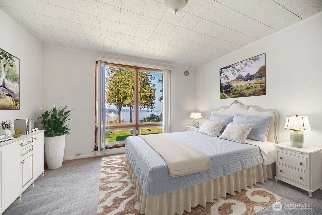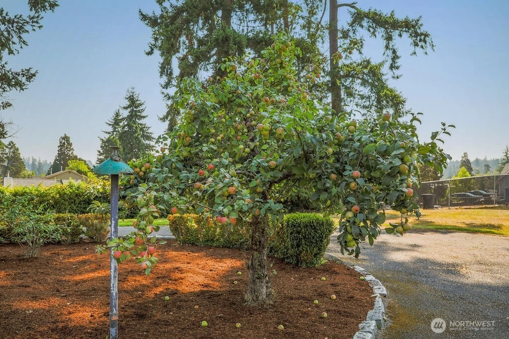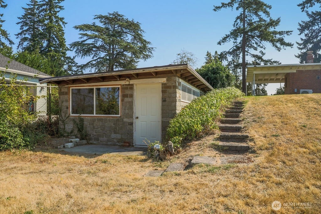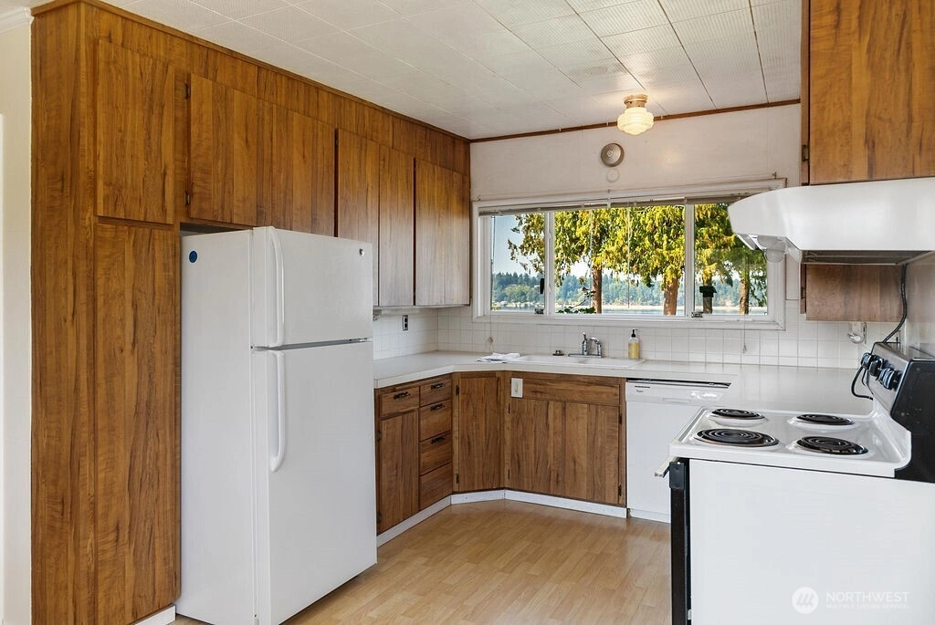 Breathtaking west-facing water & mountain views surround this charming rambler, on a fully fenced, nearly one acre lot. Gated entry with circular drive, 2 bedrooms, 1.5 baths, and 1,372 sq. ft. of comfortable living space. Features include a cozy wood-burning fireplace, built-in bookcase with hidden compartment, and a quaint kitchen with dining nook. The spacious living room opens to a patio through a large sliding glass door showcasing stunning views. Detached powered building, two carports, and heat pump with A/C complete this inviting property.