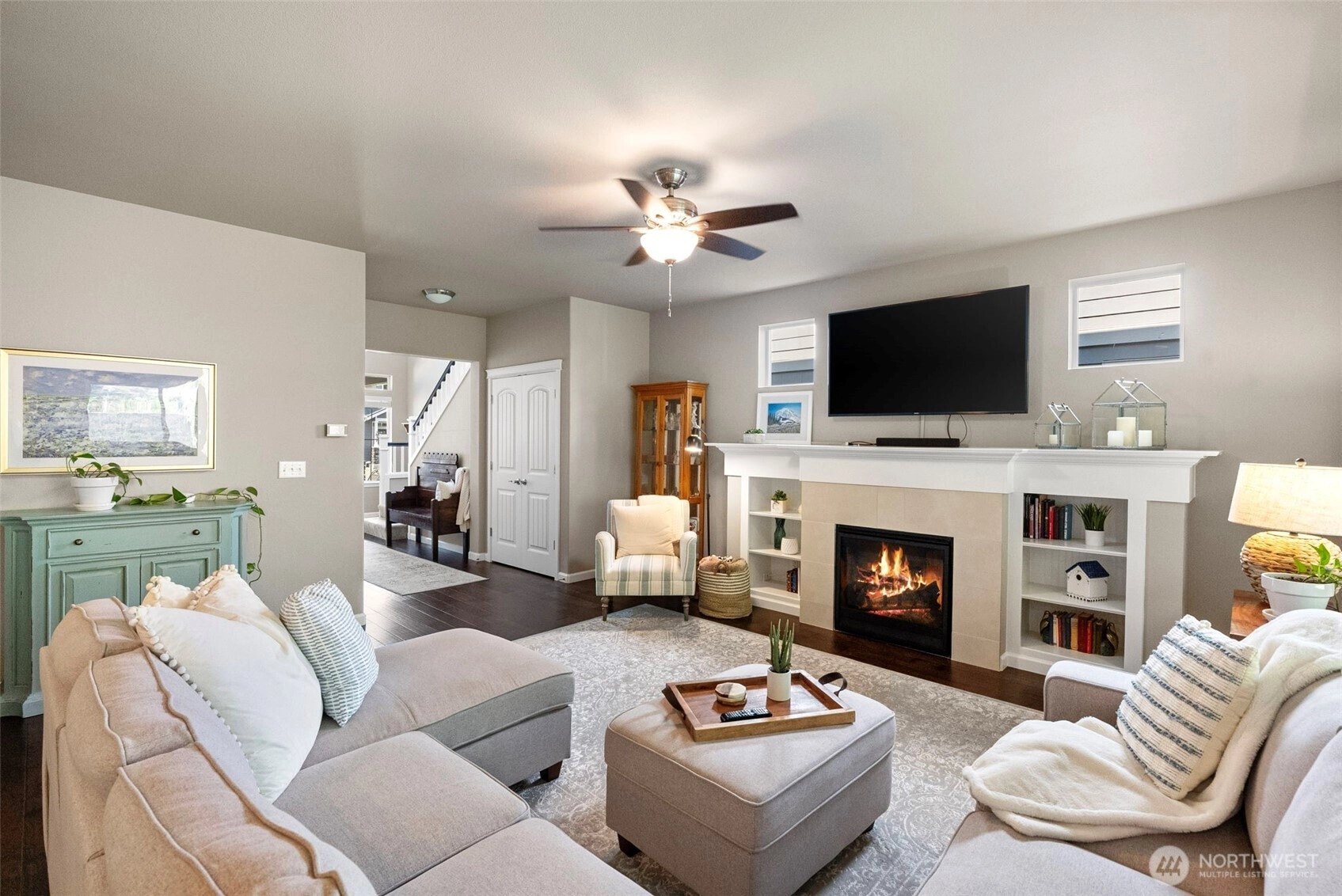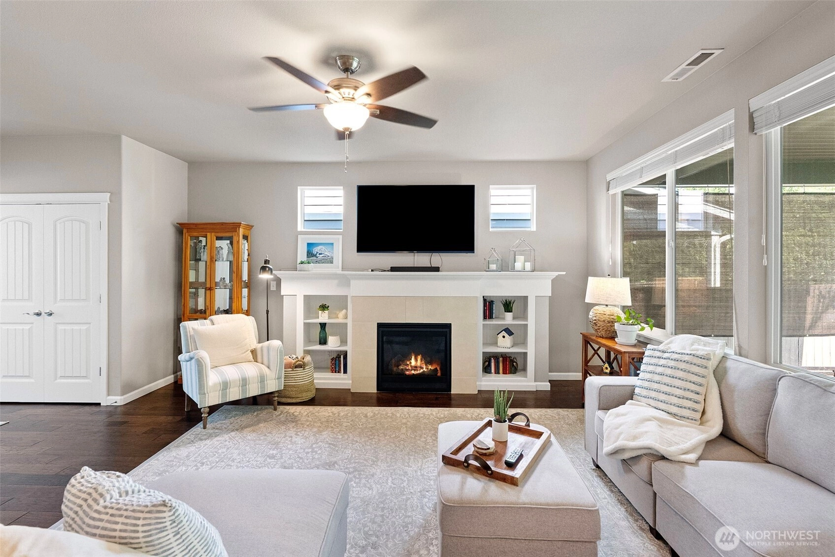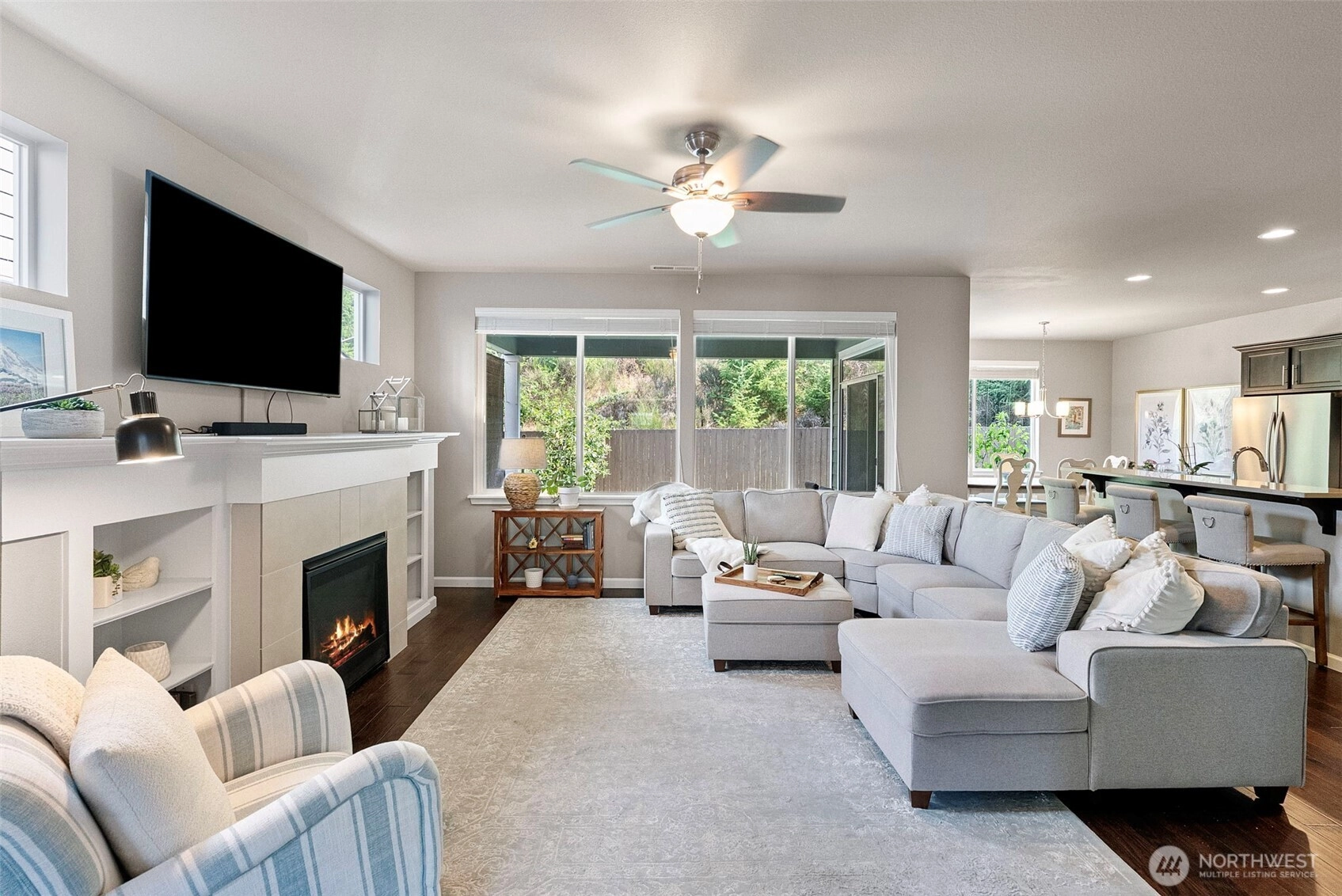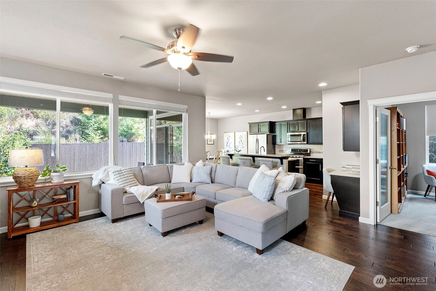 Most Popular 4-Bedroom + Office Floorplan in Bayside! Vaulted ceiling in the entryway has bright natural light. Beautiful engineered hardwood floors cover most of the main floor. Spacious kitchen features quartz counters, high-top island, walk-in pantry, double-oven, & SS appliances. Living room has a gas fireplace with tile surround & built-in bookshelves. Main floor office & full bath for added floorplan flexibility! Upstairs, the spacious primary suite includes a 5-piece ensuite bath & walk-in closet. 2nd floor includes 3 large guest bedrooms, laundry, & a loft area. Fully fenced yard with covered back patio. Enjoy the apple tree & blackberry/strawberry plants! Community playgrounds. Easy commute to PSNS, Bangor Sub base, & ferries.