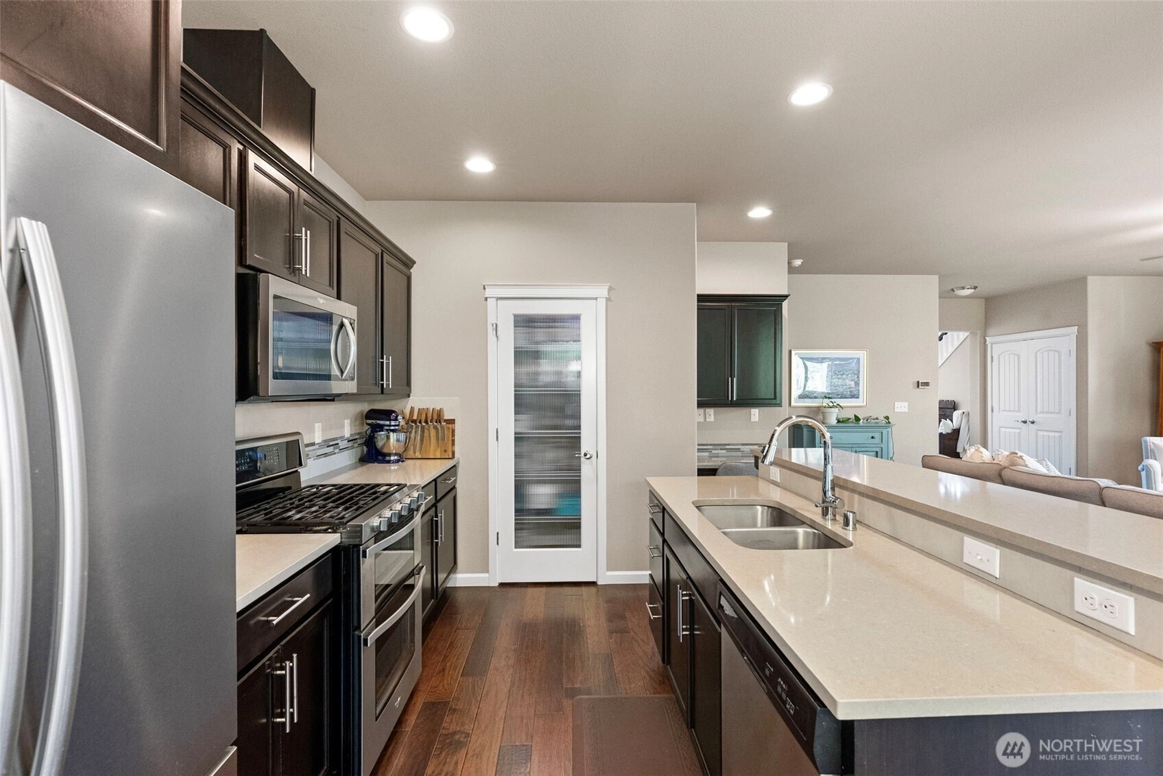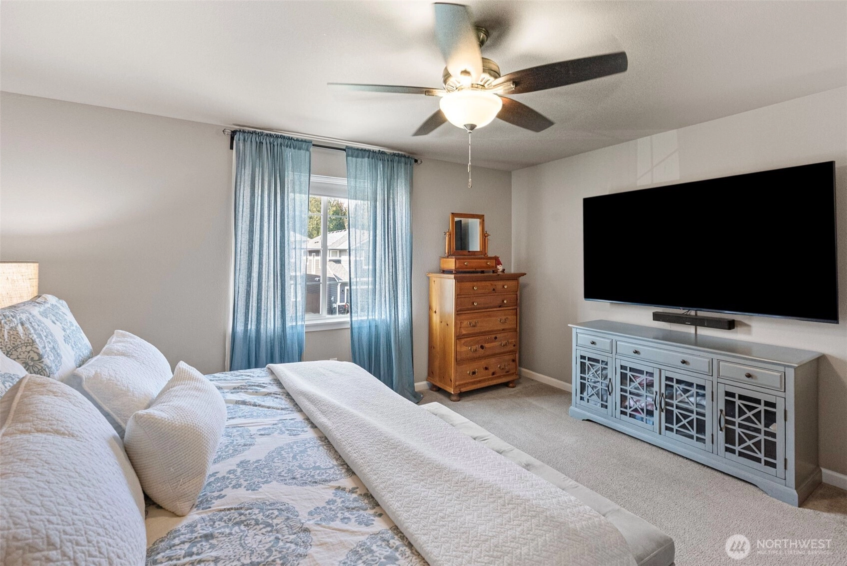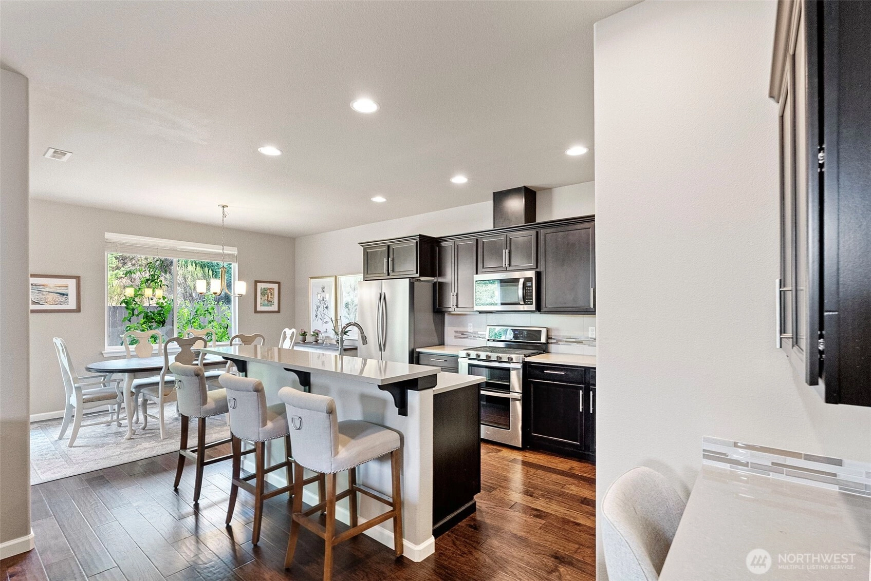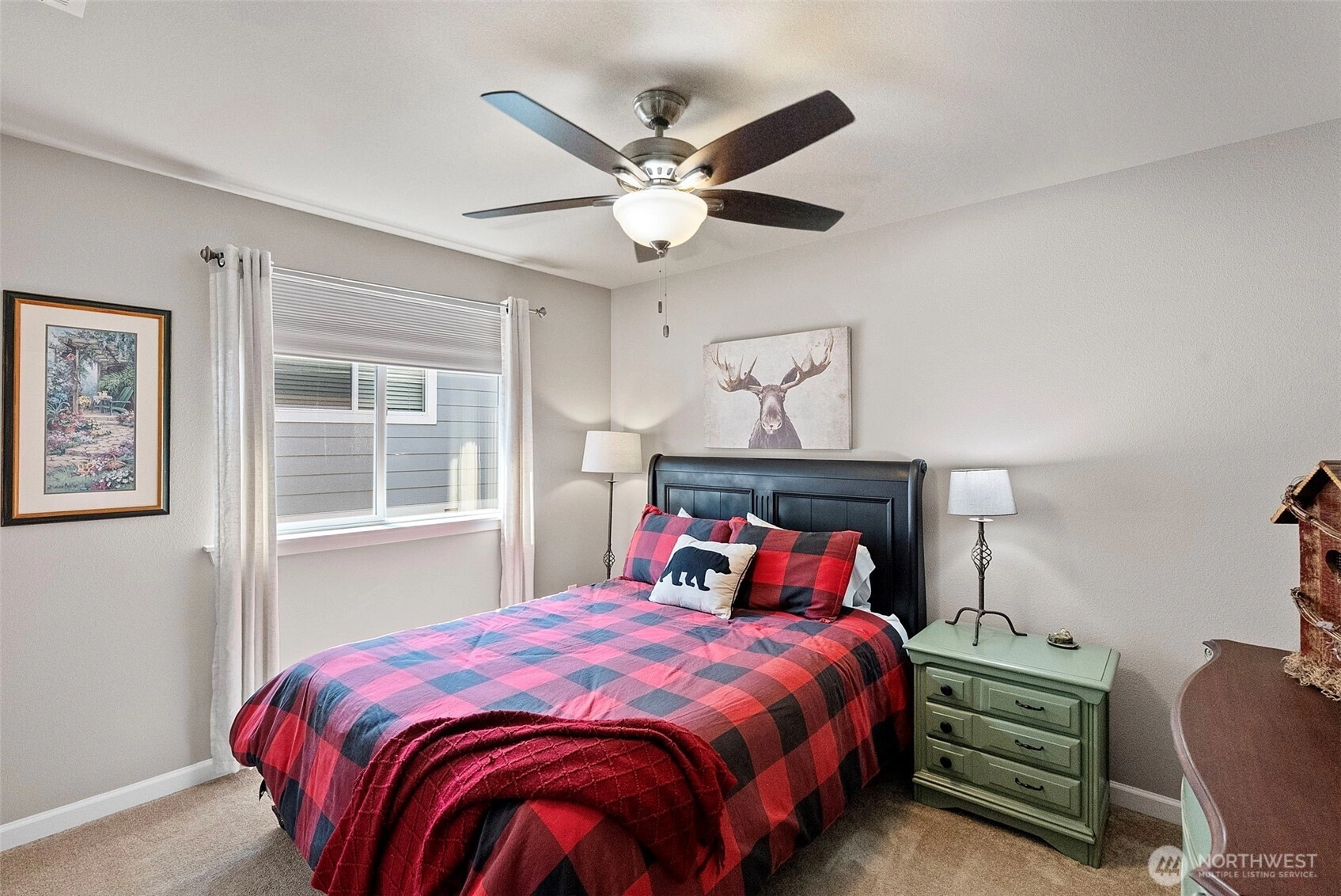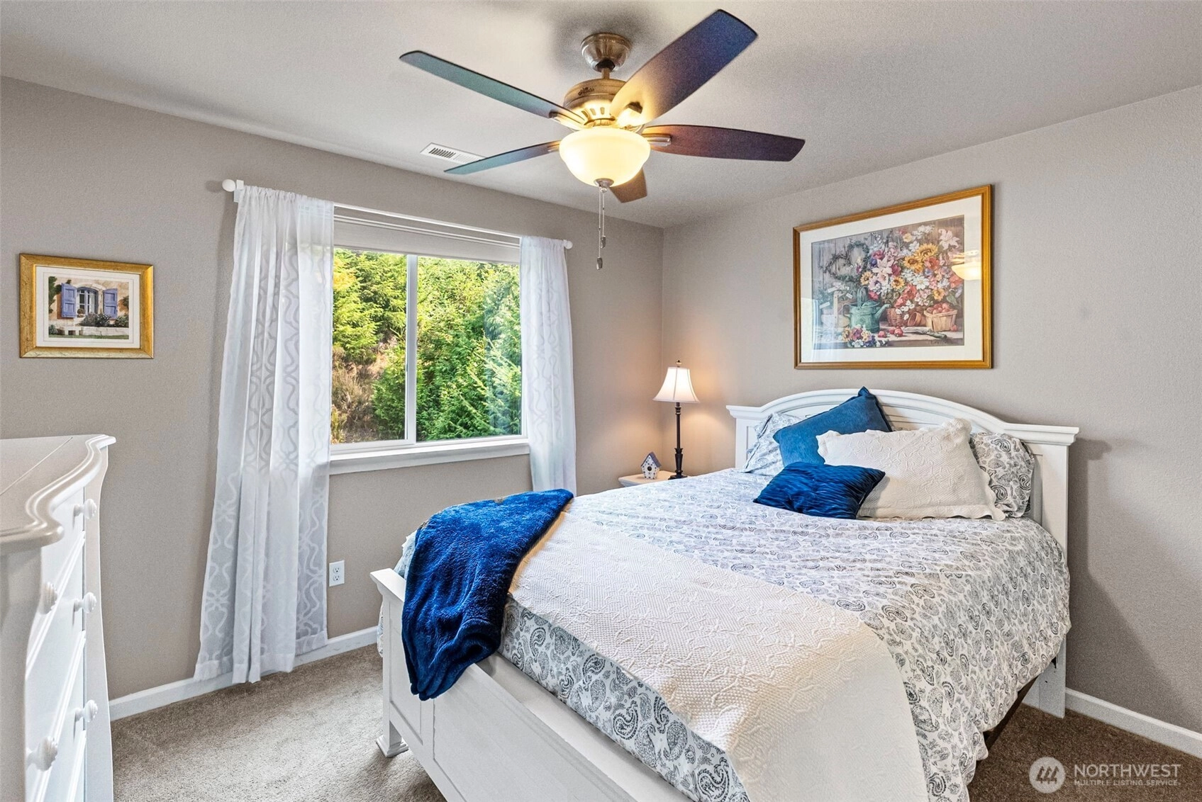 Most Popular 4-Bedroom + Office Floorplan in Bayside! Vaulted ceiling in the entryway has bright natural light. Beautiful engineered hardwood floors cover most of the main floor. Spacious kitchen features quartz counters, high-top island, walk-in pantry, double-oven, & SS appliances. Living room has a gas fireplace with tile surround & built-in bookshelves. Main floor office & full bath for added floorplan flexibility! Upstairs, the spacious primary suite includes a 5-piece ensuite bath & walk-in closet. 2nd floor includes 3 large guest bedrooms, laundry, & a loft area. Fully fenced yard with covered back patio. Enjoy the apple tree & blackberry/strawberry plants! Community playgrounds. Easy commute to PSNS, Bangor Sub base, & ferries.