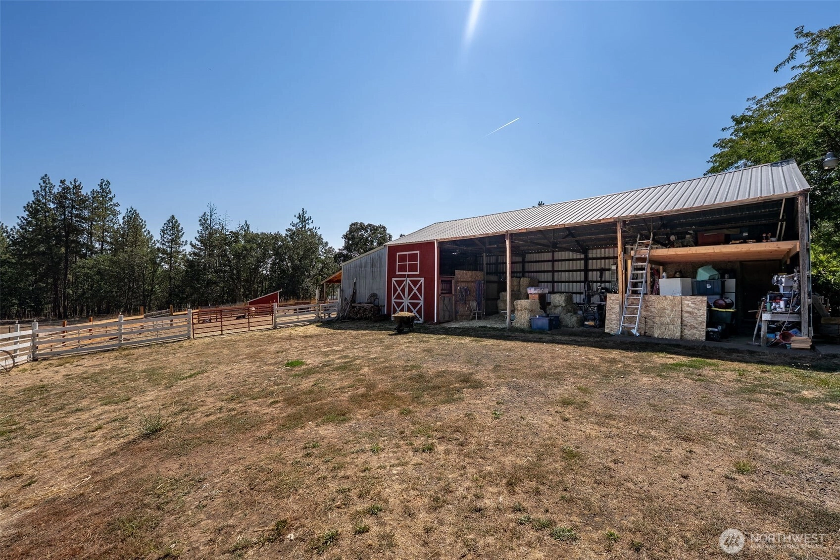 Adorable rambler nestled on a sprawling 6.85-acre property! Step inside to a bright entry leading to the inviting living room W/cozy brick-surround FP. The dining area W/custom wainscoting & French doors opening to the covered patio W/garden views. The galley-style kitchen provides ample cabinetry, bar seating, & window overlooking the backyard. Home offers 3 bedrooms & 1.75 baths, blending comfort & function. Outside, enjoy a covered patio, lush gardens, & plenty of room for RV parking. Equestrian-friendly W/barn, outbuildings, & open space—perfect for your horses, hobbies, or farm life! Creek bordering back property line W/water right access for irrigation & old spring W/pump on the property to access, in addition to the private well.