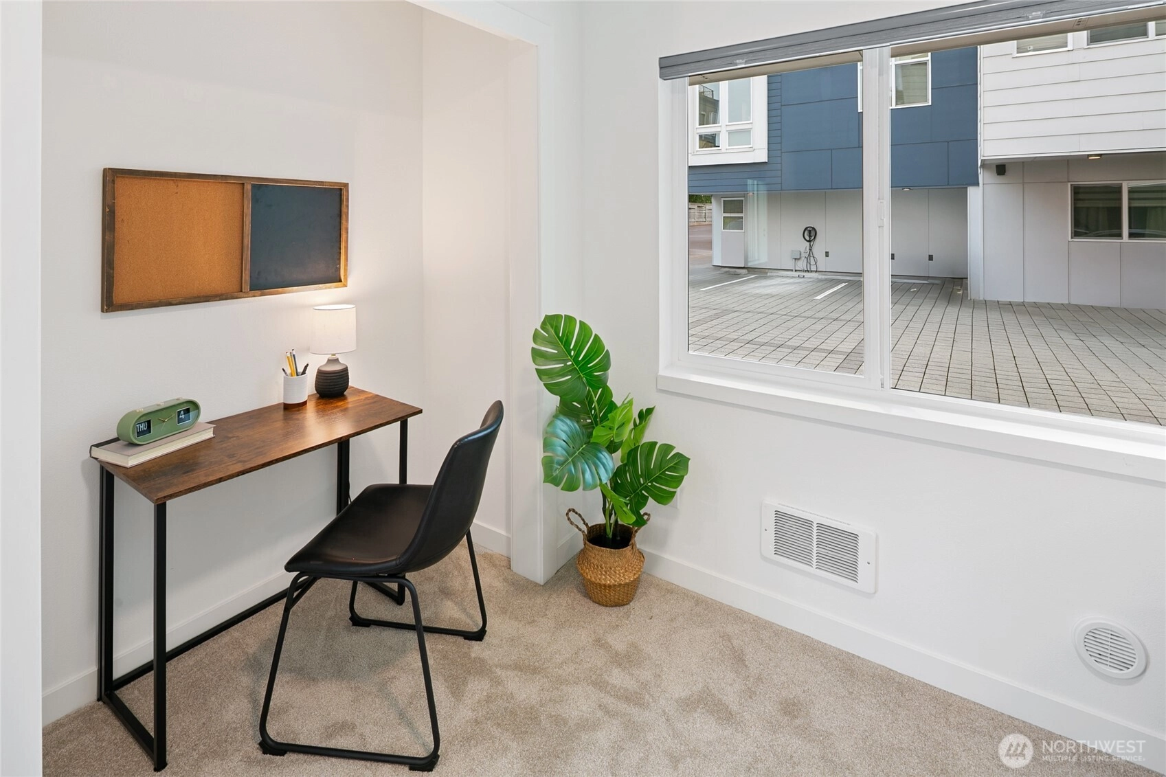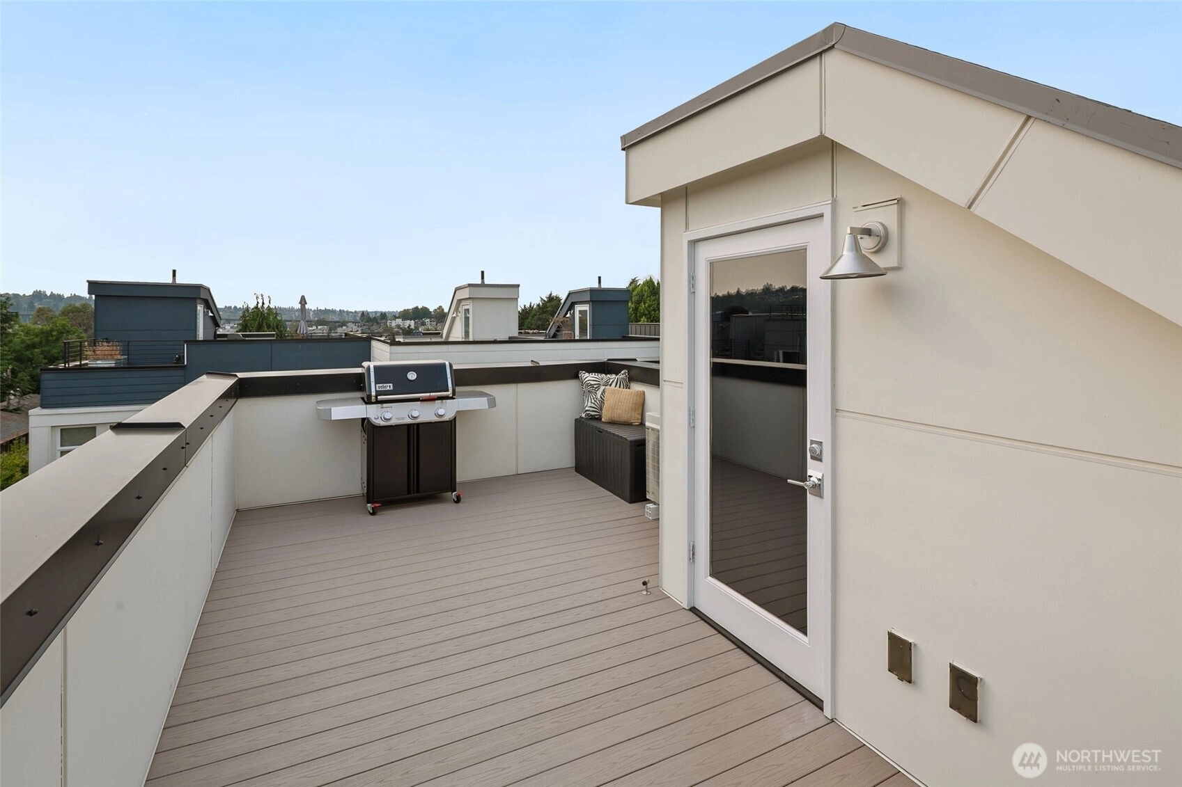 Perfectly positioned in the heart of Wallingford, this pristine end-unit home offers sweeping views of Downtown Seattle & Lake Union. South-facing & drenched in natural light, the home shines w/ all-new flooring, fresh interior paint, & custom blinds. The entry level features a spacious bedroom, full bath, & versatile den/office. The main level impresses w/ a generous living area, captivating city views + sleek kitchen w/ pantry & dining. The top floor hosts a luxe primary VIEW suite w/ large WI closet & en-suite bath. Retreat to the expansive rooftop deck, upgraded w/ new decking & take in iconic panoramas of Mt Rainier, Lake Union, & the sparkling skyline. With no HOA, gated parking & unmatched walkability, this home is truly exceptional.