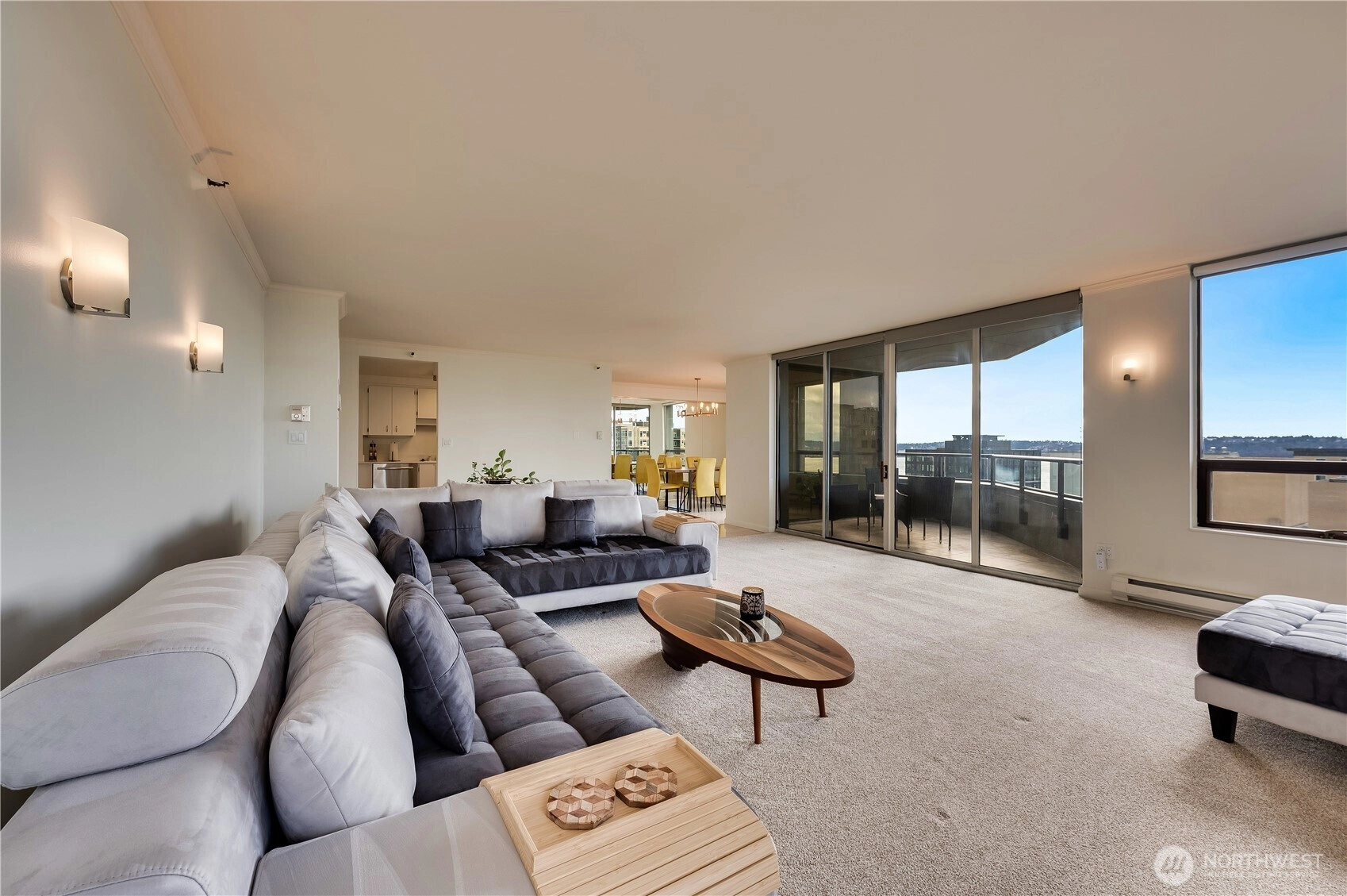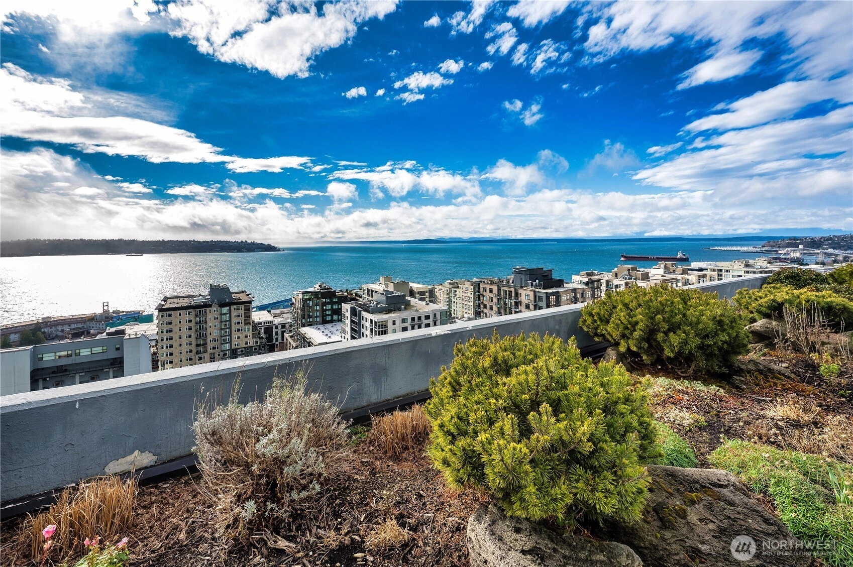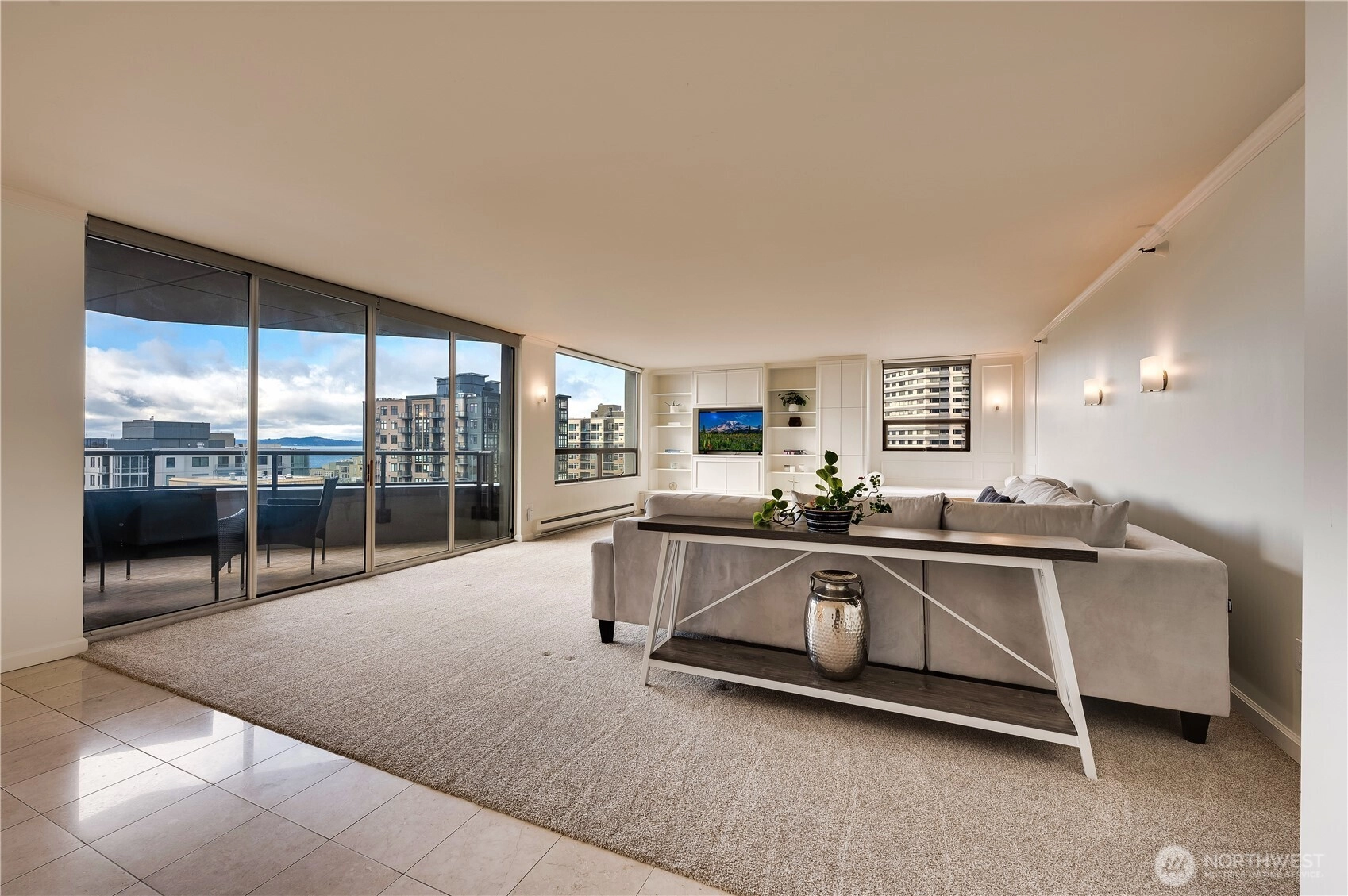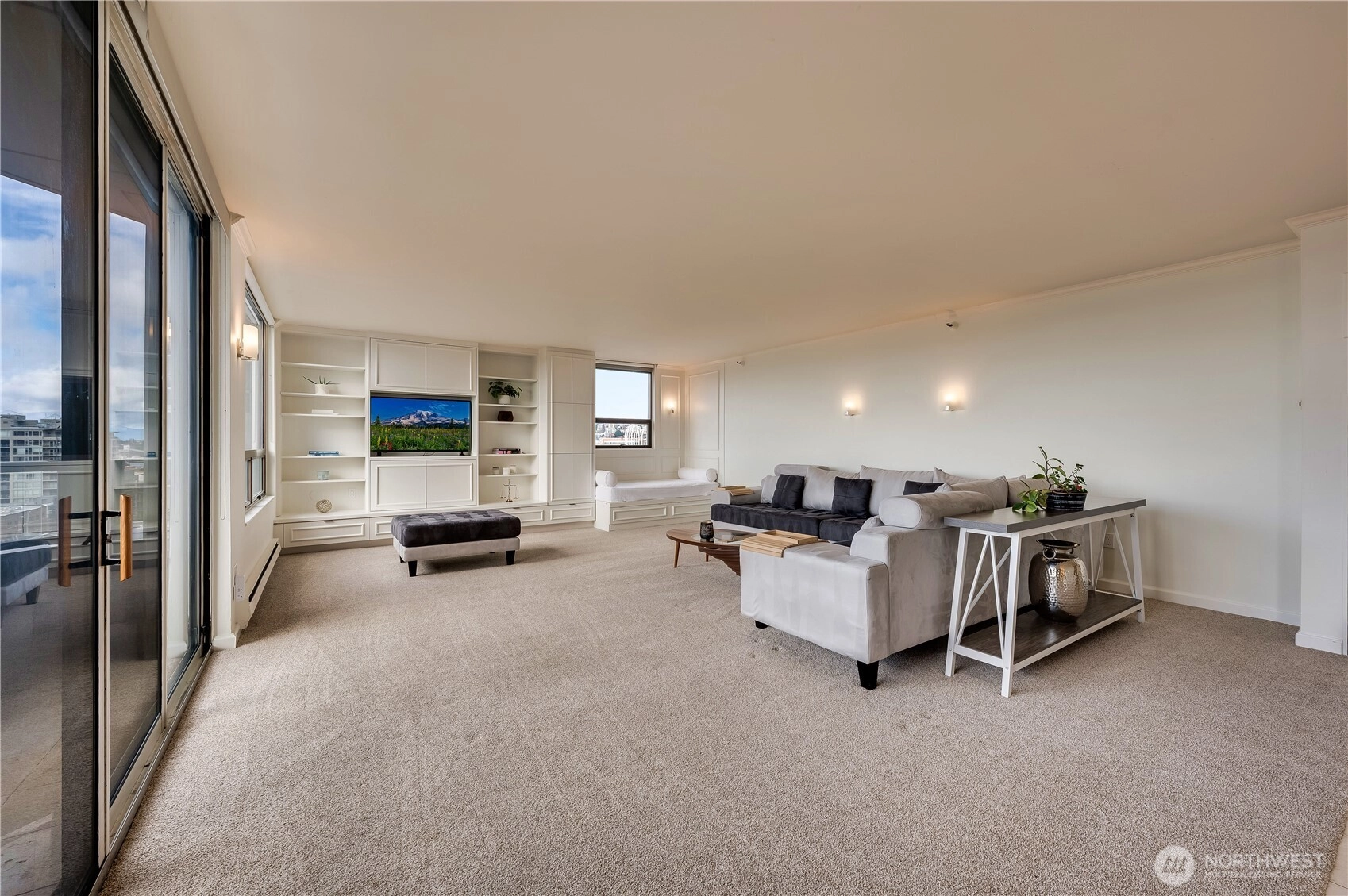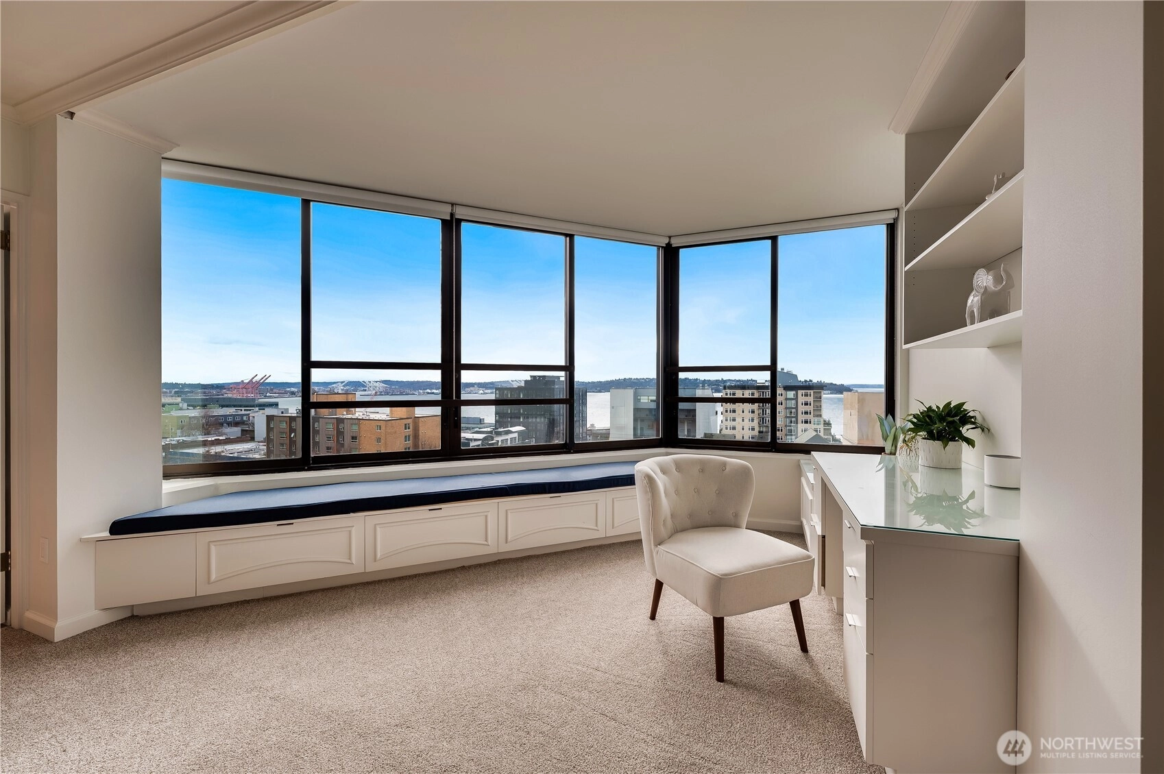 Sweepingg westerly views frm Mt. Rainier, city, snd & Oly Mtns frm this redesigned 2BR + den style hme, one level living w/over 1900sf! Grand LR w/walls of glass drenched in nat light. Formal DR for ultimate entertaining. Awesome cov'd view deck. Beautiful new carpets, new window shades & A/C! Awesome private den. Lots of custm built-ins for max storage. King size primary suite w/window seat & built-in desk + db vanity 5-piece primary bath & WIC. Spacious 2nd bdrm w/custom built-in shelving & cabinetry. Amenities incl gym, party rm, sauna, spa, outdoor pool & 270-degree views frm spectacular rooftop deck! Outstanding loctn - dining, shopping, Sculpture Pk, Wtrfrnt, PPMkt, Seattle Center, pub trans & more! Incredible price & value!