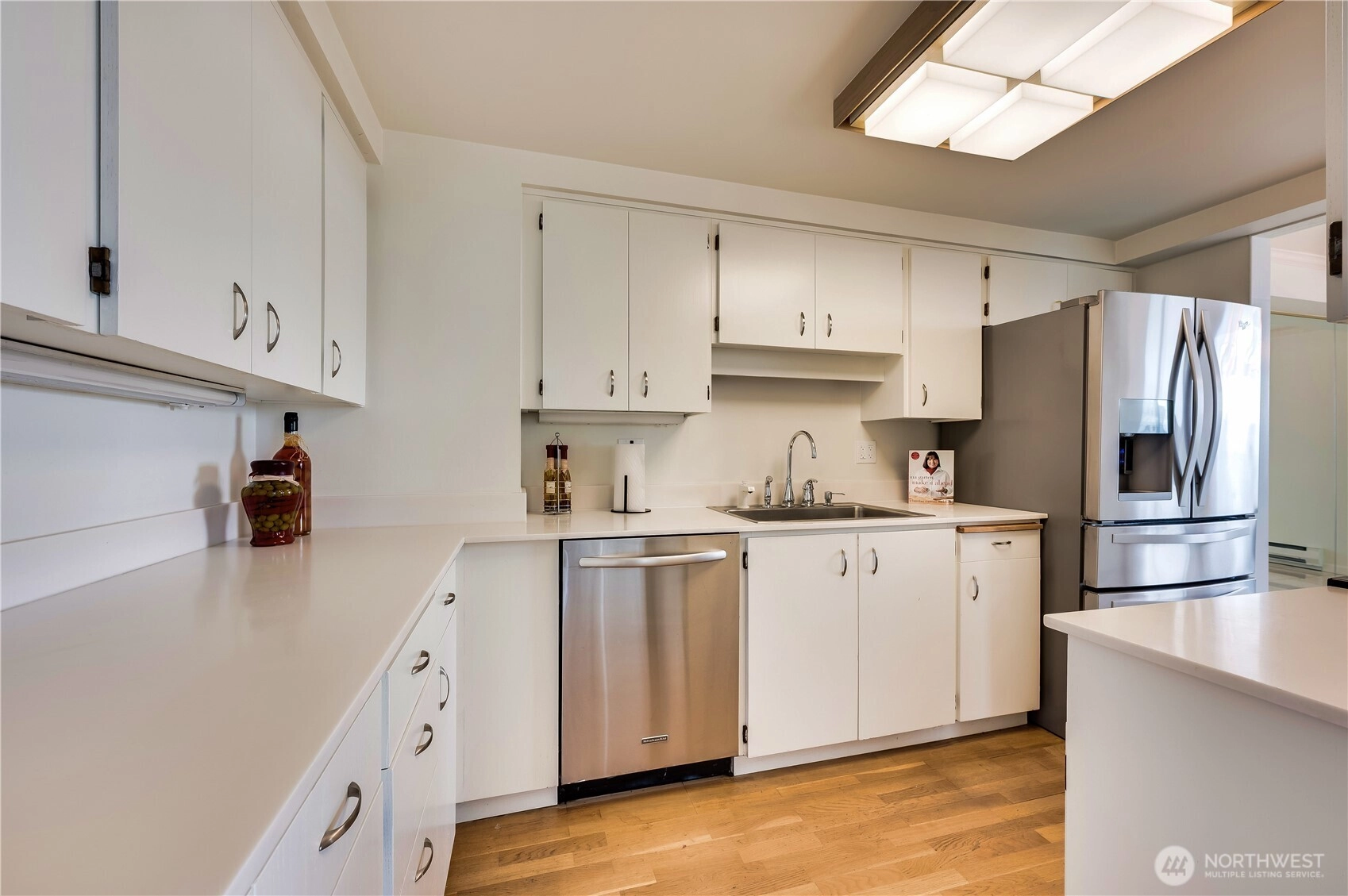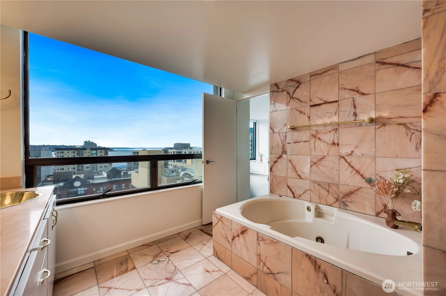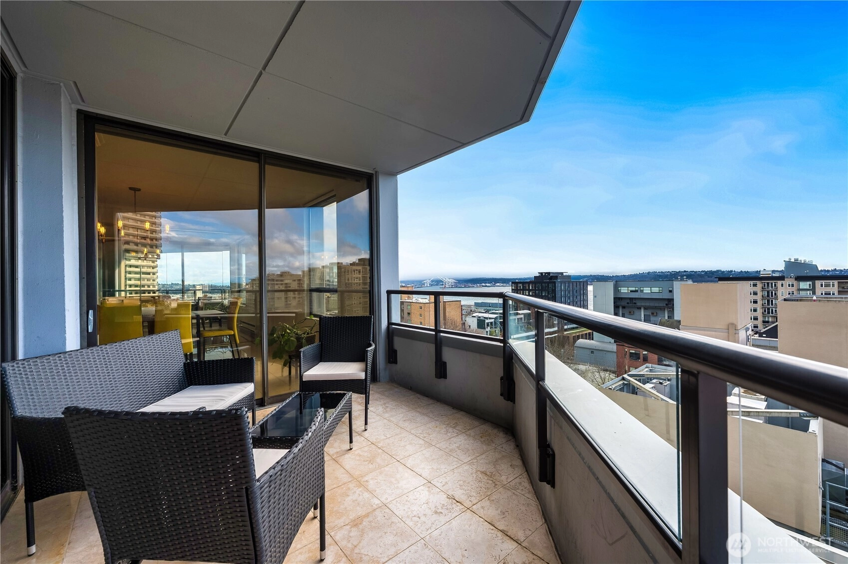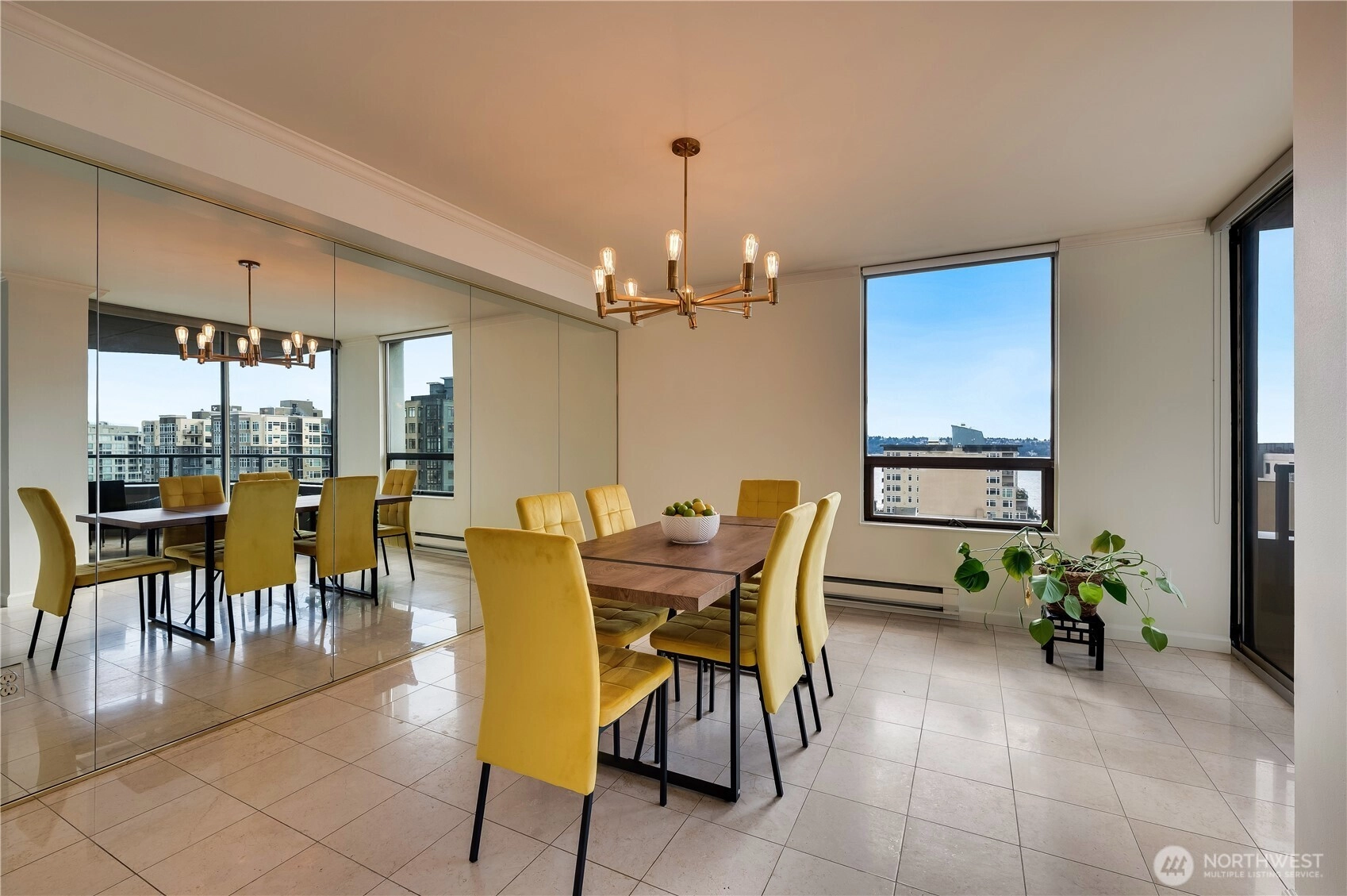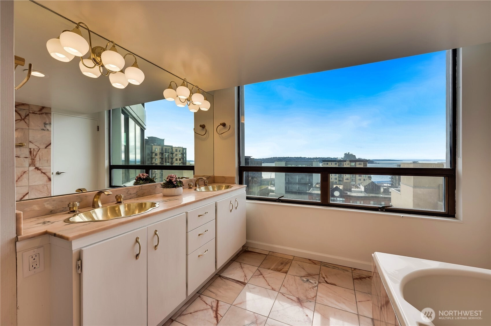 Sweepingg westerly views frm Mt. Rainier, city, snd & Oly Mtns frm this redesigned 2BR + den style hme, one level living w/over 1900sf! Grand LR w/walls of glass drenched in nat light. Formal DR for ultimate entertaining. Awesome cov'd view deck. Beautiful new carpets, new window shades & A/C! Awesome private den. Lots of custm built-ins for max storage. King size primary suite w/window seat & built-in desk + db vanity 5-piece primary bath & WIC. Spacious 2nd bdrm w/custom built-in shelving & cabinetry. Amenities incl gym, party rm, sauna, spa, outdoor pool & 270-degree views frm spectacular rooftop deck! Outstanding loctn - dining, shopping, Sculpture Pk, Wtrfrnt, PPMkt, Seattle Center, pub trans & more! Incredible price & value!