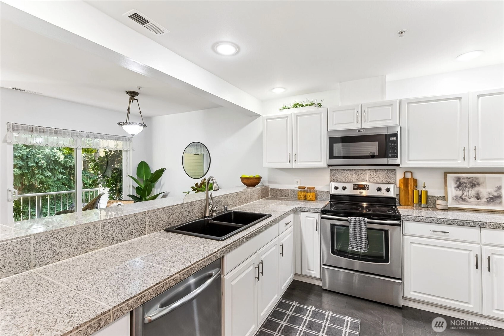 Tucked inside the gated community of Regency Ridge, this turnkey end-unit townhome offers comfort and privacy. The light-filled living room with vaulted ceilings and a cozy gas fireplace creates a welcoming space, while the open concept spacious kitchen features crisp white cabinets, granite counters and stainless steel appliances. Step outside to enjoy peaceful mornings on the covered deck with greenbelt and garden views, or unwind in the landscaped “secret garden” with sitting area and sylvan views. The upper level features a spacious primary suite, a second bedroom, and a full bath. A rare 2nd deeded covered garage, community clubhouse, and secure entry complete this well-maintained, quiet retreat close to shopping, dining, and freeways.