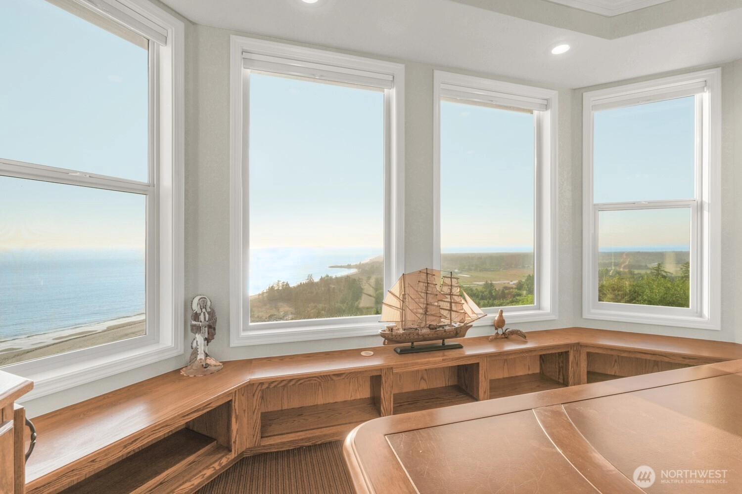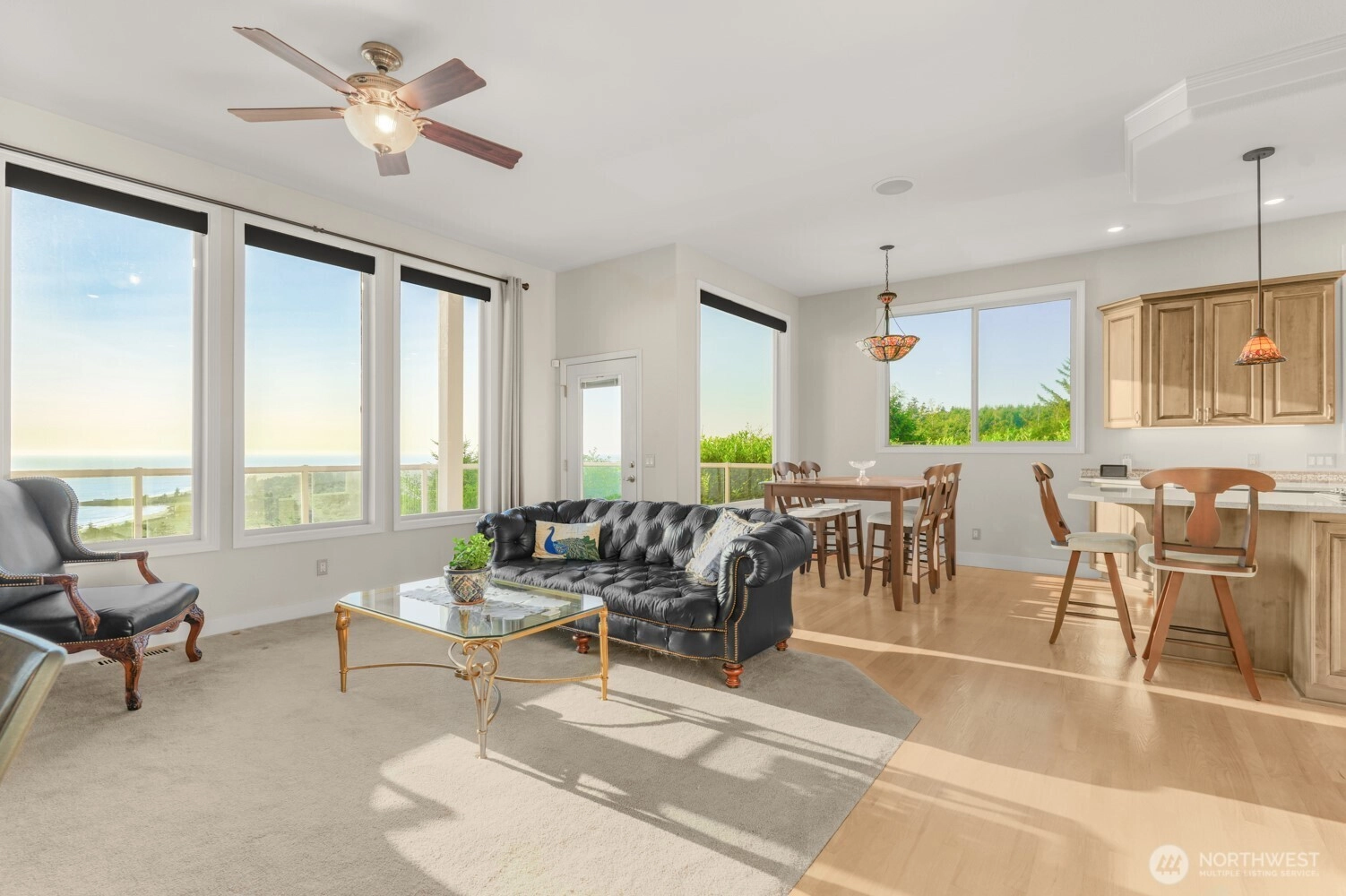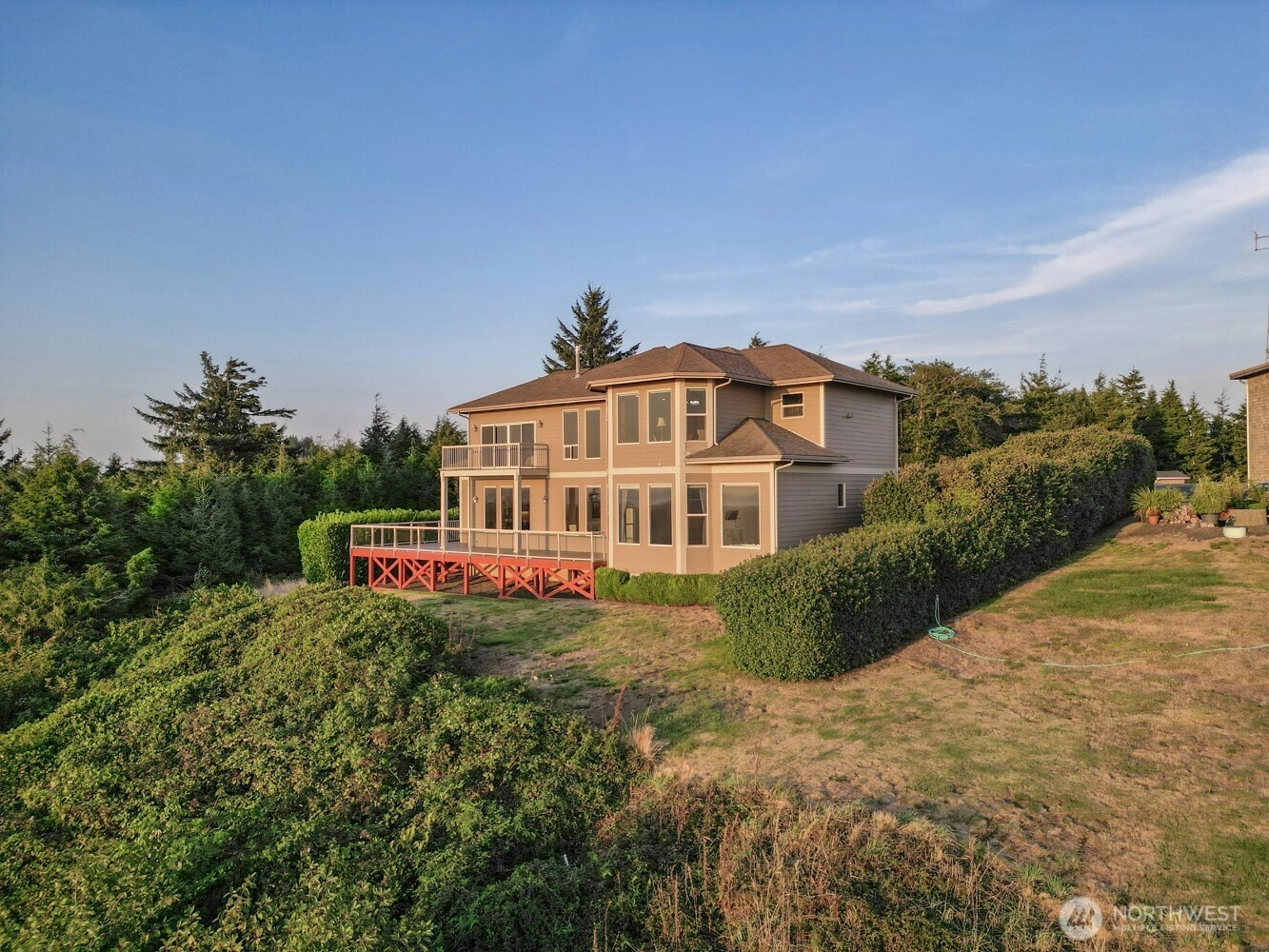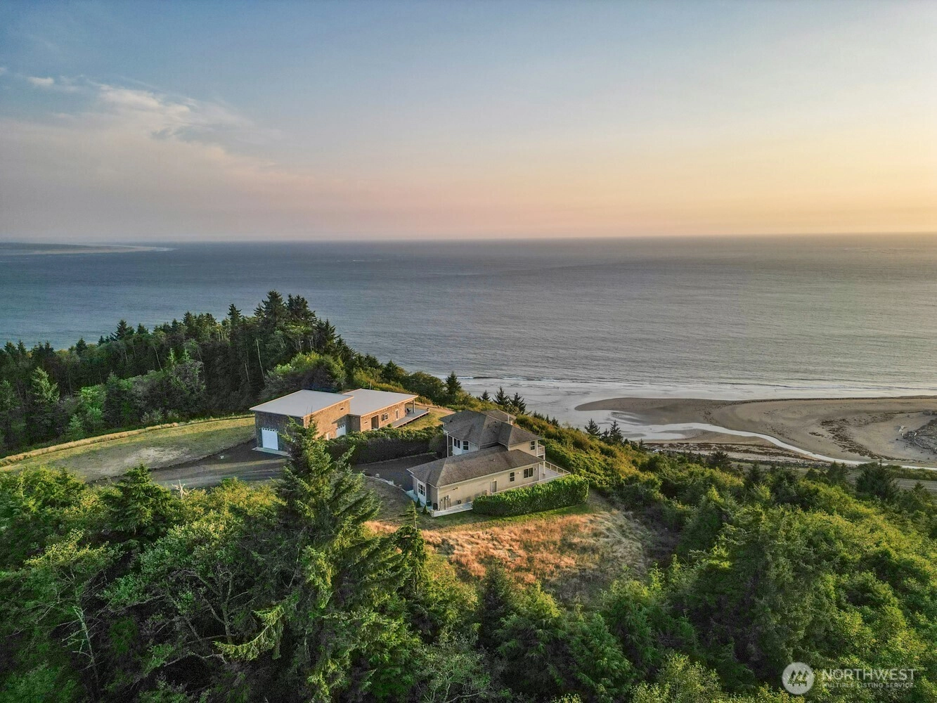 Enjoy breathtaking views of the Pacific Ocean, Willapa Estuary, and miles of sandy shoreline from this 4,000 sq ft home in the gated Willapa Heights community, just 15 minutes from Westport. This 4-bed, 4-bath retreat features a main-level primary suite with panoramic vistas, spa bath, walk-in closet, and deck access. Vaulted living room with picture windows, multiple view-filled living spaces, a gourmet kitchen with walk-in pantry, formal dining, office/library, theater, and expansive sun deck offer comfort and elegance. Set on 5 serene acres with a 3-car garage and lush landscaping, this home blends privacy, luxury, and stunning sunsets, all near Shoalwater Bay Casino.