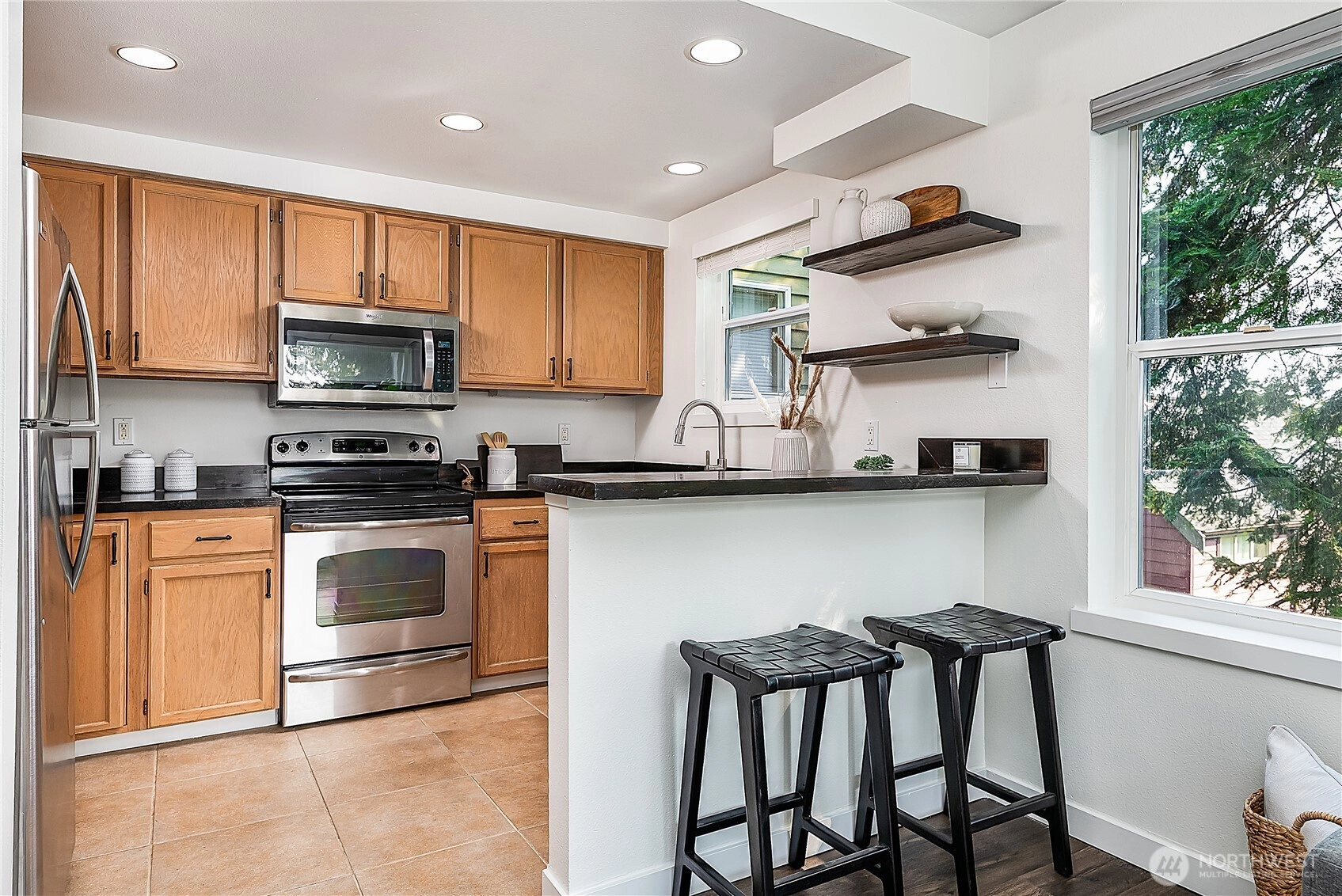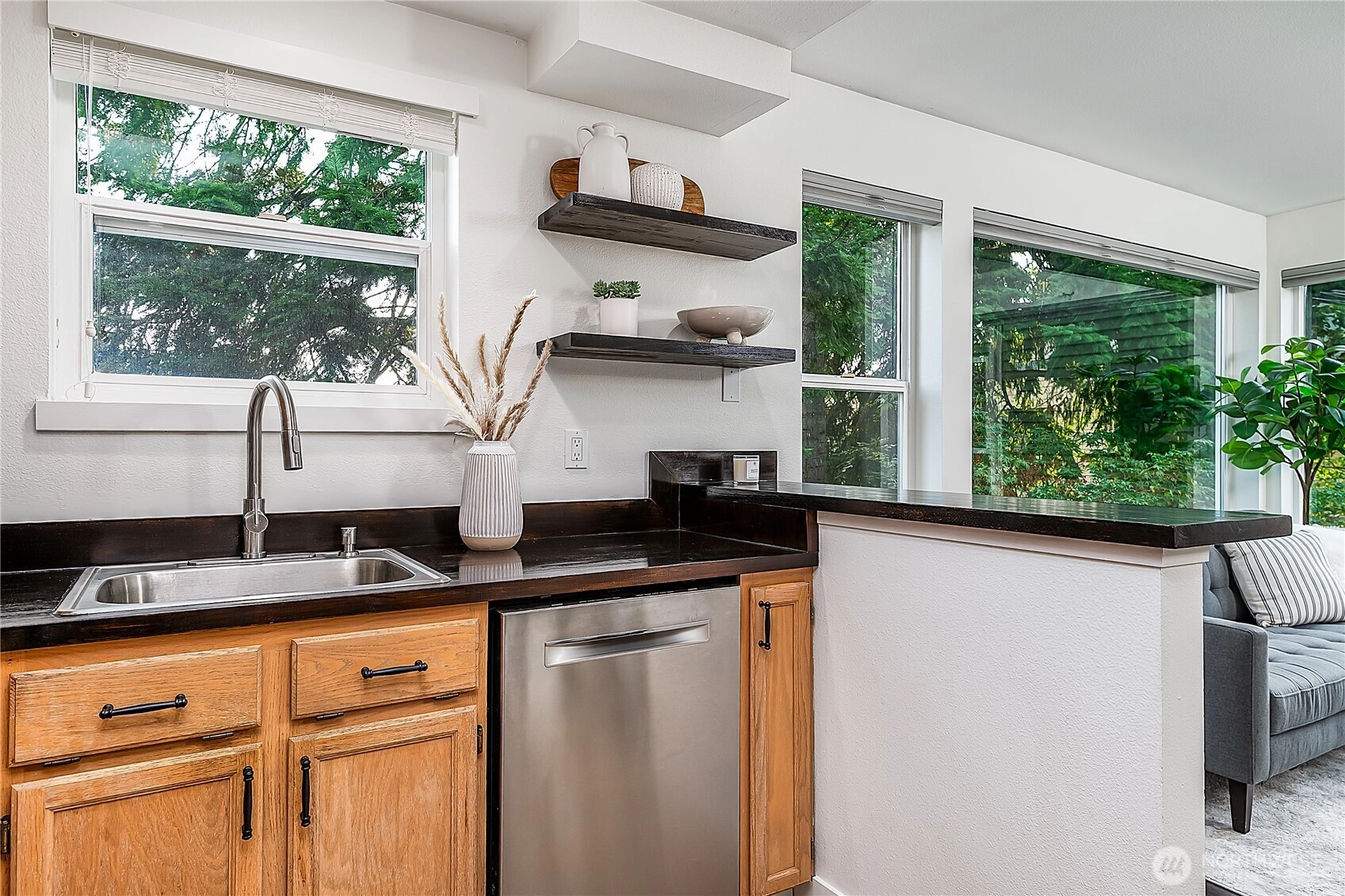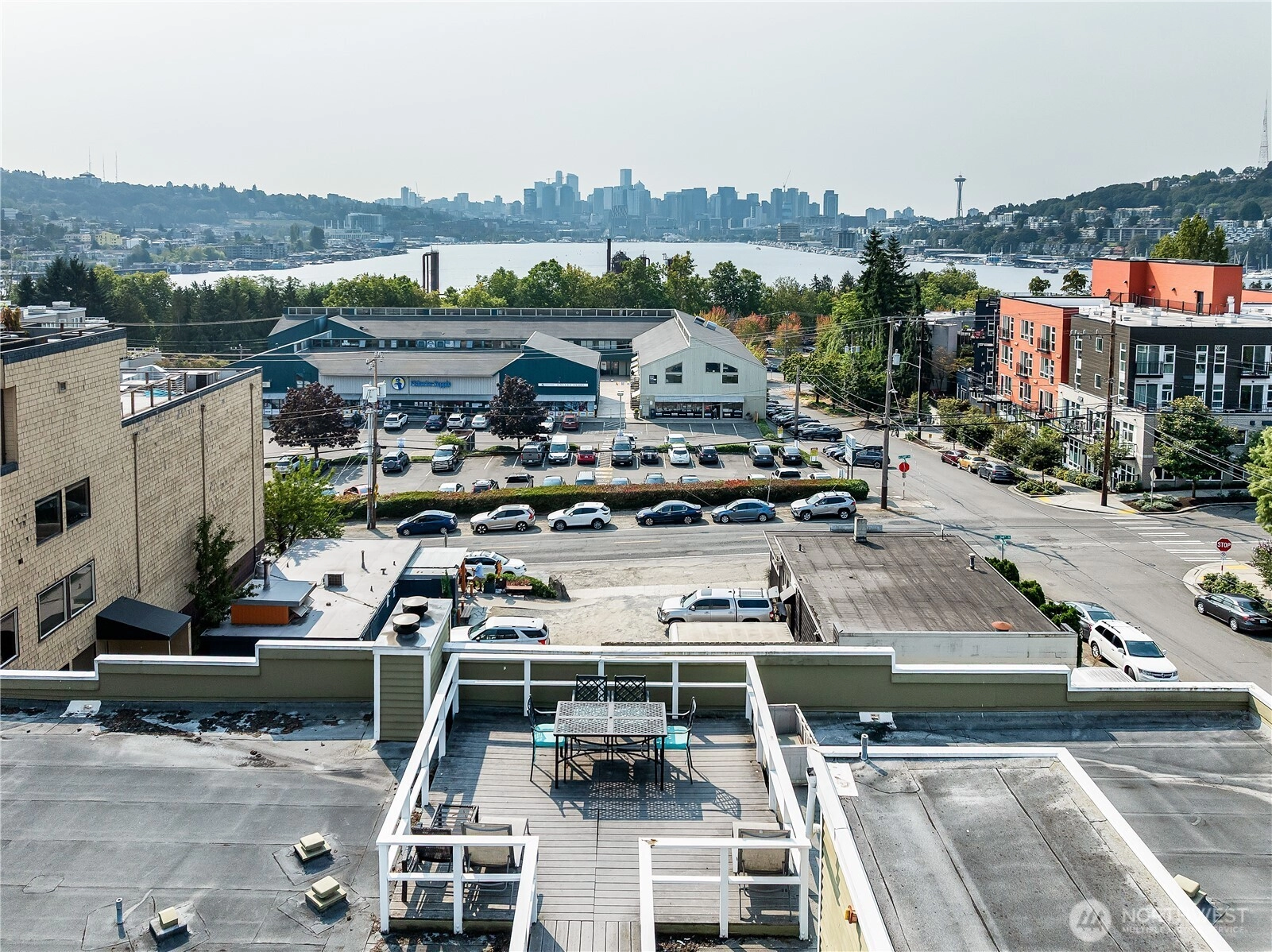 Enjoy the best of Wallingford living in this TOP FLOOR SE CORNER unit, where location and peek-a-boo city views create an exceptional urban retreat. Expansive picture windows frame lush treetop views. Thoughtful upgrades include LVP flooring, butcher block countertops, fully remodeled bathroom with sky light, and updated blinds throughout. Additional highlights: fresh paint, a full-sized W/D, wood-burning fireplace, one parking spot, storage closet, and rooftop deck with sweeping Lake Union and city views. This small, quiet community of three buildings offers a secure entry, elevator access, with courtyard/trees and privacy. Pet friendly.Steps from the best of city living—coffee shops, eateries, BG trail, Gas Works Park, Fremont and more.