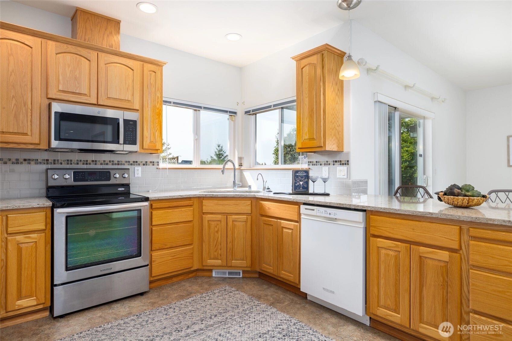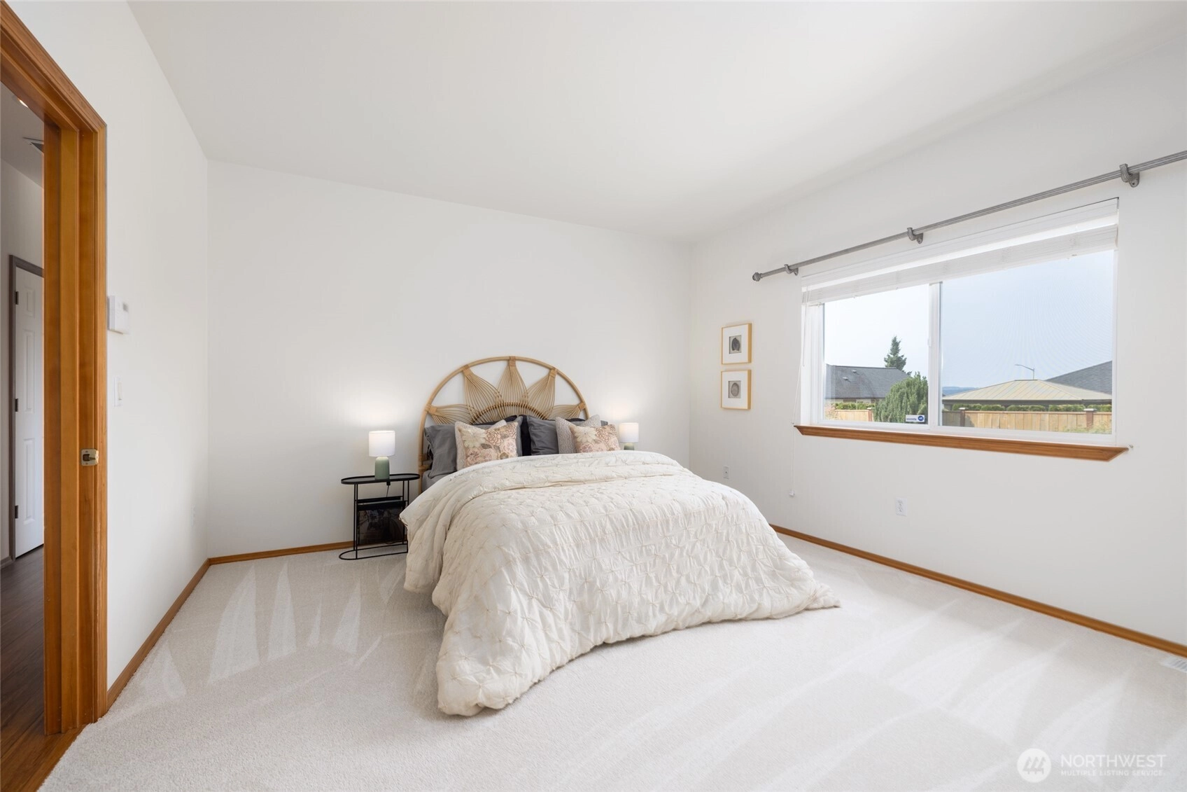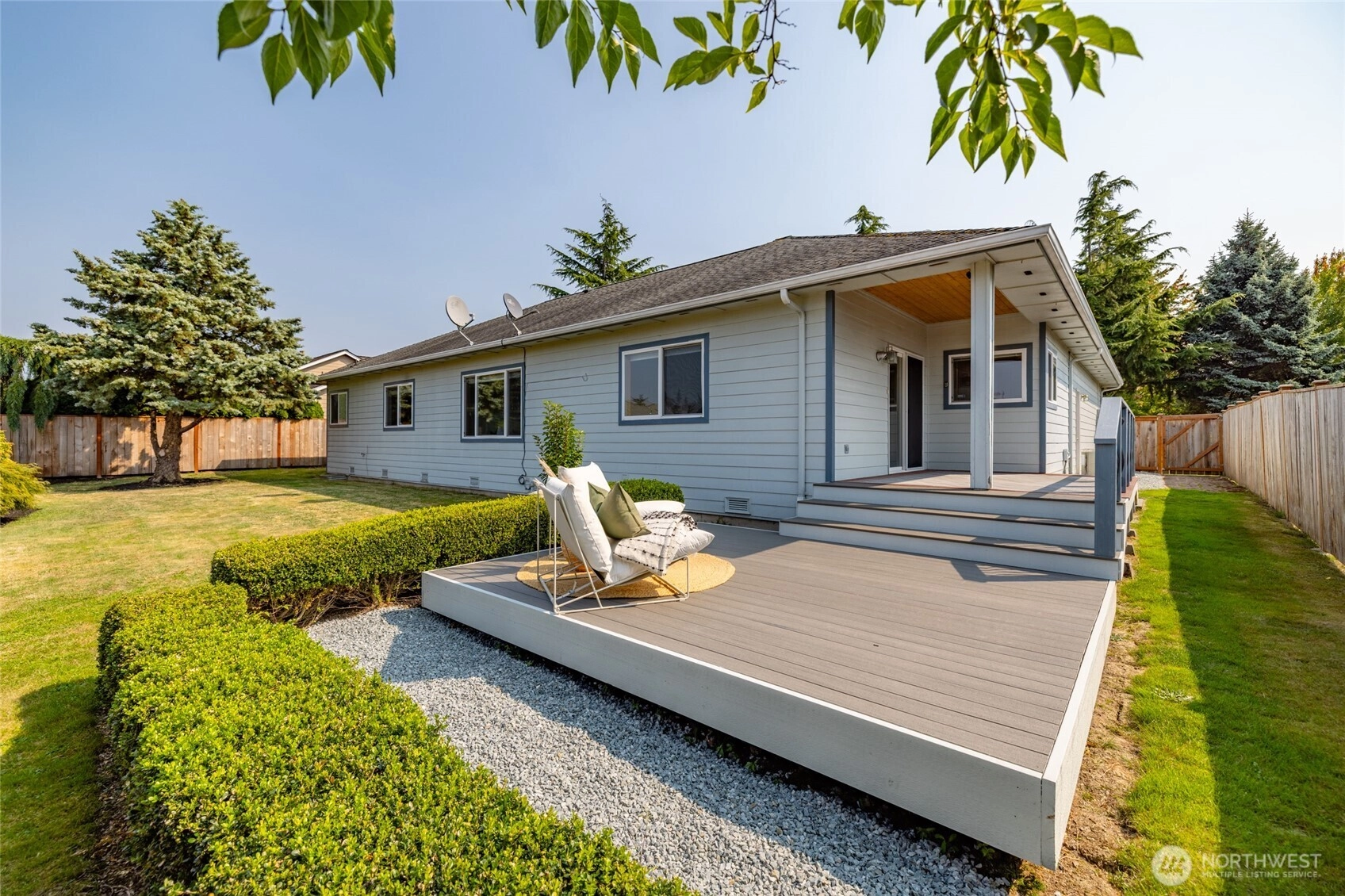 Meticulously maintained rambler in the tranquil and pristine Candle Ridge neighborhood, with scenic walking trails and parks. Enjoy the morning sun and spectacular sunsets with peek-a-boo views of Skagit Bay and the Olympics out of your kitchen, living room, family room and expansive primary suite. Beautiful picture windows stream in natural light throughout the home. Fresh paint, new carpet, and the owner’s careful living, make this home feel new inside. The new deck is perfect for a hot tub or outdoor living/entertaining space. Fully fenced back yard, walk-in tile shower, AC. Easy access to the delightful downtown Stanwood, coastal and mountain activities and I-5. This is a must see!