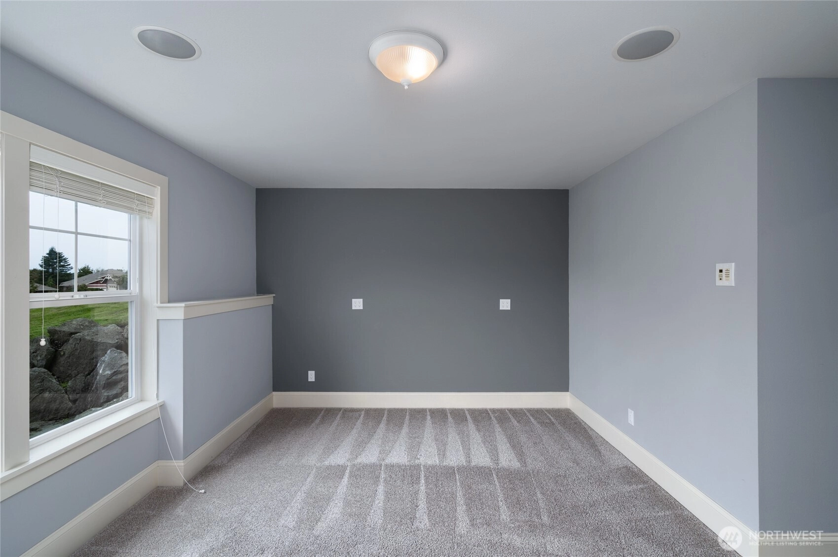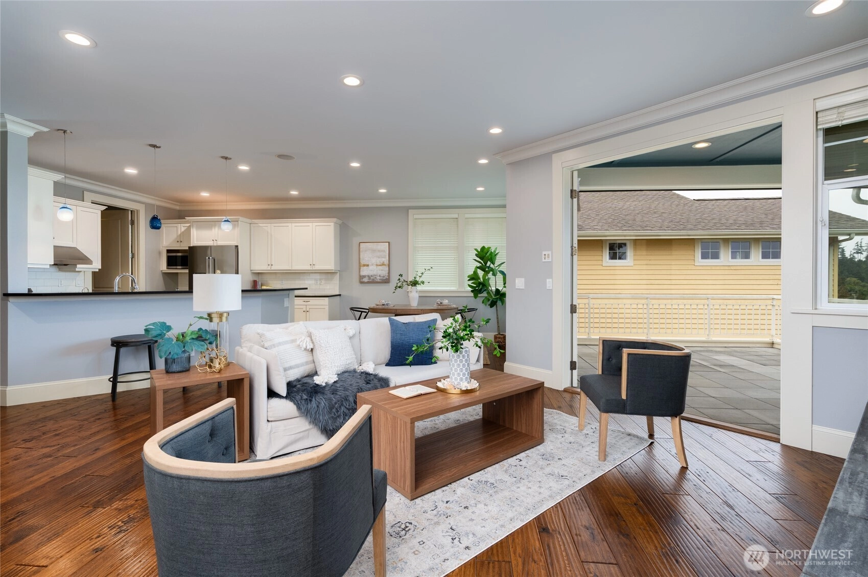 Quality Ron Paulk built Home, a beautifully home w/ solid wood doors, detailed ceiling and baseboard trim. Main level living offers Primary & second bed rm and bonus office/flex rm with French doors, all main level. The kitchen with long quartz bar, living rm stone fireplace, and seamless flow to French doors view deck ideal for entertaining. Primary suite showcases sweeping channel views of San Juan Islands, plus spa like bath and lg walk-in closet. Lower level/ w guest suite, and potential cool/wine room, and patio with hot tub wiring. Whole-home with built-in speaker in every room including sound system completes this retreat. Enjoy care free maintenance with landscaping, exterior painting and roof replacement included in HOA fee.