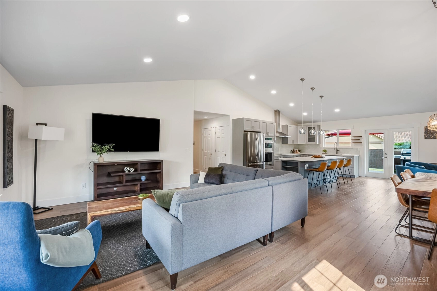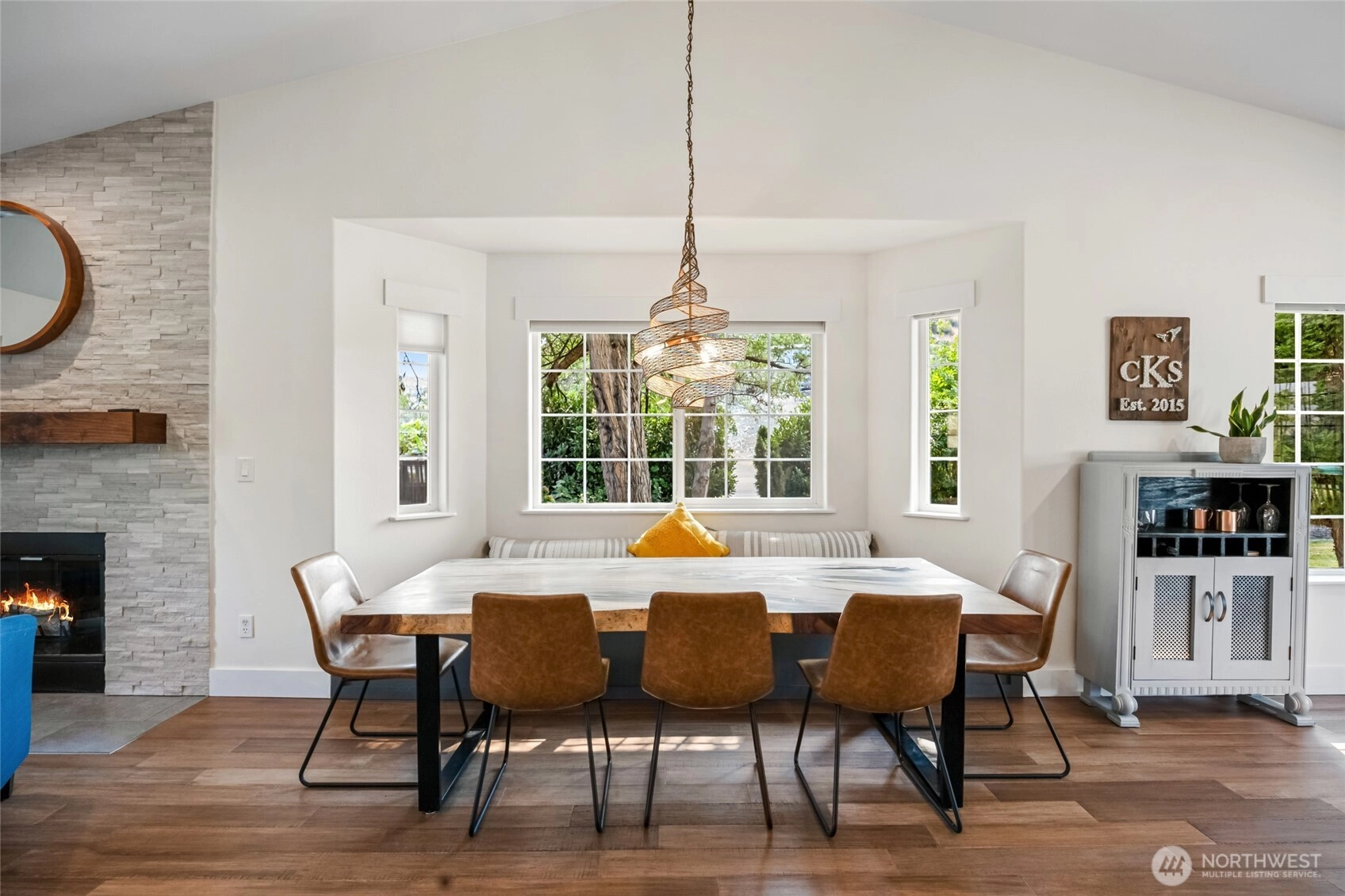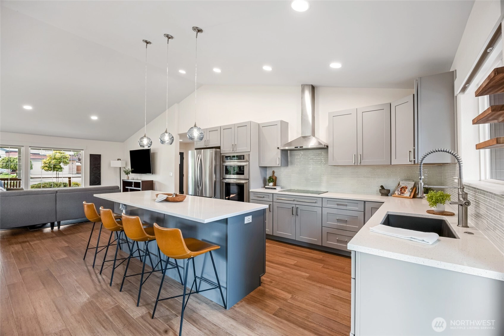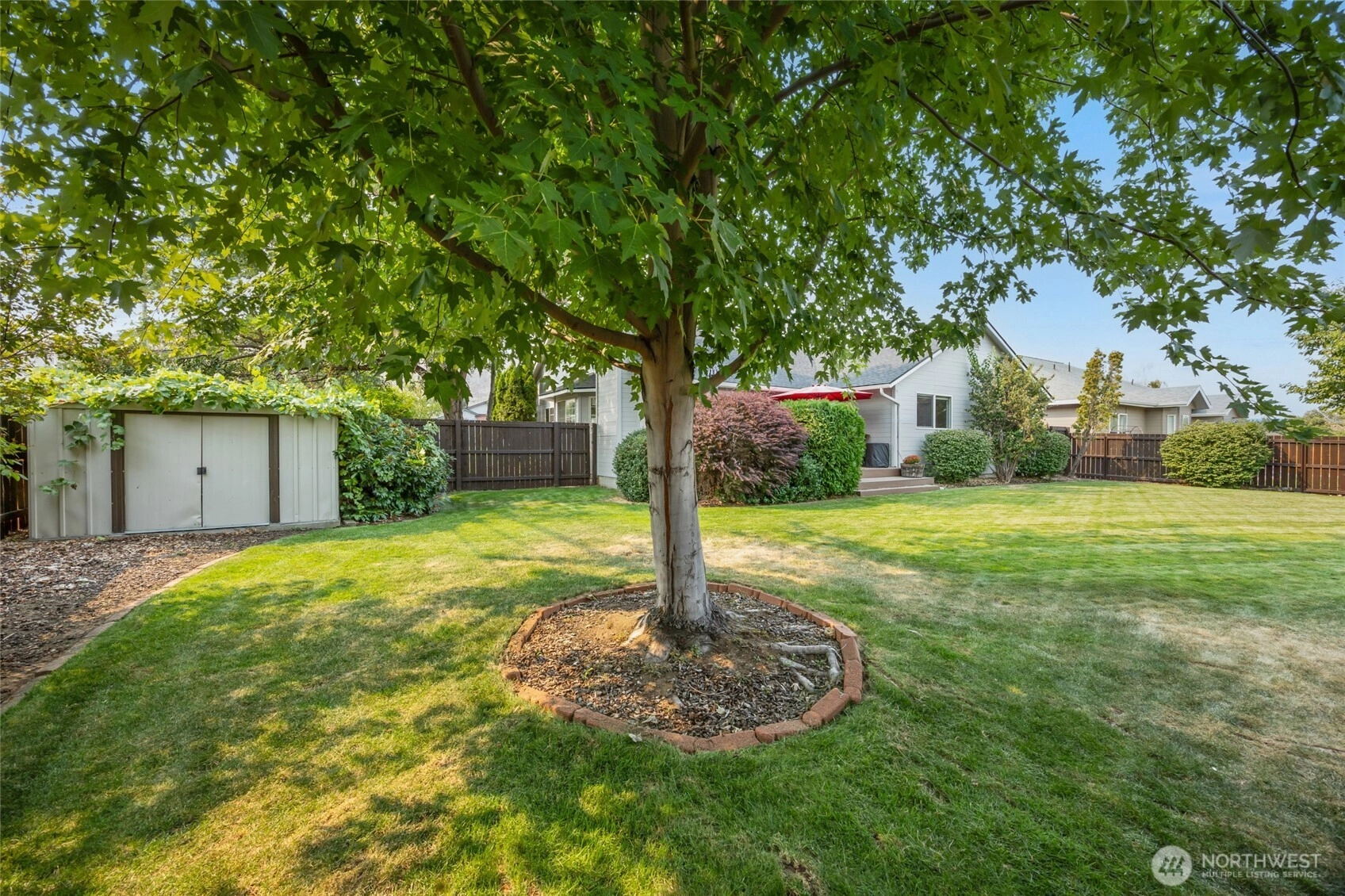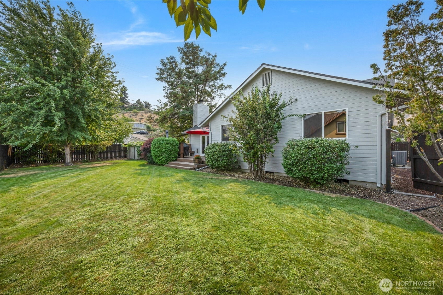 Style and function come together in this single-level 3 bed, 2 bath home with thoughtful details at every turn. The newly remodeled open kitchen boasts a large island, vaulted ceiling, and a cozy sitting area with a gas fireplace. The open floor plan can host a crowd, flowing easily through double doors to the back deck. Creative storage solutions are expertly integrated - so this home lives bigger than its square footage. The new flooring (bamboo plank), roof, exterior paint, and newer HVAC and hot water tank, make this home move in ready. Relax on the charming front porch swing or enjoy the fenced level back yard with shade trees. The garage does double duty with a custom-built workbench and storage. Wen Rec irrigation water.