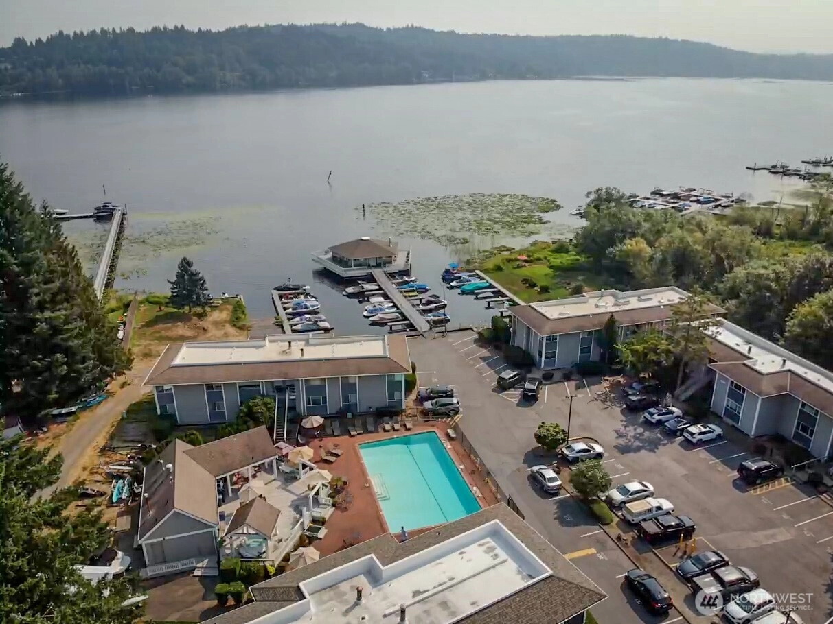 Villa Marina Resort-style living on Lake Sammamish! Enjoy private waterfront with space for boats, jet skis, kayaks & paddle boards, w/ amenities including a private boat launch, over-water cabana, boat & RV storage, pool & hot tub. Convenient ground-floor unit offers in-unit washer/dryer, a cozy eating nook off kitchen, dining area, and spacious living room with slider to a private deck & outdoor storage. Primary bedroom features dual closets and direct bath access. Additional highlights include easy-care flooring, ample closet space, and assigned parking #249 right at your door. Minutes to Redmond Town Center, parks, trails & Microsoft. Pet friendly, no rental cap, FHA & VA approved—great for homeowners or investors!