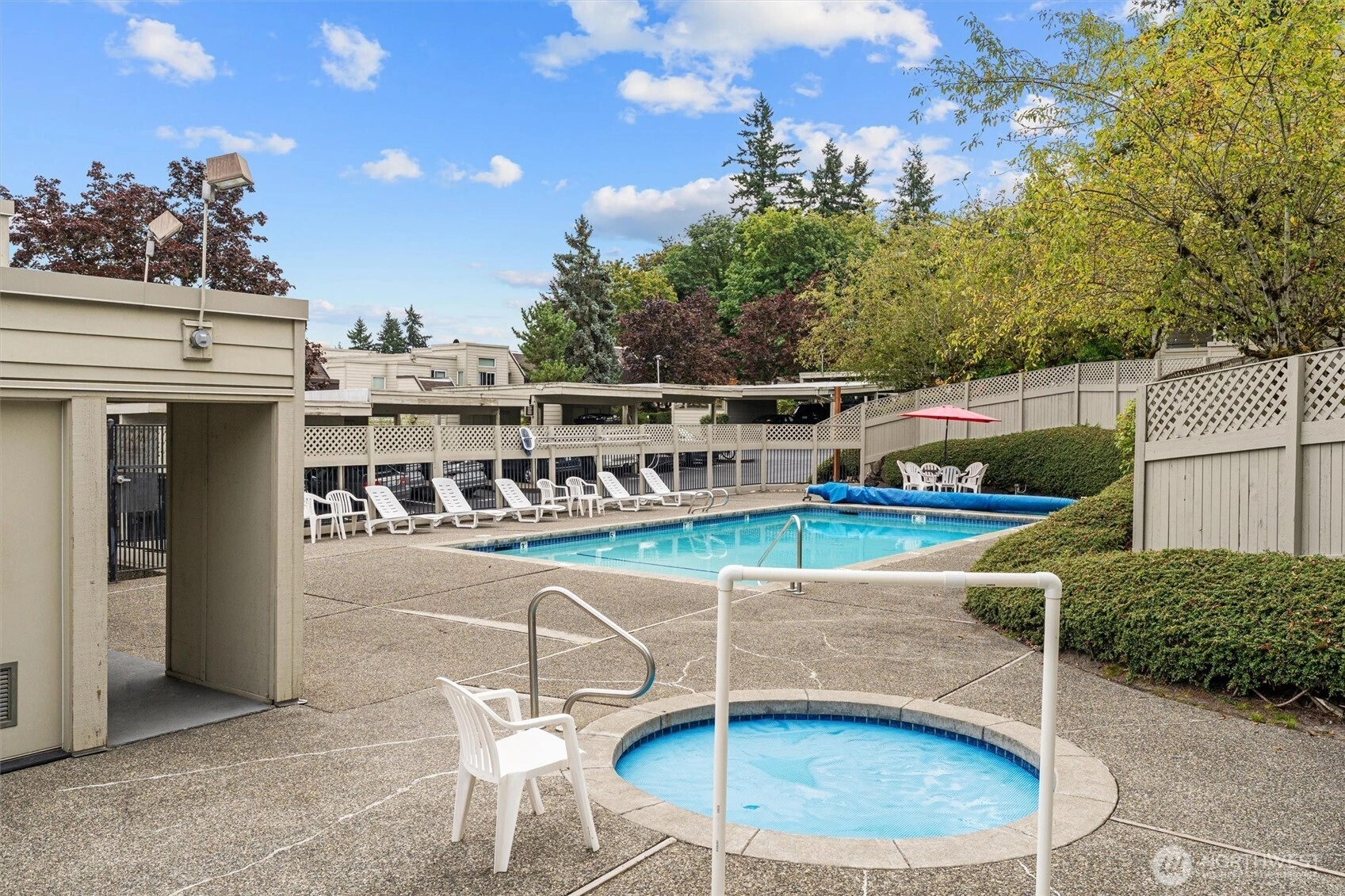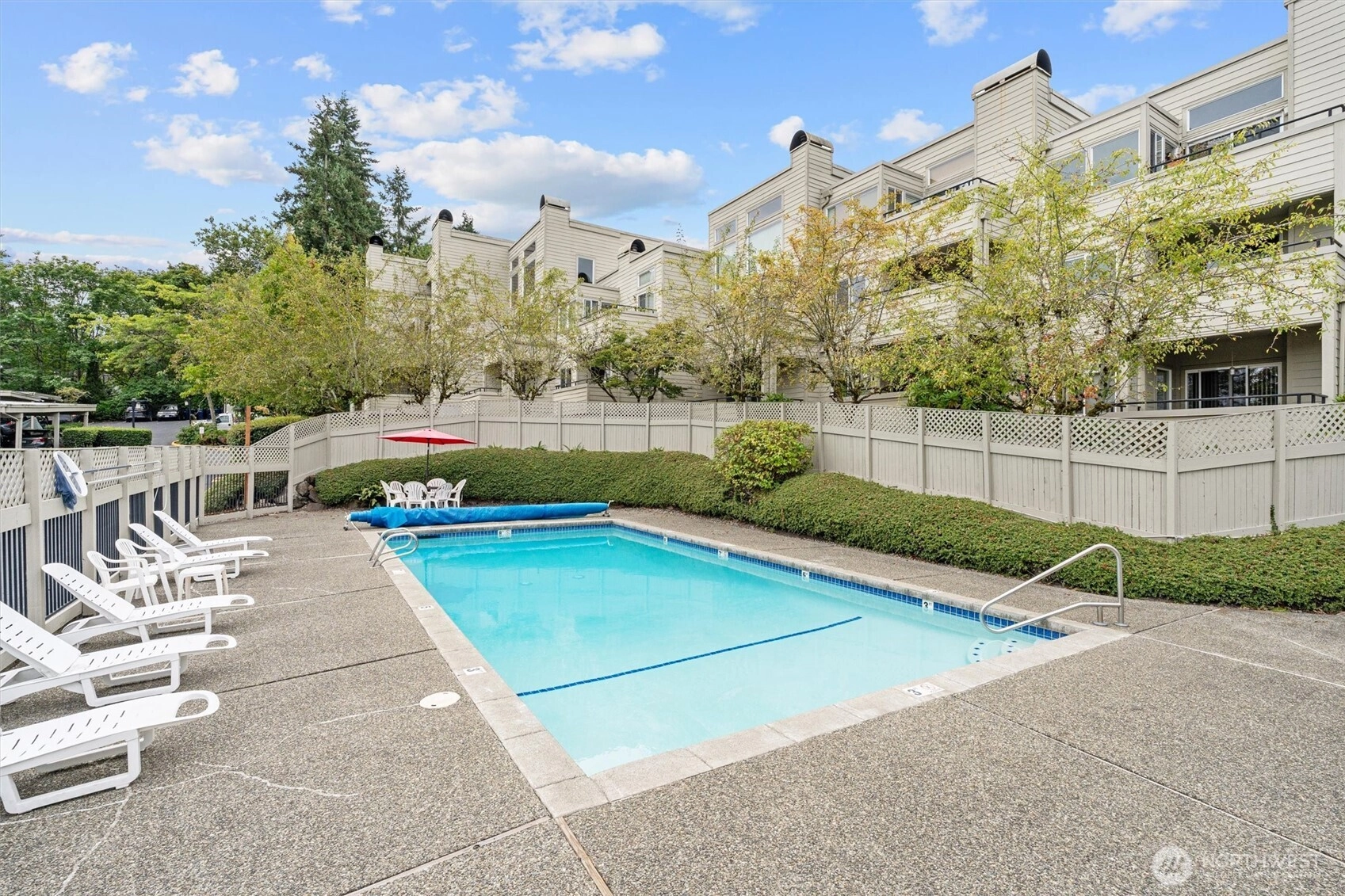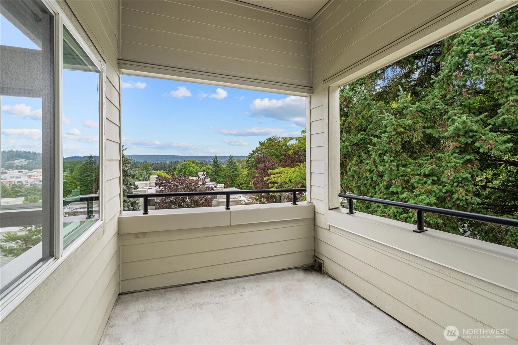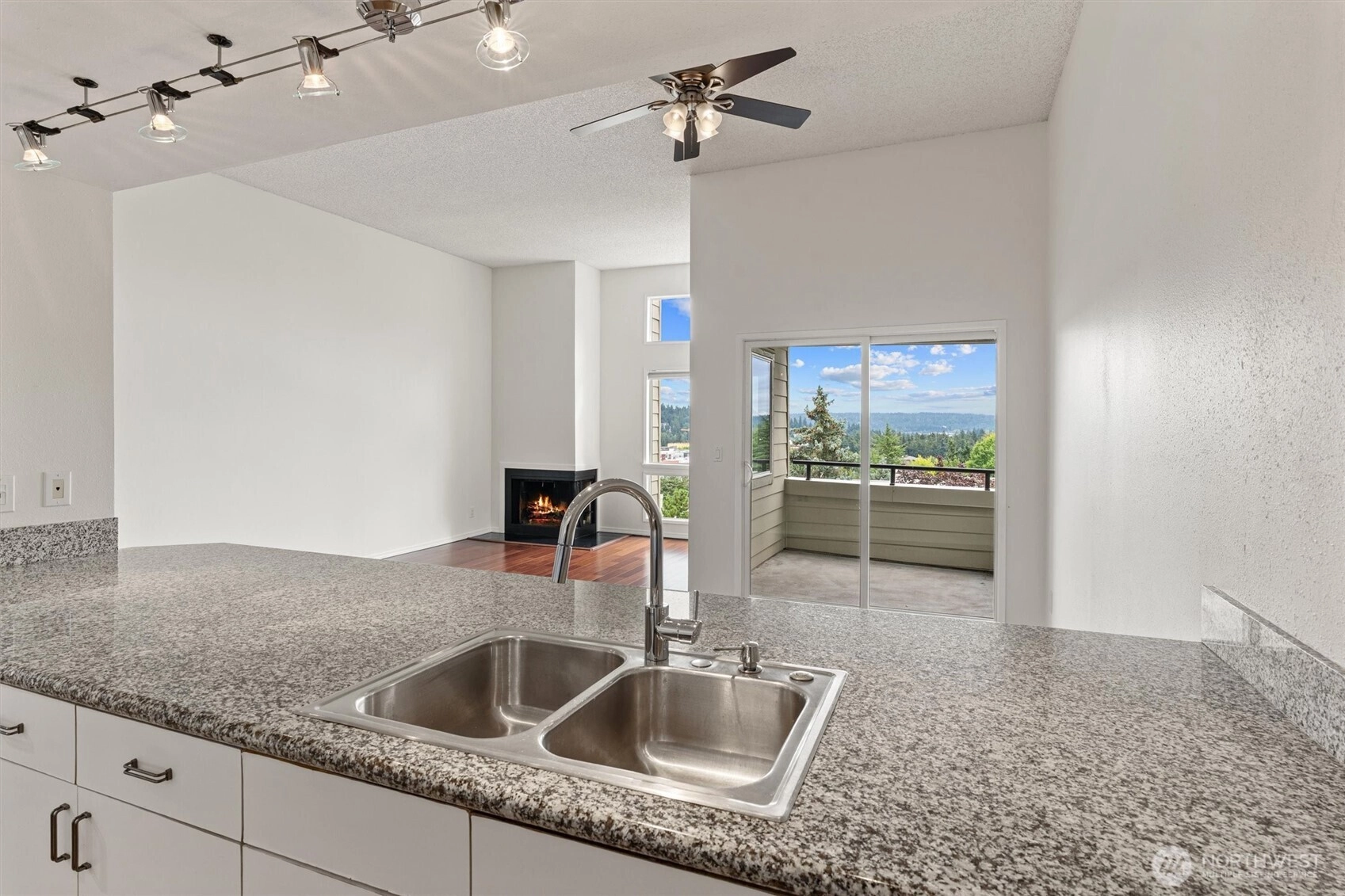 Beautifully remodeled top-floor condo with stunning Cascade Mountain views in the sought-after Knollwood complex— minutes from Redmond Town Center, Microsoft, and Marymoor Park. Spacious and open 1-bedroom home features abundant natural light, Brazilian Cherry hardwood floors, fresh paint, and designer finishes. Living room offers soaring 12 ft ceilings and a cozy wood-burning fireplace. Granite counters & bar seating highlight the kitchen and dining room that opens out to the large, private deck - perfect for relaxing or entertaining. Bedroom includes a walk-in closet, the updated bathroom features double vanity. Knollwood offers a pool, hot tub, one covered parking space, and ample guest parking in a quiet, private well-kept community.