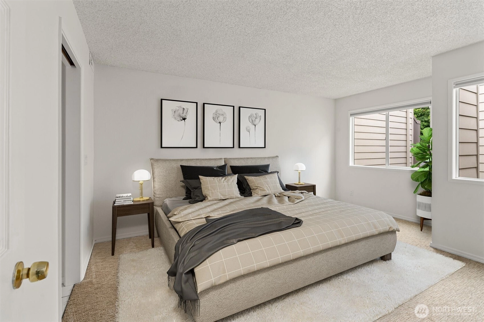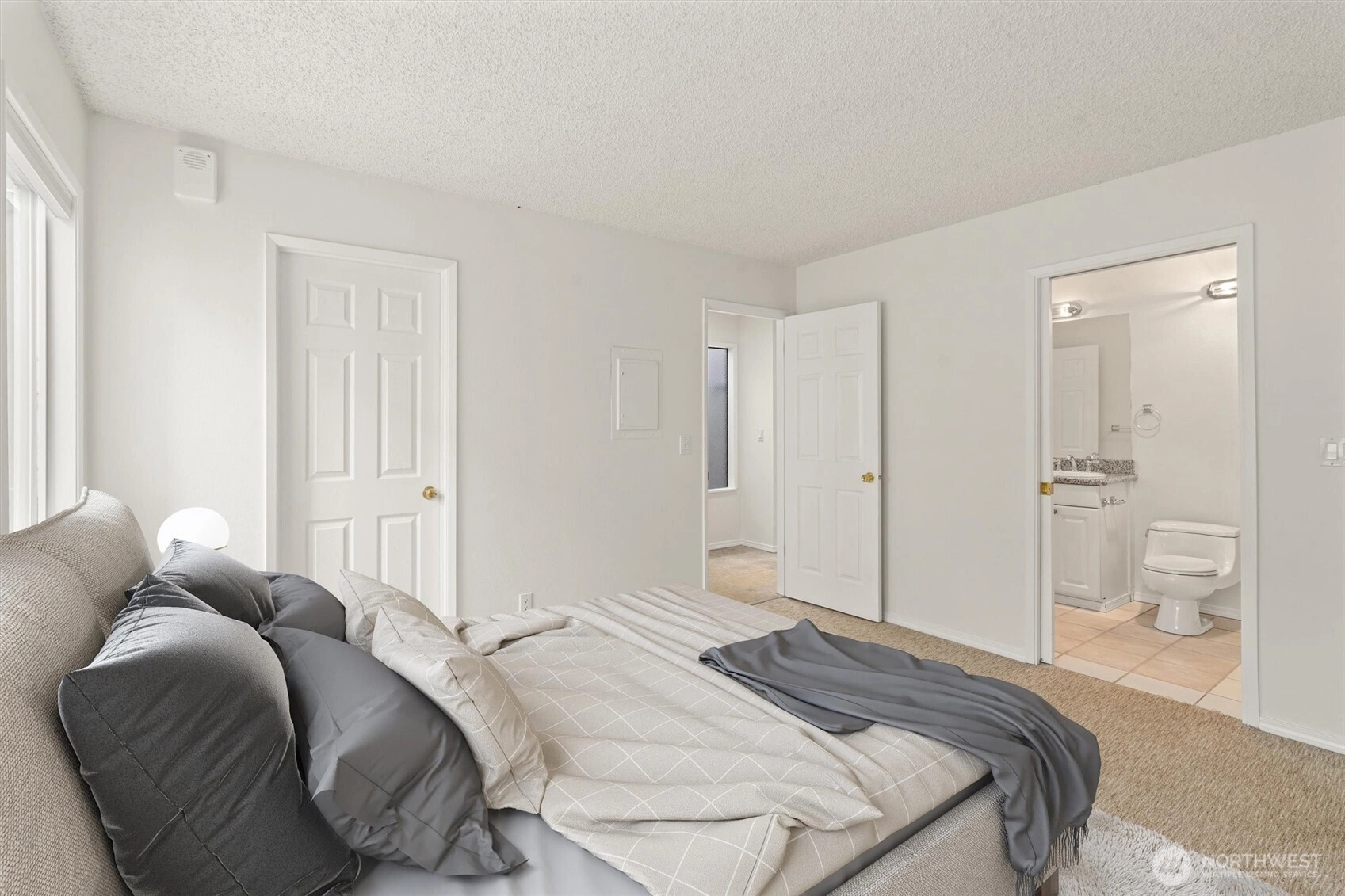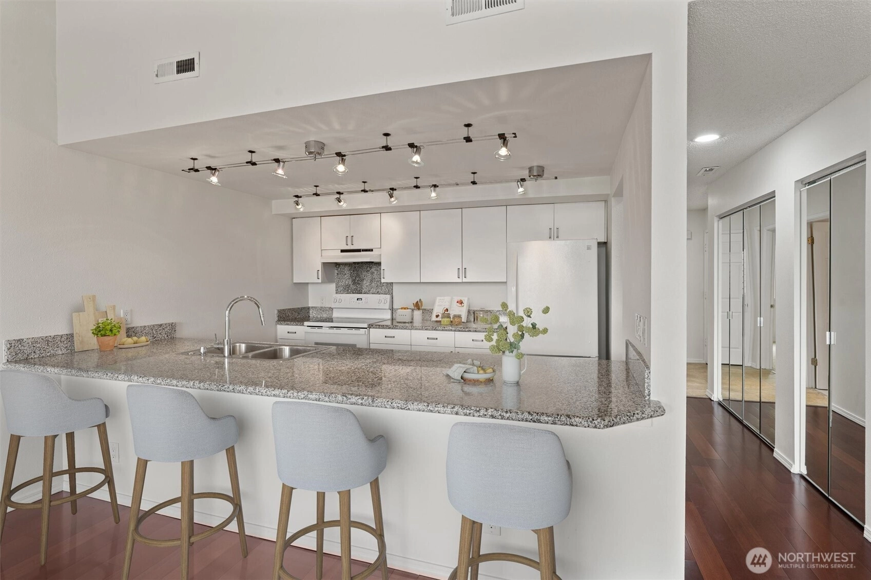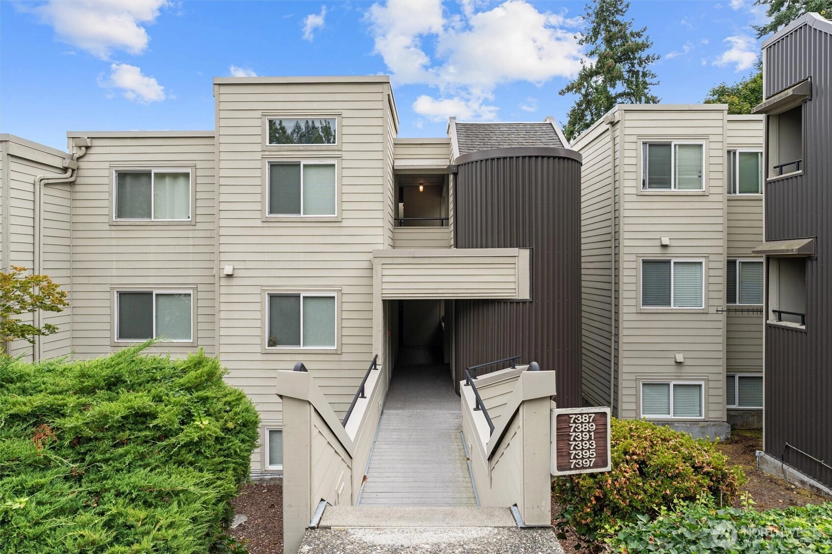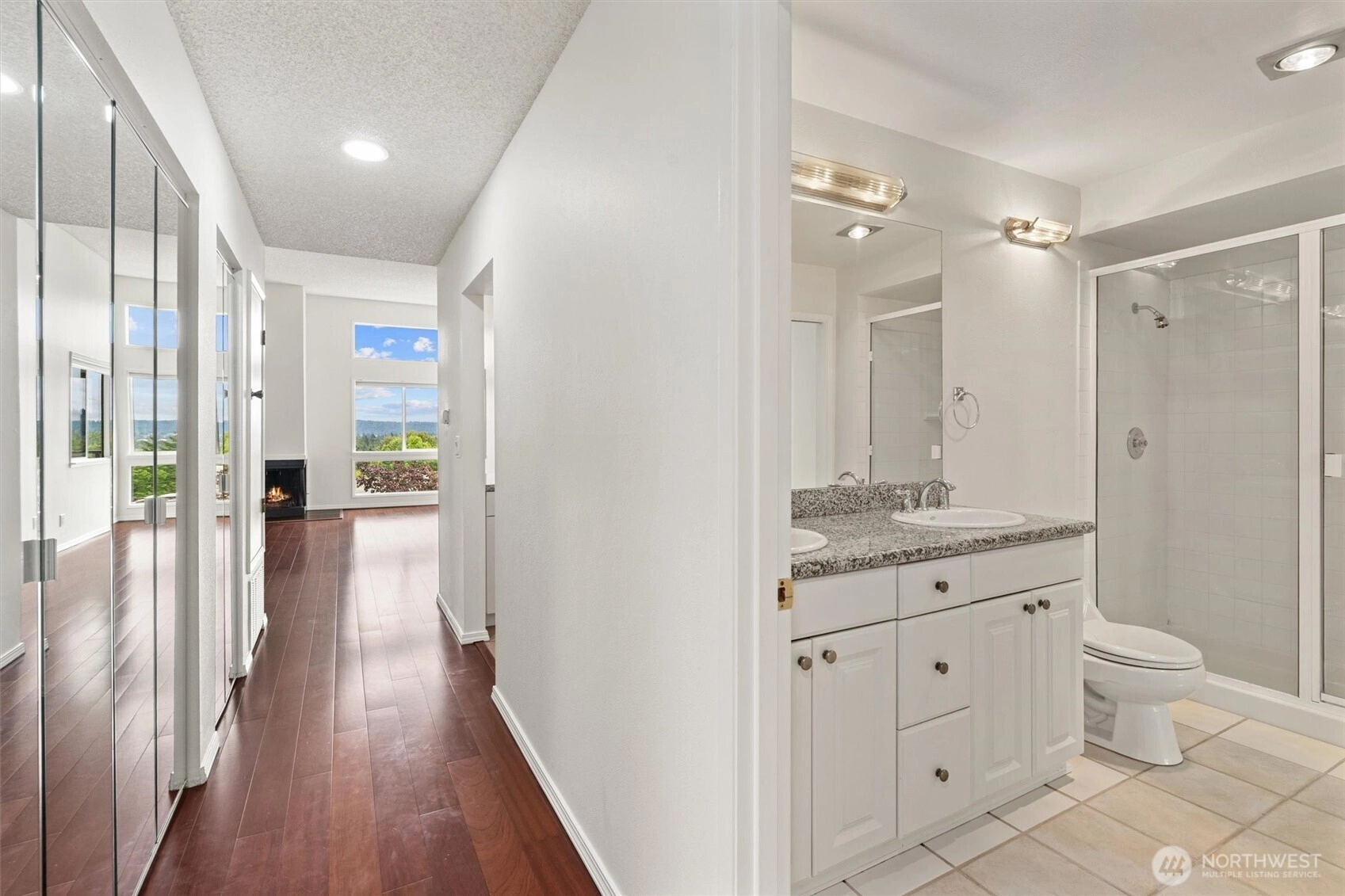 Beautifully remodeled top-floor condo with stunning Cascade Mountain views in the sought-after Knollwood complex— minutes from Redmond Town Center, Microsoft, and Marymoor Park. Spacious and open 1-bedroom home features abundant natural light, Brazilian Cherry hardwood floors, fresh paint, and designer finishes. Living room offers soaring 12 ft ceilings and a cozy wood-burning fireplace. Granite counters & bar seating highlight the kitchen and dining room that opens out to the large, private deck - perfect for relaxing or entertaining. Bedroom includes a walk-in closet, the updated bathroom features double vanity. Knollwood offers a pool, hot tub, one covered parking space, and ample guest parking in a quiet, private well-kept community.