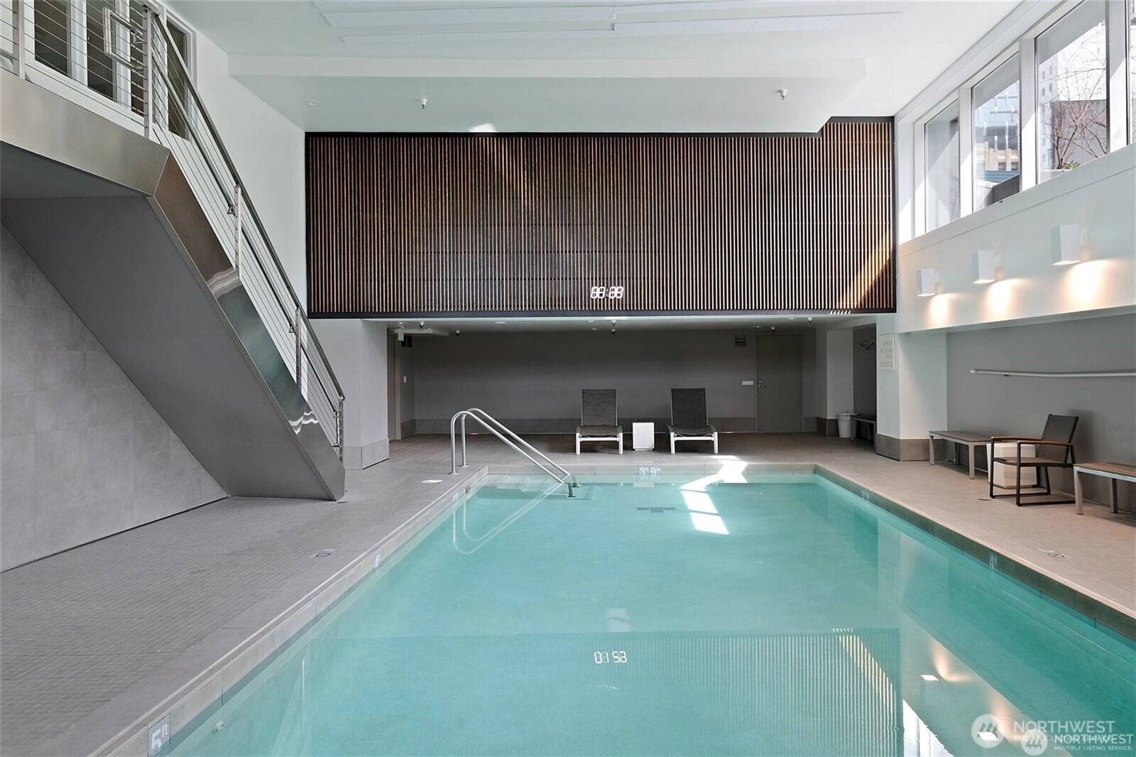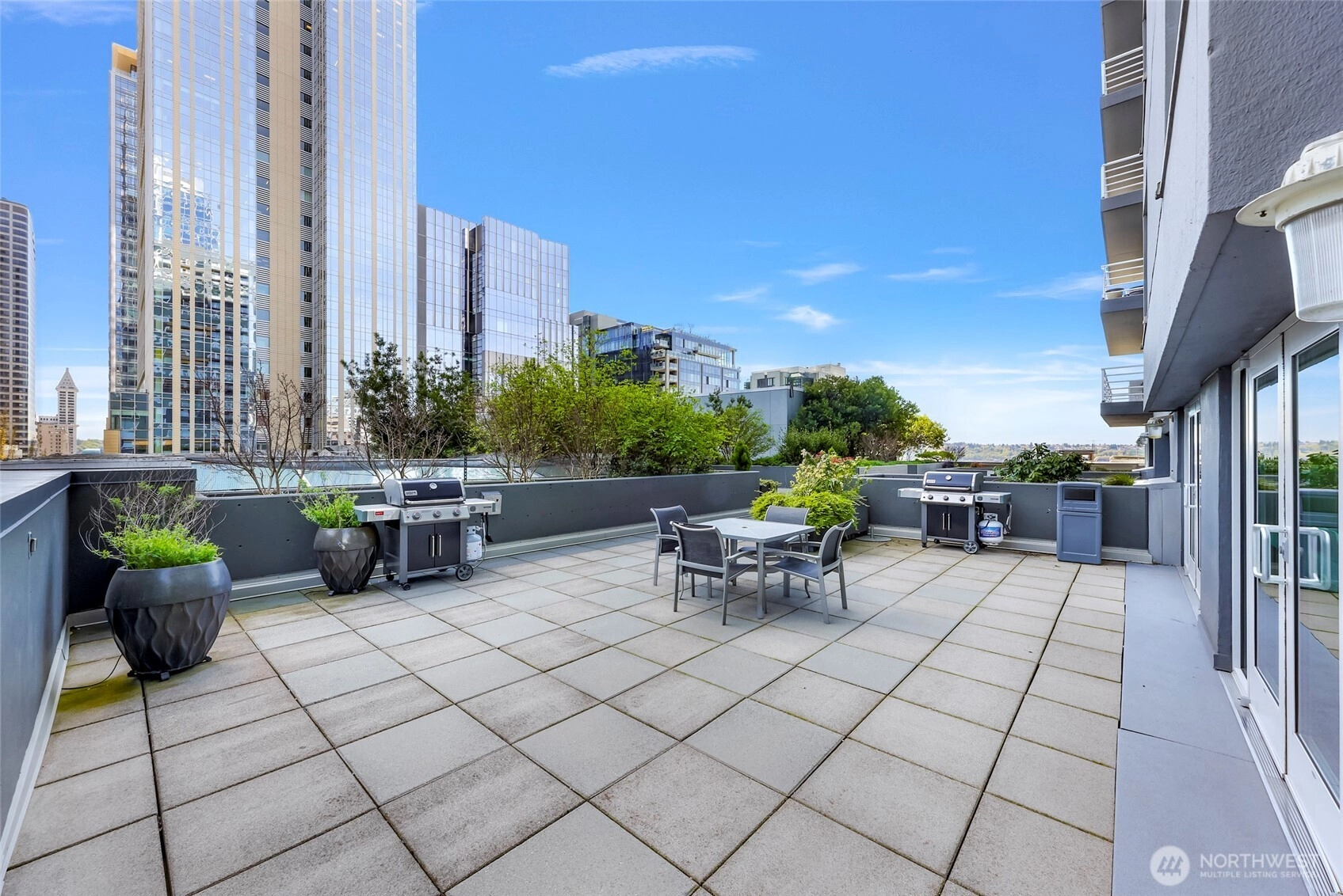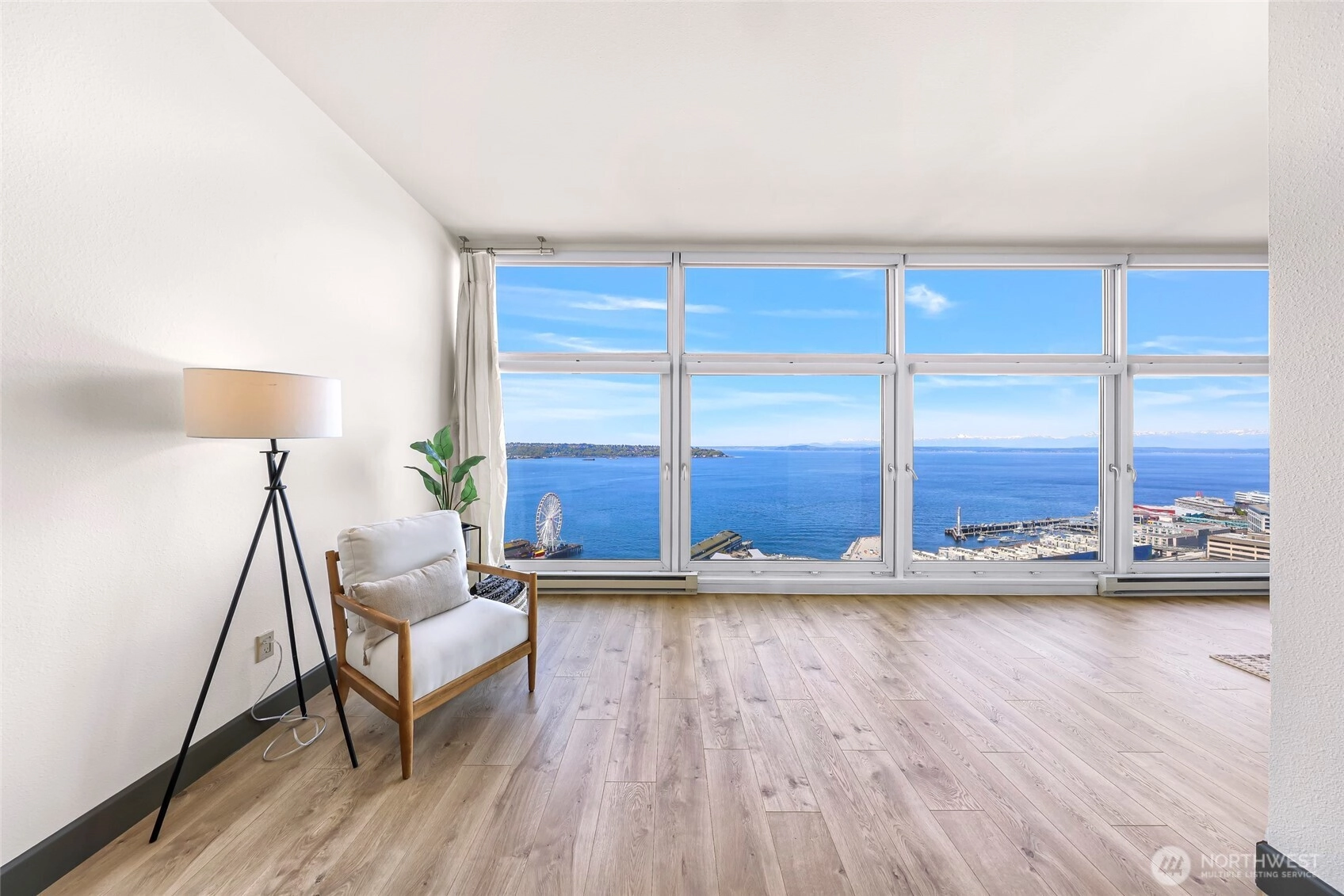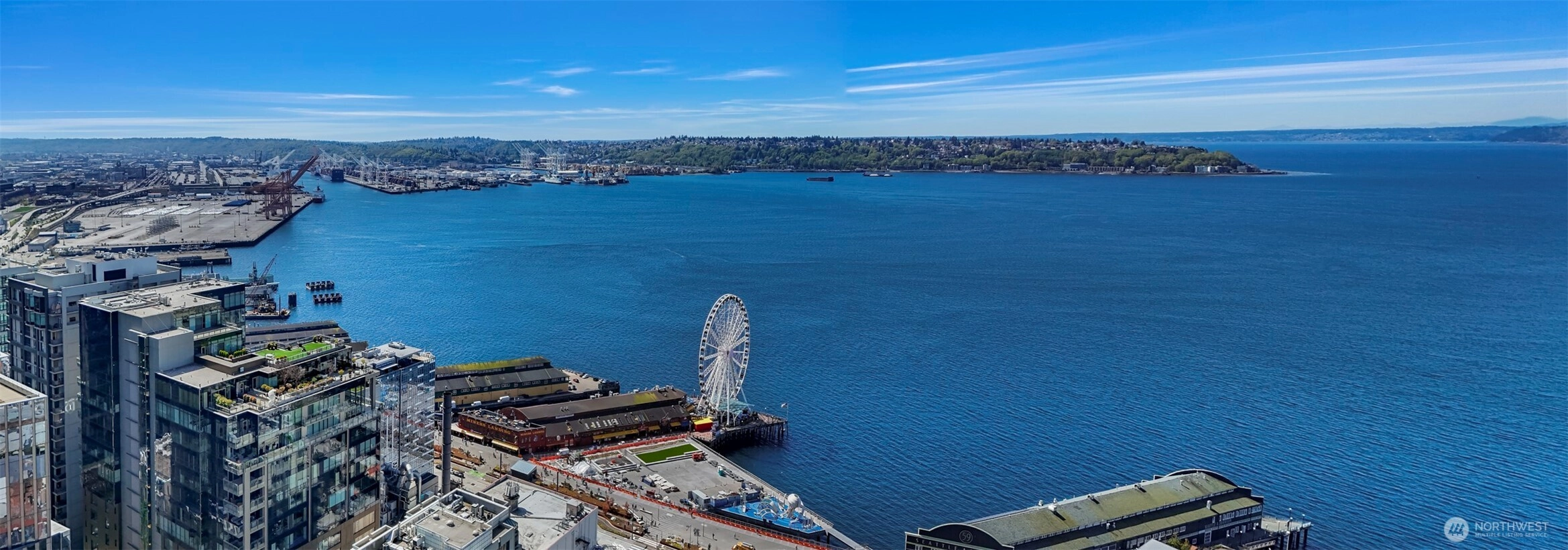 Live in the skies of Seattle: Step into this light-filled, top-floor condo & you'll captivated by breathtaking, unobstructed west-facing views of the Puget Sound, Olympic Mountains, & sparkling waterfront—truly the best views in all of Seattle. Inside you'll find soaring ceilings, new flooring & paint, a spacious open-concept layout, & a stylishly updated kitchen w/ quartz counters & SS appliances, PLUS AC! The bedroom offers panoramic views & dual closets W/system. In-unit washer/dryer, solar shades, secure parking w/EV charging potential & storage. Amenities: 24-hour concierge, pool, hot tub, sauna, gym, view deck, guest suite, Airbnbs Allowed. Steps to Pike Place Market, light rail, Benaroya Hall, Showbox, & top restaurants & more!