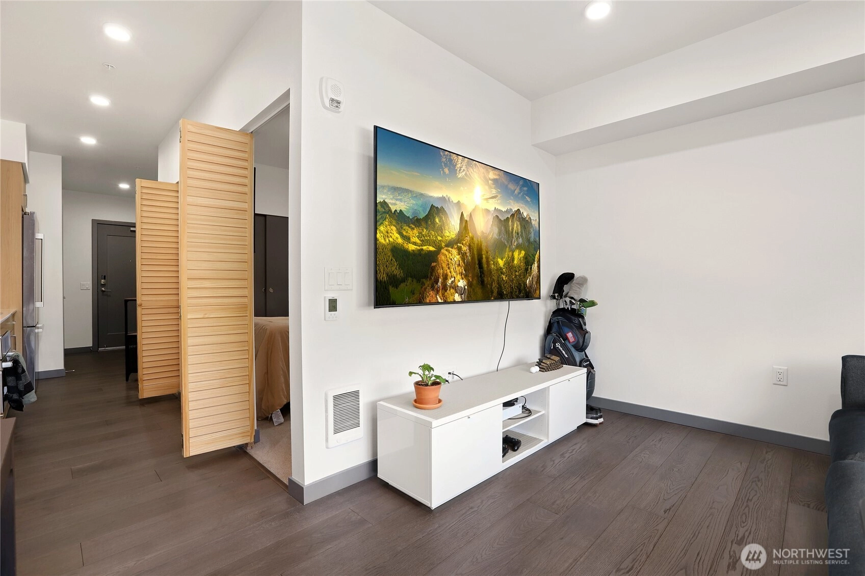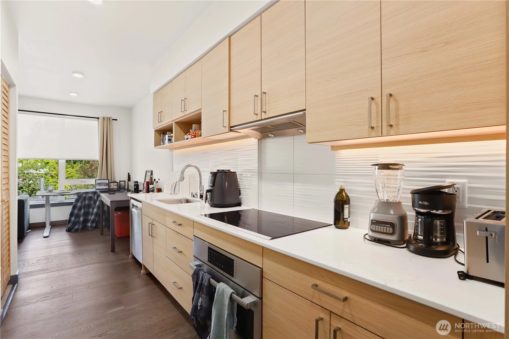 This stylish one-bedroom condo offers the perfect blend of modern comfort and urban convenience in the heart of Kirkland. Soaring 9’ ceilings and an oversized window fill the space with natural light, while wide-plank hardwood floors and Bosch stainless steel appliances highlight the contemporary design. The open layout is ideal for both everyday living and entertaining. Just minutes to The Village at Totem Lake, shopping, dining, major tech campuses, and Lake Washington schools, this home puts the best of the Eastside at your doorstep. Building amenities include a rooftop deck with sweeping city views, a fully equipped fitness center, concierge services, secure common garage, and one reserved parking space.