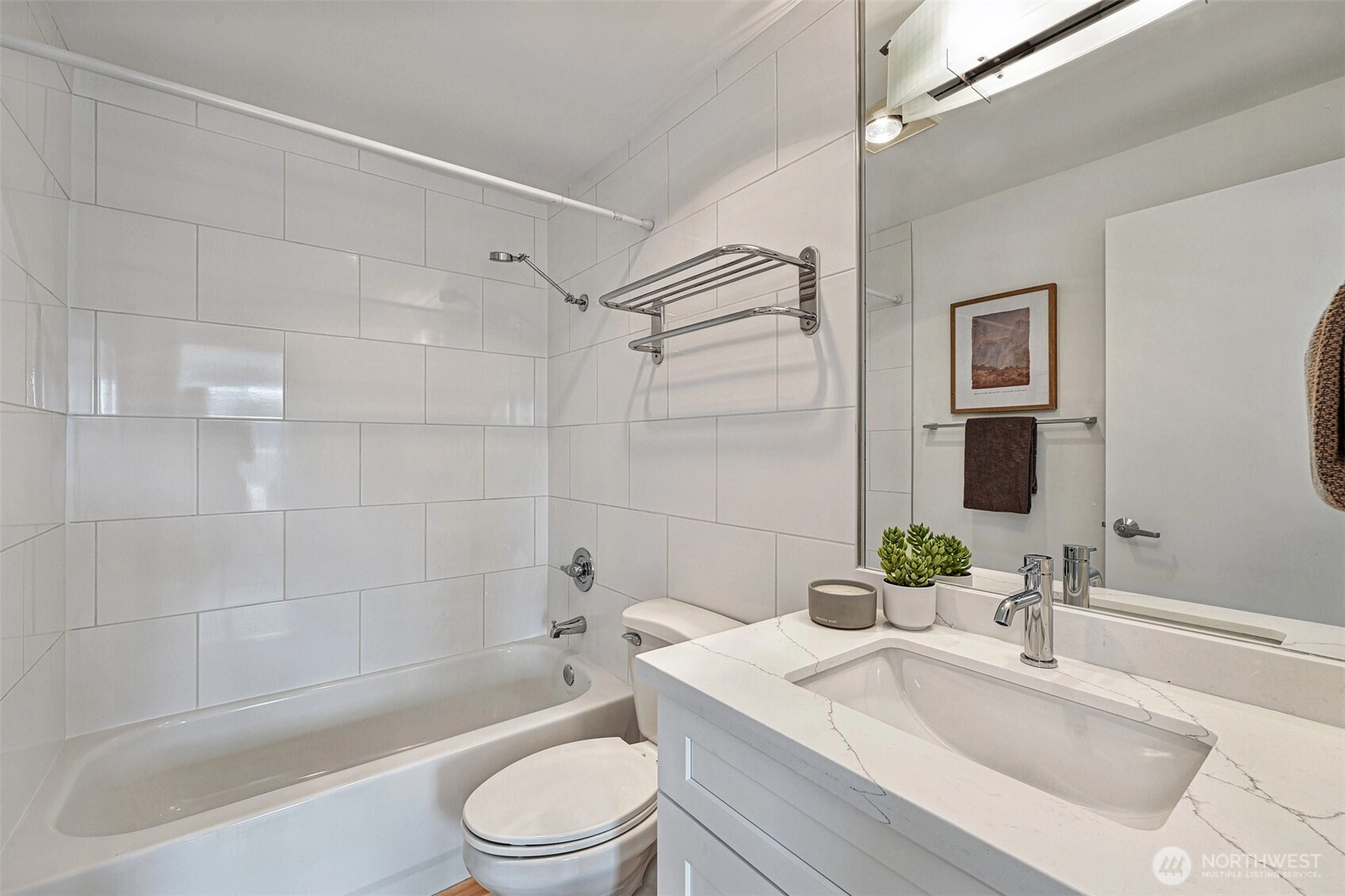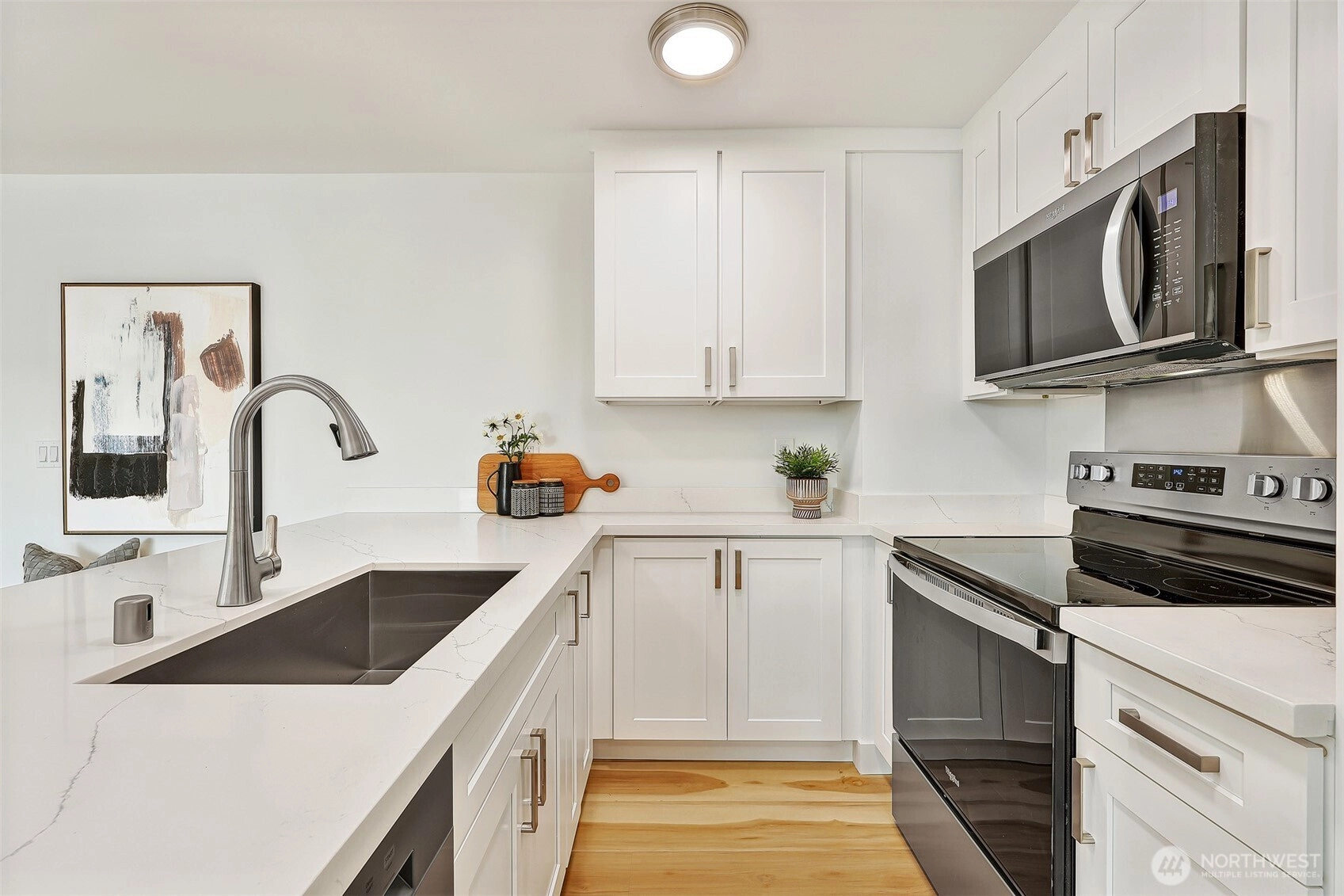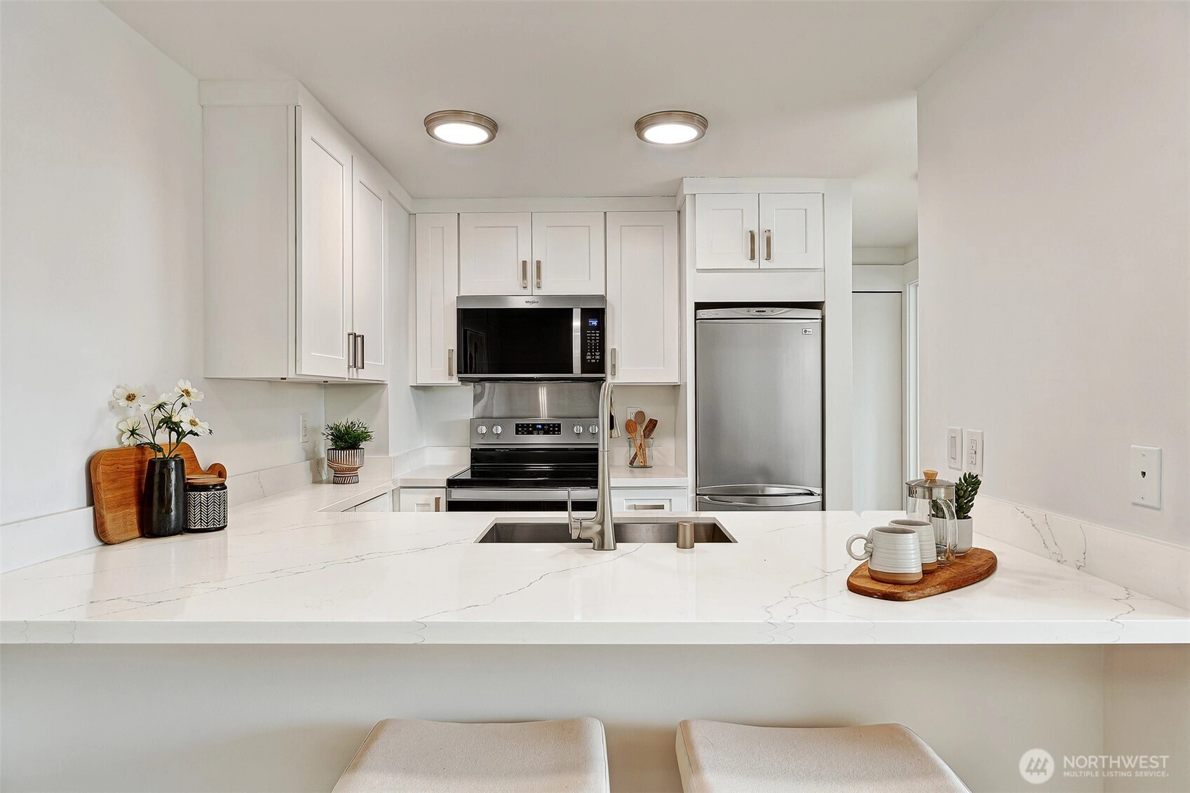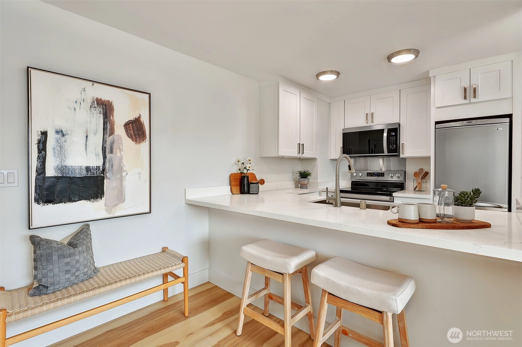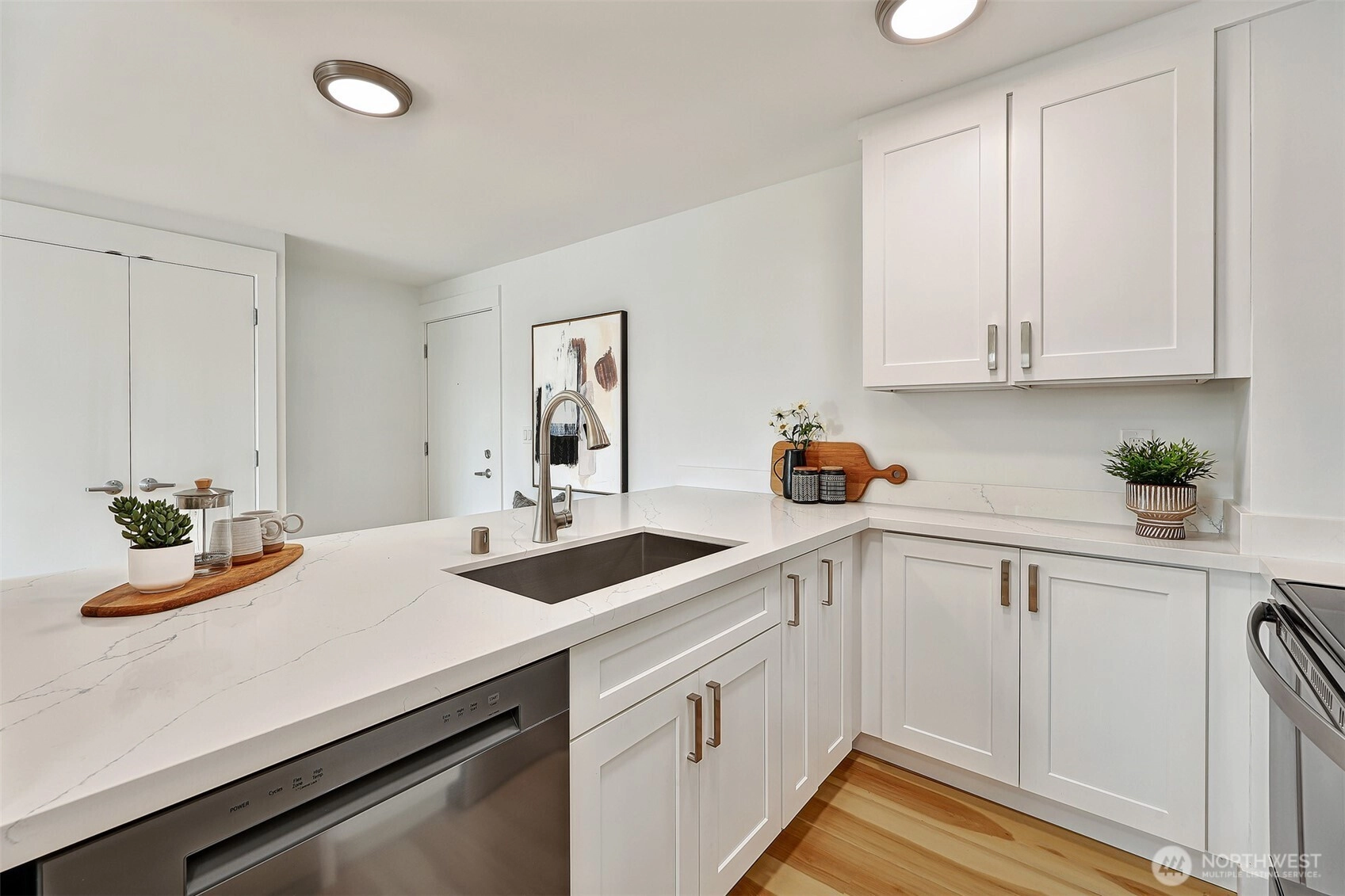 Fully Renovated in September 2025, this Top Floor residence at Biscayne Condominiums offers the perfect Wallingford/Fremont lifestyle - just steps to Gasworks Park, restaurants and everyday amenities. This unit features brand new floors, custom cabinetry, quartz countertops, stainless appliances and bath fixtures. Perfect for entertaining, the open concept layout enjoys sun-filled southern exposure and a private balcony with Space Needle view! Secure building with dedicated garage parking space and storage. Rooftop Deck with amazing panoramic views of Downtown Seattle. Convenient access to University of Washington, South Lake Union and Downtown Seattle.
