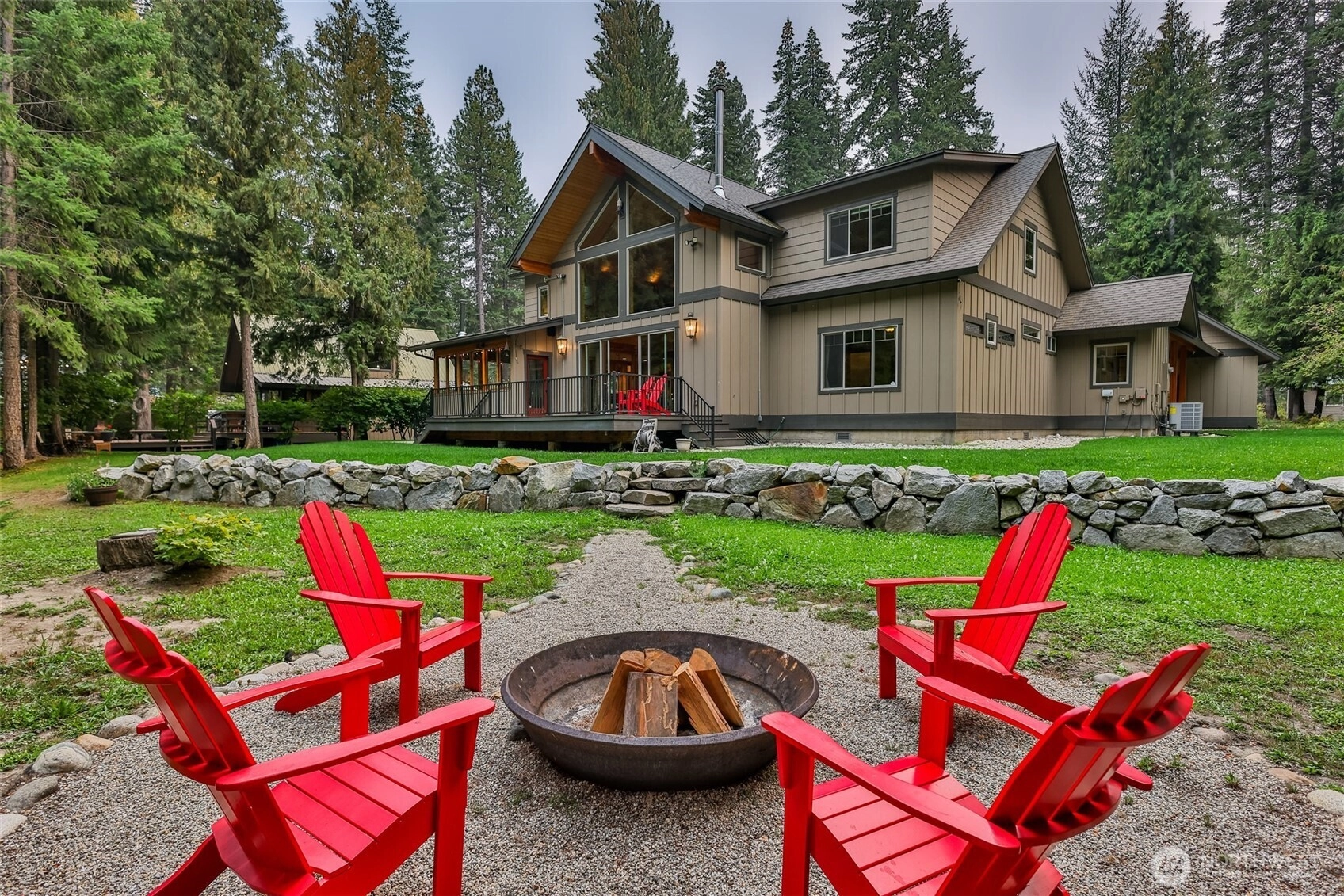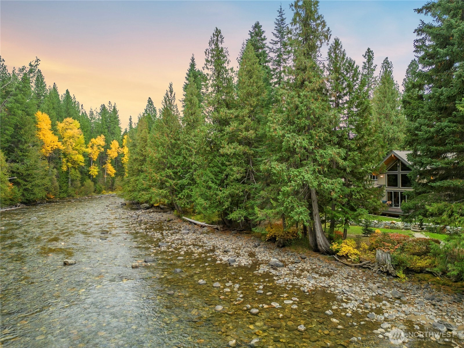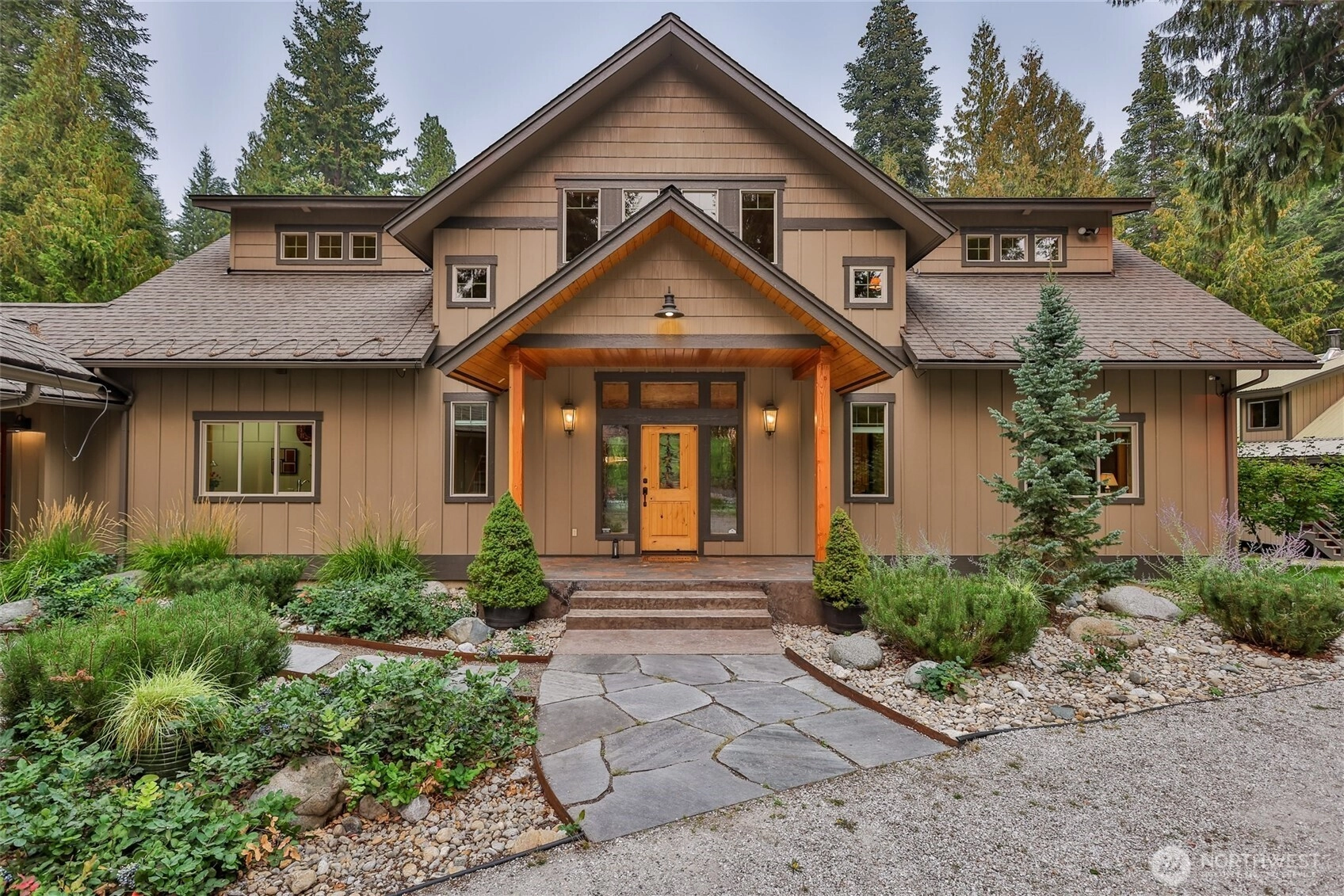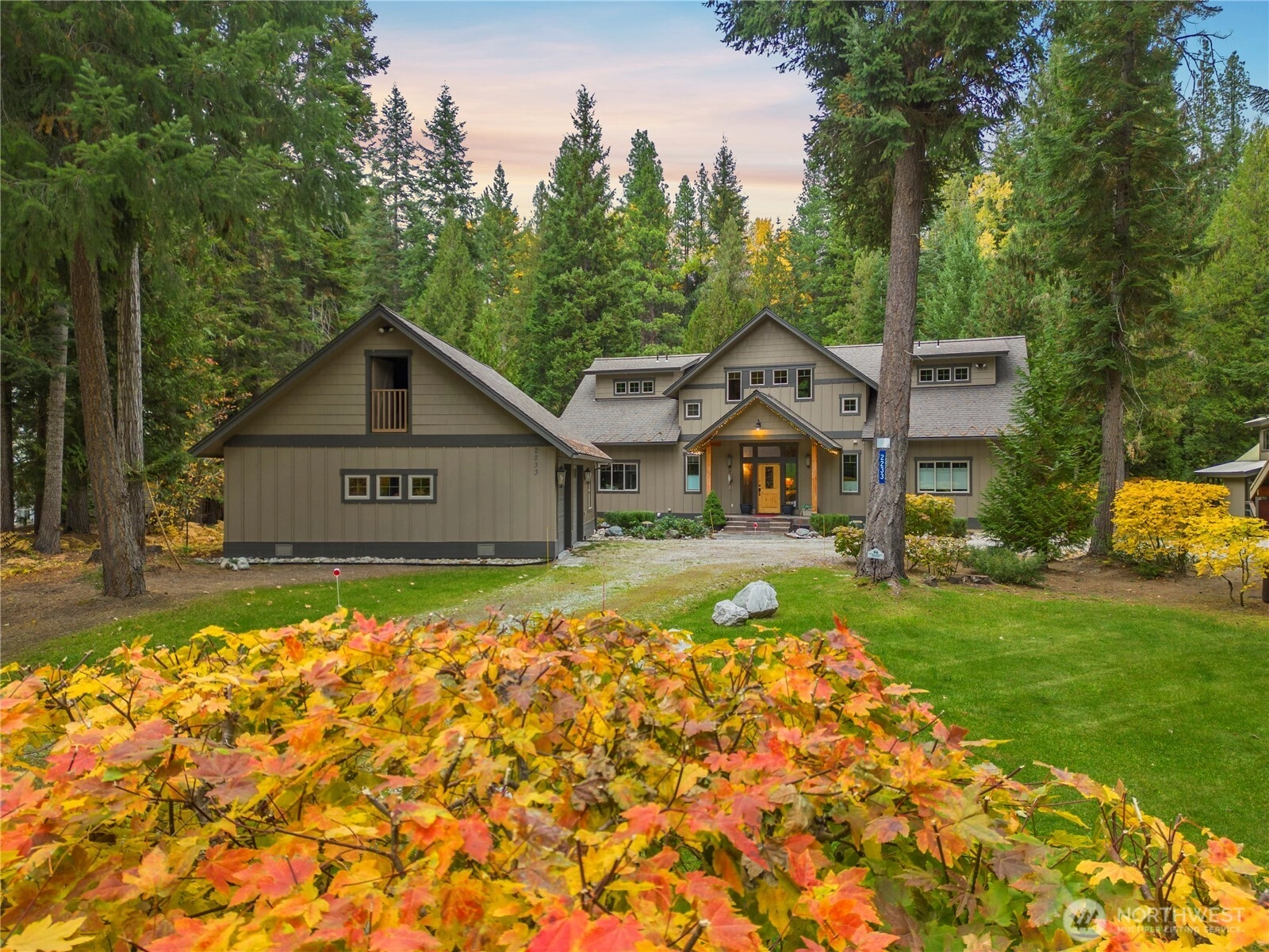 Wake to the soothing sounds of the Chiwawa River in this 3,200+ sq. ft. craftsman-inspired home with 120 ft. of premier low-bank frontage in Chiwawa River Pines. The main level showcases a soaring vaulted ceiling and floor-to-ceiling windows that capture sparkling river views, paired with brand-new white oak flooring, a wood stove with river rock surround, and a gourmet kitchen designed for gathering. An enclosed sun porch, sunny office, and serene primary suite complete the space. Upstairs, a loft and two ensuite bedrooms provide private havens. Off the garage, a bonus room with a half bath offers a versatile escape. Outside, linger on the sundeck, play on the lawn, or gather by the fire pit beneath the stars—luxury on the river awaits.