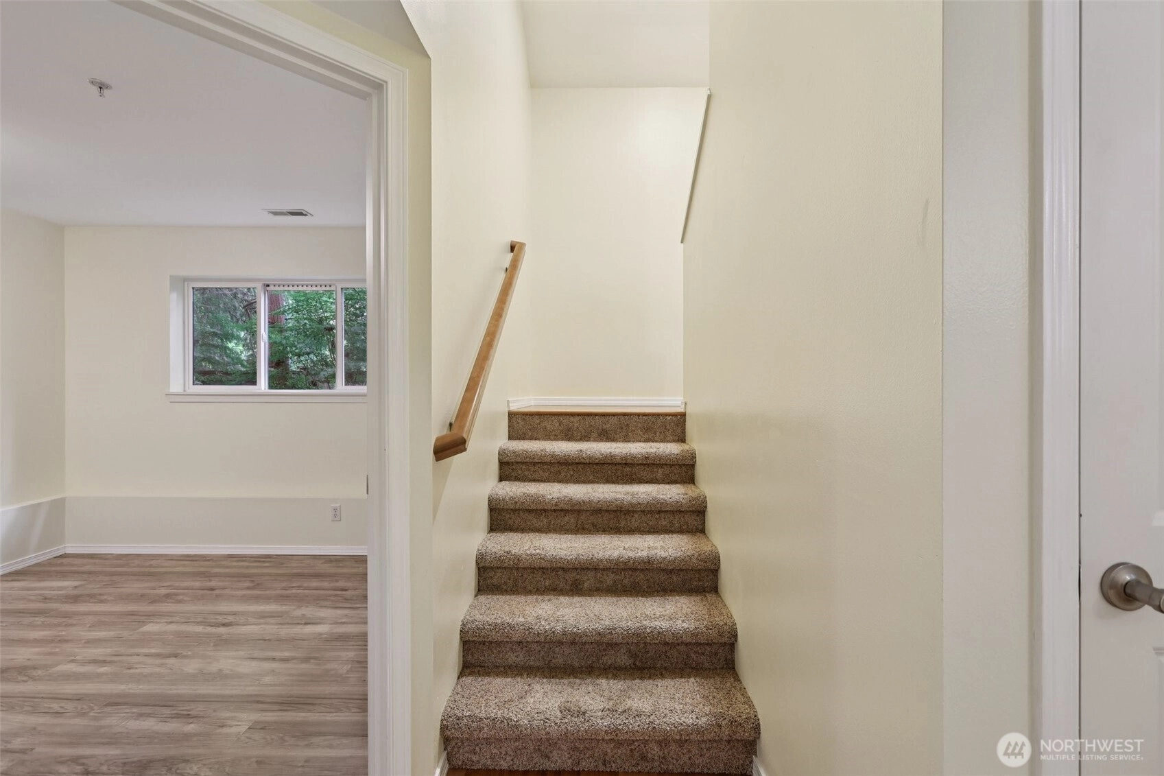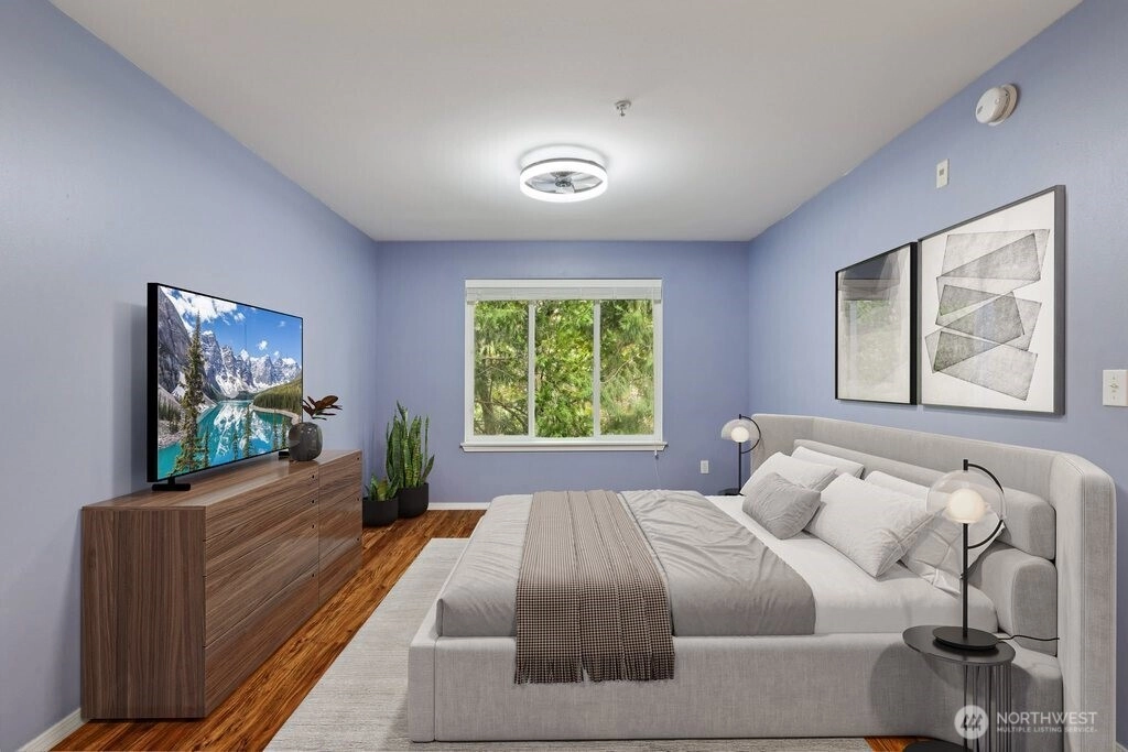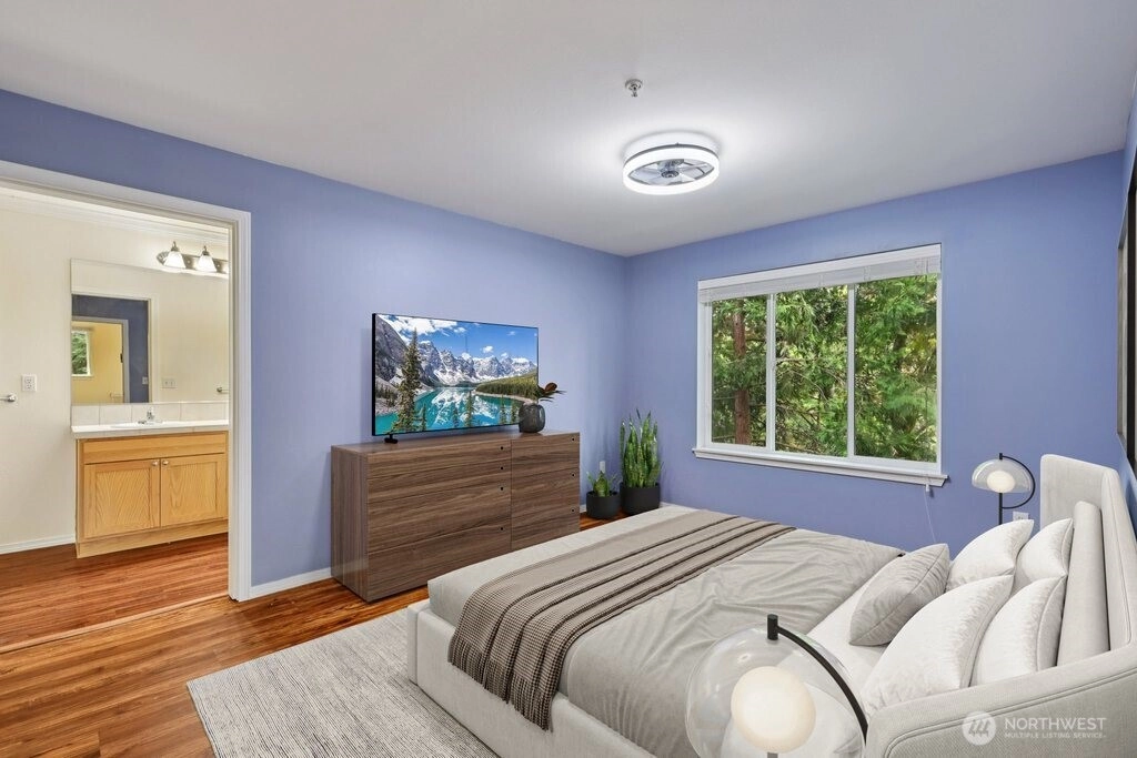 3 bd, 2.5 bath corner unit Townhome in the heart of Mountlake Terrace. Lower level has an oversized 2-car garage, BR/Den, & tiled entry. Open concept main level w/ bamboo floors in Kitchen and Dining rooms, carpeted living room & stairs, LVP in the powder room. West-facing balcony allows for great light exposure & sun for your beloved plants! Living room includes a cozy gas fireplace, & picture window that looks out on trees & bird feeders. Upper level has LVP throughout, & features 2 large bedrooms, each w/ an ensuite bathroom. Main bedroom includes a large walk-in closet. Laundry is also located upstairs. Quiet, wooded residential street, w/ excellent bird watching opportunities from living room. Easy access to I-5 & light rail station.