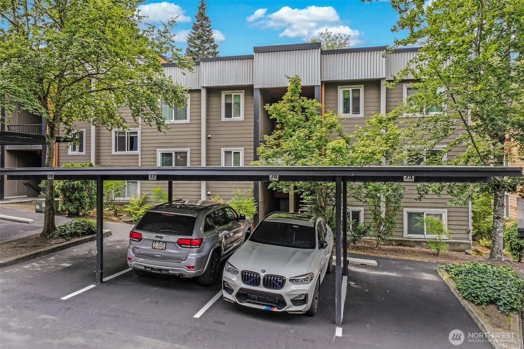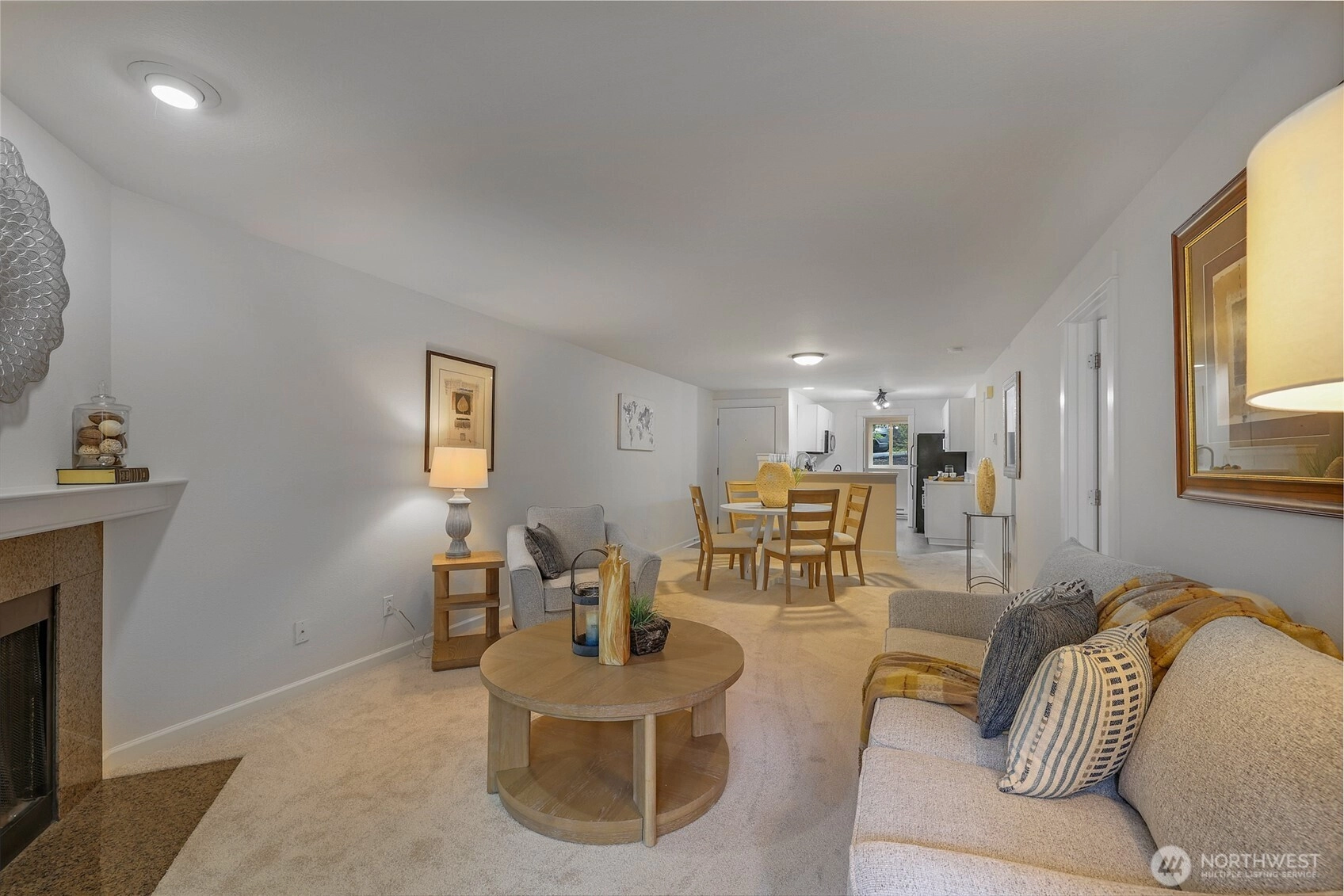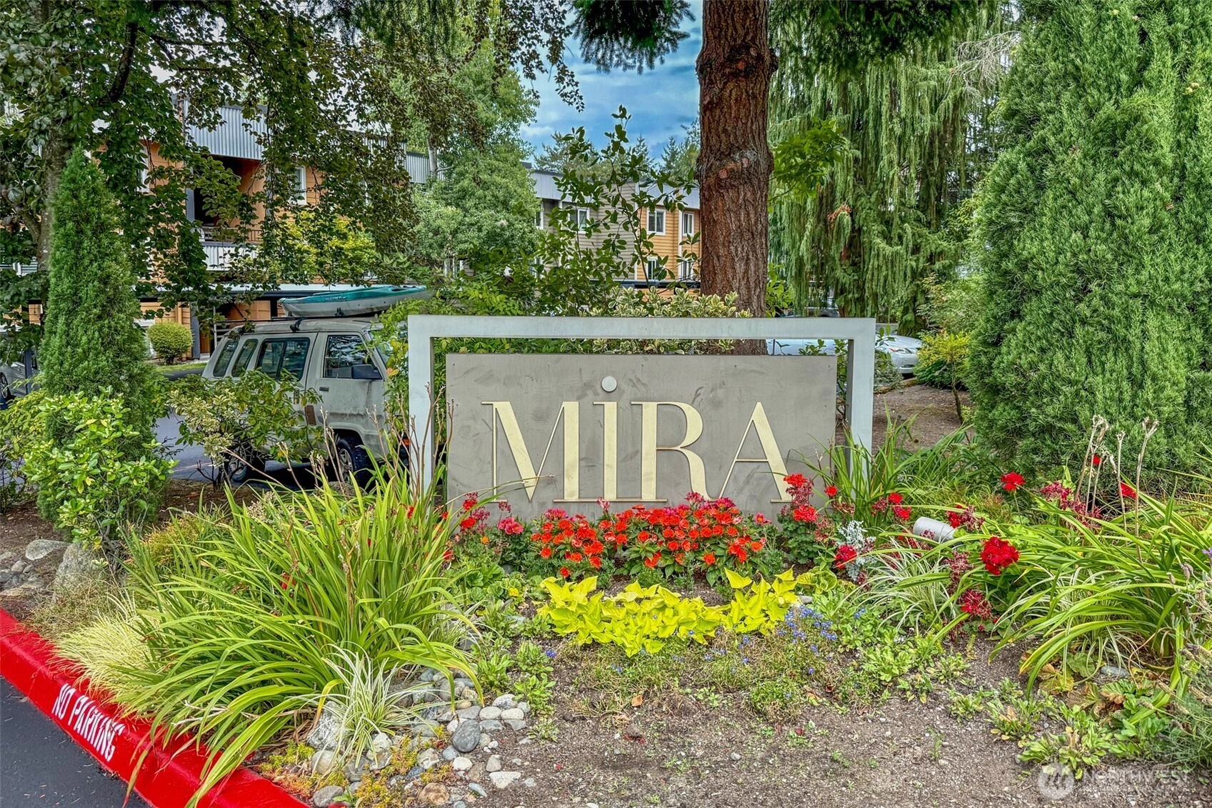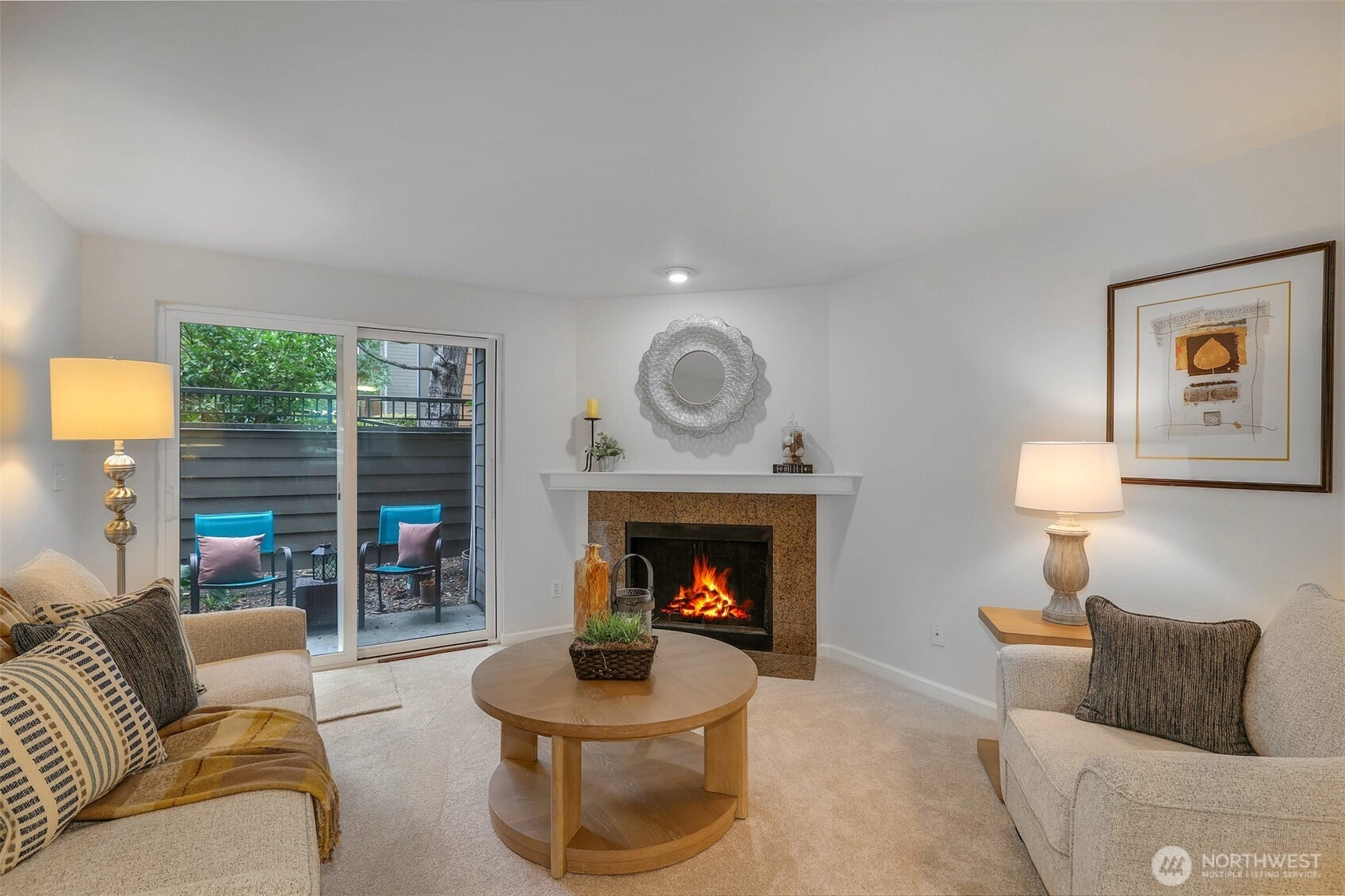Move-in-ready condo in Mira, the heart of Kirkland’s downtown neighborhood. This ground-floor unit feels spacious with new LVP flooring, new carpet and fresh paint throughout. Open concept layout features updated kitchen with white cabinets, quartz countertops, SS appliances and breakfast bar, flowing into living/dining area with cozy wood-burning fireplace. Sliding doors lead to patio with privacy screen. Split bedrooms ensure privacy: primary suite offers double closet and updated bath; guest room served by adjacent full bath. Full laundry room, storage, two parking spaces (one covered). Pet-friendly with no rental cap, plus amenities including pool and hot tub. Minutes to Google, Kirkland Urban, parks, I-405 & Lake Washington schools.