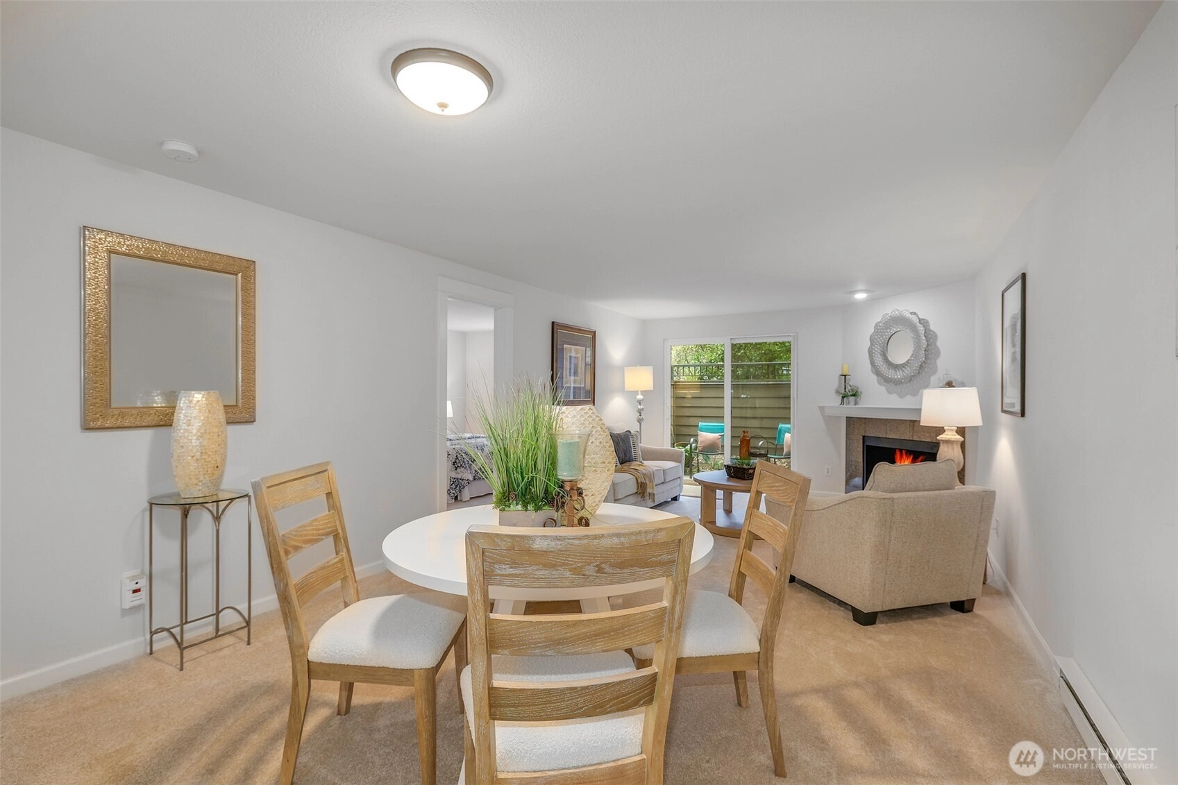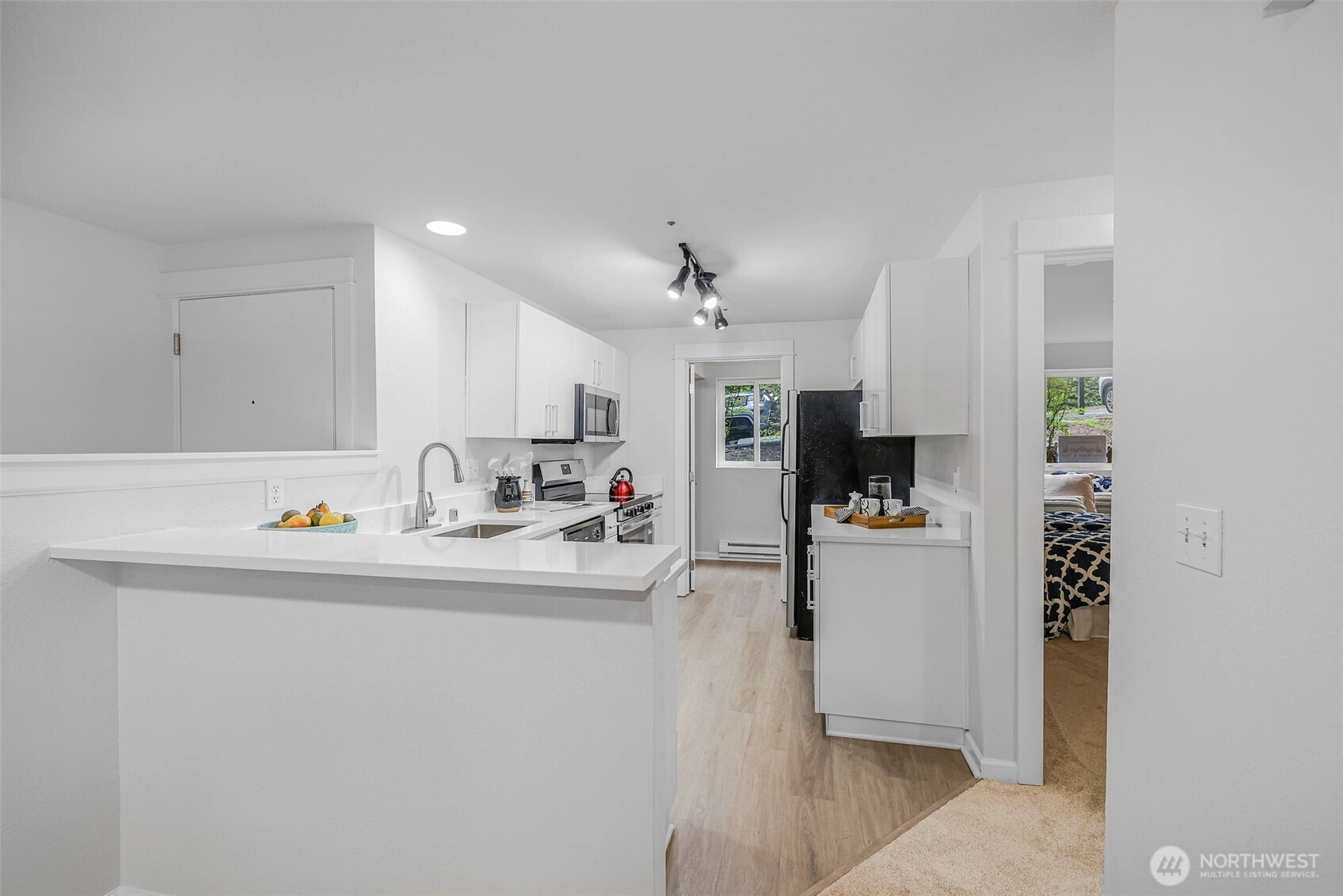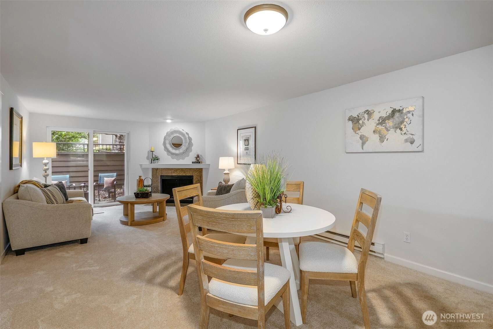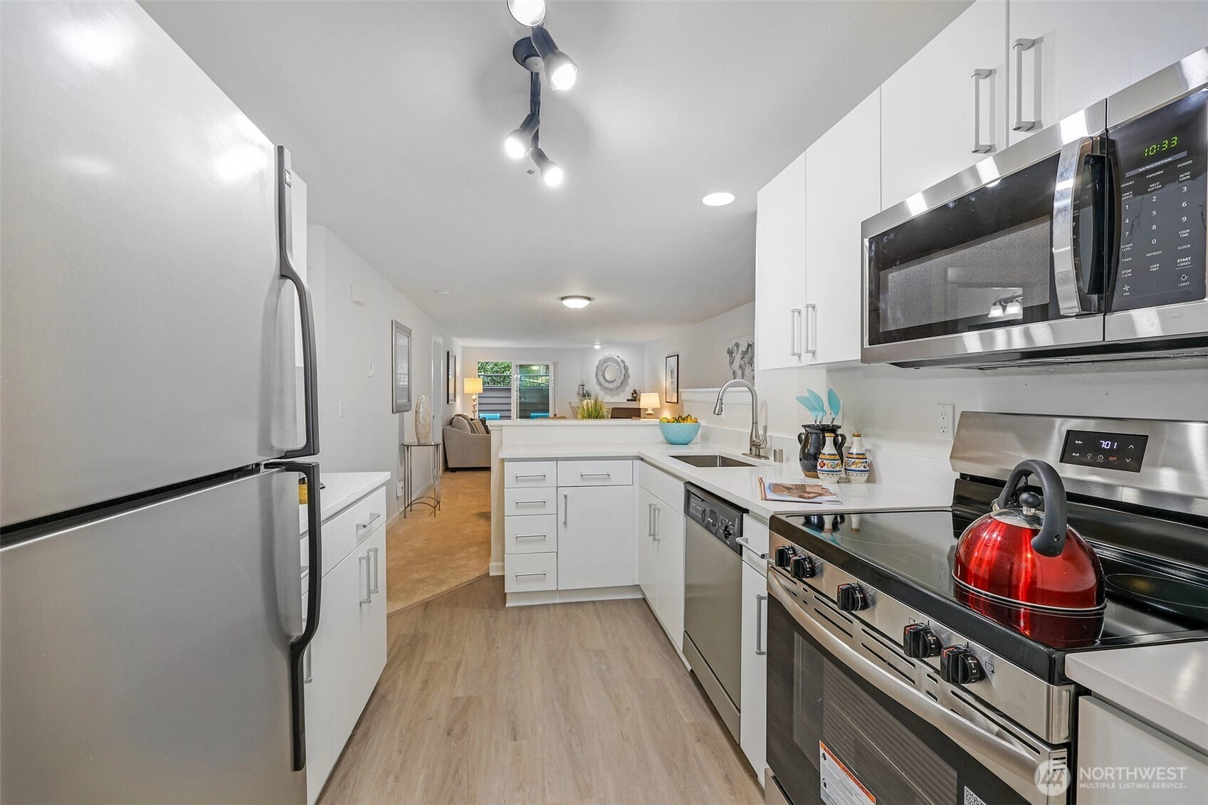Move-in-ready condo in Mira, the heart of Kirkland’s downtown neighborhood. This ground-floor unit feels spacious with new LVP flooring, new carpet and fresh paint throughout. Open concept layout features updated kitchen with white cabinets, quartz countertops, SS appliances and breakfast bar, flowing into living/dining area with cozy wood-burning fireplace. Sliding doors lead to patio with privacy screen. Split bedrooms ensure privacy: primary suite offers double closet and updated bath; guest room served by adjacent full bath. Full laundry room, storage, two parking spaces (one covered). Pet-friendly with no rental cap, plus amenities including pool and hot tub. Minutes to Google, Kirkland Urban, parks, I-405 & Lake Washington schools.