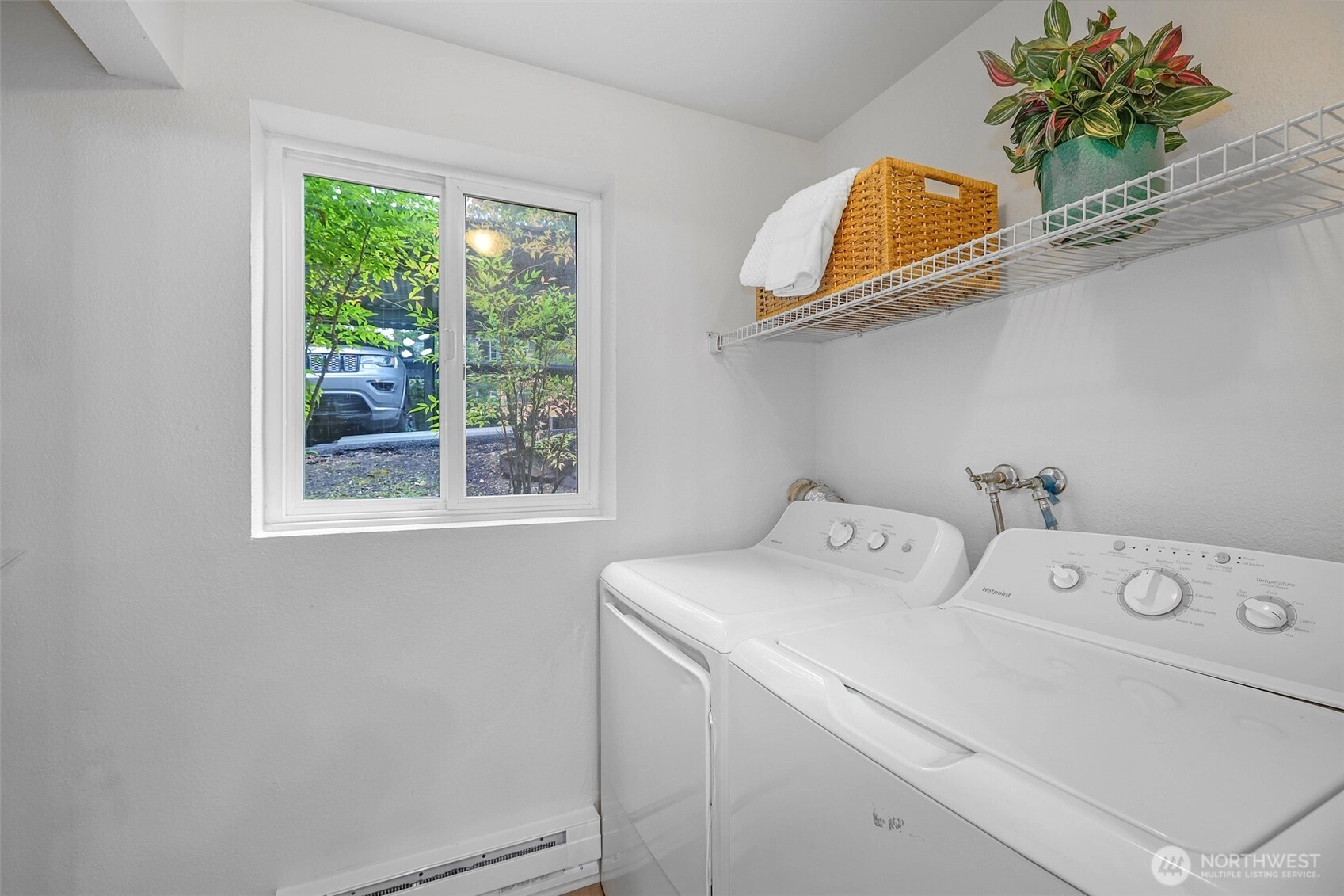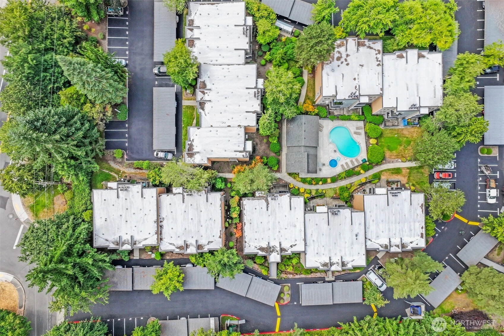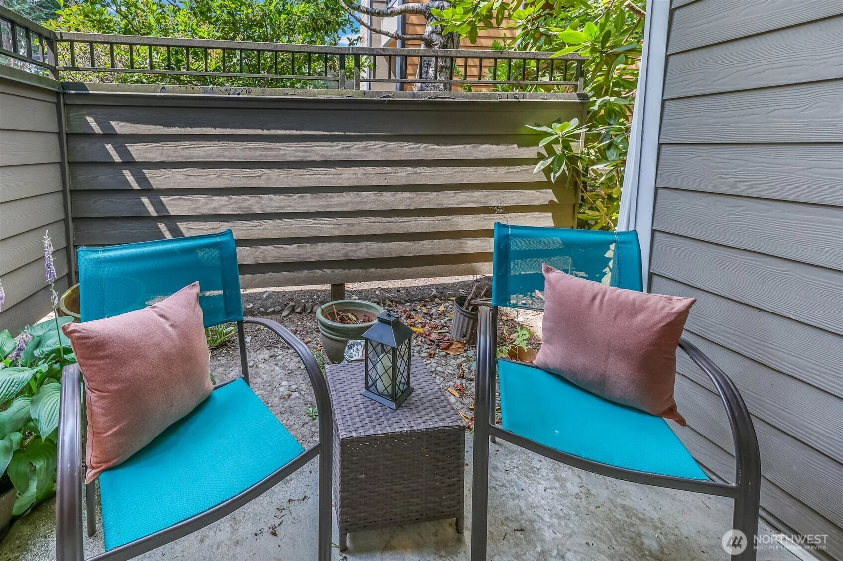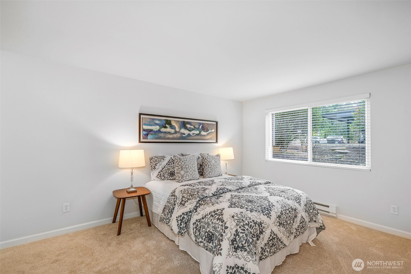 Move-in-ready condo in Mira, the heart of Kirkland’s downtown neighborhood. This ground-floor unit feels spacious with new LVP flooring, new carpet and fresh paint throughout. Open concept layout features updated kitchen with white cabinets, quartz countertops, SS appliances and breakfast bar, flowing into living/dining area with cozy wood-burning fireplace. Sliding doors lead to patio with privacy screen. Split bedrooms ensure privacy: primary suite offers double closet and updated bath; guest room served by adjacent full bath. Full laundry room, storage, two parking spaces (one covered). Pet-friendly with no rental cap, plus amenities including pool and hot tub. Minutes to Google, Kirkland Urban, parks, I-405 & Lake Washington schools.