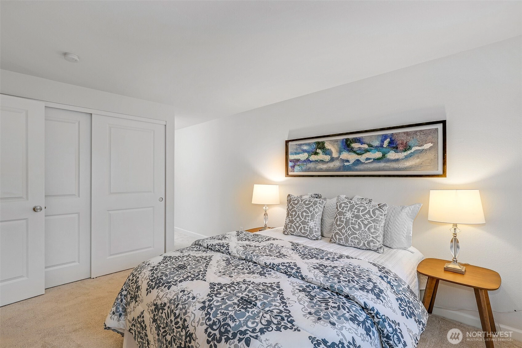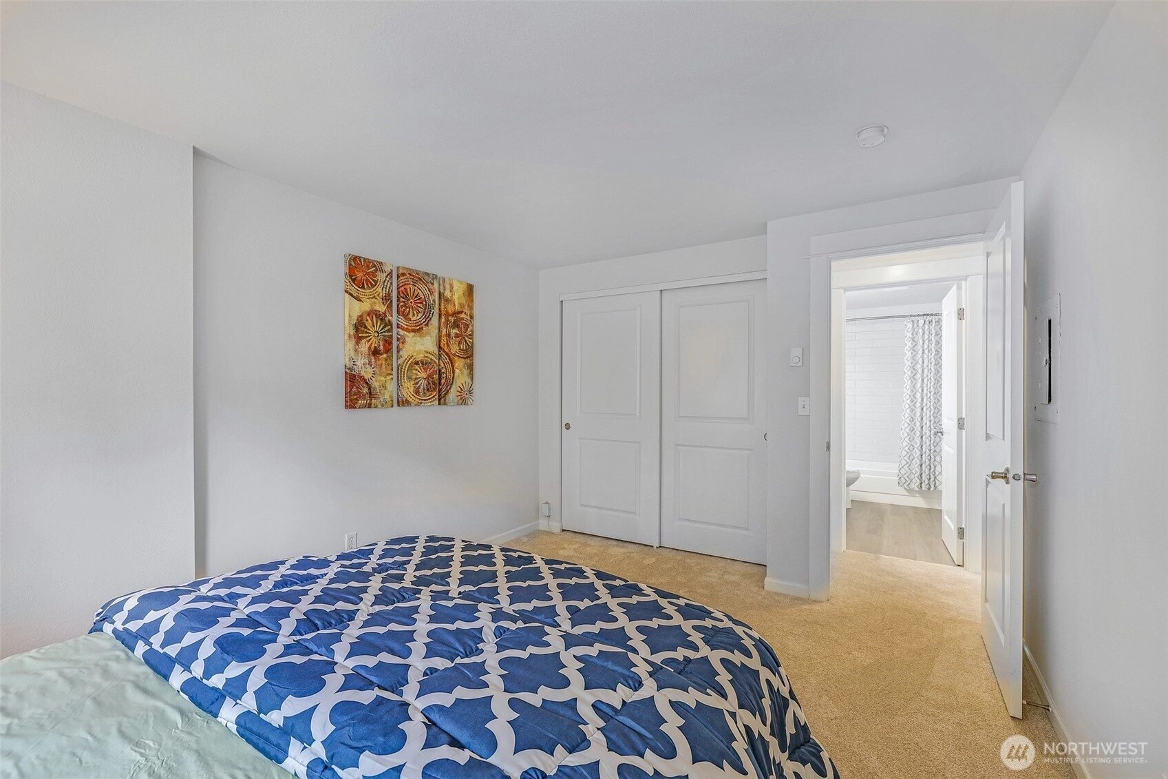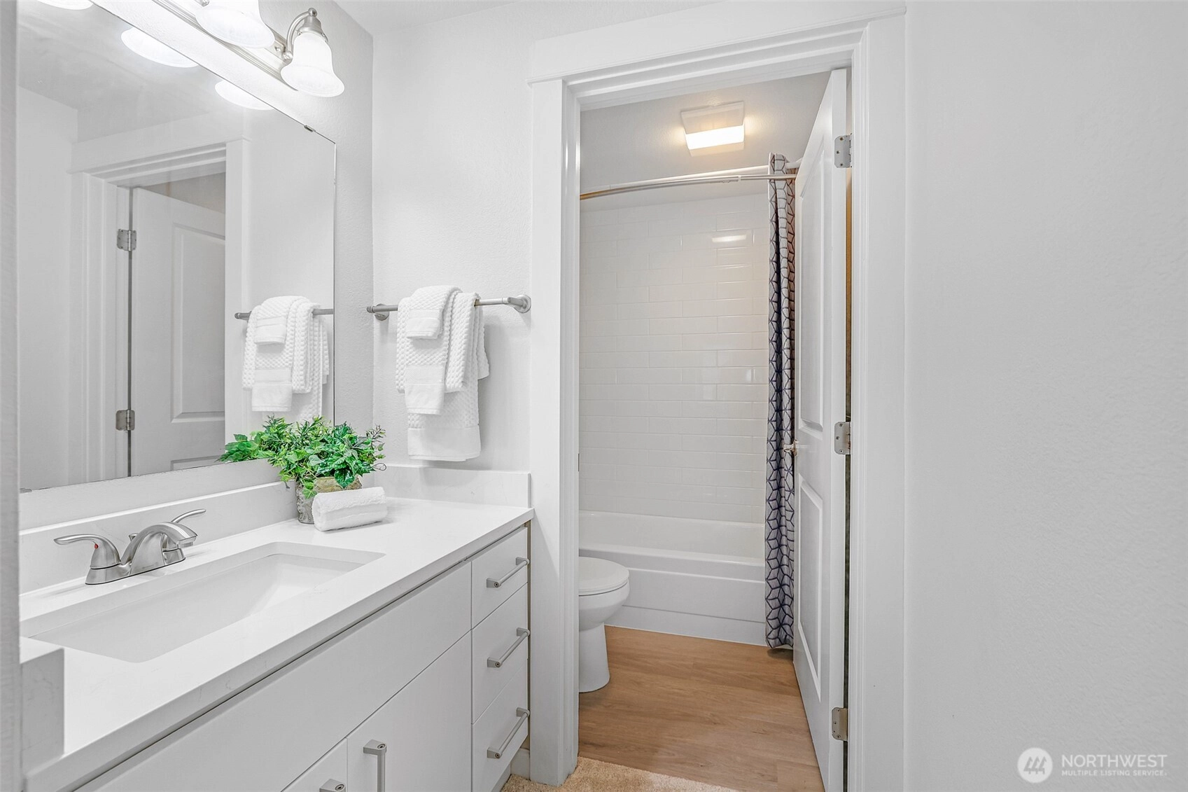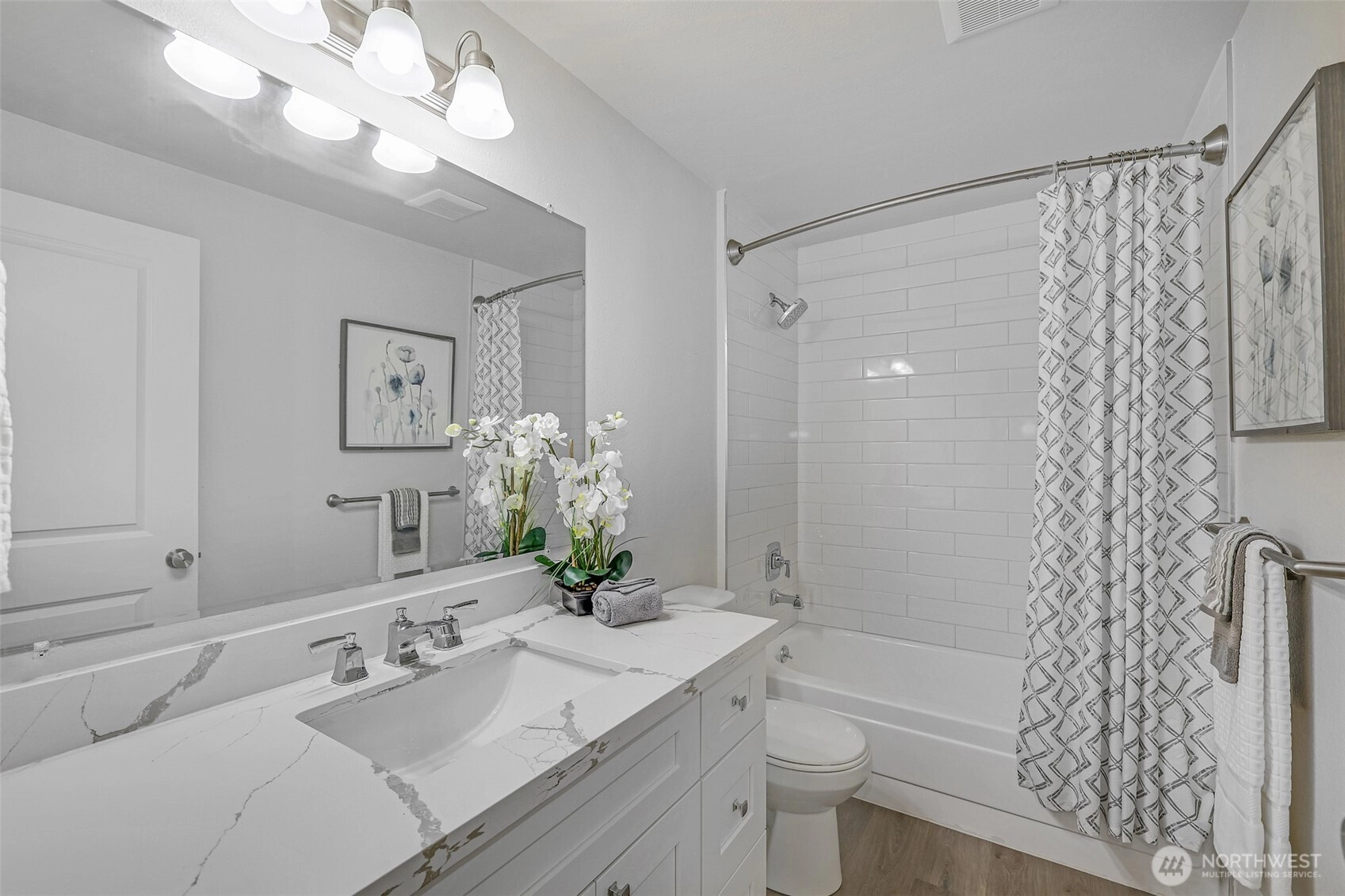 Move-in-ready condo in Mira, the heart of Kirkland’s downtown neighborhood. This ground-floor unit feels spacious with new LVP flooring, new carpet and fresh paint throughout. Open concept layout features updated kitchen with white cabinets, quartz countertops, SS appliances and breakfast bar, flowing into living/dining area with cozy wood-burning fireplace. Sliding doors lead to patio with privacy screen. Split bedrooms ensure privacy: primary suite offers double closet and updated bath; guest room served by adjacent full bath. Full laundry room, storage, two parking spaces (one covered). Pet-friendly with no rental cap, plus amenities including pool and hot tub. Minutes to Google, Kirkland Urban, parks, I-405 & Lake Washington schools.