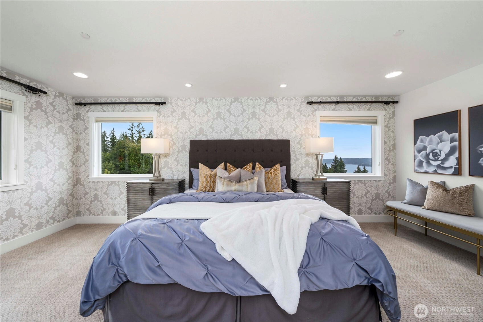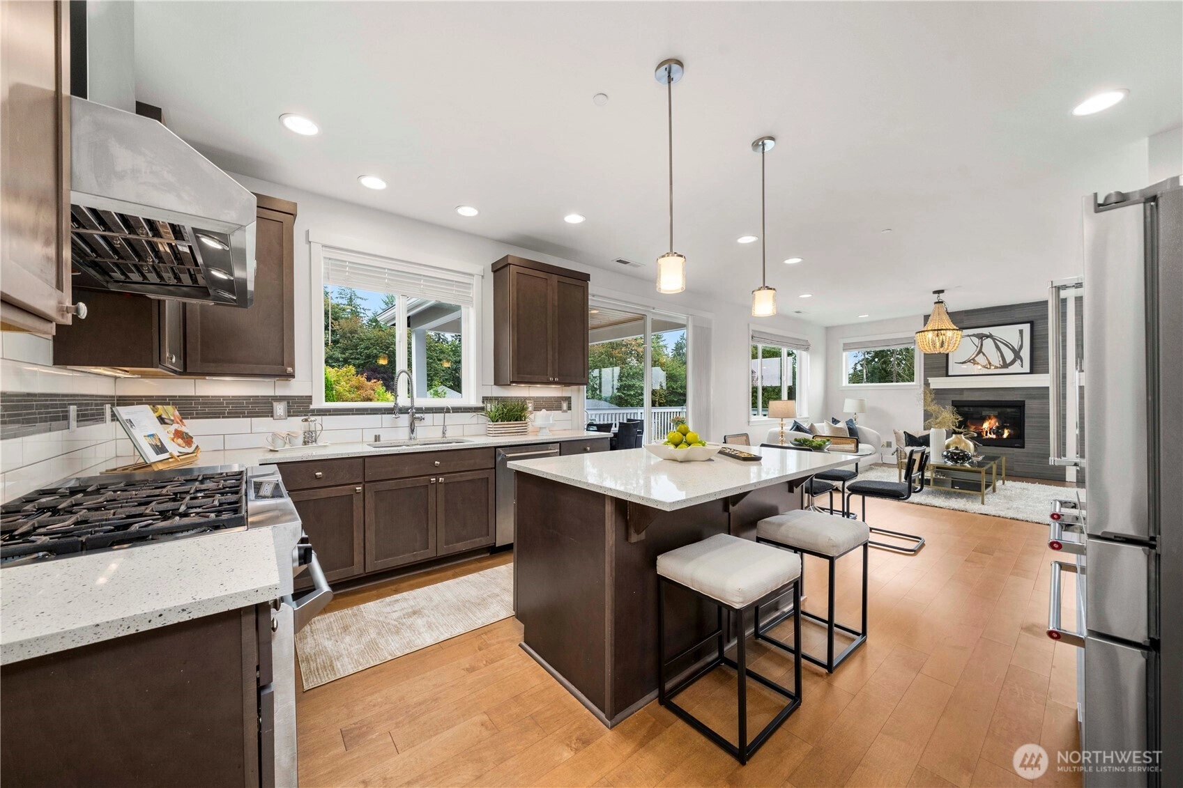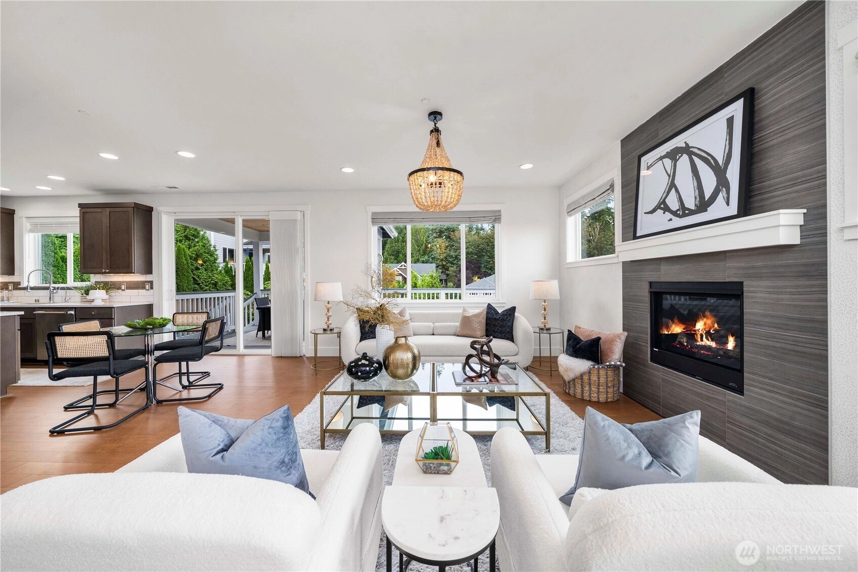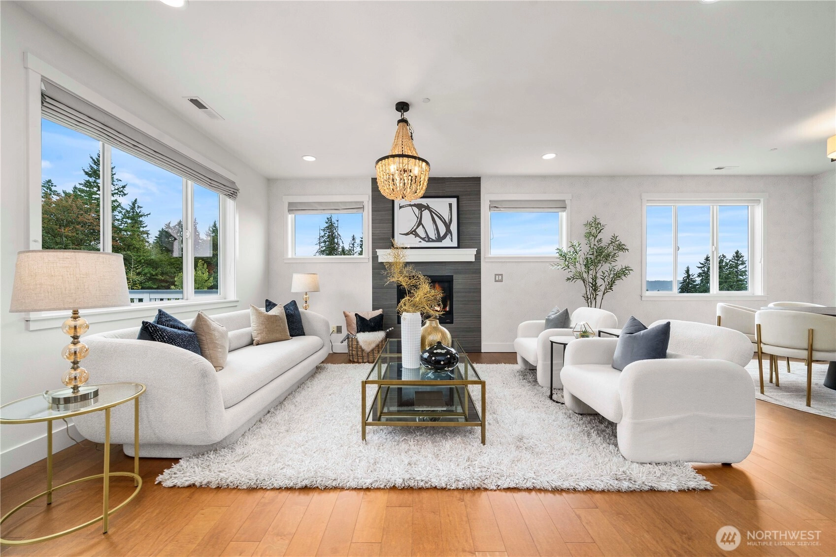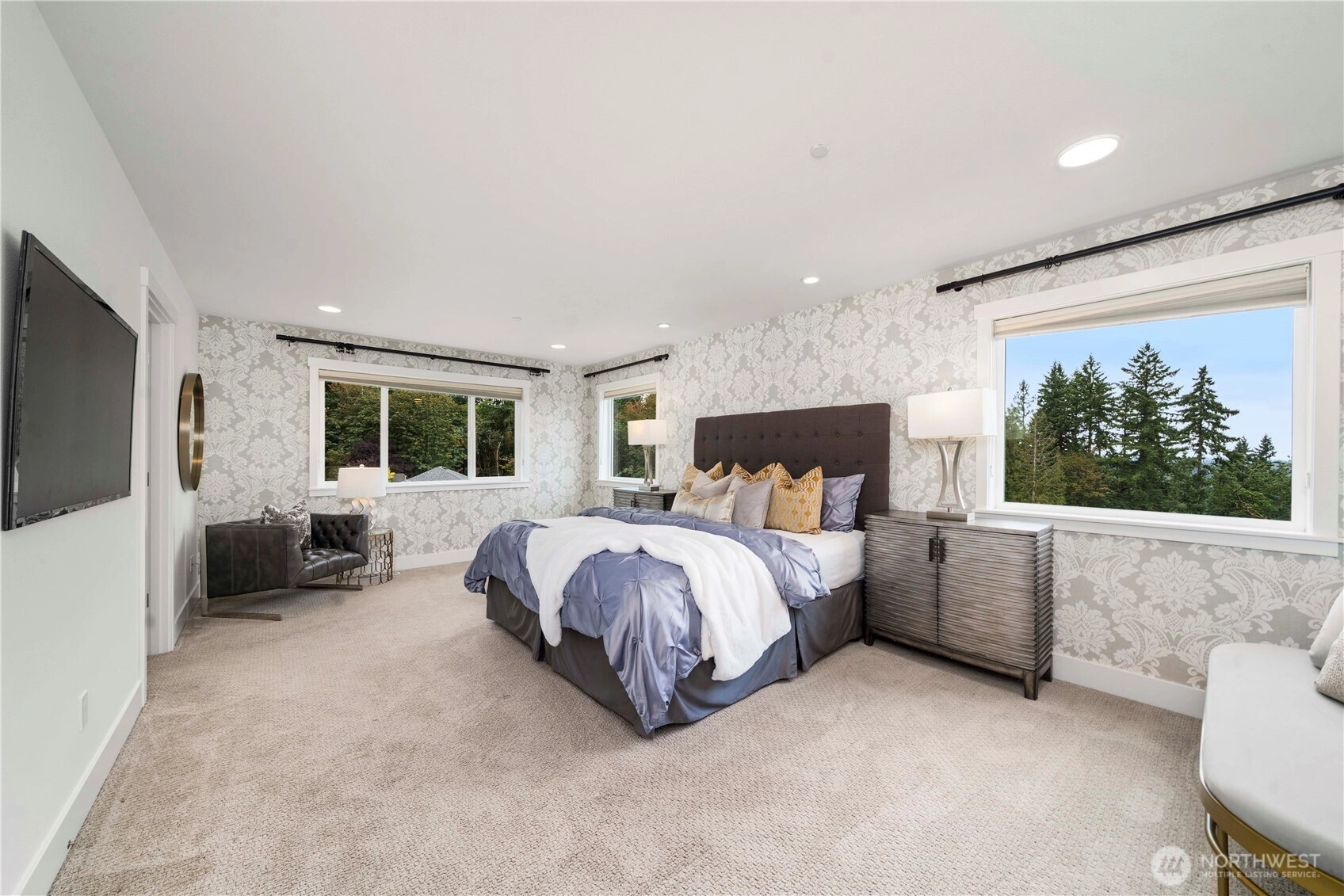 Sophisticated luxury with Lake & Cascades views! Nestled in a private cul-de-sac, this exquisite Sapphire Home blends timeless design with modern elegance. Over 4,300 sq ft of refined living, including 4 bedrooms upstairs, a main-floor guest bedroom, a designated office, & a large bonus downstairs. Expansive windows showcase stunning natural light & serene vistas. The gourmet kitchen features quartz counters & chef-grade appliances. Indulge in the spa-like primary suite with lake & mountain views. Central A/C, a generator, 3-car garage, sprinkler system, professionally paved & fully fenced backyard & neighborhood park. New interior paint. Just minutes to I-90, DT Bellevue, Seattle, tech hubs, & all the amenities. Excellent Issaquah schools.