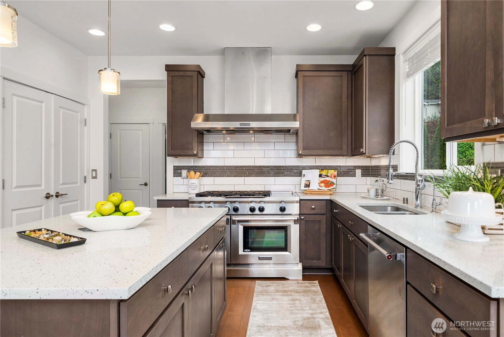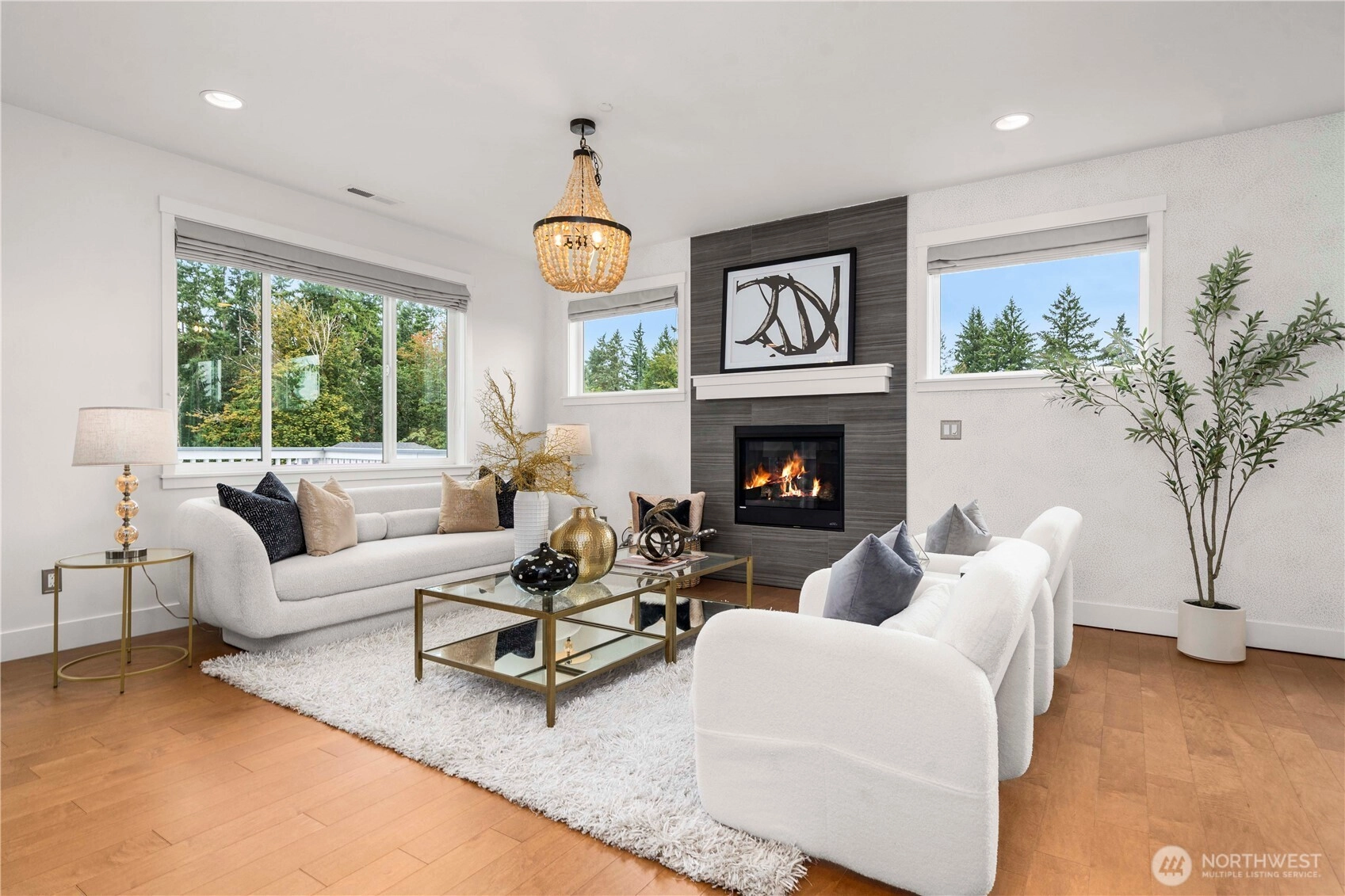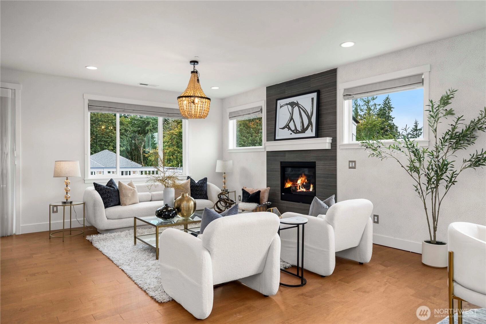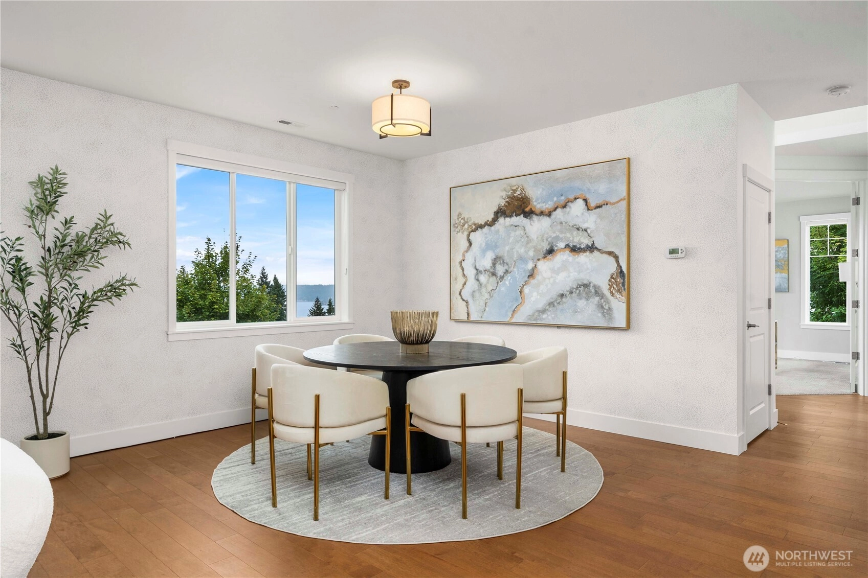 Sophisticated luxury with Lake & Cascades views! Nestled in a private cul-de-sac, this exquisite Sapphire Home blends timeless design with modern elegance. Over 4,300 sq ft of refined living, including 4 bedrooms upstairs, a main-floor guest bedroom, a designated office, & a large bonus downstairs. Expansive windows showcase stunning natural light & serene vistas. The gourmet kitchen features quartz counters & chef-grade appliances. Indulge in the spa-like primary suite with lake & mountain views. Central A/C, a generator, 3-car garage, sprinkler system, professionally paved & fully fenced backyard & neighborhood park. New interior paint. Just minutes to I-90, DT Bellevue, Seattle, tech hubs, & all the amenities. Excellent Issaquah schools.