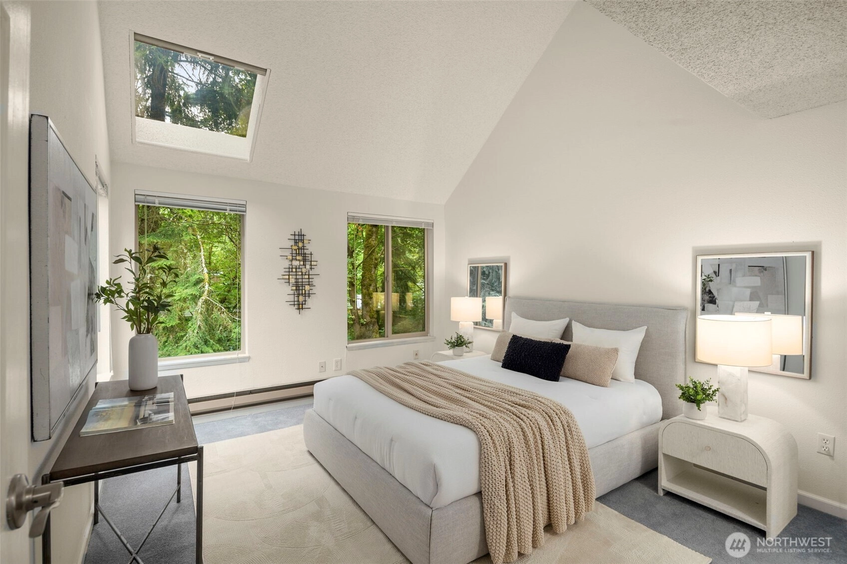 RARE Forestbrook corner/end-unit townhome with the convenience of an attached TWO-car garage. Step inside to soaring vaulted ceilings, skylights that bathe the space in natural light, and an airy open layout that feels both spacious and inviting.Your expansive main deck looks out to a gorgeous backdrop of trees and a gently flowing creek — a beautiful forest retreat. Thoughtful upgrades in the kitchen, baths, laundry, and lighting, paired with like-new appliances, create a fresh, move-in-ready home. Two private decks for morning coffee or evening sunsets, plus generous storage throughout.