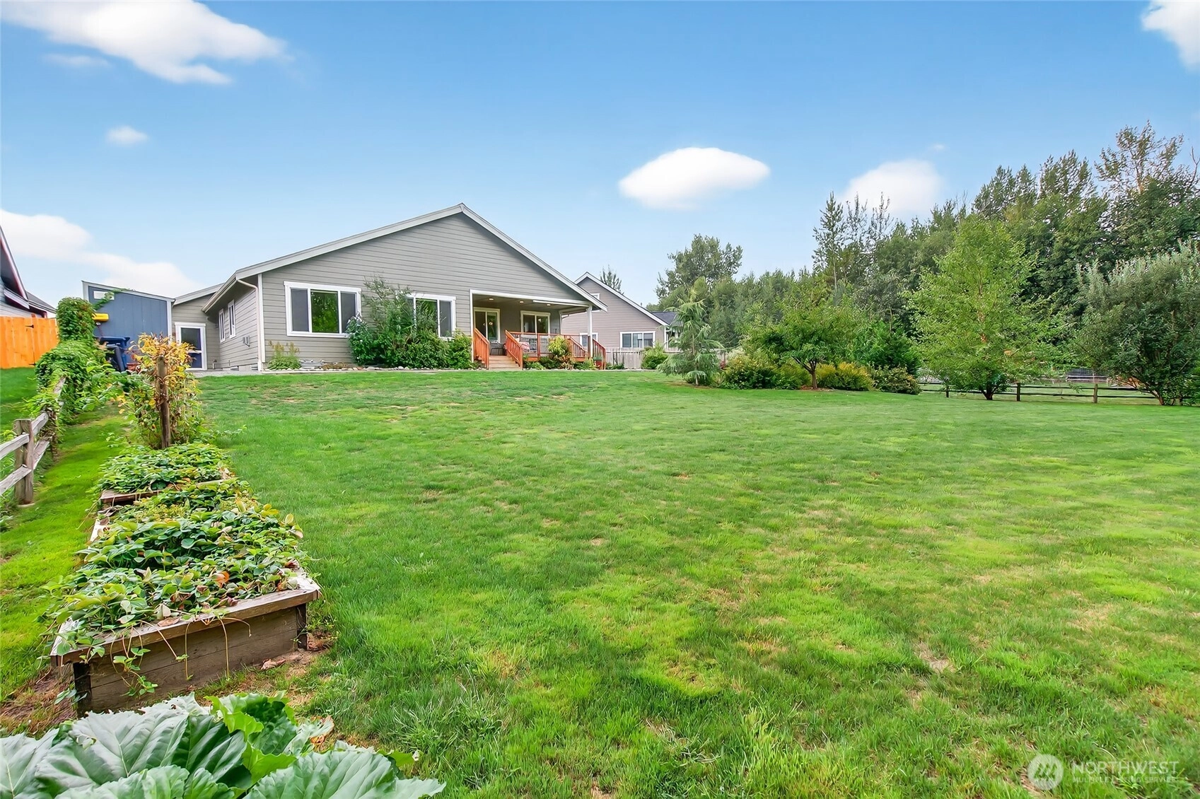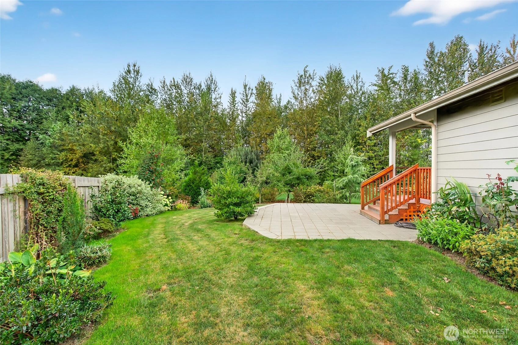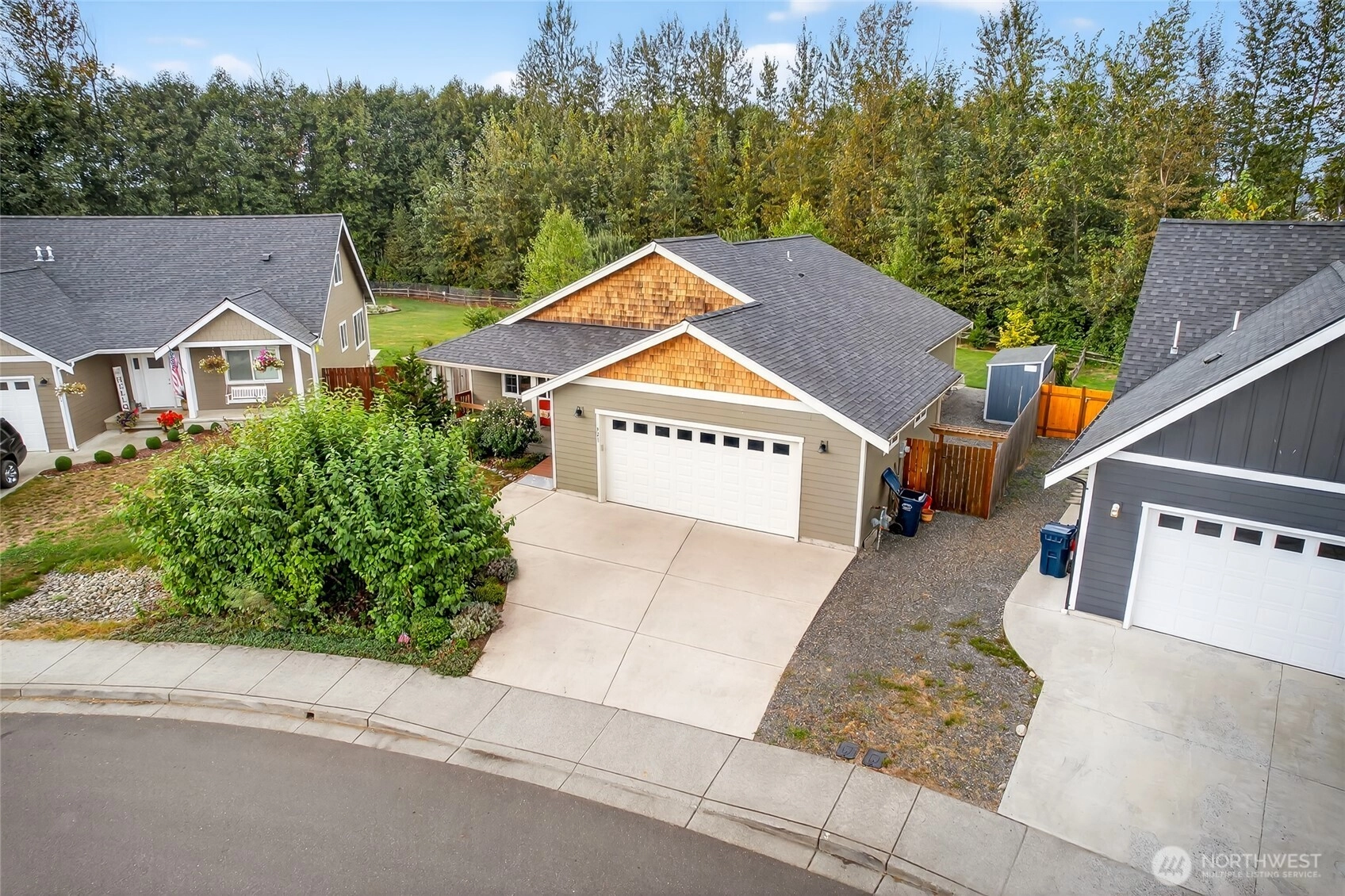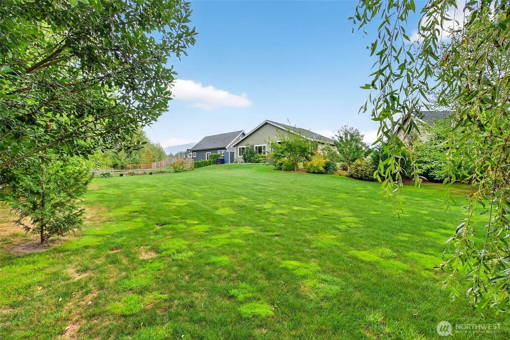 Custom design and finishes welcome you to this single-level peaceful and charming home. One of the largest lots in the neighborhood. The main living area is open to the kitchen with views of your fully fenced, park-like back yard. No houses on the back side. Back door opens onto a XL fully covered deck you can enjoy anytime. The kitchen will spoil you with its plentiful counter space and two separate sink areas for easy meal prep. Double bay garage plus room for storage, a work bench or craft area. Storage shed outside for lawn and outdoor tools. Beautiful views both front and back. Mature landscaping in a quiet and relaxing location. Close to schools and town. Like new, move in ready. What are you waiting for? Come see your new home!