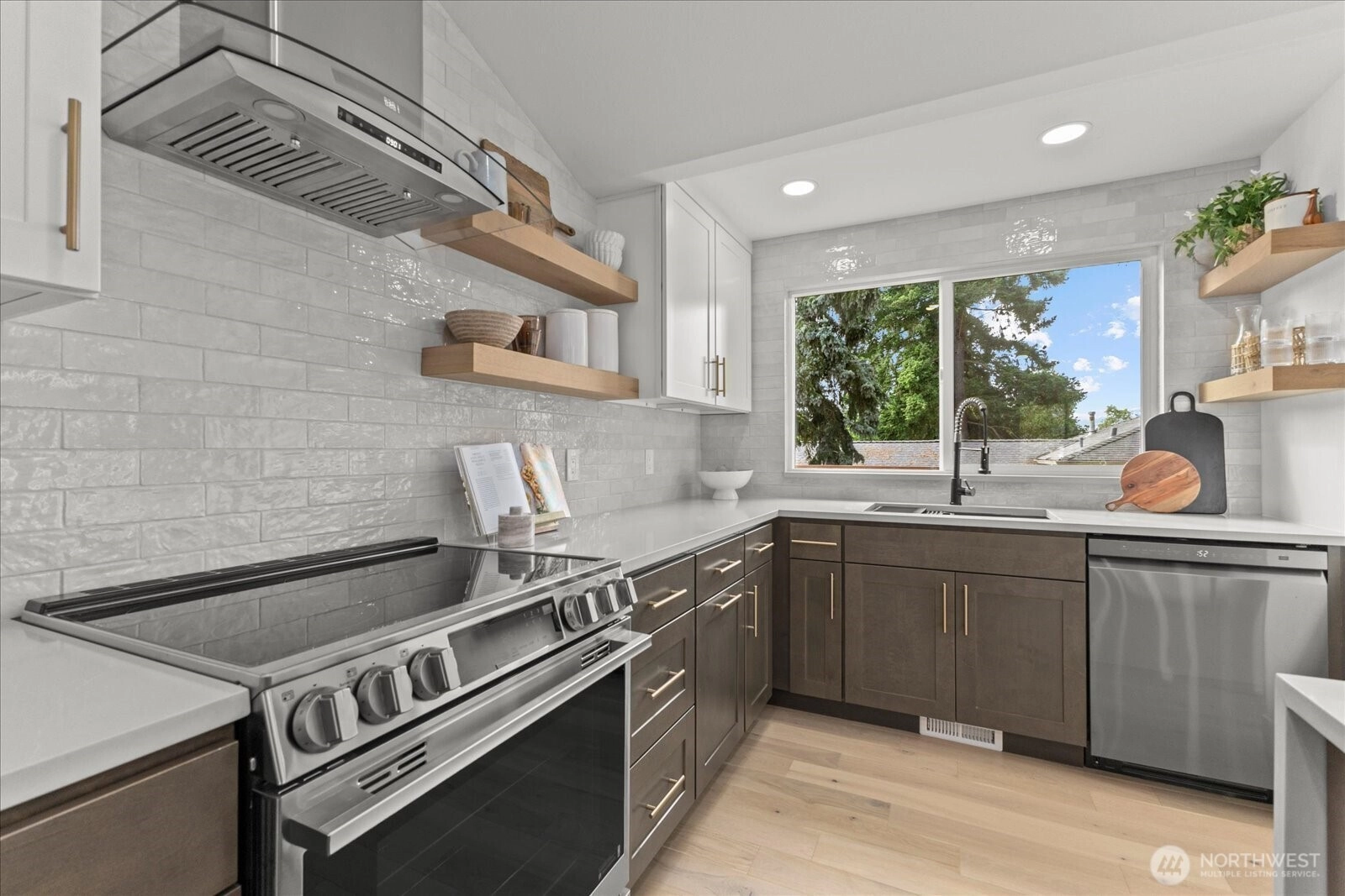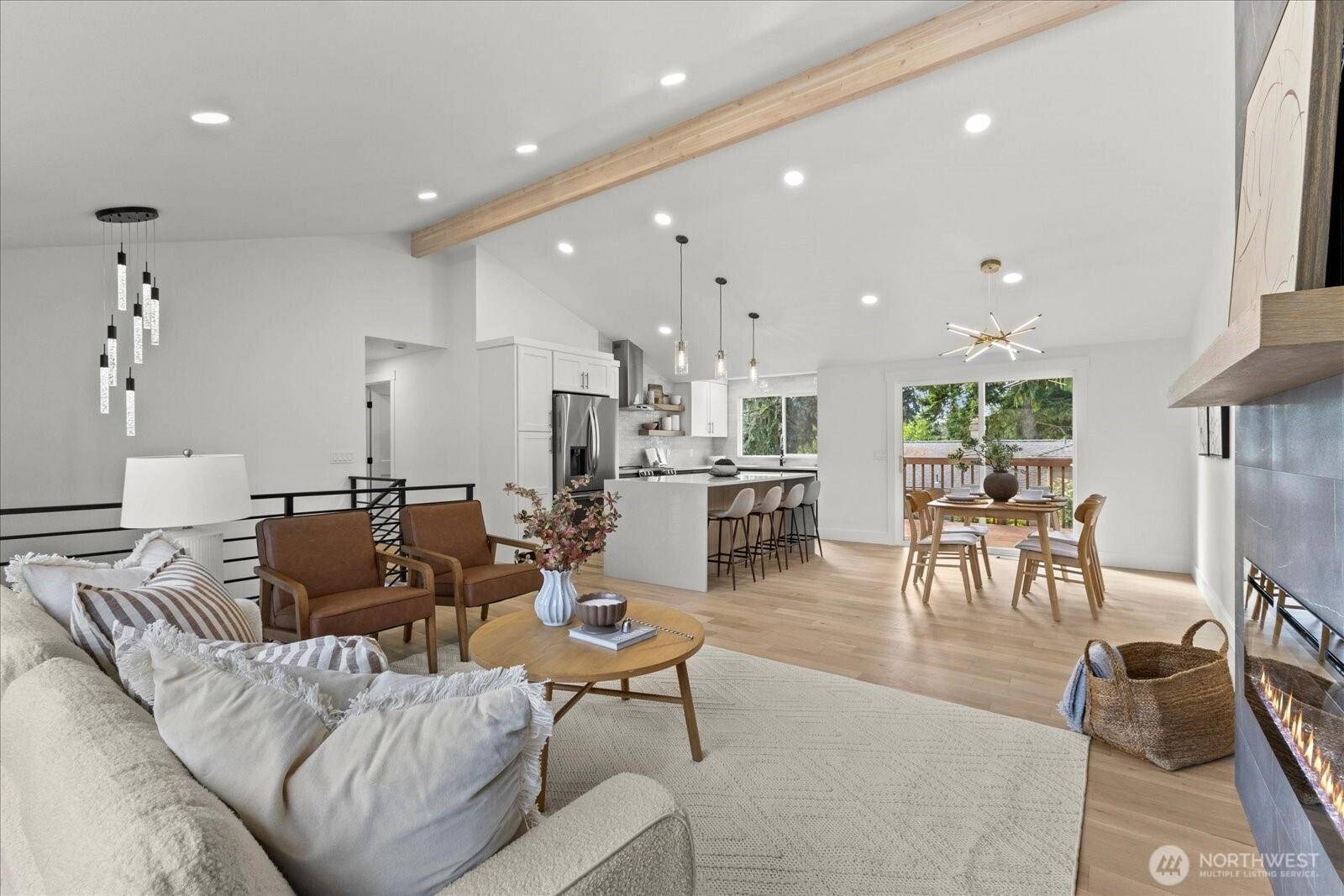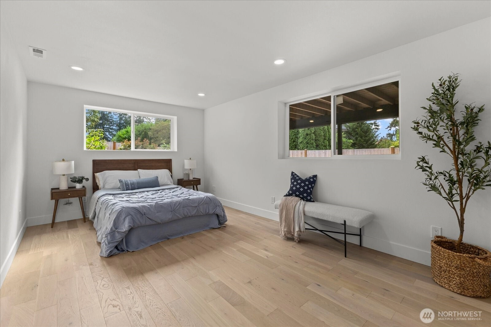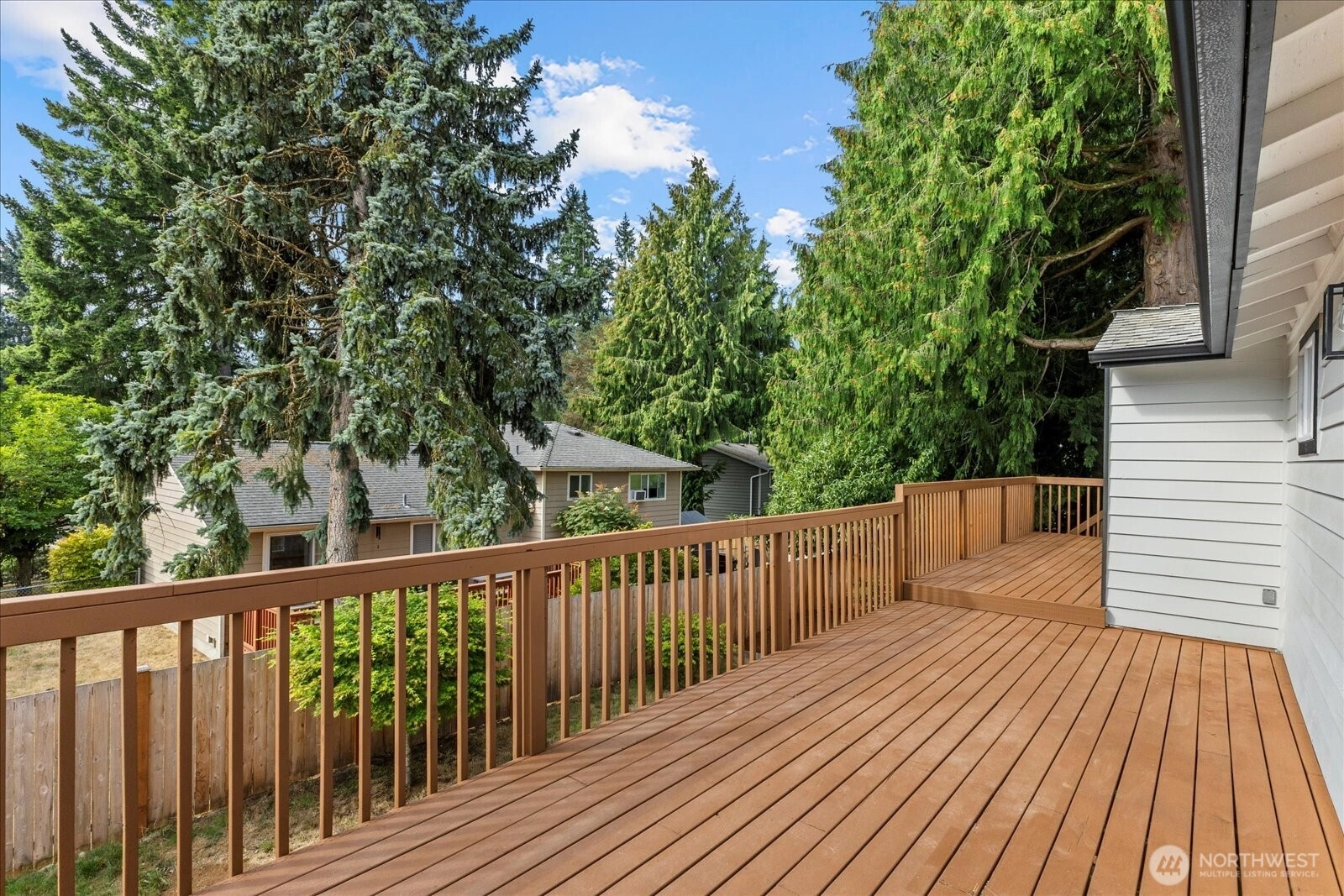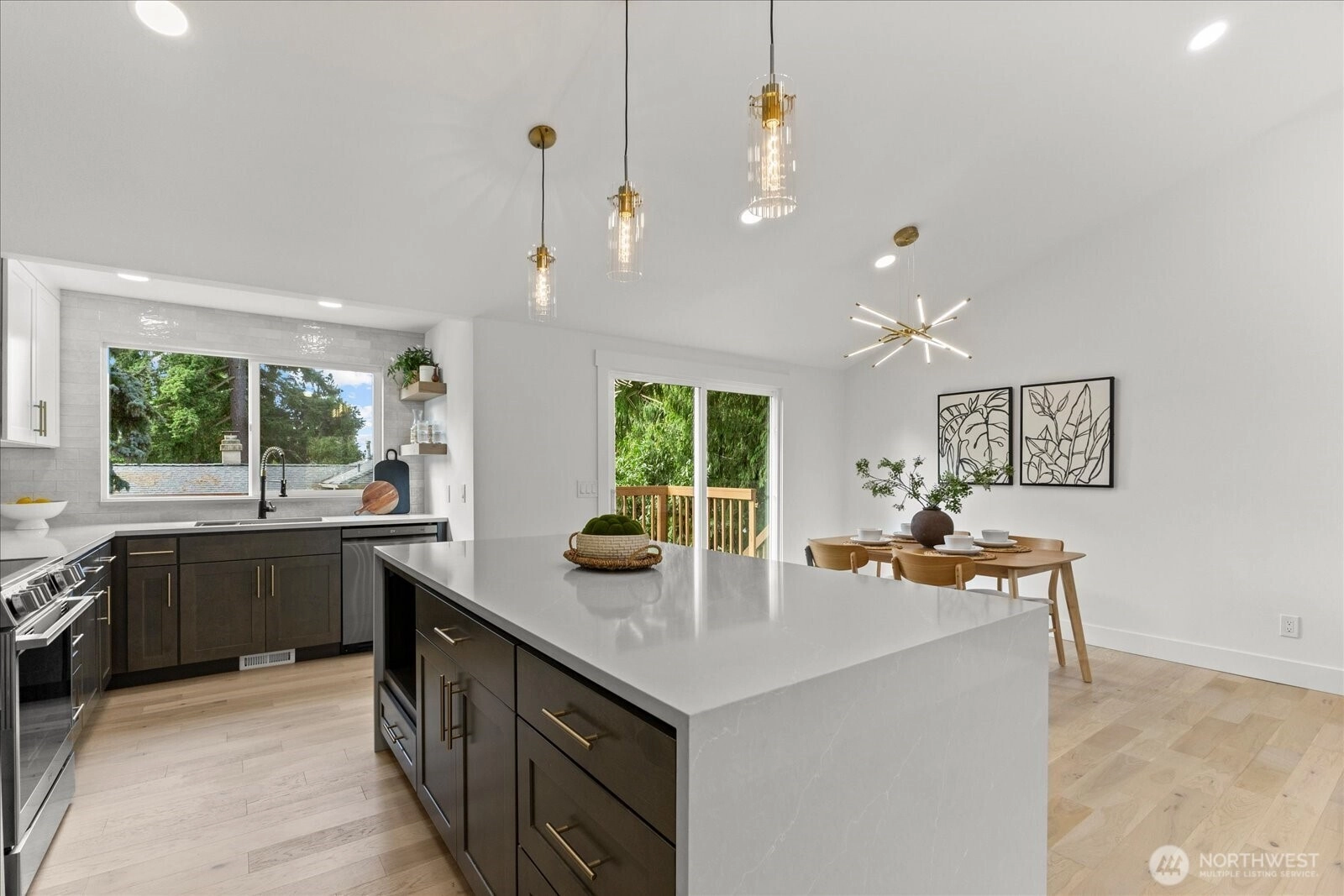 Embrace upscale Kirkland living in this fully renovated home! Situated on a peaceful cul-de-sac lot, STEPS away from Square park. One of the best parks kirkland has to offer. This home offers an exceptional living experience with every detail meticulously designed for style and functionality. Main level feature an open concept kitchen w/ beautiful waterfall quartz counters & new high end LG appliances. Easy access to large deck for entertaining guests or enjoying the PNW beauty overlooking nicely sized backyard. Engineered hardwood throughout the whole house! Primary suite on main level with access to back deck along w/ 2 additional rooms. Lower level features a large living space and a secondary primary suite! AC equipped. Don't miss this!