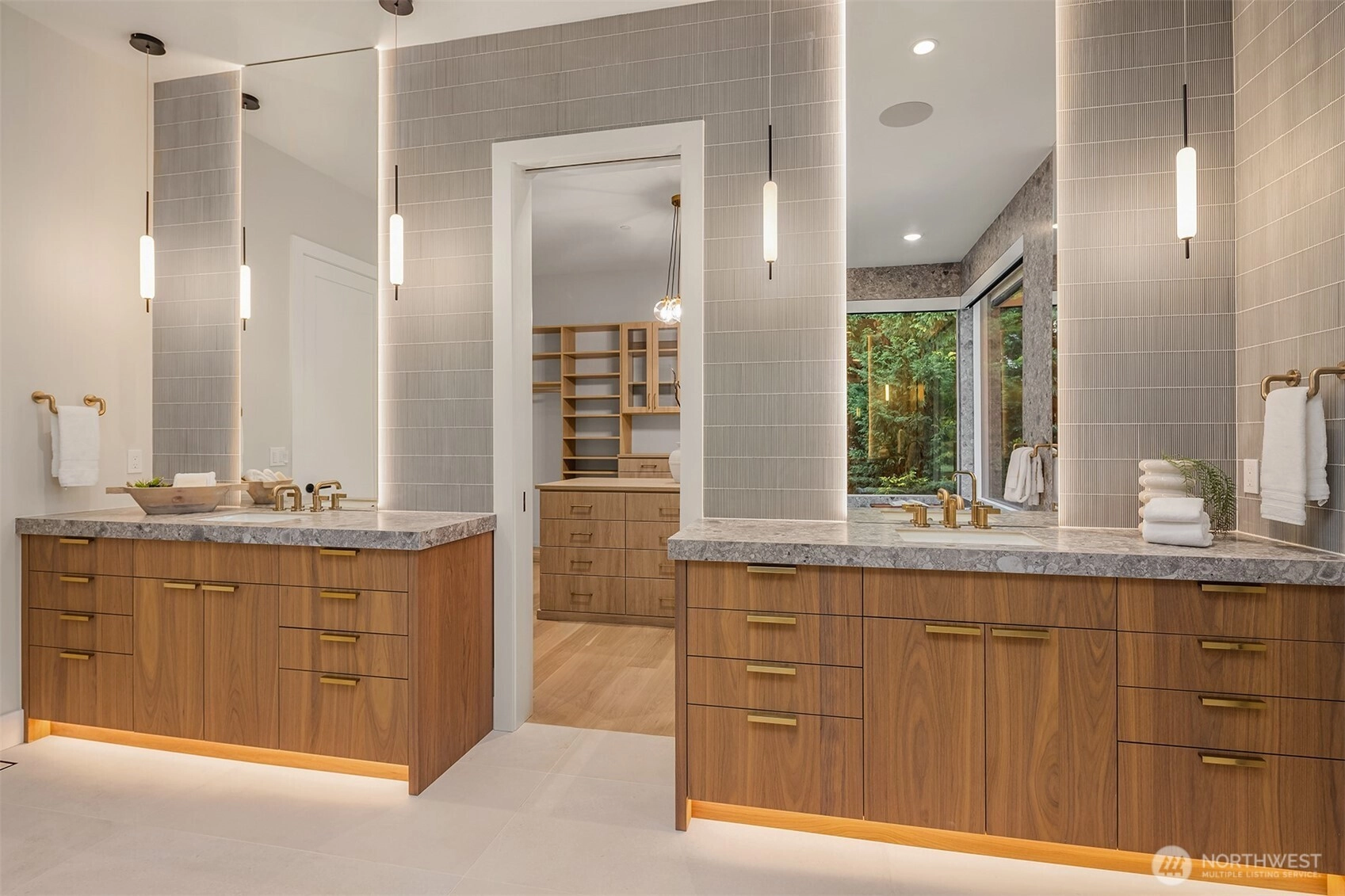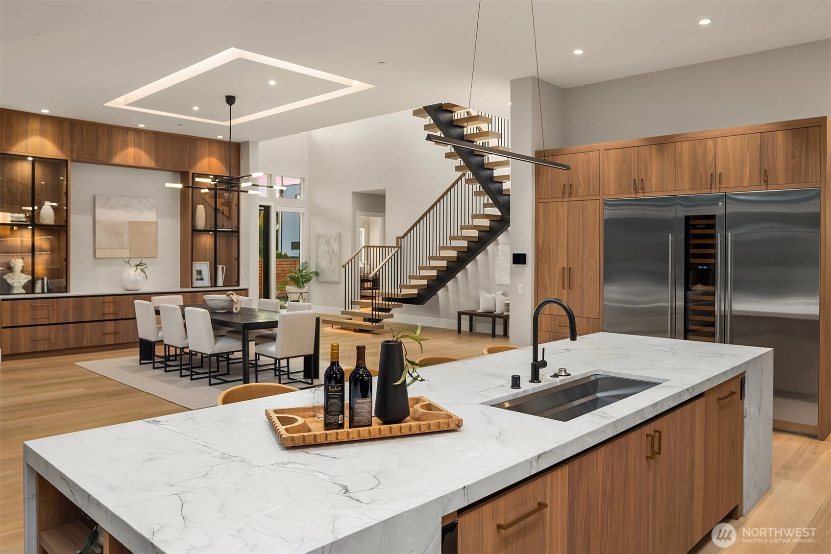Step through a custom glass pivot door into a masterpiece by Chaffey Custom Construction and McCullough Architects. This 5-bedroom, 5.5-bath home includes two private offices, a fitness studio with infrared sauna, and a luxe theater. Wide-plank white oak floors flow throughout both levels of the open-concept design. The stunning kitchen is elevated by a thoughtfully designed pantry and scullery. The primary suite offers a serene retreat with floor-to-ceiling tile, mirrors, and dual walk-in closets. Outfitted with Sub-Zero, Wolf, Kohler, and Brizo and powered by solar, this smart home features Lutron lighting, motorized shades, and turnkey audio/video/security. Wired with Cat6 data cabling and Wi-Fi 7. A rare blend of innovation and elegance