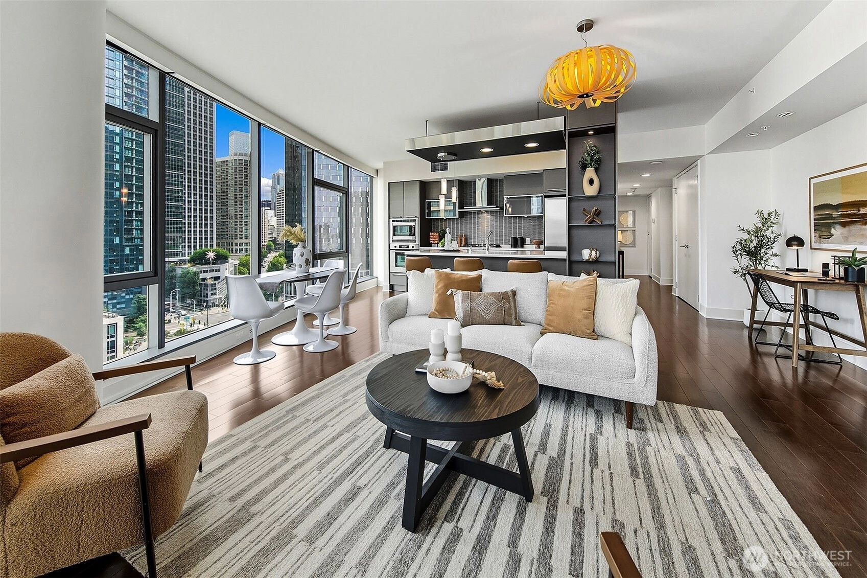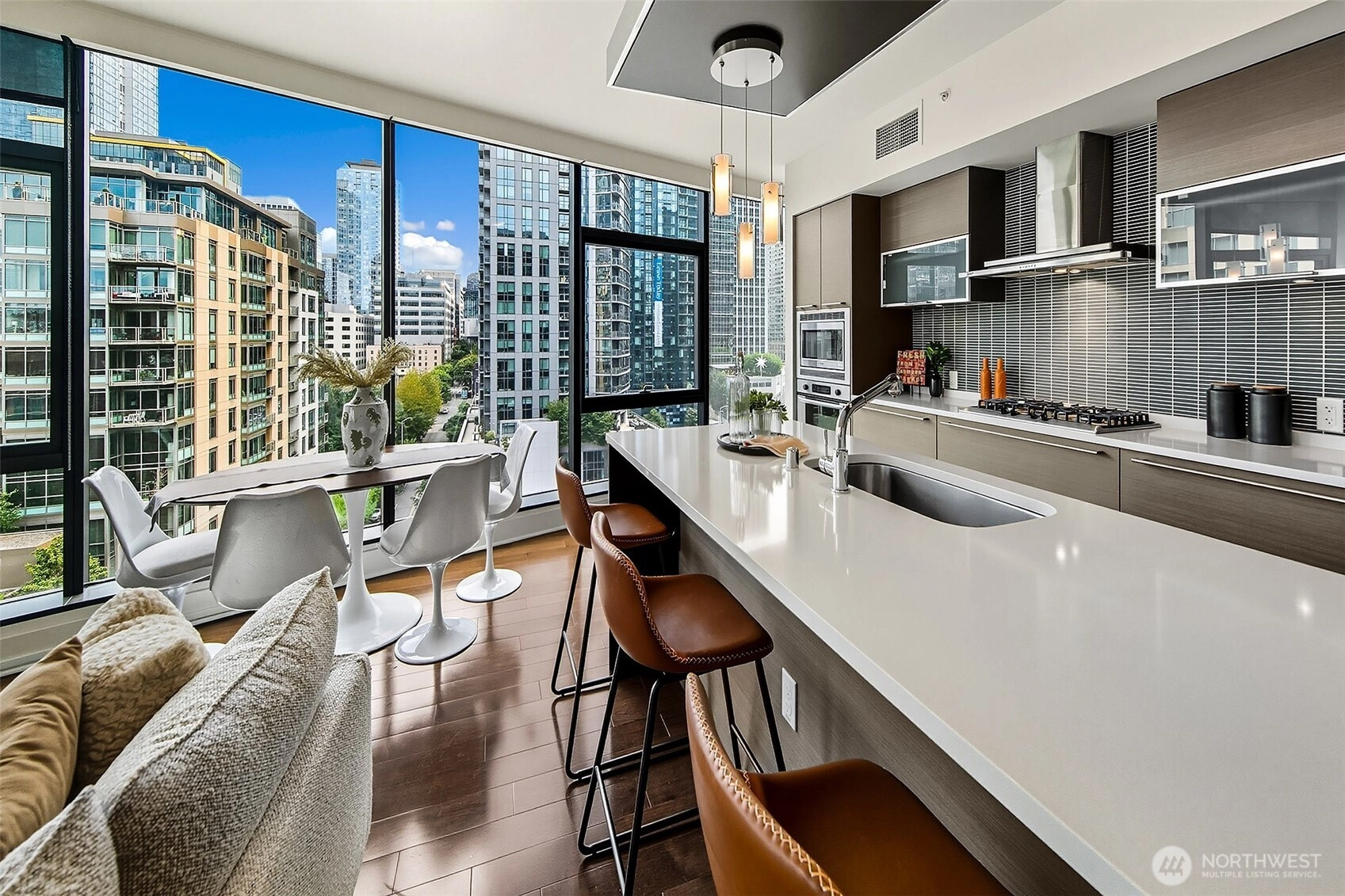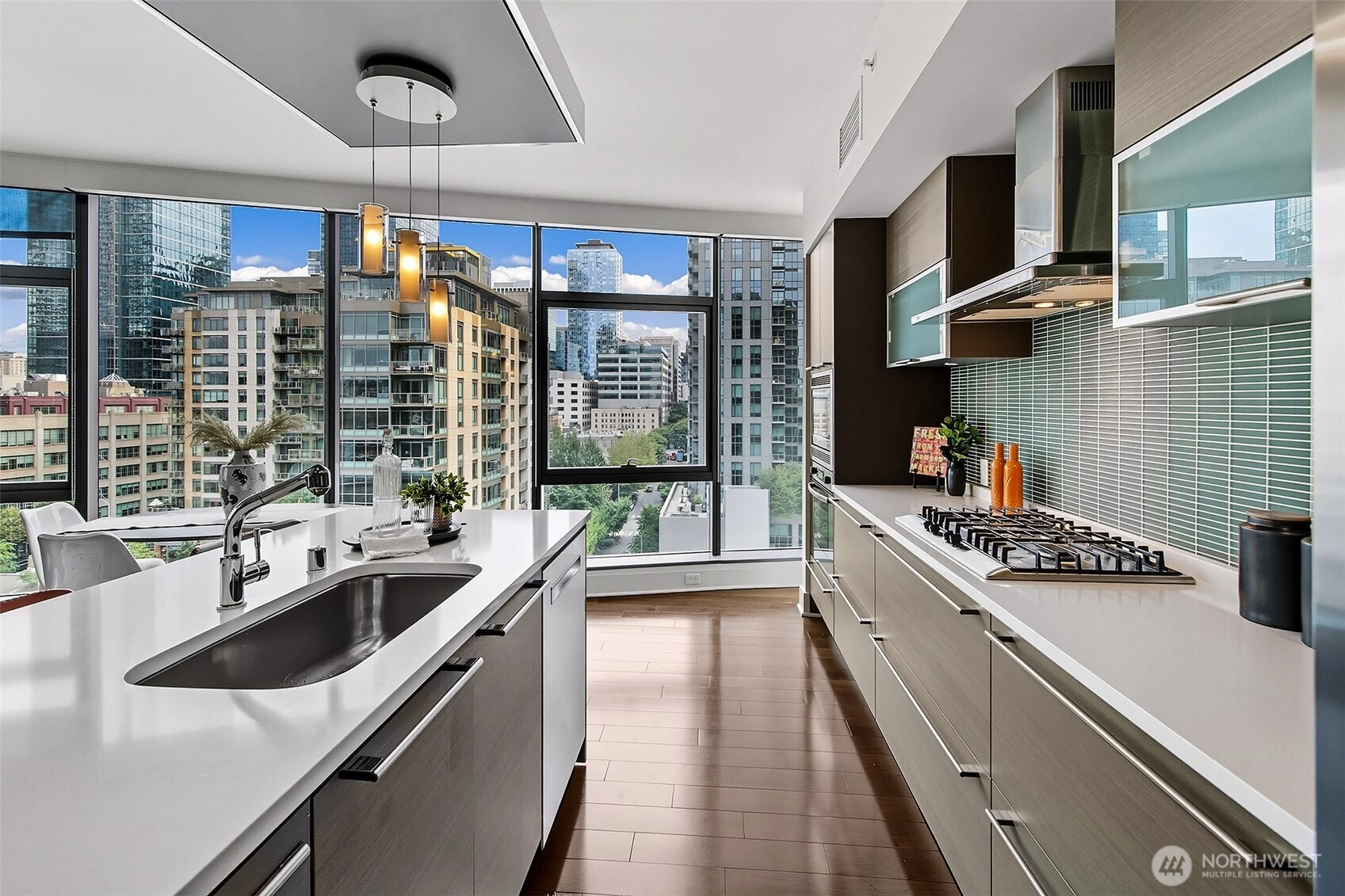 Luxury condominium living in the heart of South Lake Union. City views and Lake Union shine from floor to ceiling window walls that wrap the southeast corner of this spacious 1388 sq ft 2 bedroom at Enso Condominiums. Open living layout with high ceilings and spacious rooms. Hardwood floors and a gas fireplace anchor the living room with a private balcony overlooking Westlake with corridor views towards Lake Union. Beautiful kitchen with Eggersmann cabinets, stone counters, gas cooktop and display built-ins that frame the open eating bar. Gracious primary suite with 5-piece ensuite bath and huge walk-in closet; 2nd bedroom and bath complete this wonderful floorplan. Enso is a LEED Gold high-rise with concierge staff in a prime location.