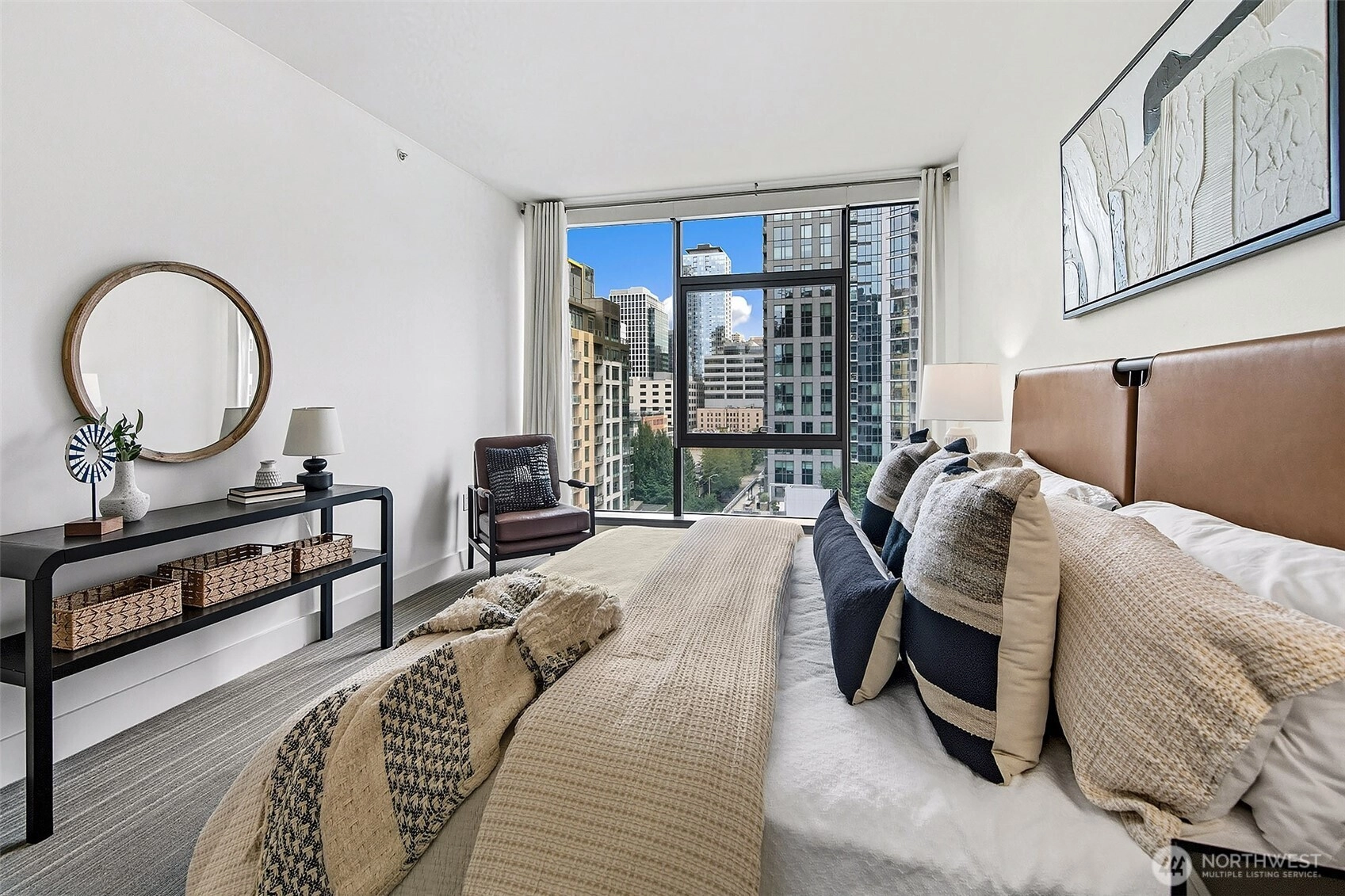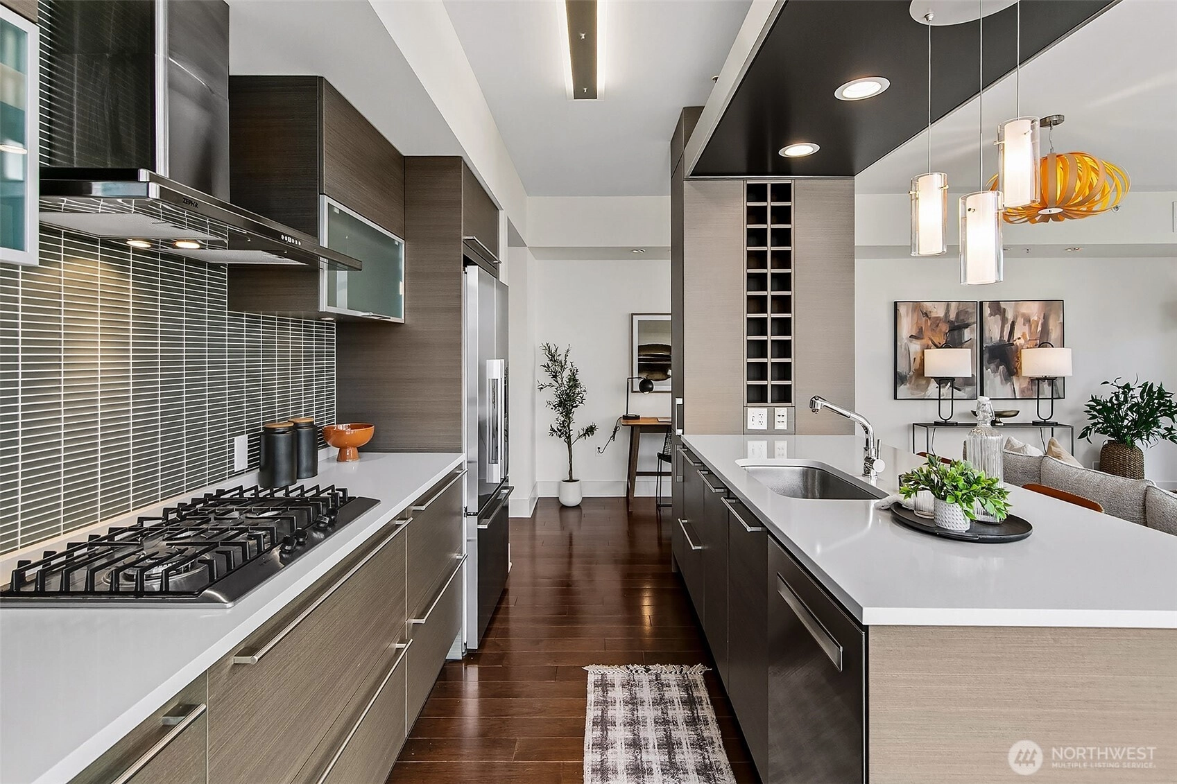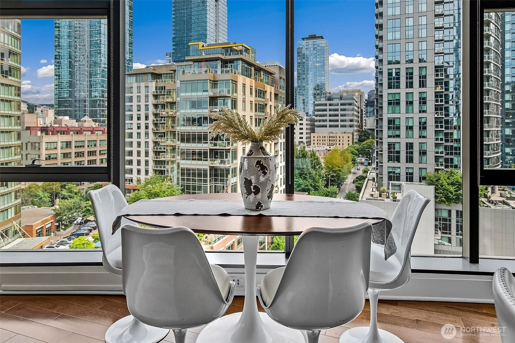 Luxury condominium living in the heart of South Lake Union. City views and Lake Union shine from floor to ceiling window walls that wrap the southeast corner of this spacious 1388 sq ft 2 bedroom at Enso Condominiums. Open living layout with high ceilings and spacious rooms. Hardwood floors and a gas fireplace anchor the living room with a private balcony overlooking Westlake with corridor views towards Lake Union. Beautiful kitchen with Eggersmann cabinets, stone counters, gas cooktop and display built-ins that frame the open eating bar. Gracious primary suite with 5-piece ensuite bath and huge walk-in closet; 2nd bedroom and bath complete this wonderful floorplan. Enso is a LEED Gold high-rise with concierge staff in a prime location.