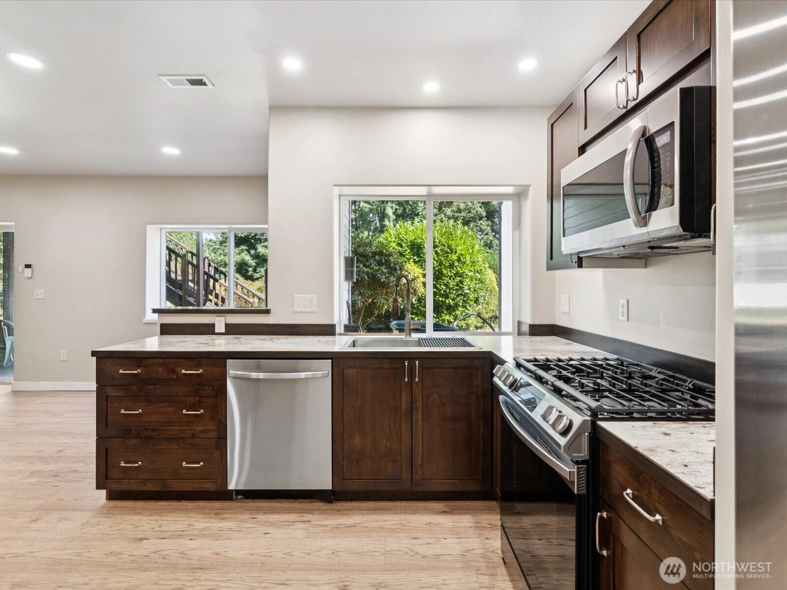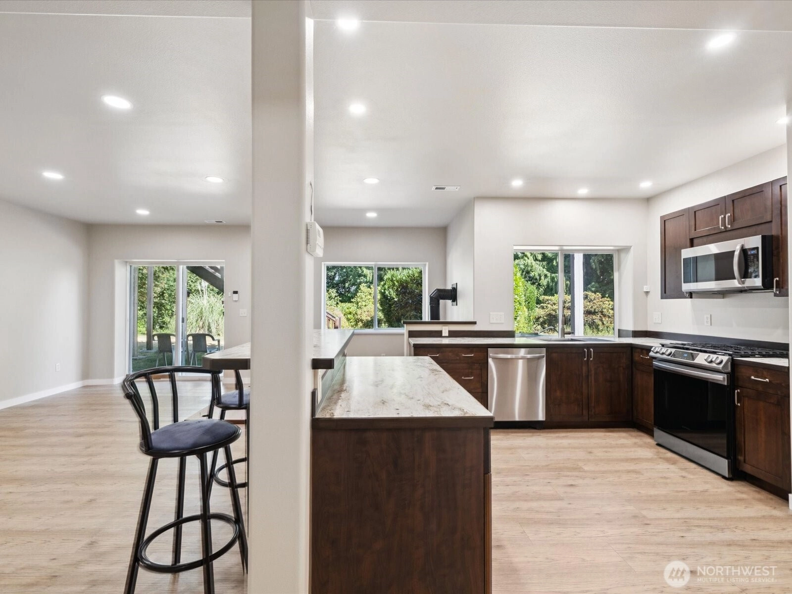 *Custom Daylight Rambler in Lake Stevens* Spacious 3,401sqft Home with a 2nd unit & full 2nd kitchen. 4 large bedrooms + 1 non-conforming 5th bedroom/office on a private ½ acre. Main level features an open layout, hardwood flooring, chef’s kitchen w/ breakfast bar, quartz countertops, and recessed ceiling. The primary suite has a Juliet balcony, stunning views, and walk-in-closet. Lower level offers a 2nd kitchen w/ stainless steel appliances, high ceilings, engineered hardwoods, a separate entrance, and a storage room (~500 sqft). Great for rentals, ADU, or multigenerational living. Roof is 6 yrs old. Durable Hardie siding. Shop w/ power, heat, and insulation. 2 utility rooms. 2 gas fireplaces. 2 W/D. $6K carpet credit. Easy to Hwy9 & I-5